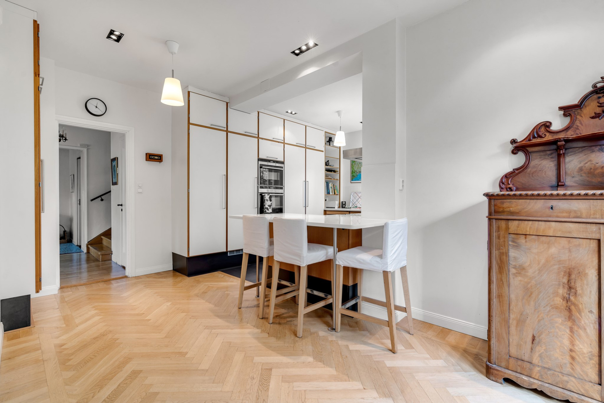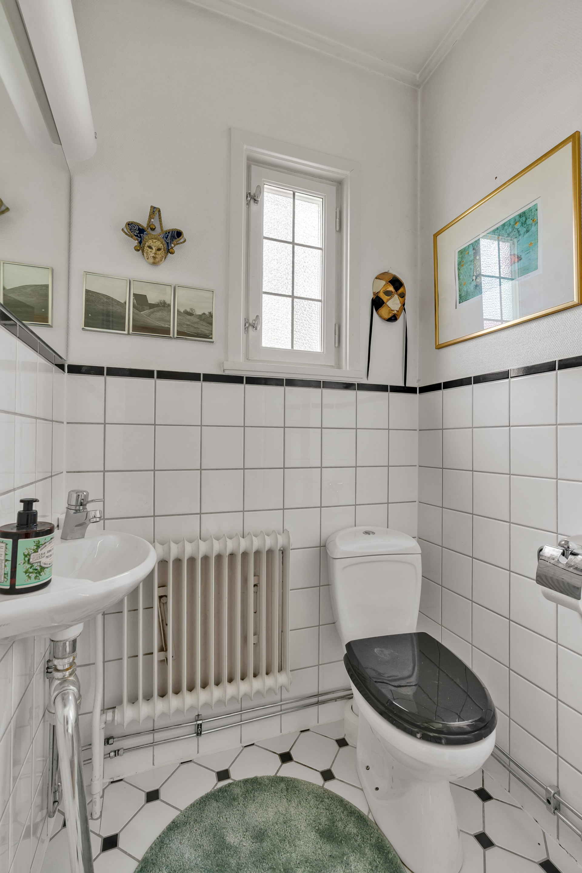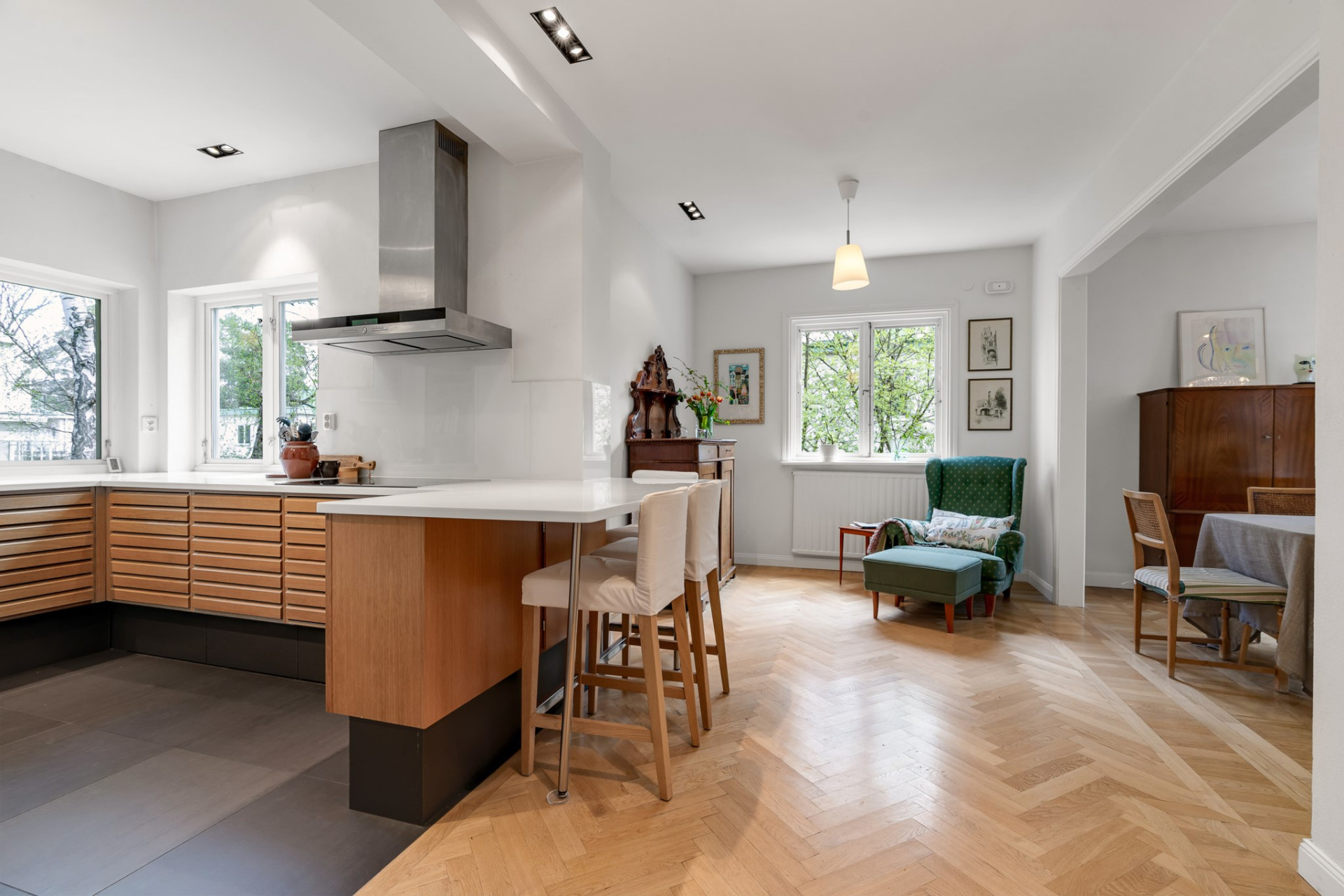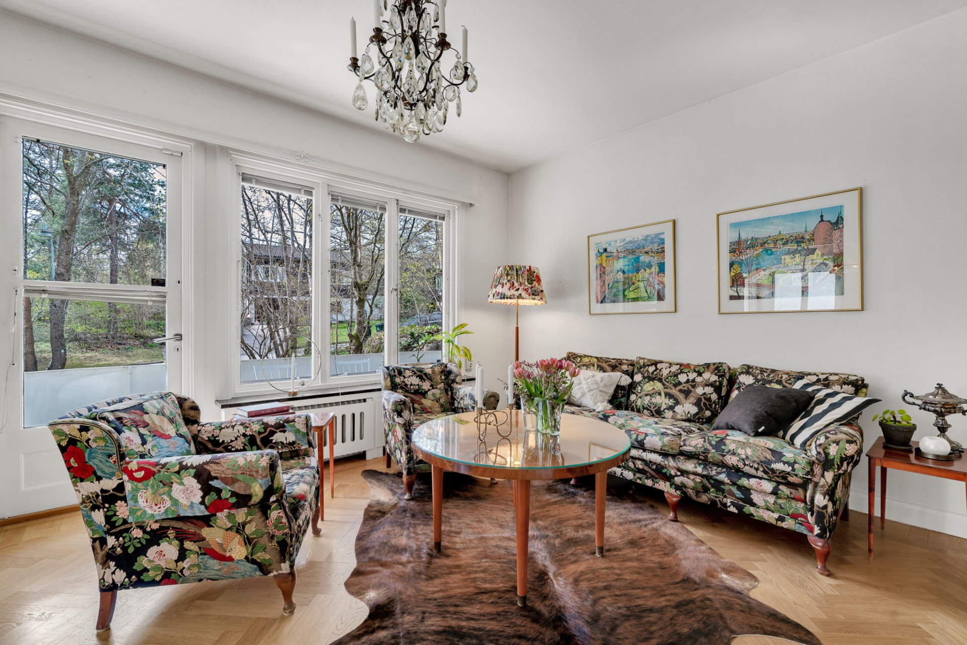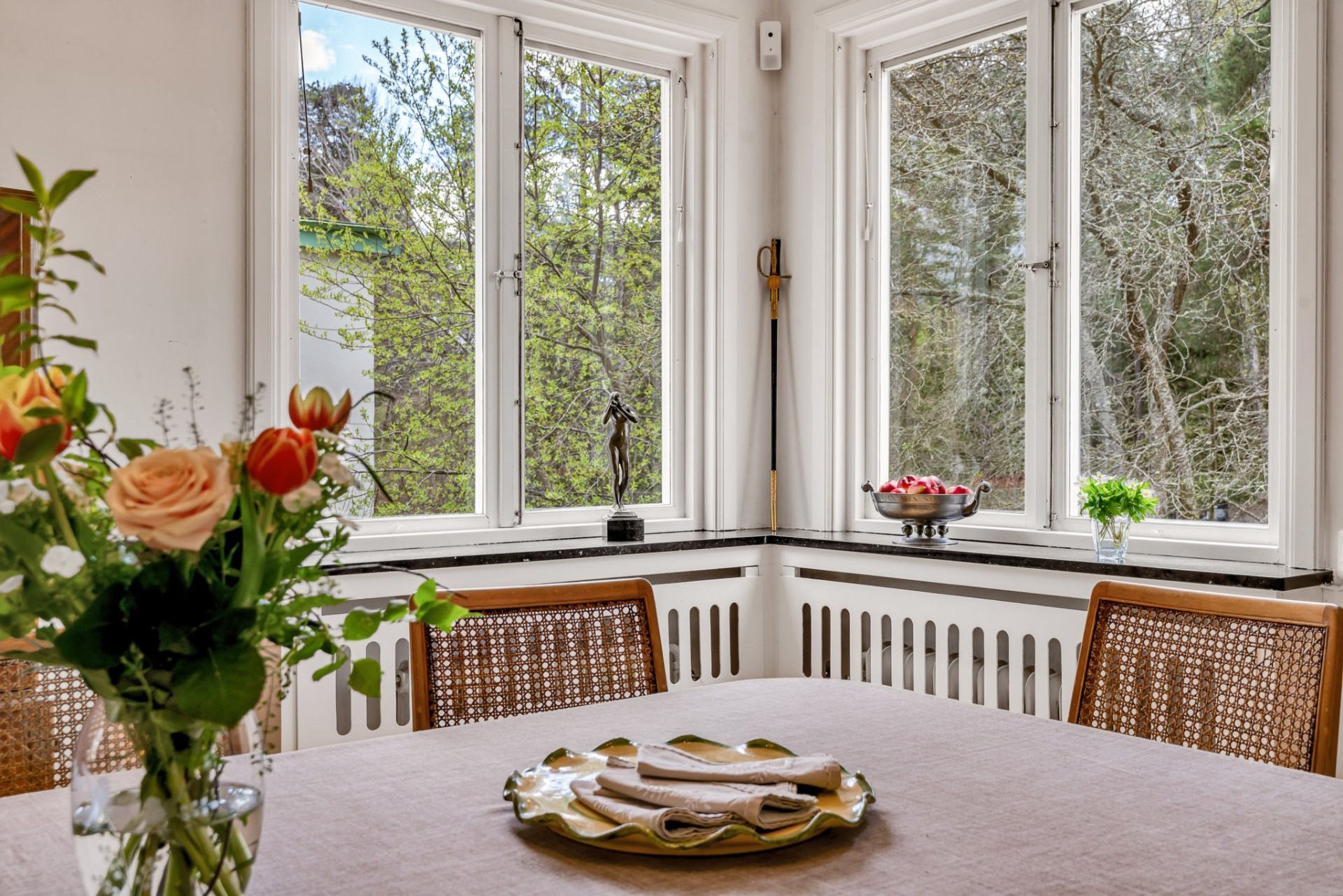 Hallen välkomnar med generösa ytor och gott om plats för avhängning i kapprummet rakt fram. Här vilar fötterna på vackert originalgolv i klinker och mosaik, och redan vid entrén möts vi av fina detaljer såsom blyspröjsade fönster och generös takhöjd. Intill kapprummet finns även en praktisk gäst-WC. Vidare in mot vardagsrum och matsal fortsätter bostaden att imponera med sina genomtänkta ytor och klassiska inslag.Tack vare öppen planlösning blir här en genomgående rymd och plats för all tänkbar möblering. Klassiska stora fönsterpartier skänker mycket ljus och fortsatt tidstypiska detaljer såsom fiskbensparkett, elementskydd i original och en värmande öppen spis pryder sin plats. Härifrån tar vi oss även ut till den stora, vackert rundade altanen med sol dagen lång. Här ryms utan problem många på middag under sommarhalvåret och vi kan njuta av lugnet och tystnaden utan insyn från grannar.