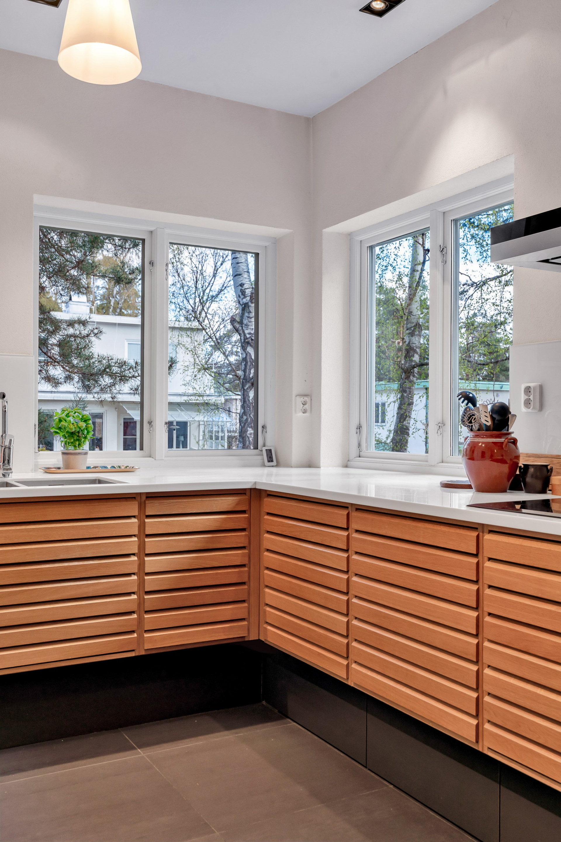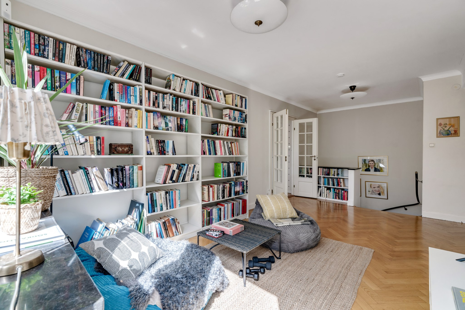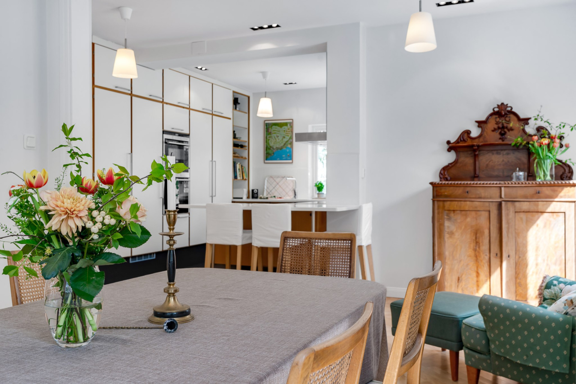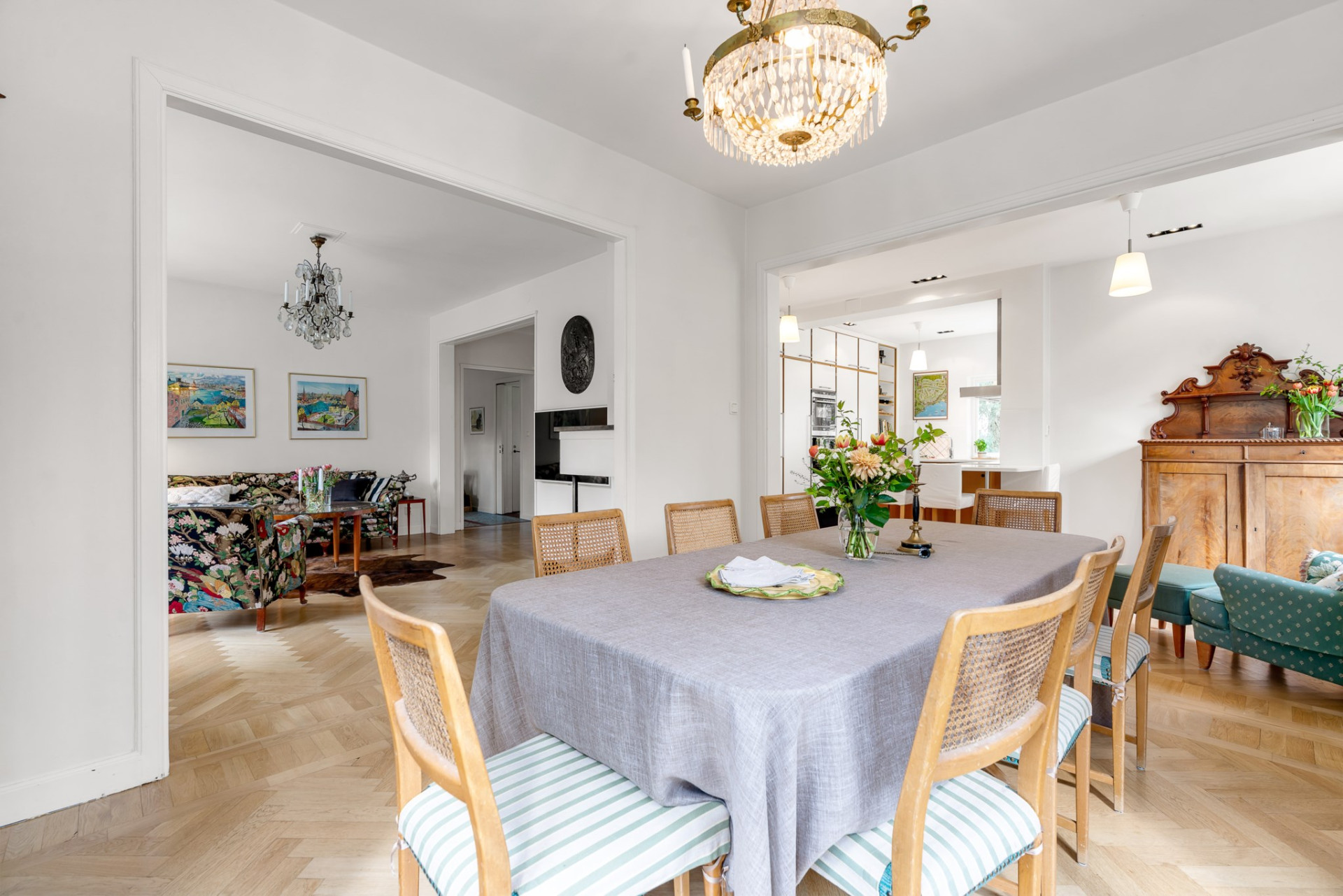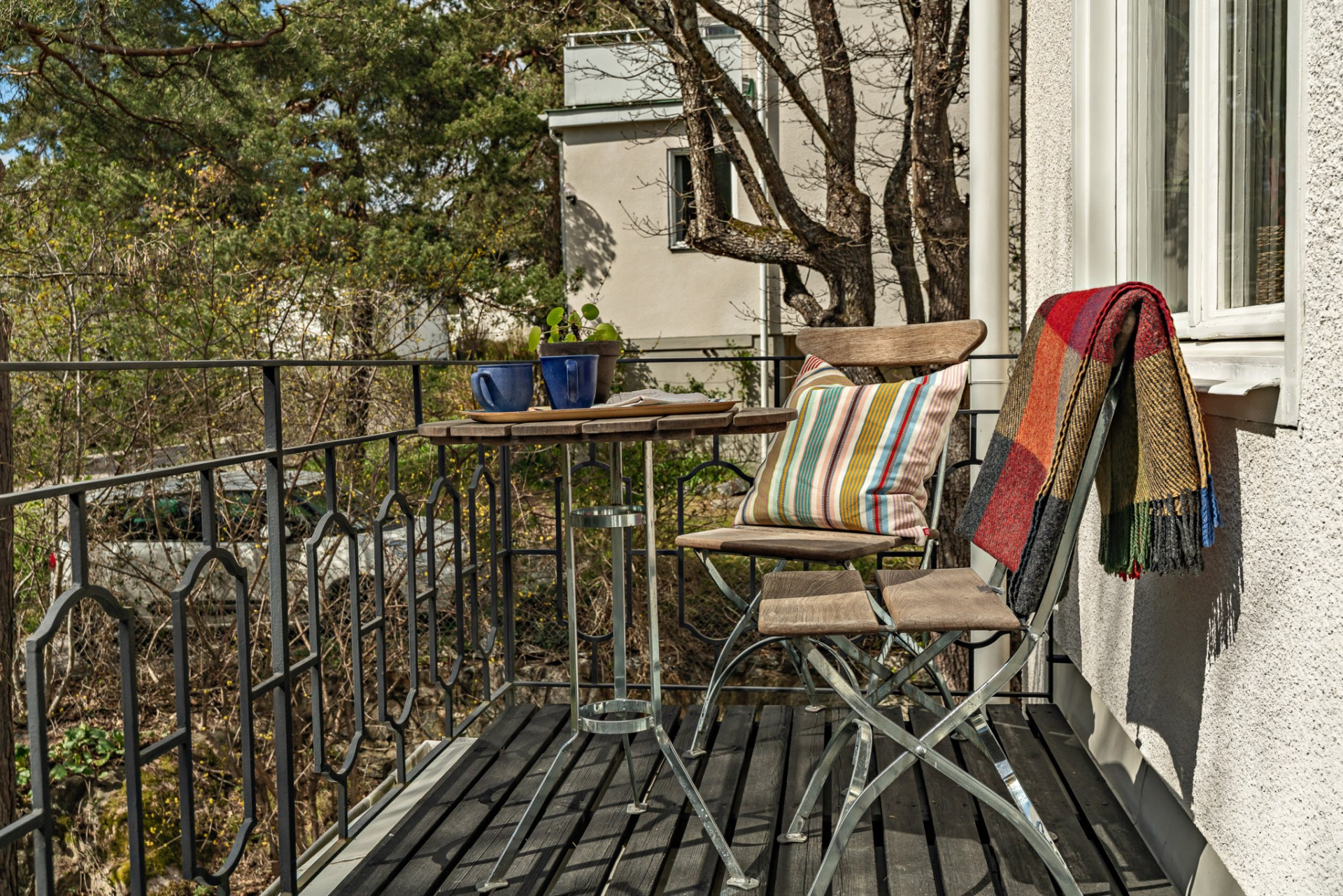 Hallen välkomnar med generösa ytor och gott om plats för avhängning i kapprummet rakt fram. Här vilar fötterna på vackert originalgolv i klinker och mosaik, och redan vid entrén möts vi av fina detaljer såsom blyspröjsade fönster och generös takhöjd. Intill kapprummet finns även en praktisk gäst-WC. Vidare in mot vardagsrum och matsal fortsätter bostaden att imponera med sina genomtänkta ytor och klassiska inslag.Tack vare öppen planlösning blir här en genomgående rymd och plats för all tänkbar möblering. Klassiska stora fönsterpartier skänker mycket ljus och fortsatt tidstypiska detaljer såsom fiskbensparkett, elementskydd i original och en värmande öppen spis pryder sin plats. Härifrån tar vi oss även ut till den stora, vackert rundade altanen med sol dagen lång. Här ryms utan problem många på middag under sommarhalvåret och vi kan njuta av lugnet och tystnaden utan insyn från grannar.
