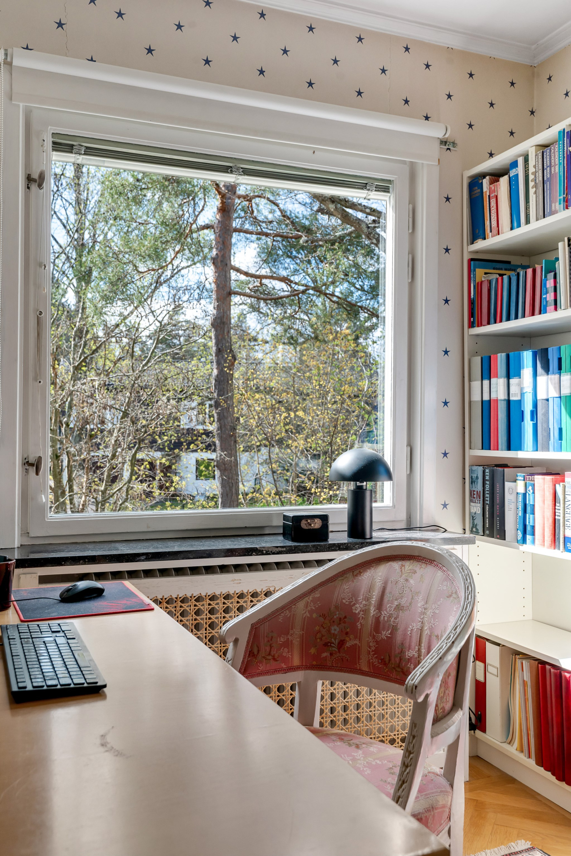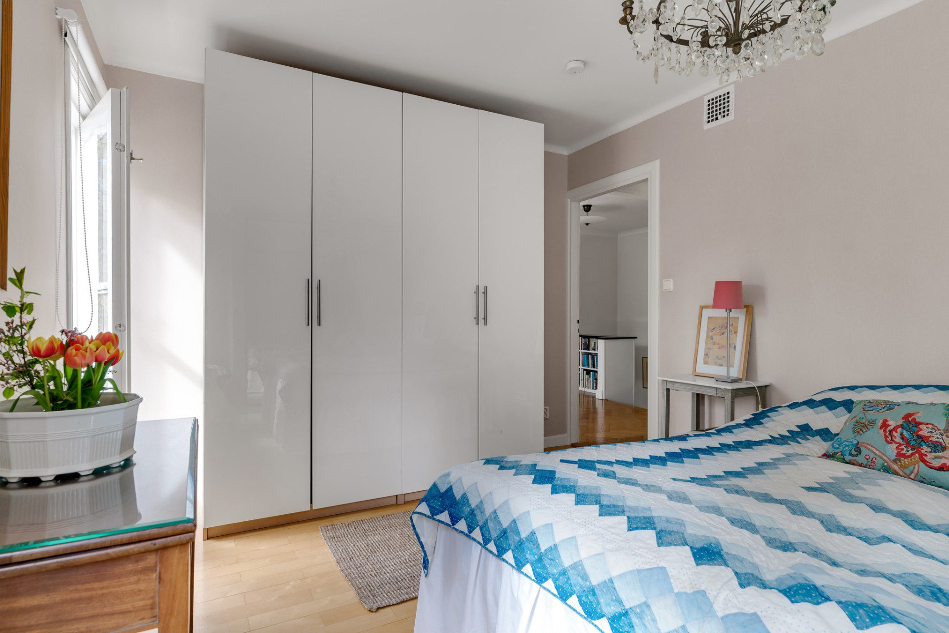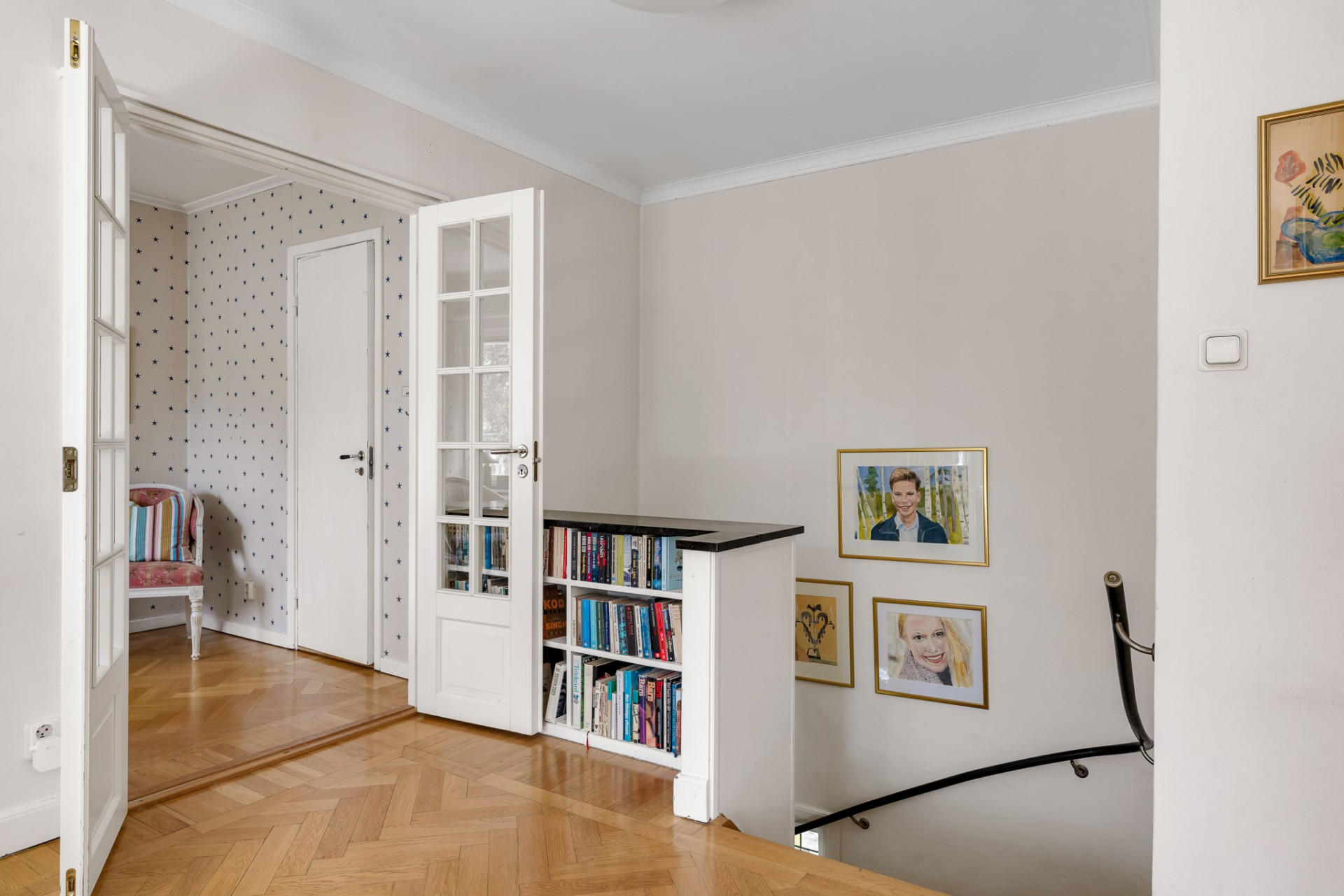 Längs vacker ektrappa tar vi oss upp till övre plan där vi välkomnas av inte mindre än tre sovrum – möjlighet till fyra, badrum och ett vardagsrum. Vardagsrummet erbjuder alla klassiska attribut som fiskbensparkett och marmorskivor medan de stora fönsterpartierna skänker mycket ljus. För den som önskar kan detta även bli ett fjärde sovrum. Härifrån tar vi oss ut till den stora balkongen med högt och fritt läge. Badrummet invid är helkaklat i sobert vitt och blått med wc, praktisk kommod och badkar. "Master bedroom" erbjuder klassisk björkparkett, väggar i vacker lintapet i grå ton och en hel garderobsvägg som sköter det mesta av förvaringen. Även härifrån tar vi oss ut till balkongen. Sovrummet intill erbjuder även det plats för säng och skrivbord om så önskas och en rymlig klädkammare sköter förvaringen. Vacker fondtapet i småblommigt blir en snygg kontrast till de i övrigt sobert vita väggarna. Tillbaka genom hall och vardagsrum och genom vackra pardörrar tar vi till det tredje sovrummet. Även här med vackert ljusinsläpp och en stor walk in closet.