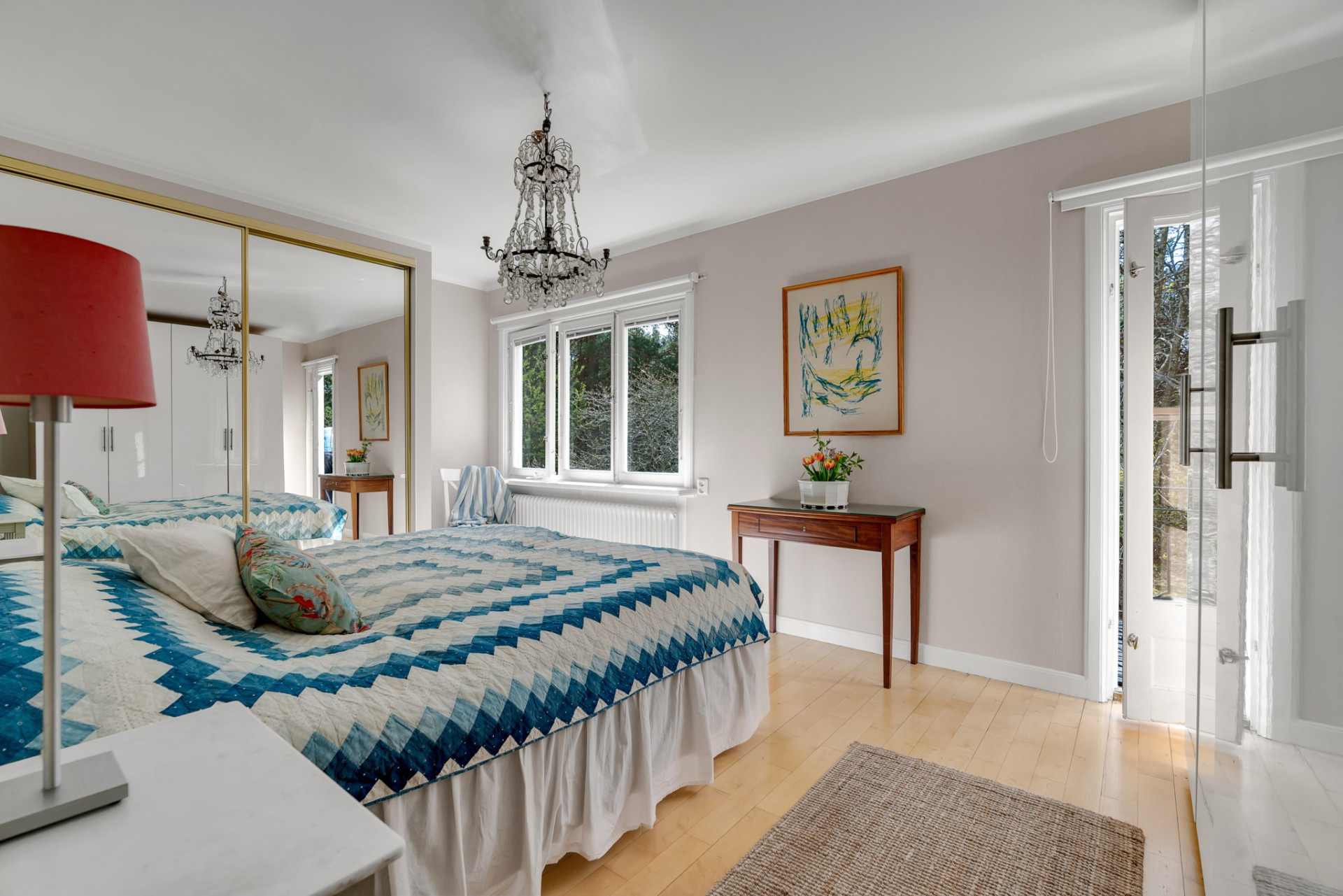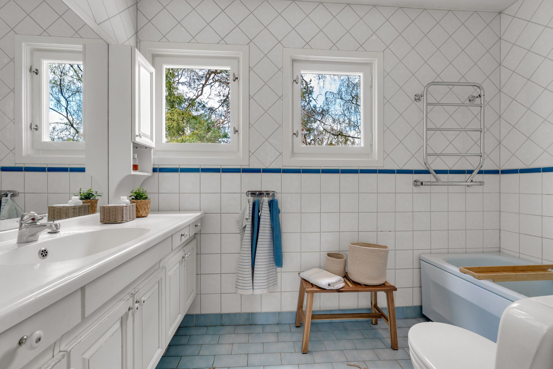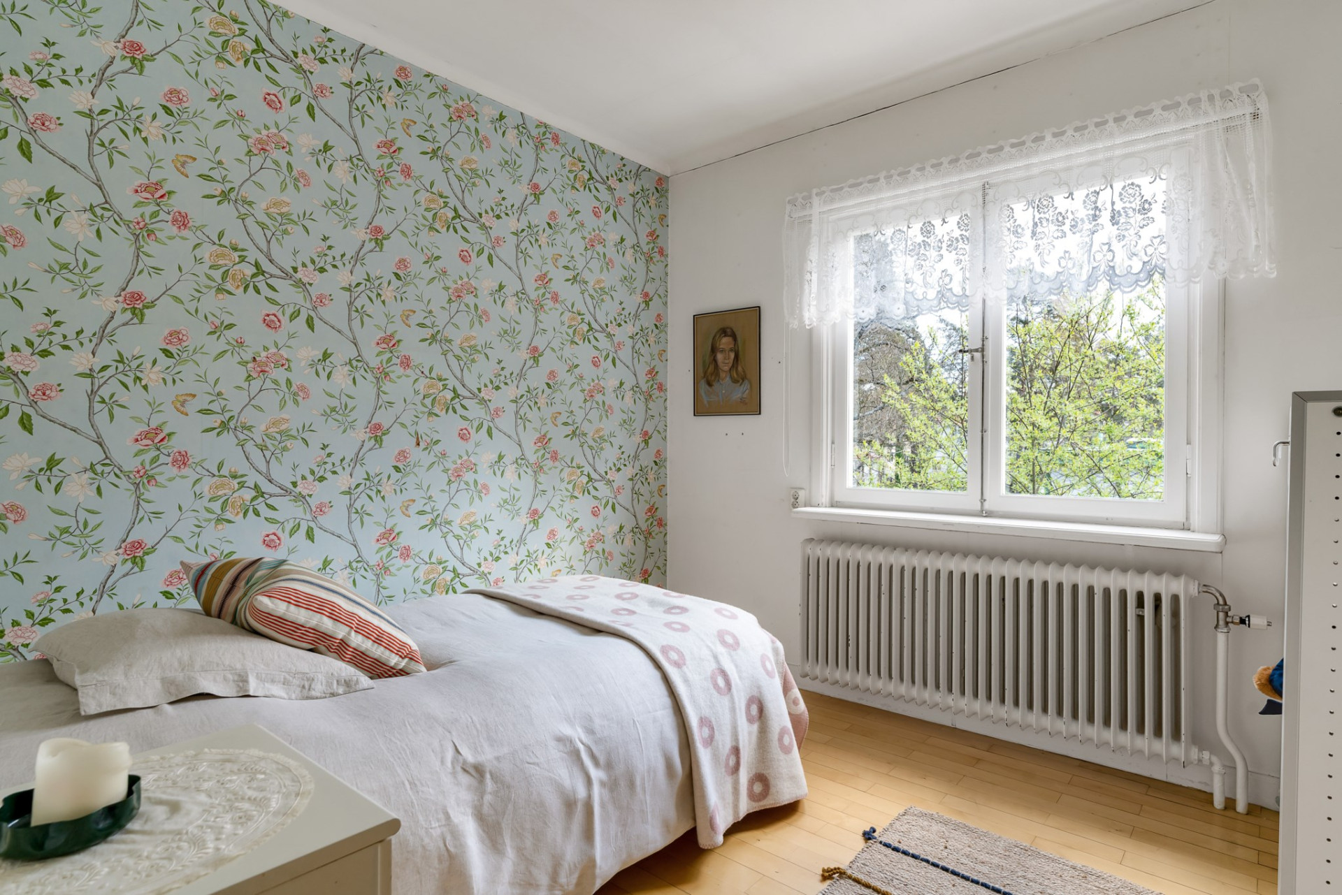 Längs vacker ektrappa tar vi oss upp till övre plan där vi välkomnas av inte mindre än tre sovrum – möjlighet till fyra, badrum och ett vardagsrum. Vardagsrummet erbjuder alla klassiska attribut som fiskbensparkett och marmorskivor medan de stora fönsterpartierna skänker mycket ljus. För den som önskar kan detta även bli ett fjärde sovrum. Härifrån tar vi oss ut till den stora balkongen med högt och fritt läge. Badrummet invid är helkaklat i sobert vitt och blått med wc, praktisk kommod och badkar. "Master bedroom" erbjuder klassisk björkparkett, väggar i vacker lintapet i grå ton och en hel garderobsvägg som sköter det mesta av förvaringen. Även härifrån tar vi oss ut till balkongen. Sovrummet intill erbjuder även det plats för säng och skrivbord om så önskas och en rymlig klädkammare sköter förvaringen. Vacker fondtapet i småblommigt blir en snygg kontrast till de i övrigt sobert vita väggarna. Tillbaka genom hall och vardagsrum och genom vackra pardörrar tar vi till det tredje sovrummet. Även här med vackert ljusinsläpp och en stor walk in closet.