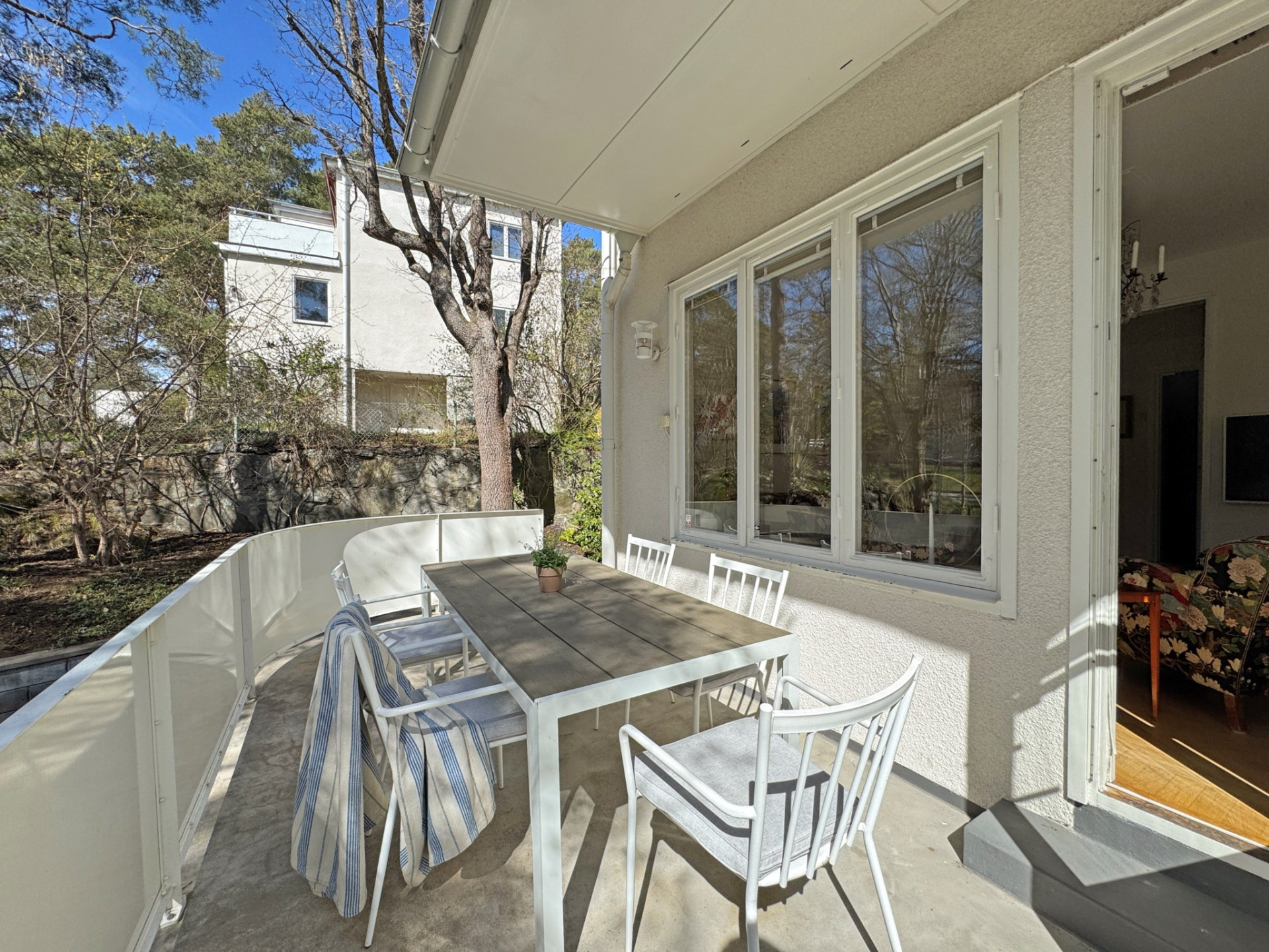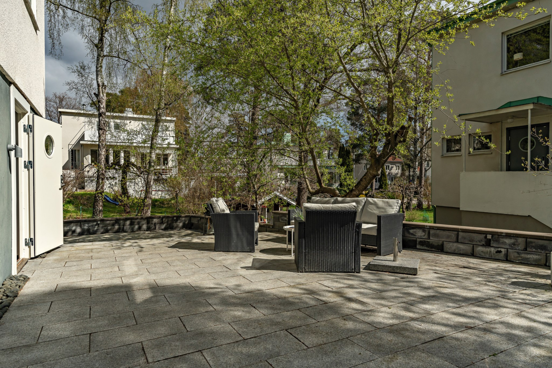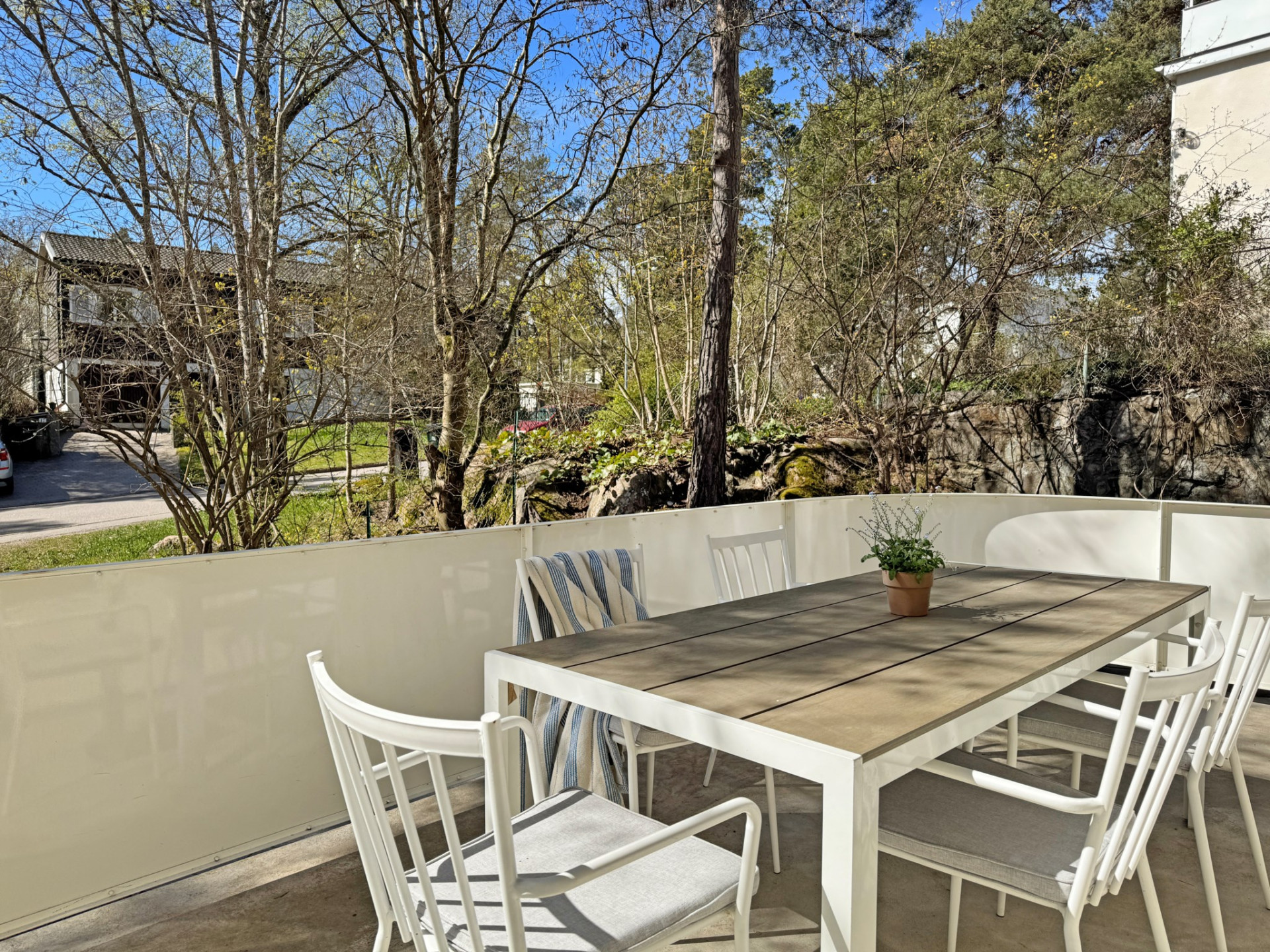 Från entrén på soutterängplan kliver vi rakt ut till en generös, stenbelagd uteplats som bjuder in till härliga stunder utomhus. Här finns gott om plats för både matgrupp, loungemöbler och grill – en perfekt miljö för såväl avkoppling som sociala tillställningar. Uteplatsen ligger insynsskyddat och omges av lummig grönska, vilket skapar en privat och rofylld atmosfär. Härifrån har du även fin uppsikt över den plana gräsmattan, idealisk för lek och spel för både stora och små. På tomten finns dessutom ett rymligt förråd samt lättillgänglig parkering för två bilar.