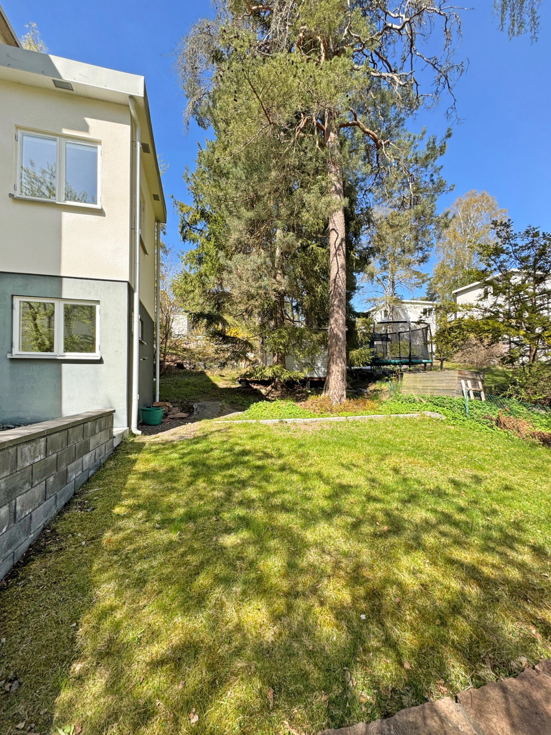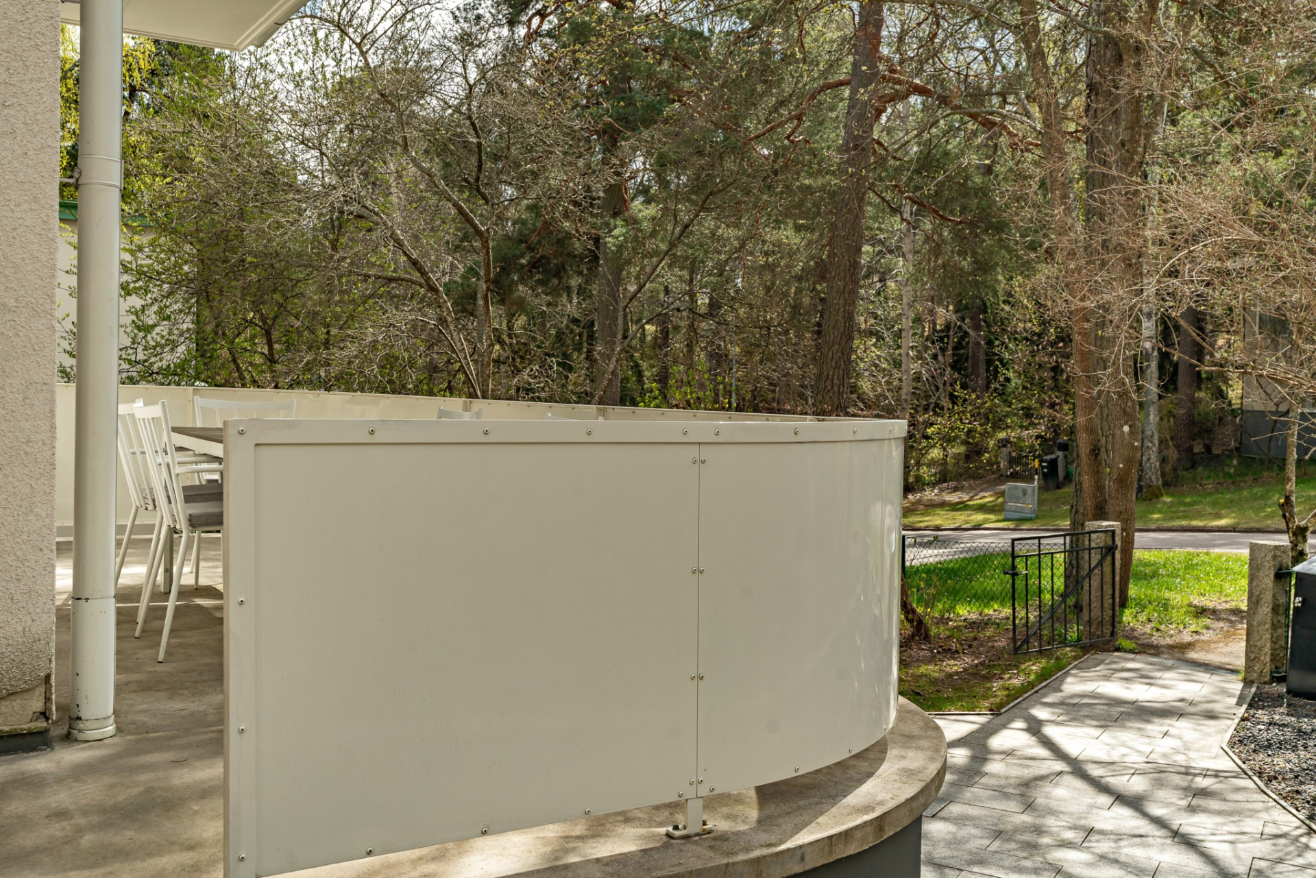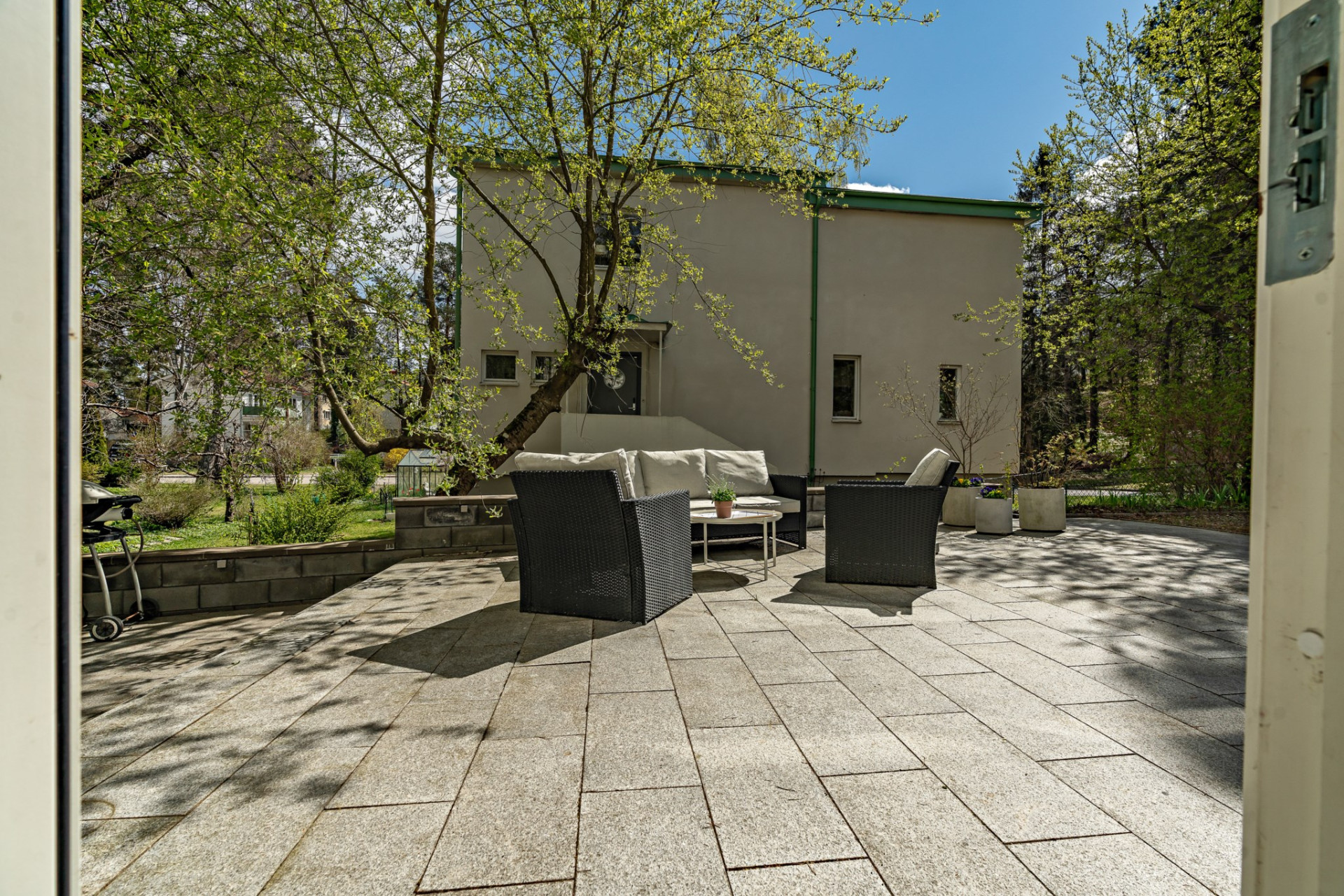 Från entrén på soutterängplan kliver vi rakt ut till en generös, stenbelagd uteplats som bjuder in till härliga stunder utomhus. Här finns gott om plats för både matgrupp, loungemöbler och grill – en perfekt miljö för såväl avkoppling som sociala tillställningar. Uteplatsen ligger insynsskyddat och omges av lummig grönska, vilket skapar en privat och rofylld atmosfär. Härifrån har du även fin uppsikt över den plana gräsmattan, idealisk för lek och spel för både stora och små. På tomten finns dessutom ett rymligt förråd samt lättillgänglig parkering för två bilar.
