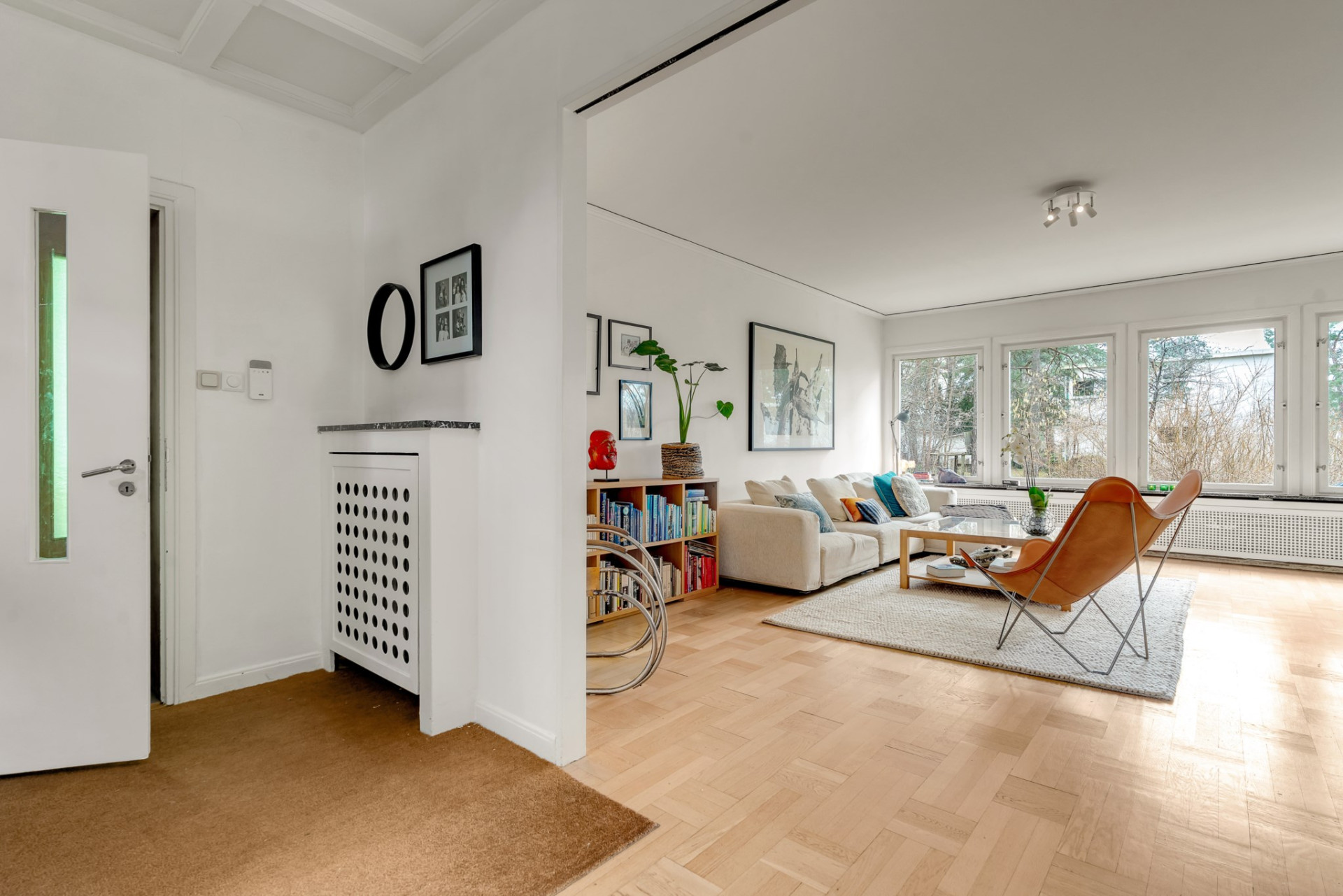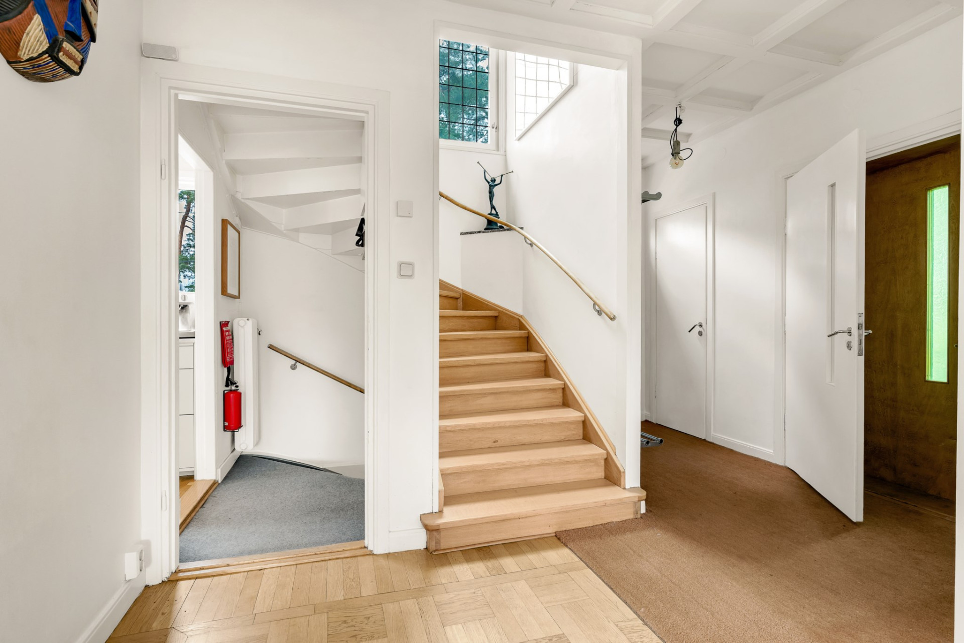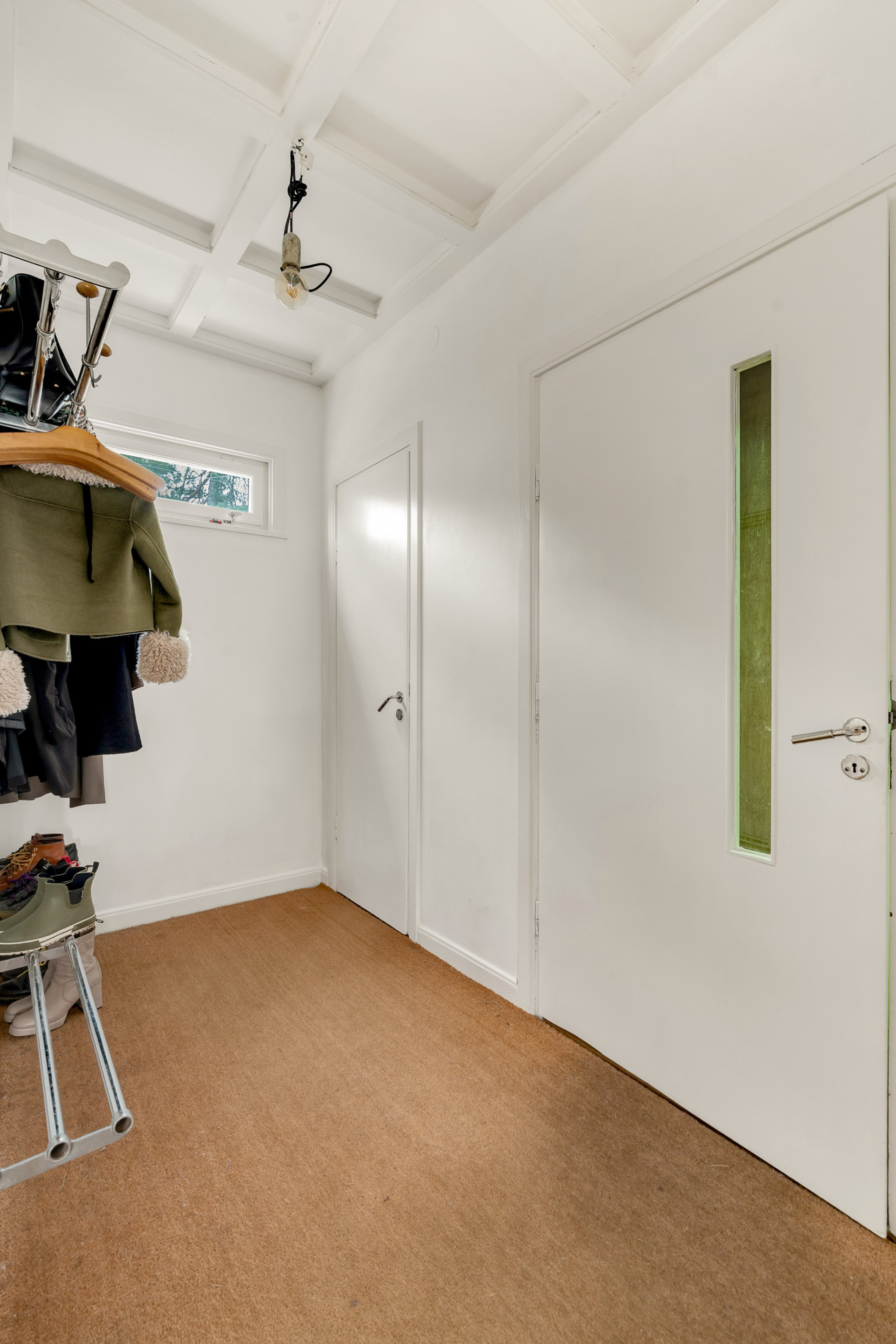 Hallen välkomnar med gott om plats för ytterkläder och skor. På golvet vilar praktisk sisalmatta och blickar vi mot taket imponeras vi av det tidstypiska kassettaket som är karakteristiskt för området. Gäst-wc med originalgolv och målade väggar.