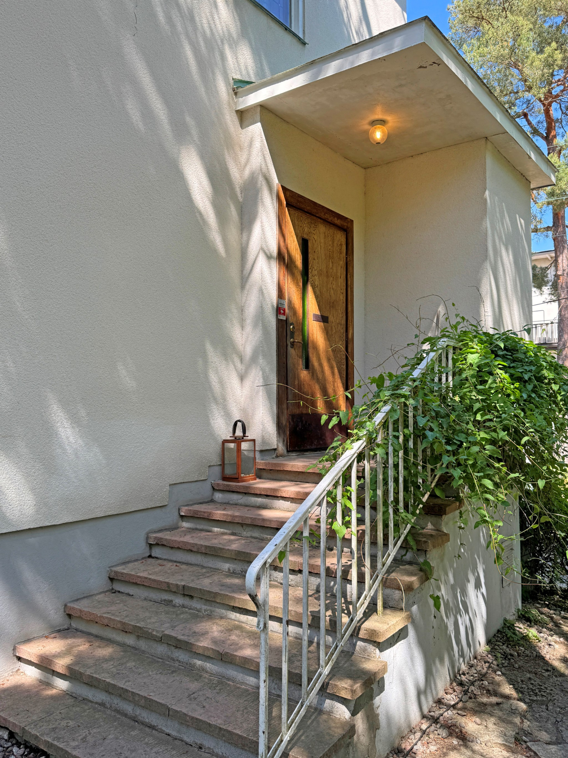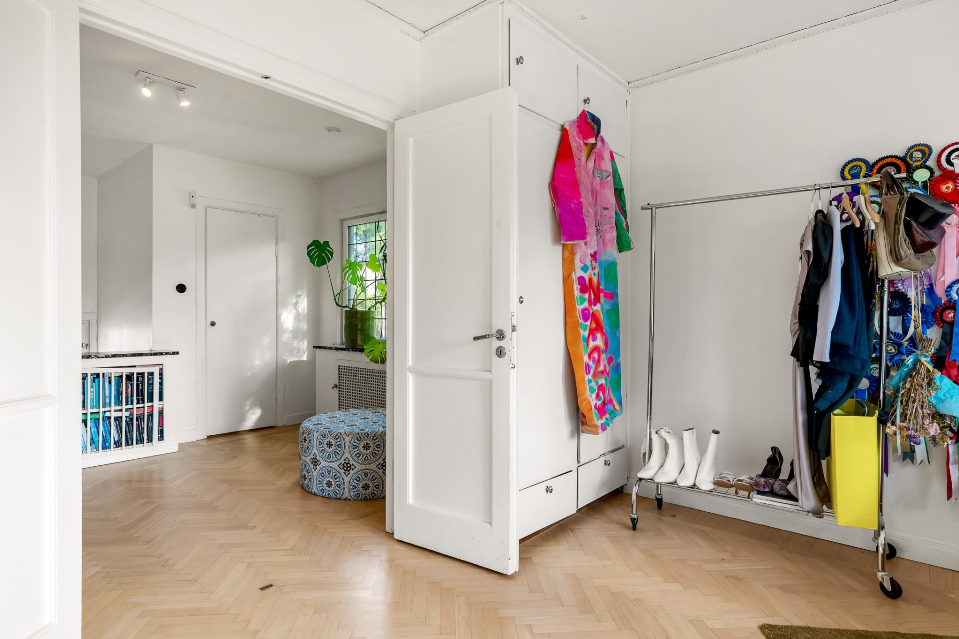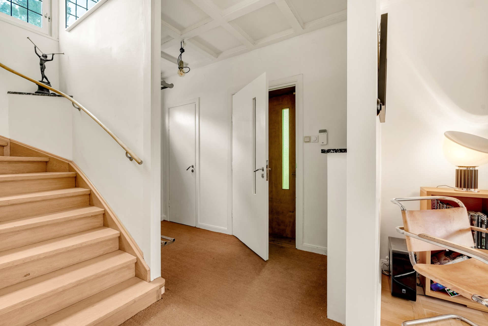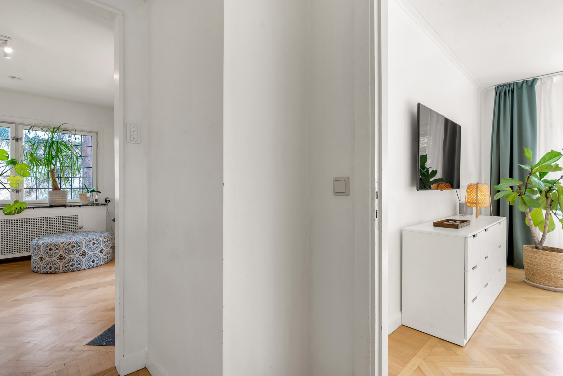 Hallen välkomnar med gott om plats för ytterkläder och skor. På golvet vilar praktisk sisalmatta och blickar vi mot taket imponeras vi av det tidstypiska kassettaket som är karakteristiskt för området. Gäst-wc med originalgolv och målade väggar.