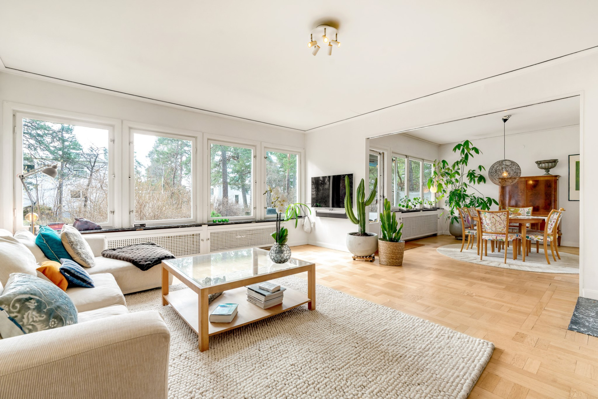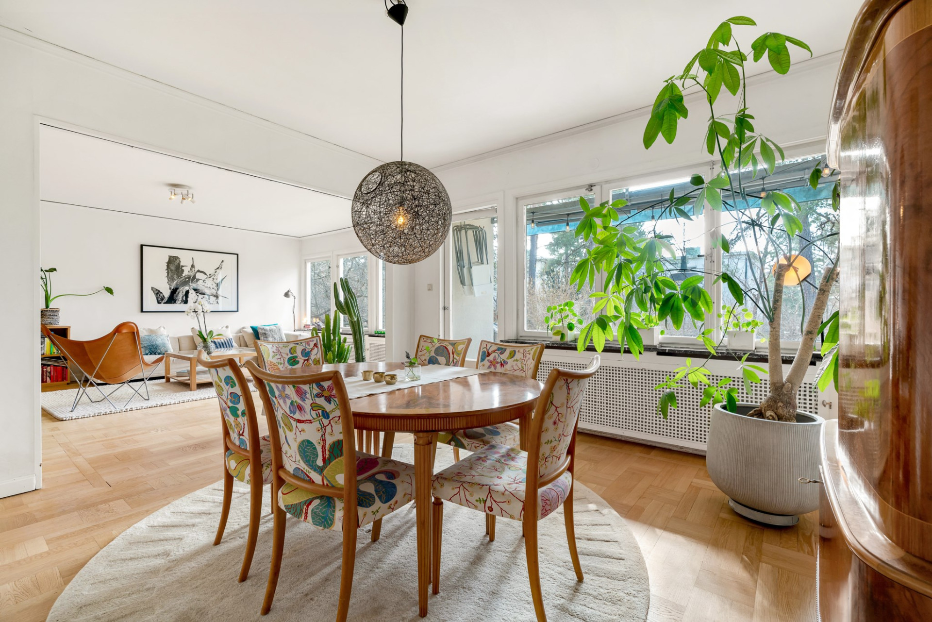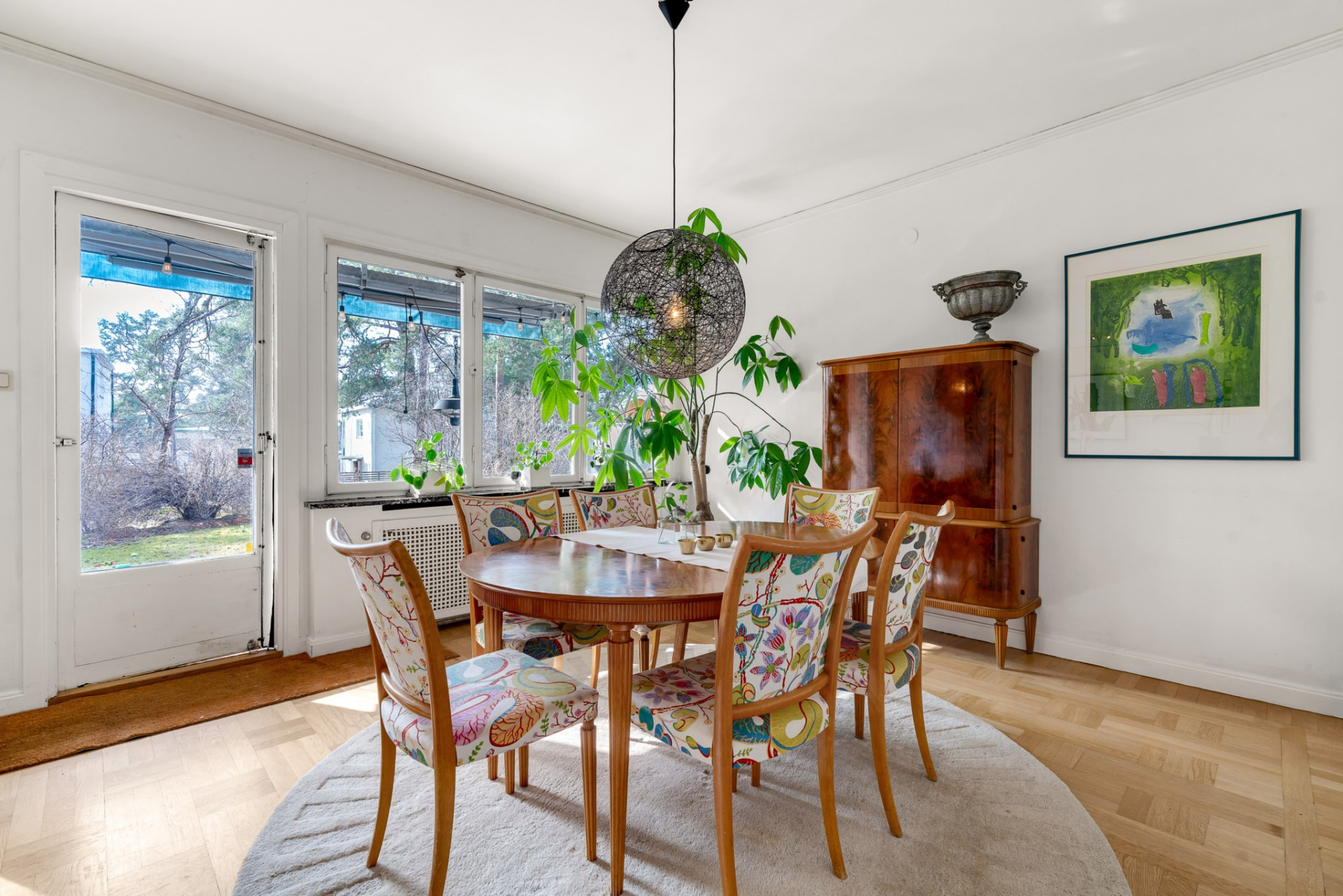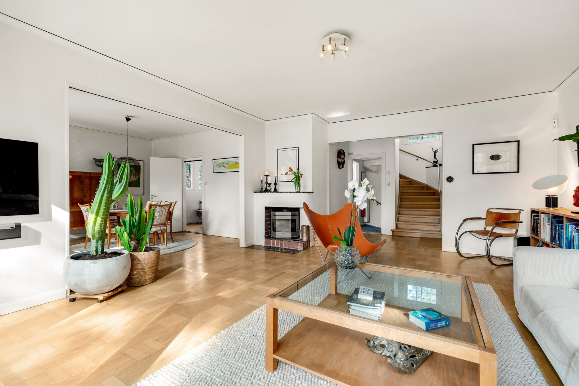 Vidare möts du av det inbjudande vardagsrummet där vi vilar fötterna på vackert parkettgolv och där generösa ytor ger möjlighet till all tänkbar möblering. En perfekt sällskapsdel för familj och många vänner. Kyliga kvällar och vintertid njuter man av en värmande brasa från den öppna spisen. Öppen planlösning mellan matsalen och vardagsrummet ger extra rymd och här bjuds gott om plats för flera på middag. Från matsalen har du utgång till den soliga terrassen och även trädgården som imponerar med soligt läge och lummig grönska utan insyn.
