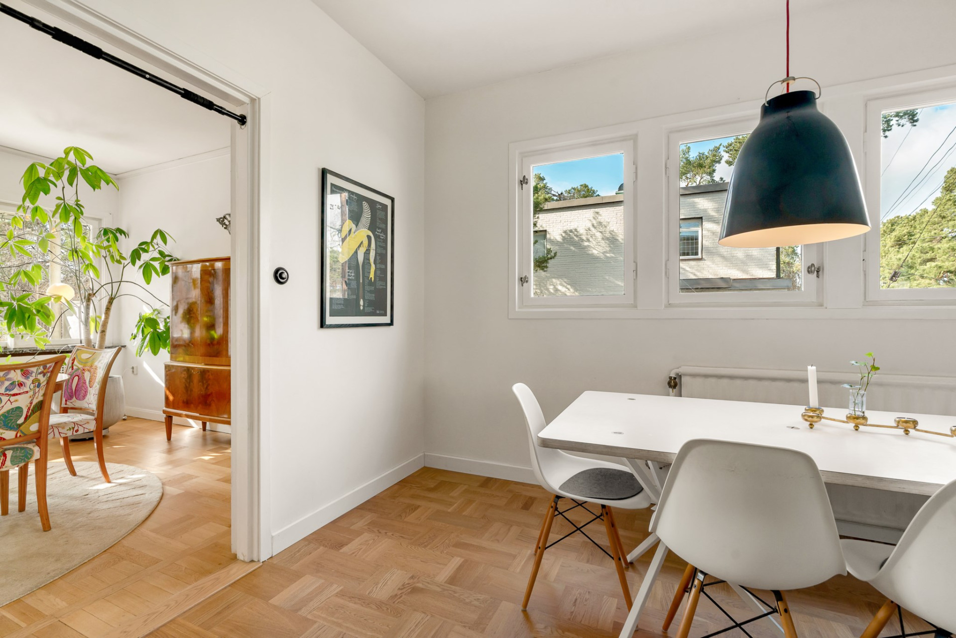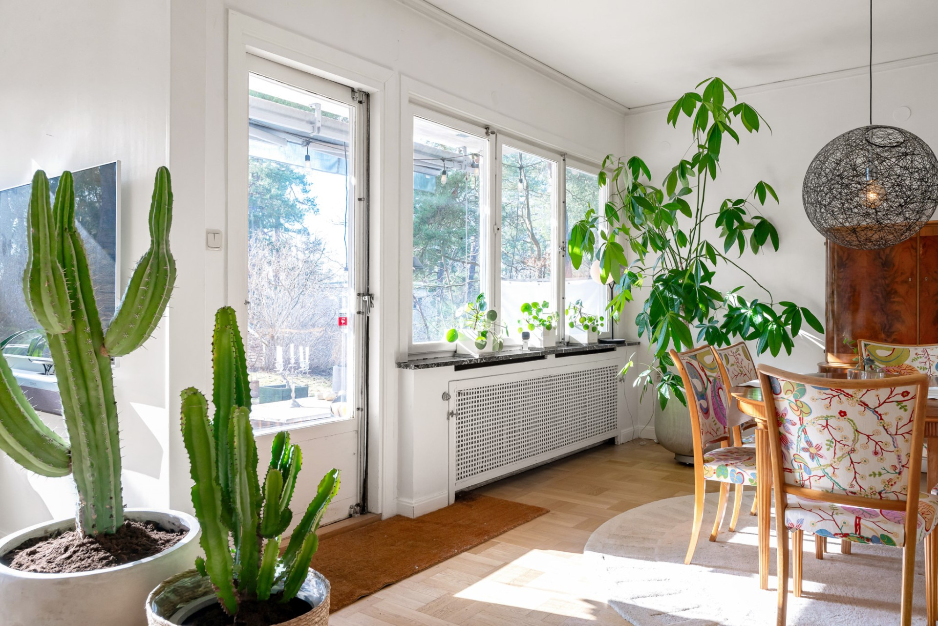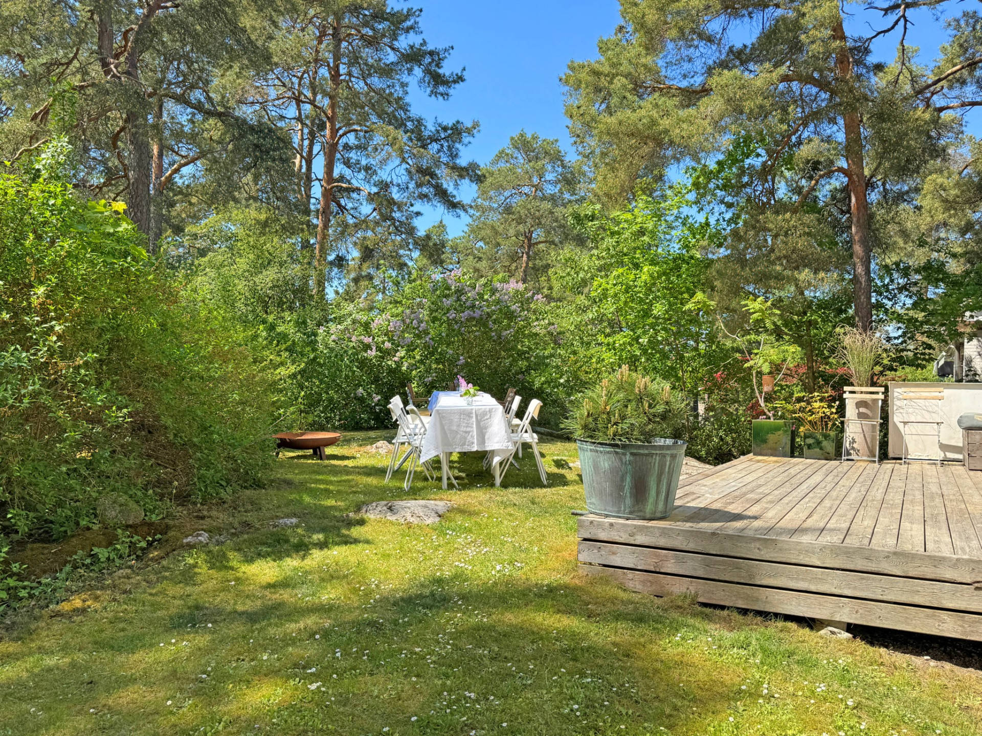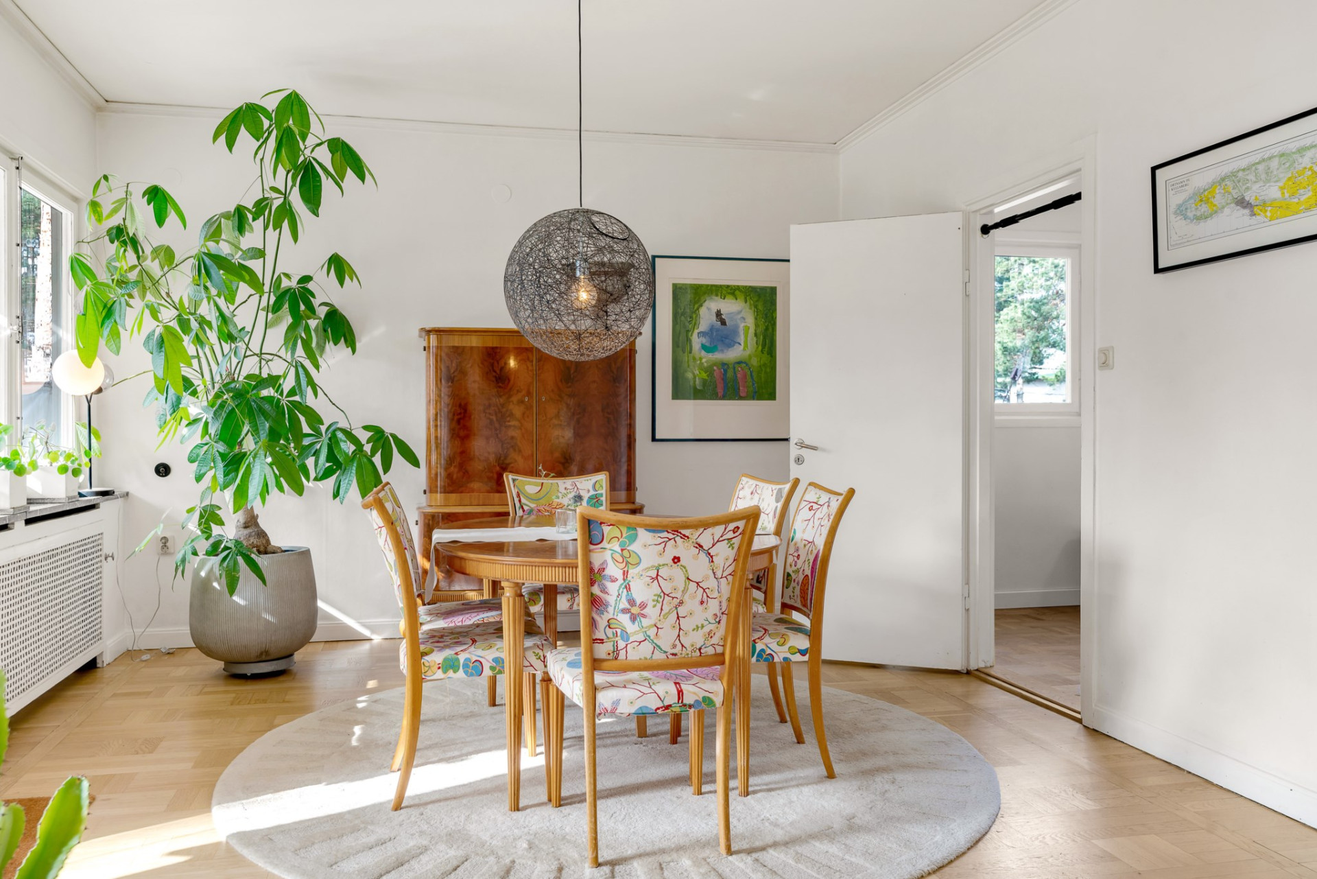 Vidare möts du av det inbjudande vardagsrummet där vi vilar fötterna på vackert parkettgolv och där generösa ytor ger möjlighet till all tänkbar möblering. En perfekt sällskapsdel för familj och många vänner. Kyliga kvällar och vintertid njuter man av en värmande brasa från den öppna spisen. Öppen planlösning mellan matsalen och vardagsrummet ger extra rymd och här bjuds gott om plats för flera på middag. Från matsalen har du utgång till den soliga terrassen och även trädgården som imponerar med soligt läge och lummig grönska utan insyn.