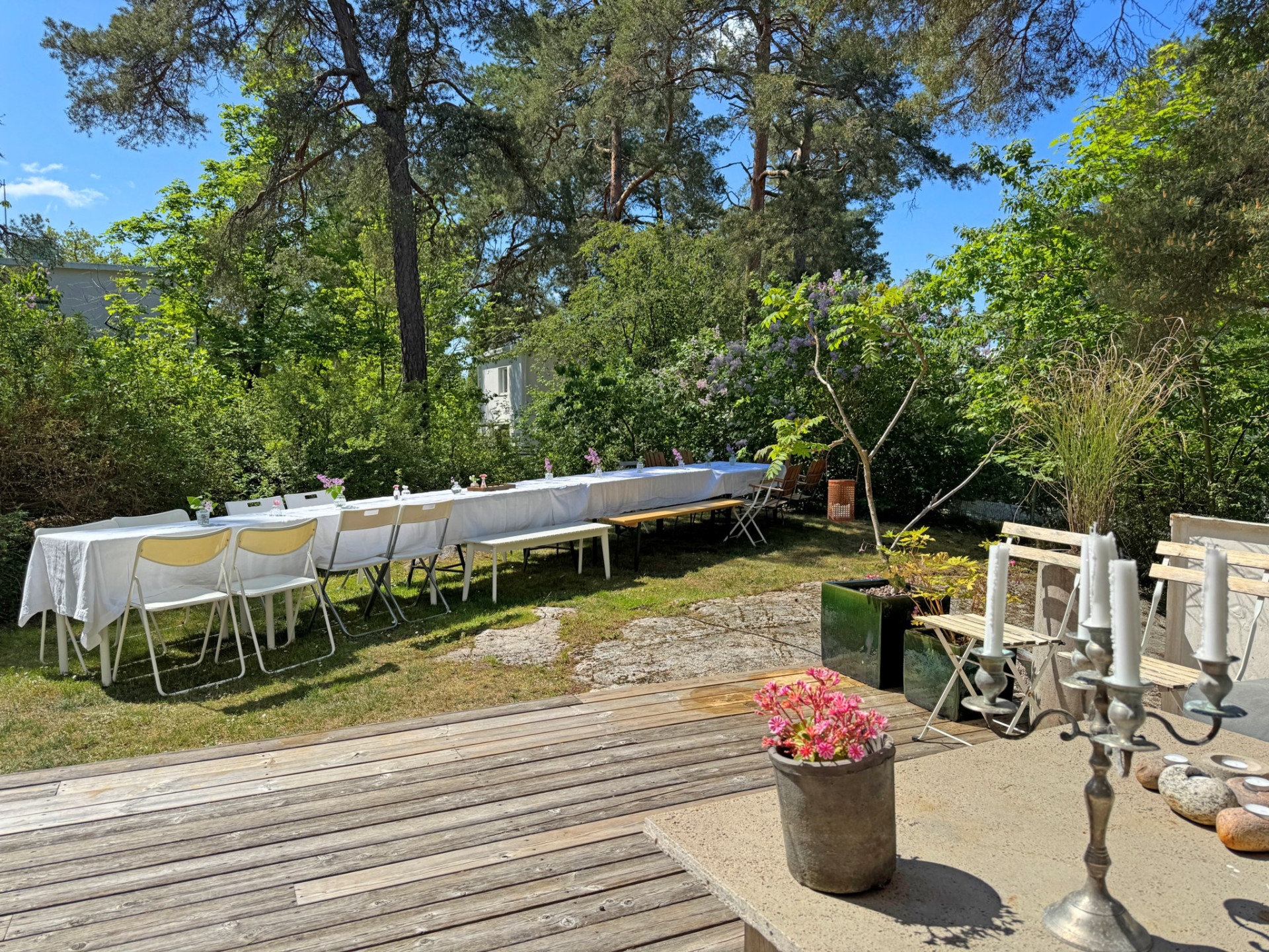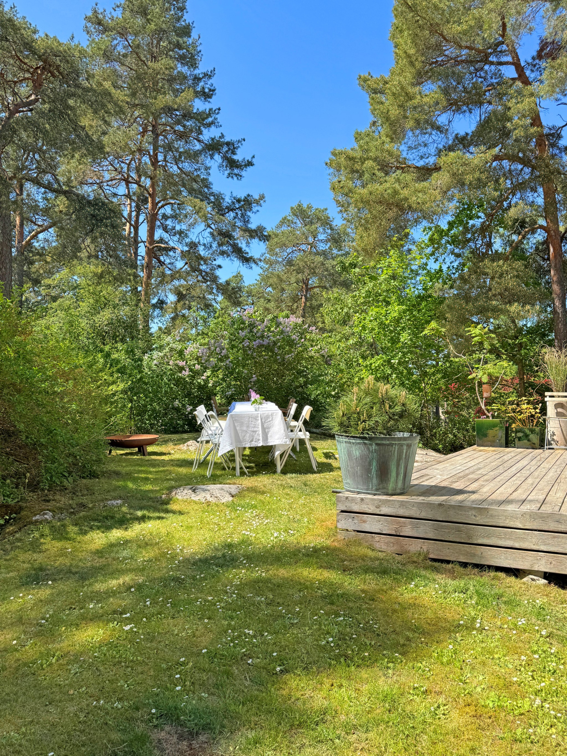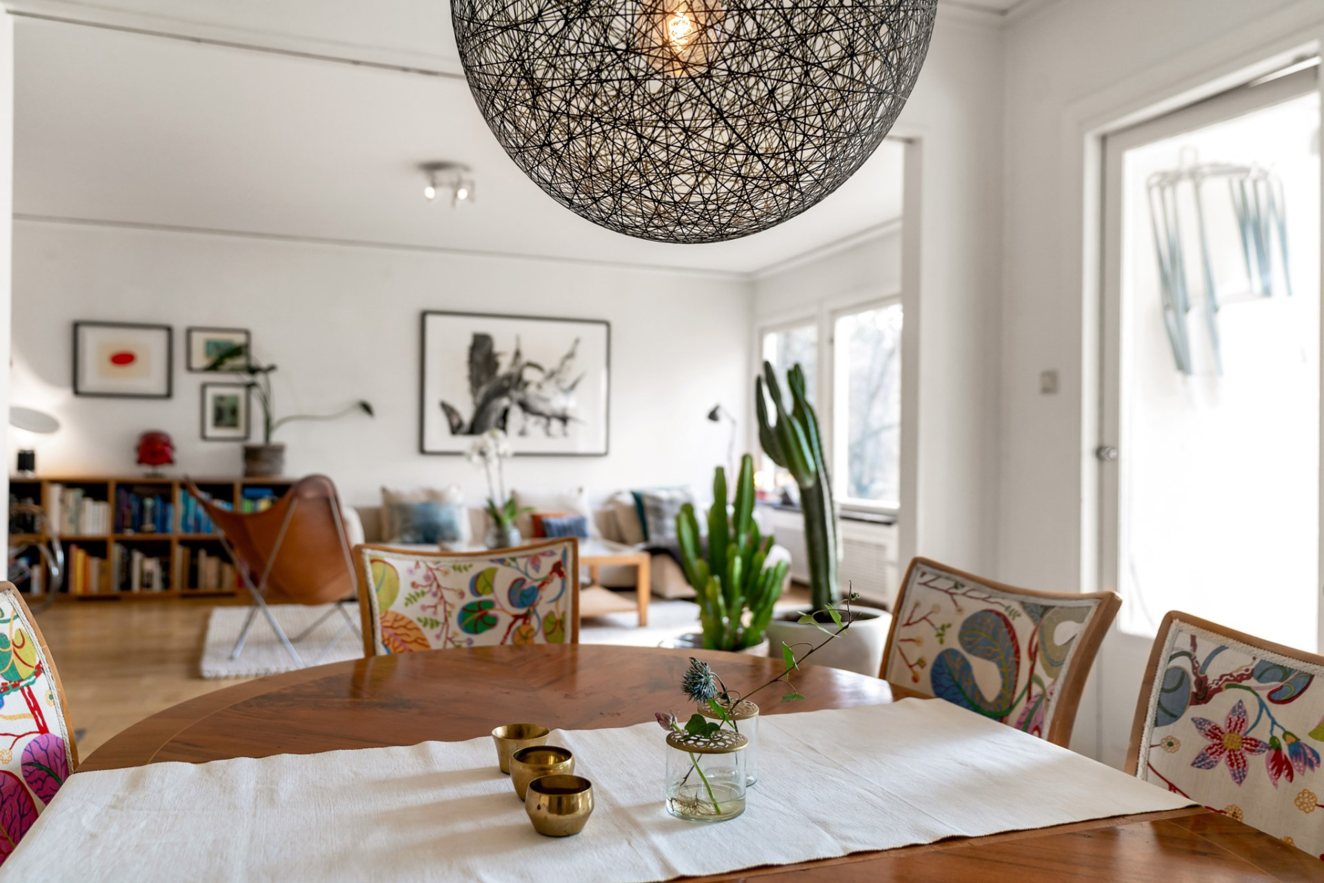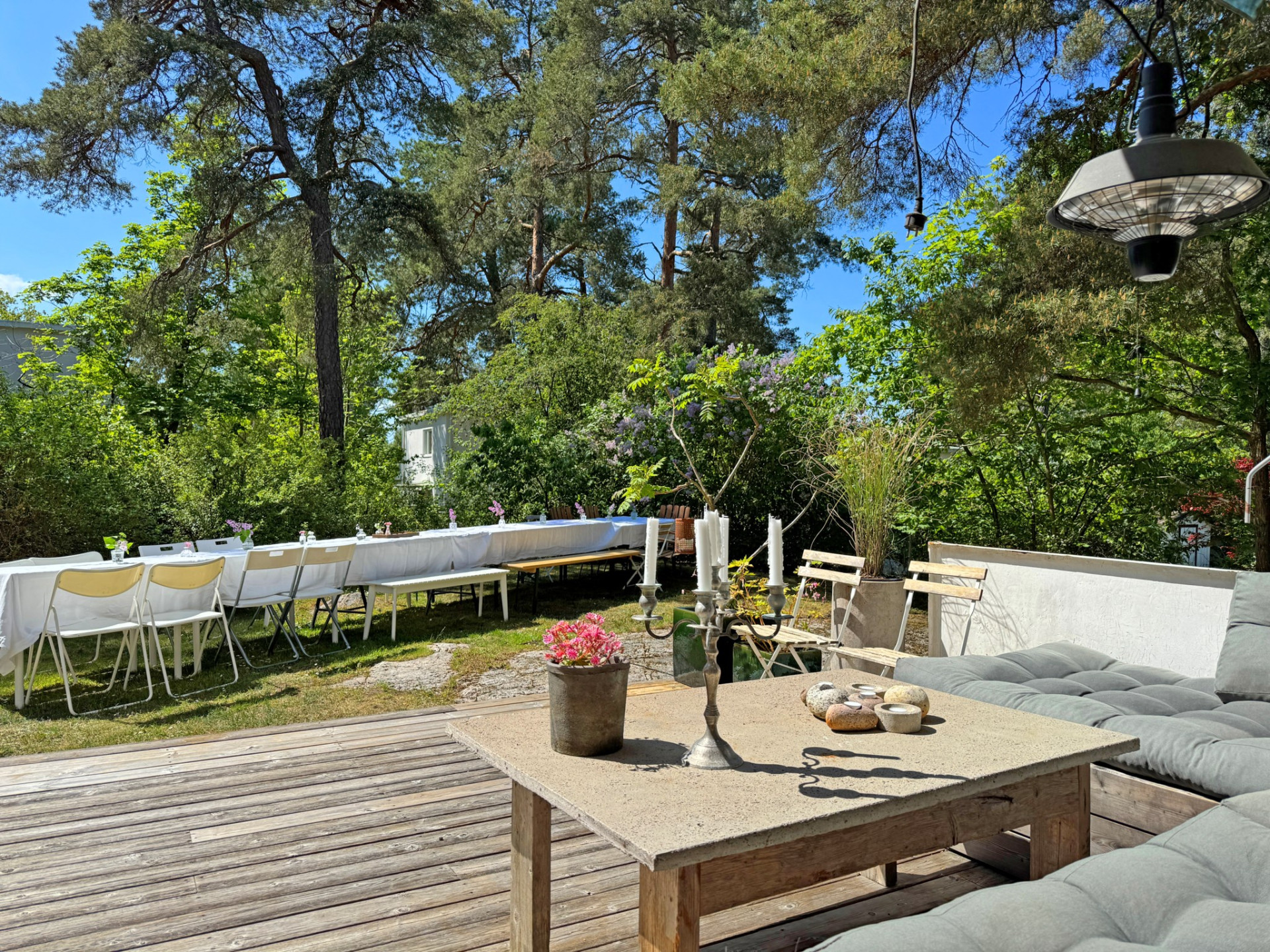 Vidare möts du av det inbjudande vardagsrummet där vi vilar fötterna på vackert parkettgolv och där generösa ytor ger möjlighet till all tänkbar möblering. En perfekt sällskapsdel för familj och många vänner. Kyliga kvällar och vintertid njuter man av en värmande brasa från den öppna spisen. Öppen planlösning mellan matsalen och vardagsrummet ger extra rymd och här bjuds gott om plats för flera på middag. Från matsalen har du utgång till den soliga terrassen och även trädgården som imponerar med soligt läge och lummig grönska utan insyn.