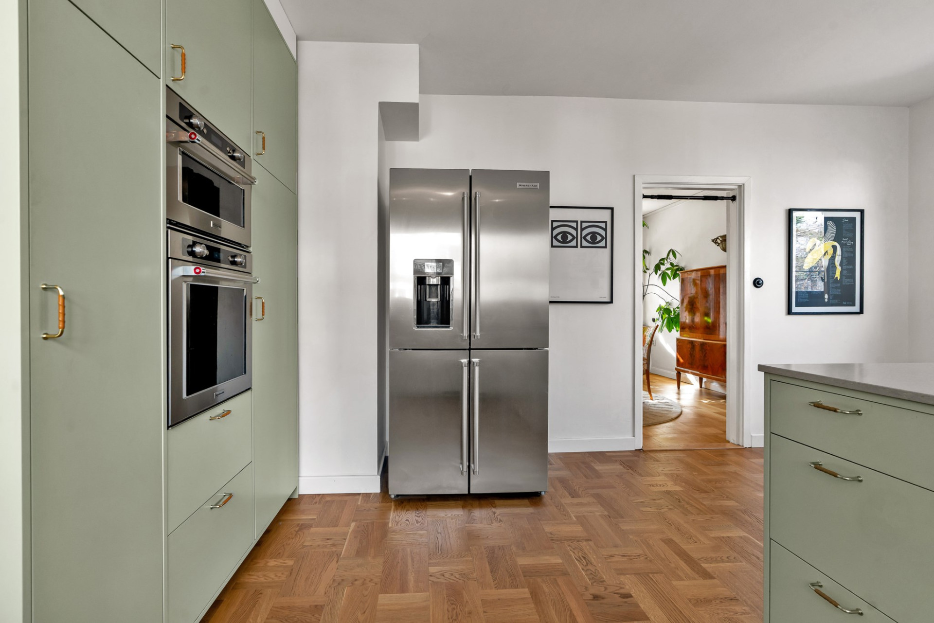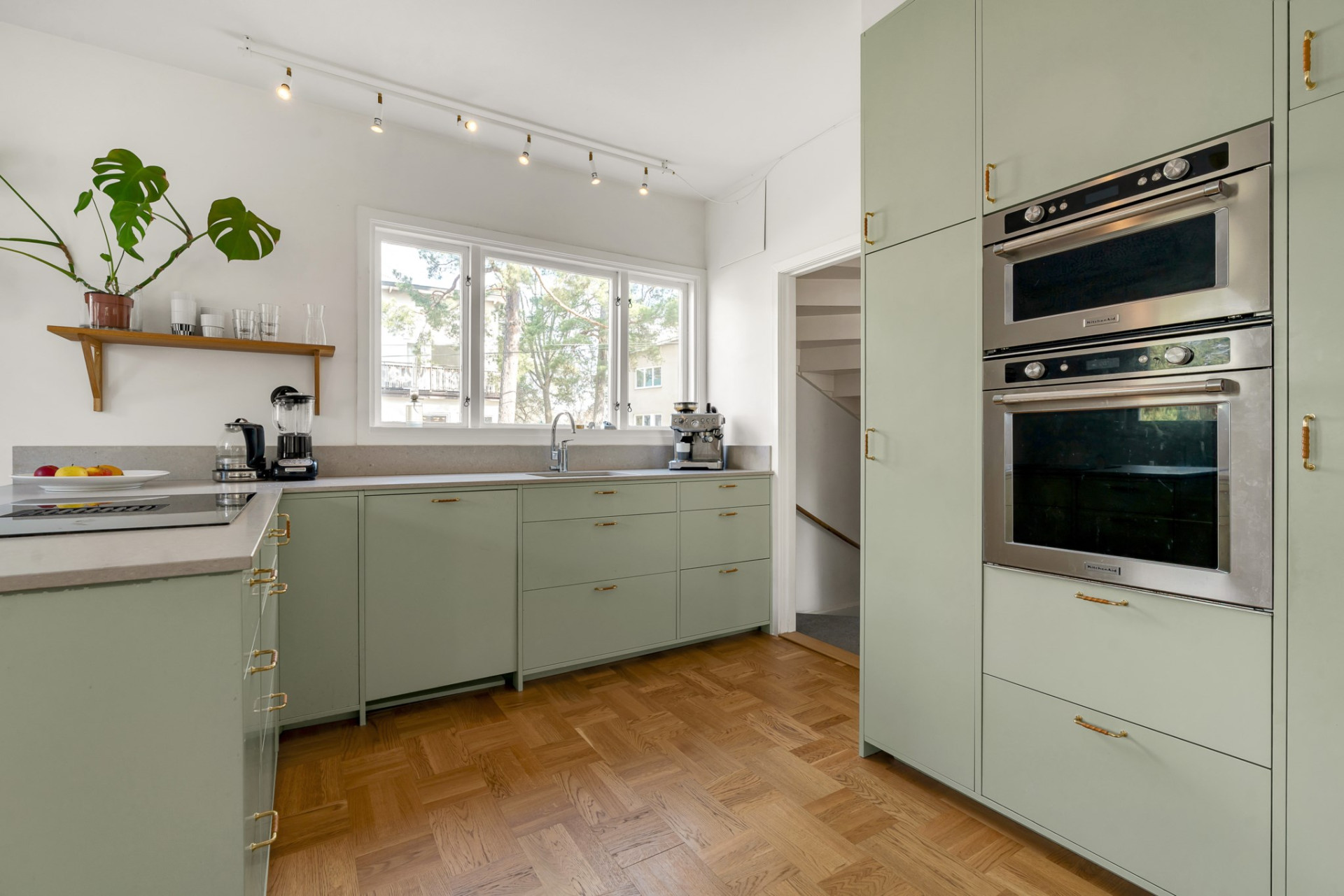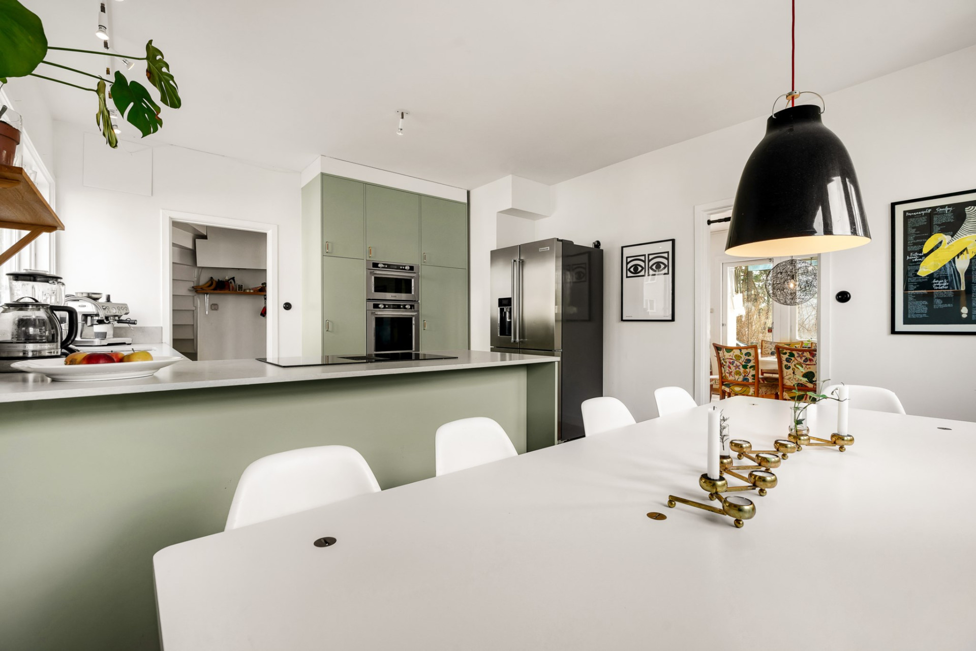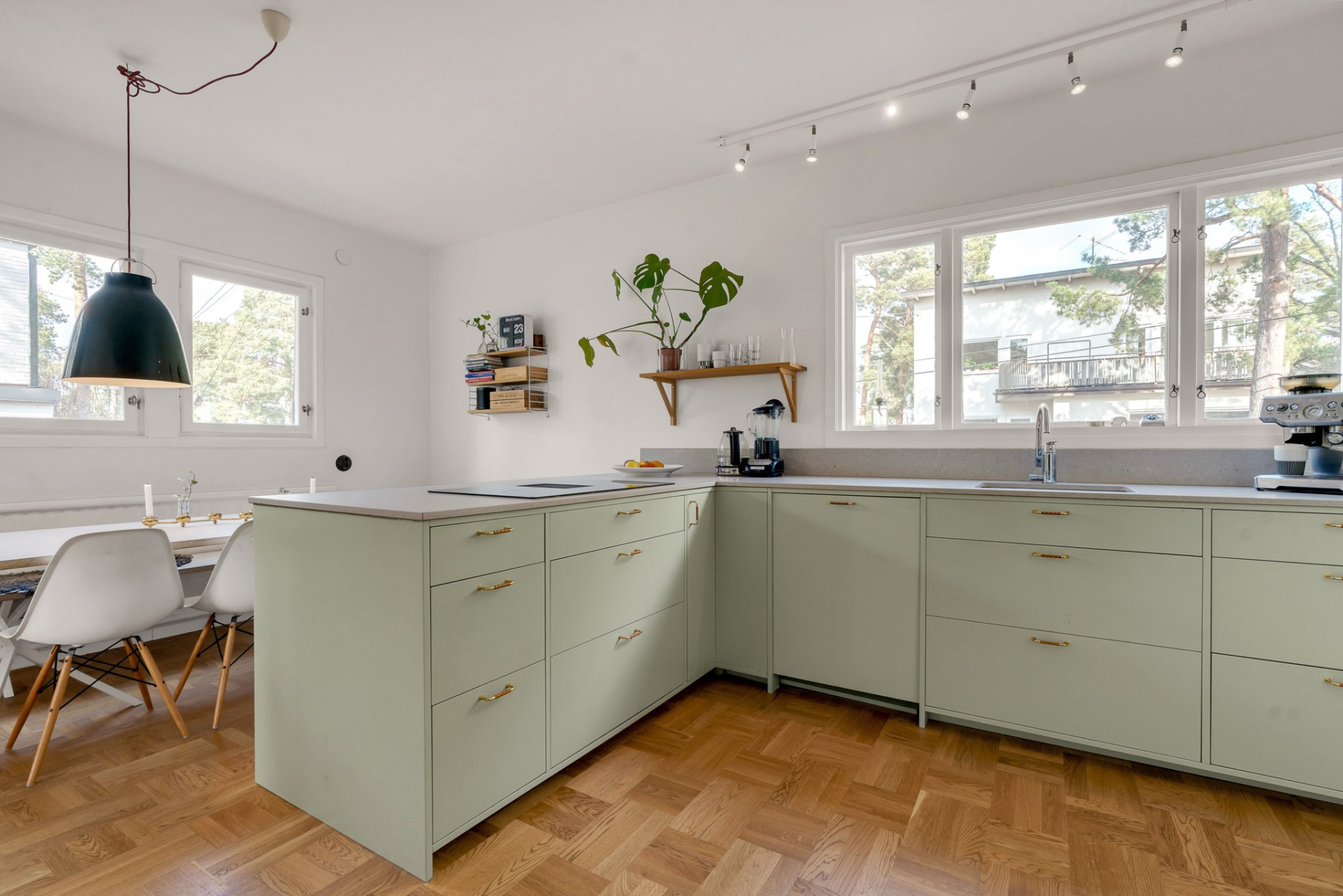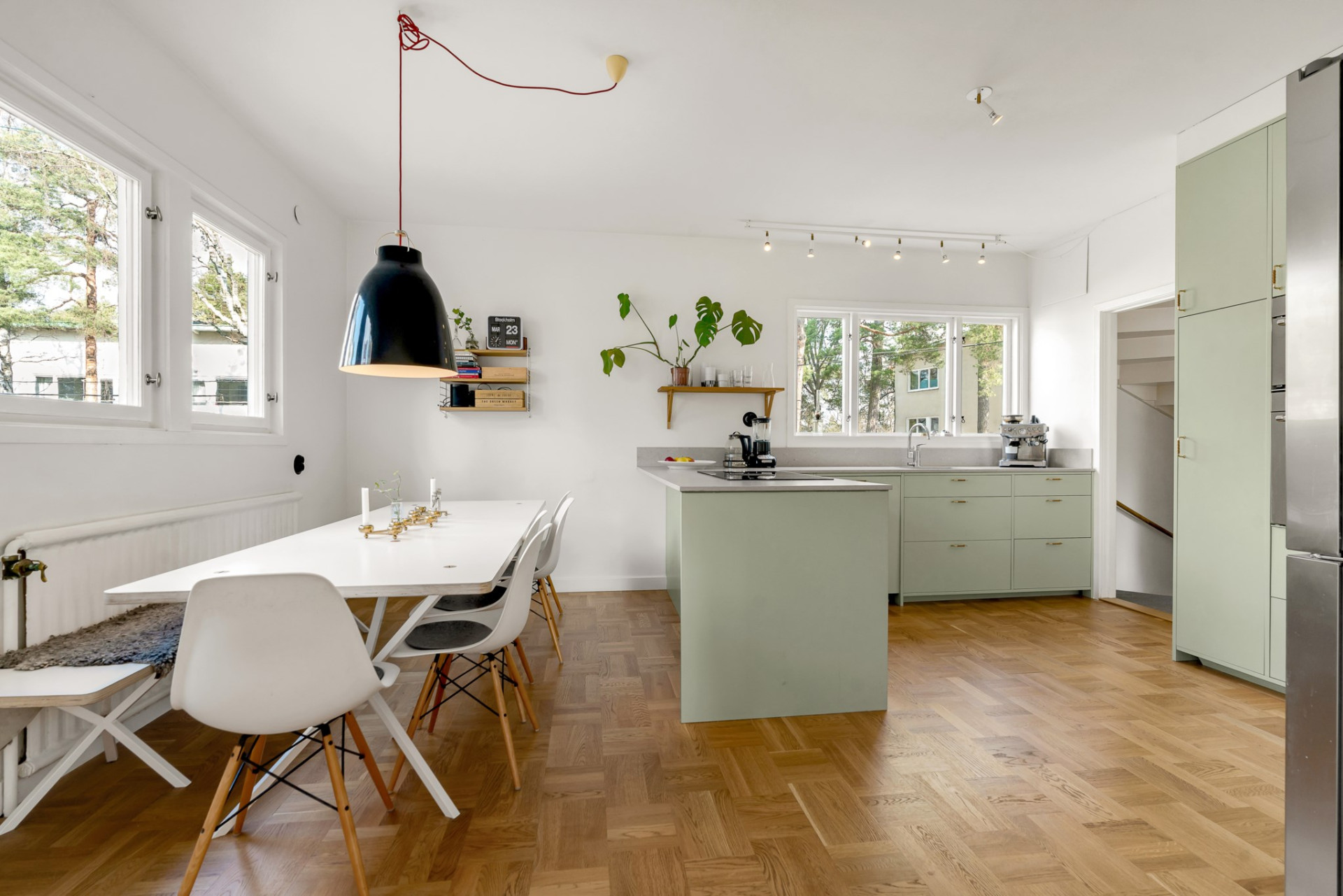 Köket tar vid, på fortsatt parkett och med sobert vita väggar. Köksinredningen går i ljust sage med snygg och praktisk stenskiva samt gott om förvaringsmöjligheter i skåp och lådor och flera arbetsbänkar som underlättar köksarbetet. Här ryms utan problem stort matbord med plats för många och flera, stora fönster skänker härligt ljus.