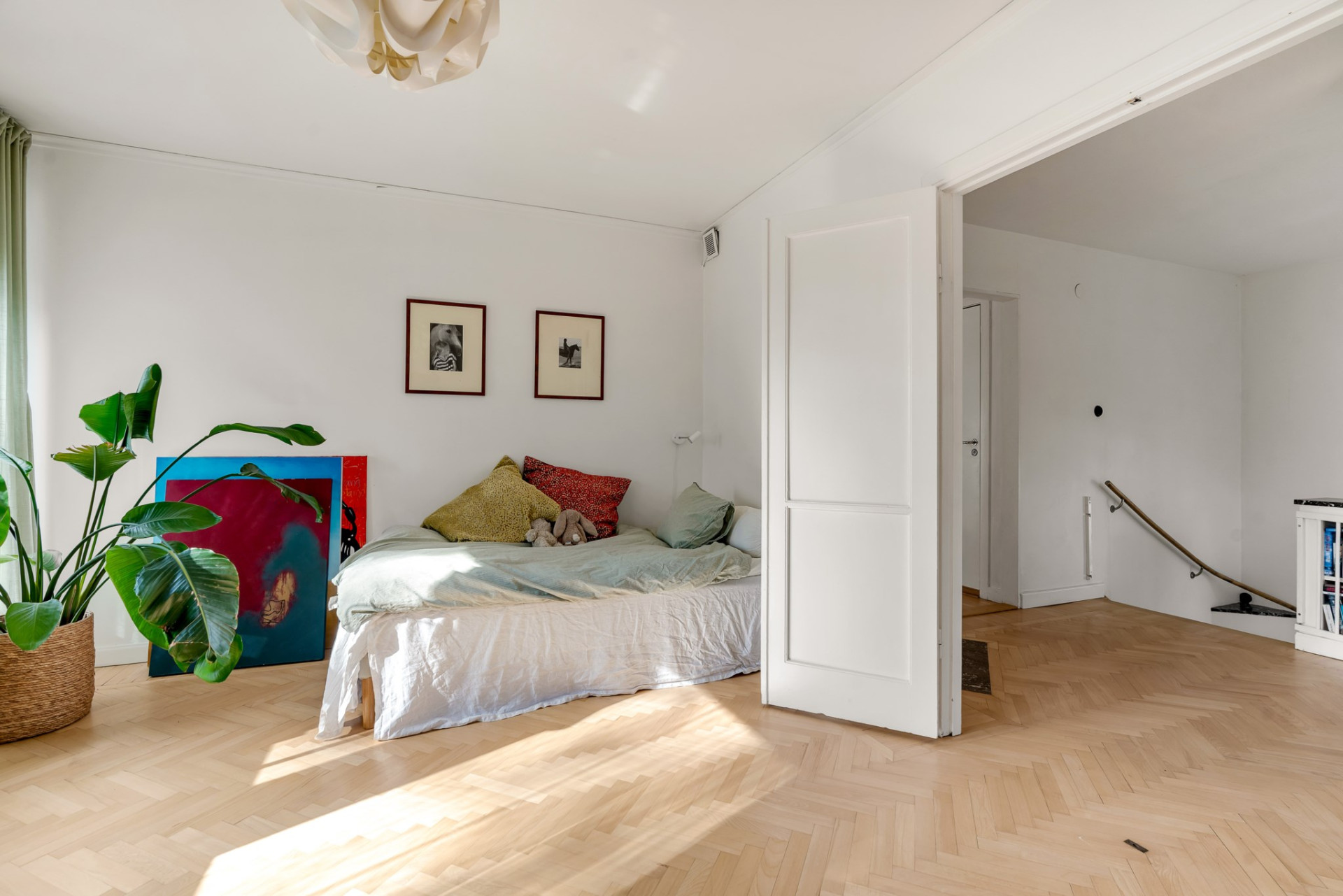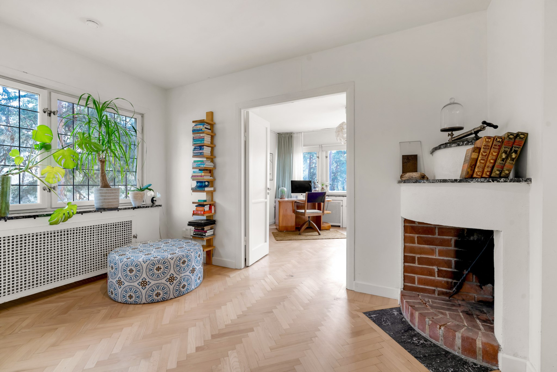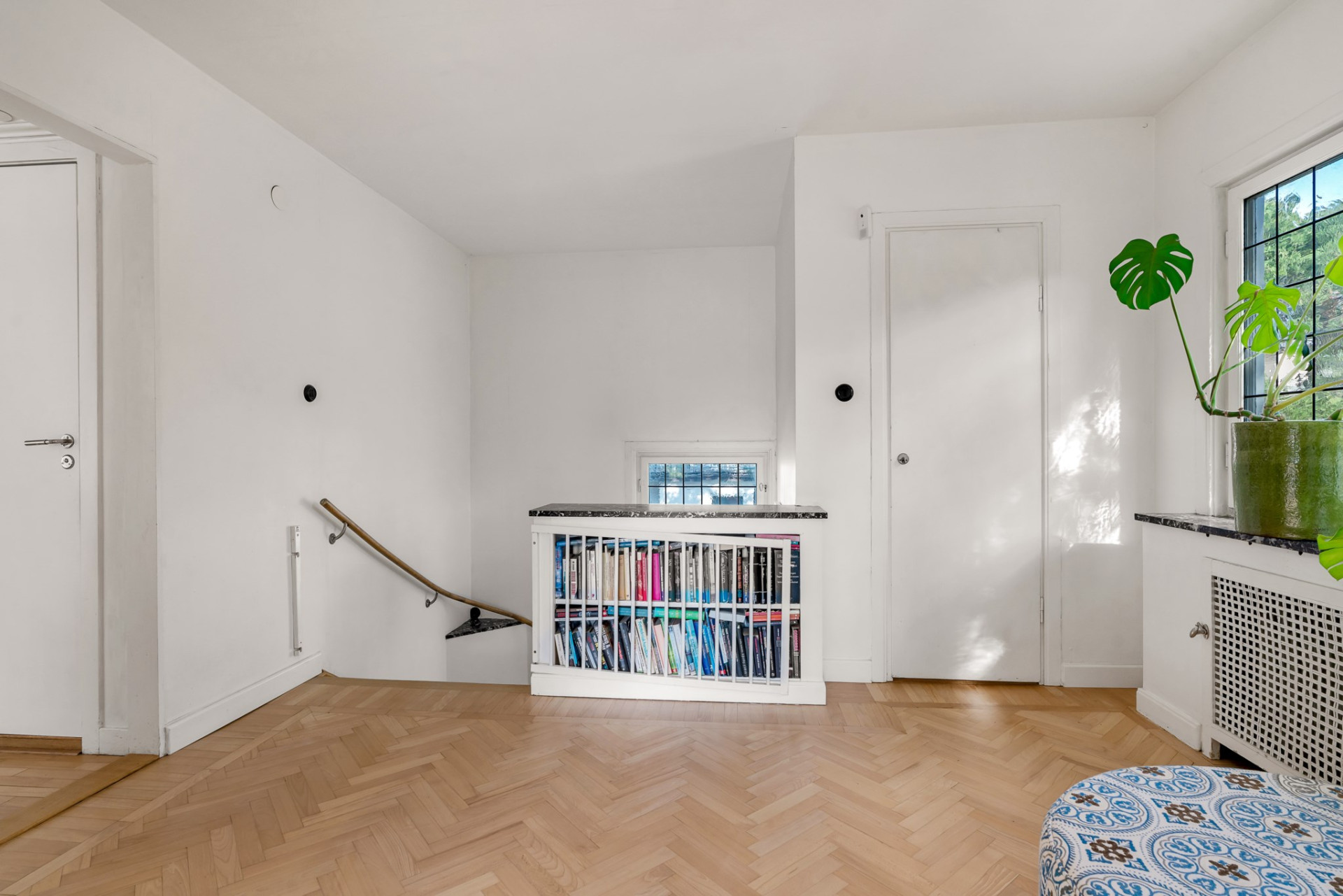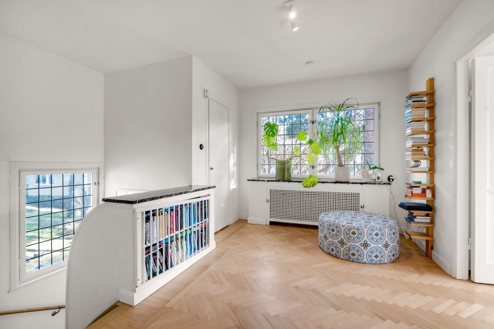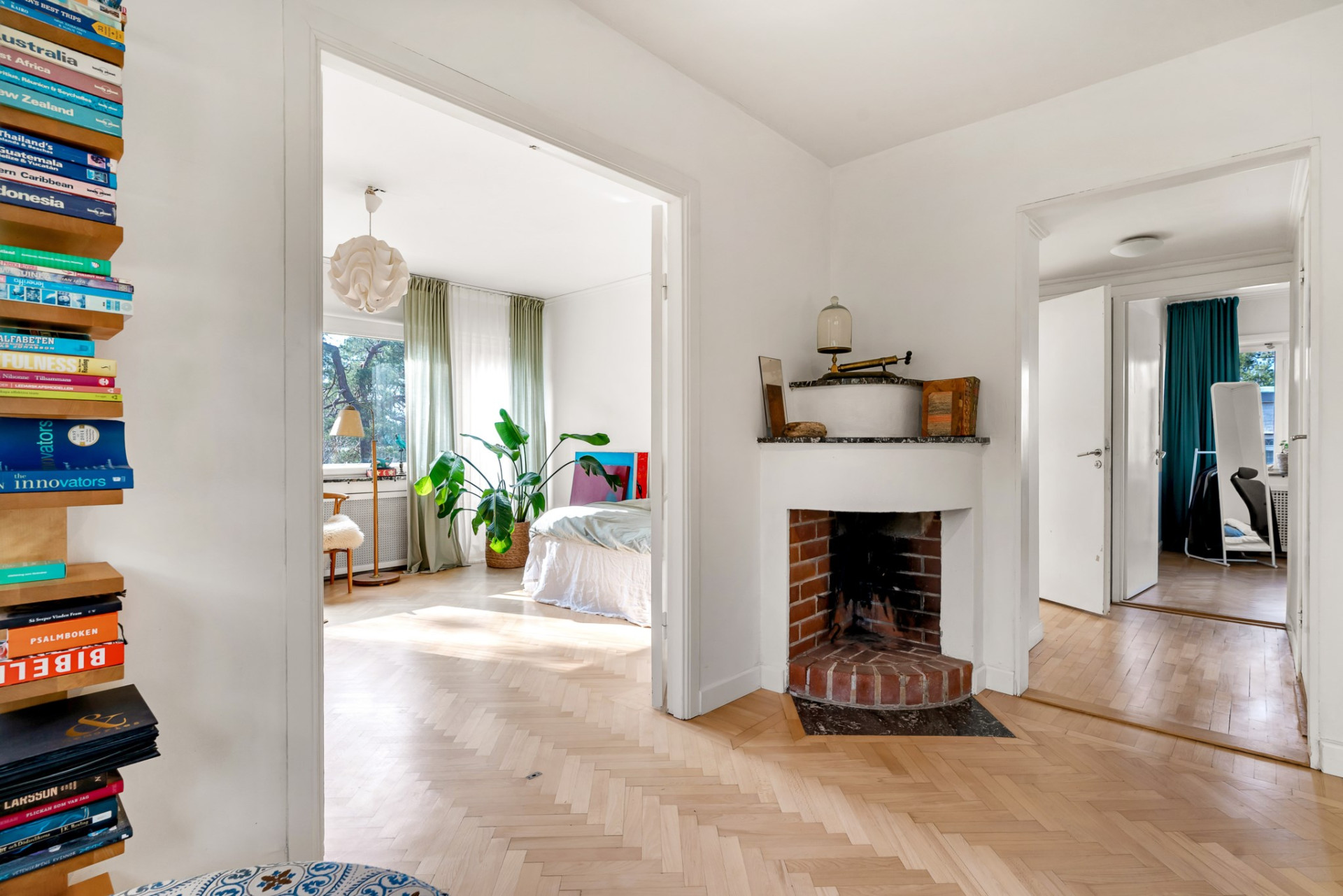 Vacker ektrappa från hallen leder upp till övre plan och vackra blyinfattat fönster ger ljus. En rymlig övre hall blir perfekt som mindre tv-hörna, arbetsplats eller varför inte ett fjärde sovrum om så önskas. En stor klädkammare rymmer det mesta och fiskbensparkett, klassiskt elementskydd och platsbyggd bokhylla är bara några av alla originaldetaljer som bevarats och ännu en värmande öppen spis imponerar. Genom pardörrar tar vi oss vidare till det stora sovrummet alldeles intill med flera garderober och en dörr mot altanen och trädgården. Vägg i vägg väntar ännu ett rymligt sovrum med stora fönsterpartier och även här en dörr till altanen. Tillbaka till hallen når du det mindre sovrummet, på fortsatt parkett och med en inbyggd garderob. Badrummet är rymligt med helkaklade väggar i ljusa toner, gedigna stenskivor och en stor kommod som rymmer det mesta av förvaring. Elgolvvärme ger mervärde!