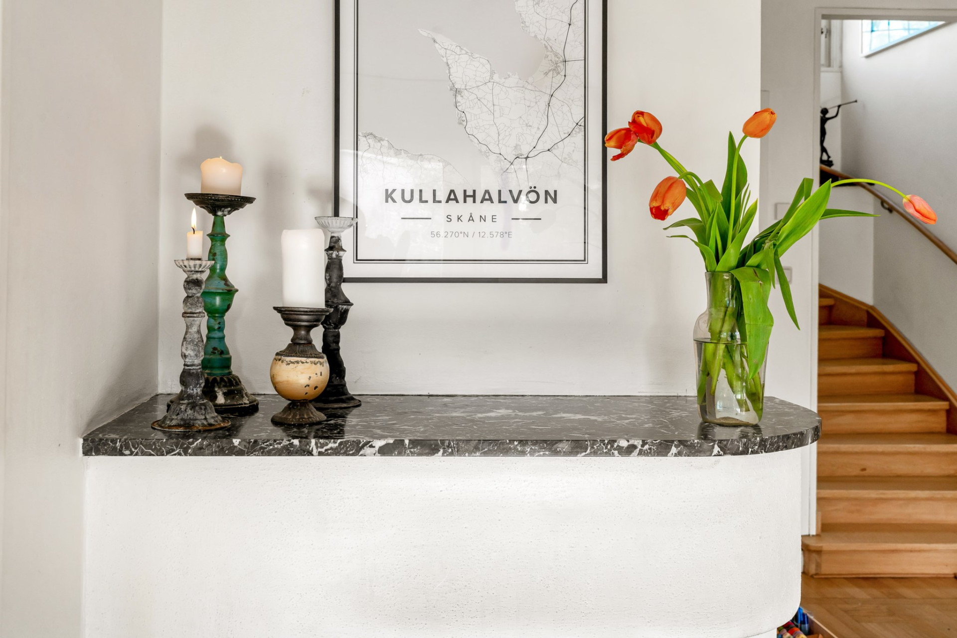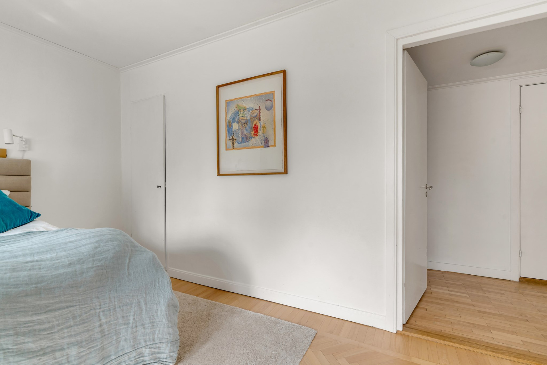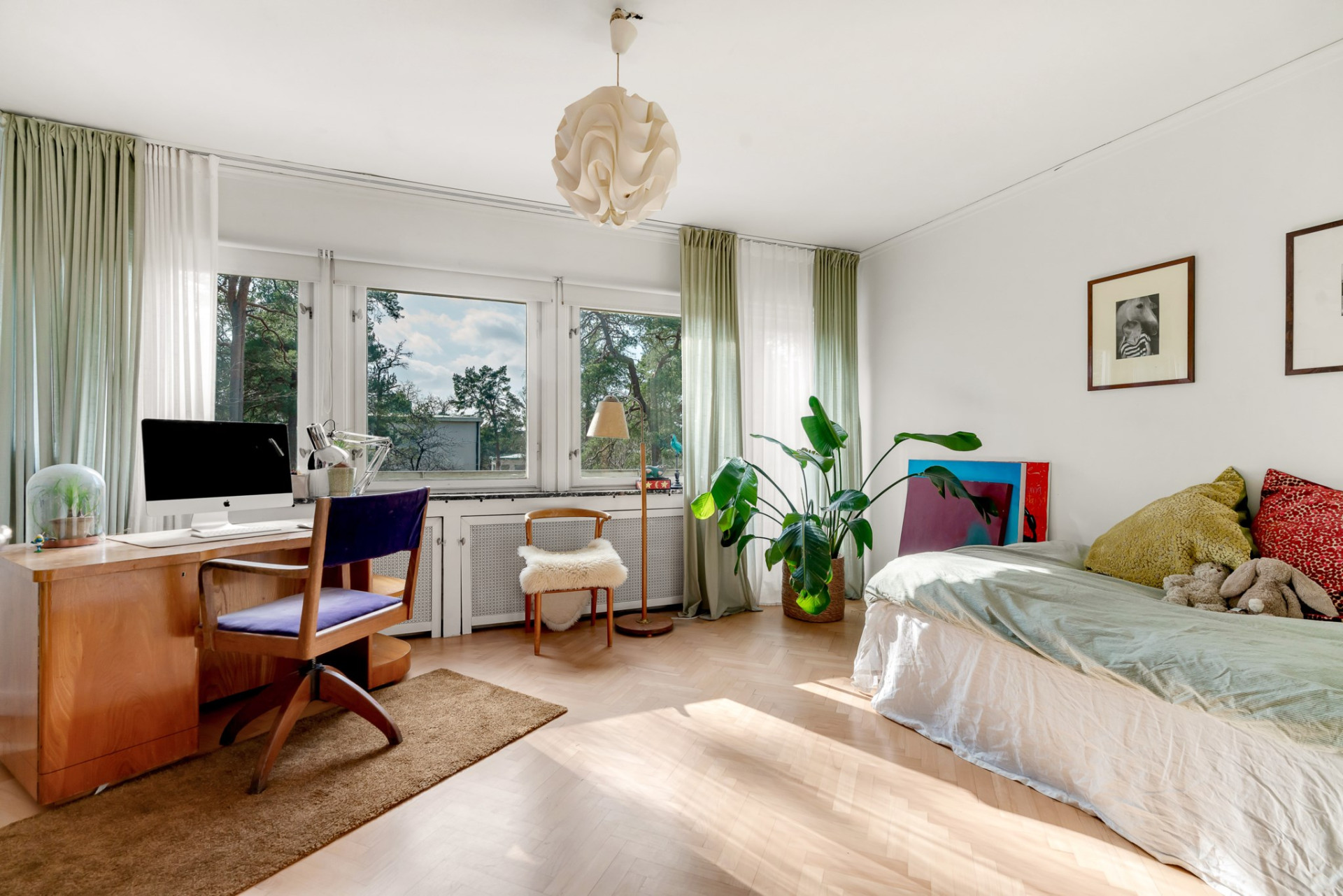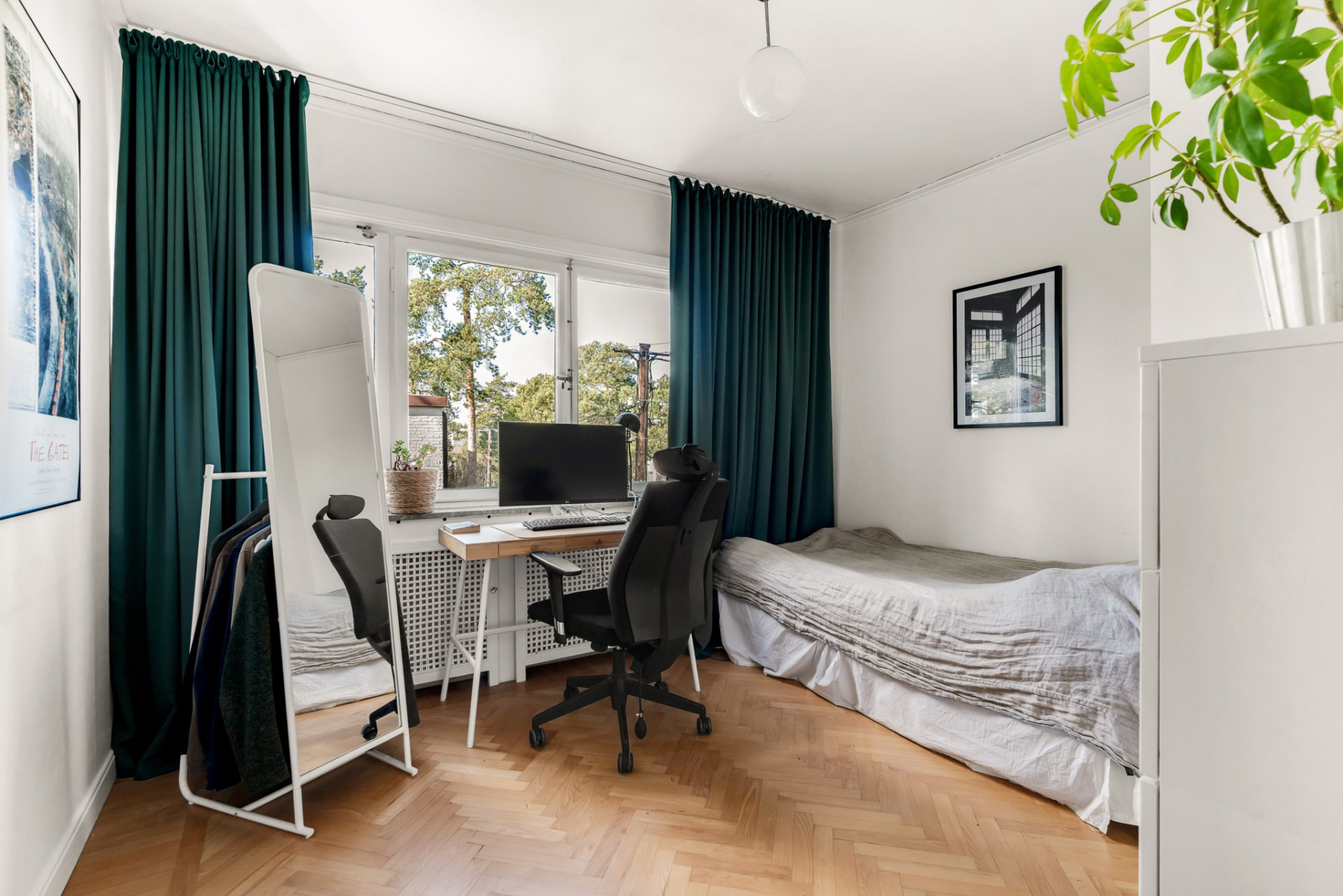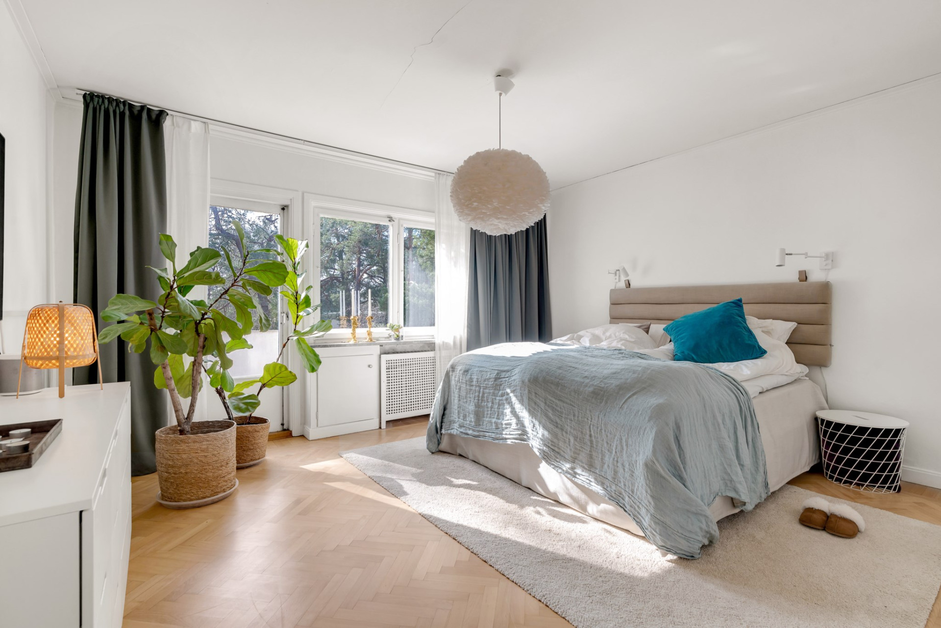 Vacker ektrappa från hallen leder upp till övre plan och vackra blyinfattat fönster ger ljus. En rymlig övre hall blir perfekt som mindre tv-hörna, arbetsplats eller varför inte ett fjärde sovrum om så önskas. En stor klädkammare rymmer det mesta och fiskbensparkett, klassiskt elementskydd och platsbyggd bokhylla är bara några av alla originaldetaljer som bevarats och ännu en värmande öppen spis imponerar. Genom pardörrar tar vi oss vidare till det stora sovrummet alldeles intill med flera garderober och en dörr mot altanen och trädgården. Vägg i vägg väntar ännu ett rymligt sovrum med stora fönsterpartier och även här en dörr till altanen. Tillbaka till hallen når du det mindre sovrummet, på fortsatt parkett och med en inbyggd garderob. Badrummet är rymligt med helkaklade väggar i ljusa toner, gedigna stenskivor och en stor kommod som rymmer det mesta av förvaring. Elgolvvärme ger mervärde!