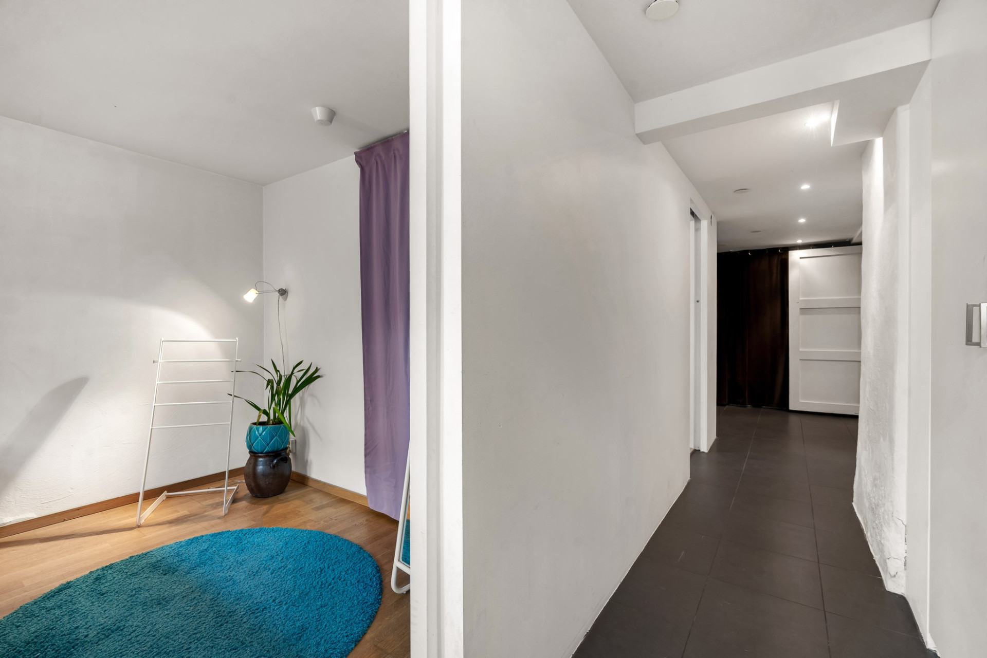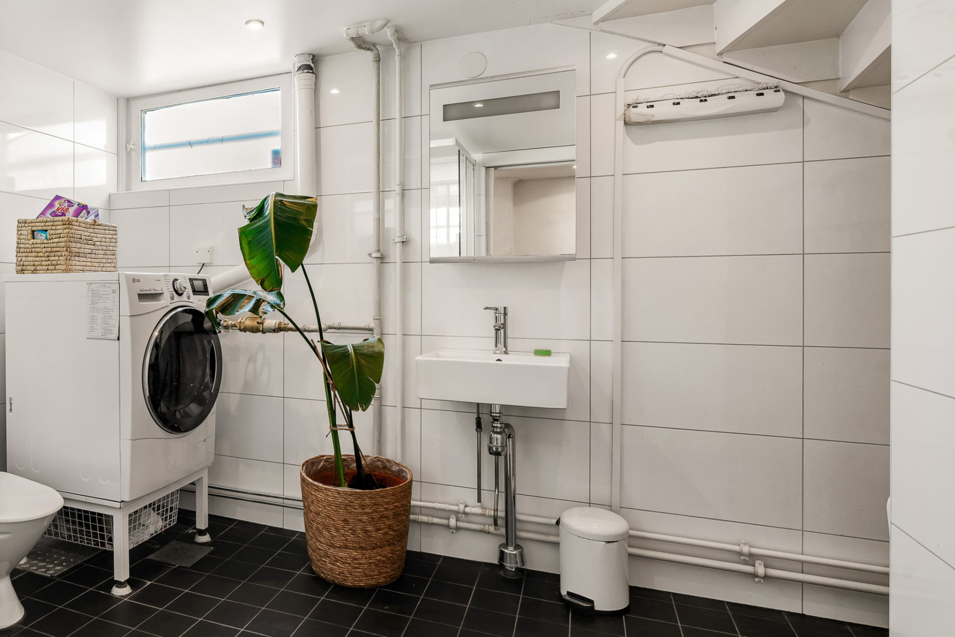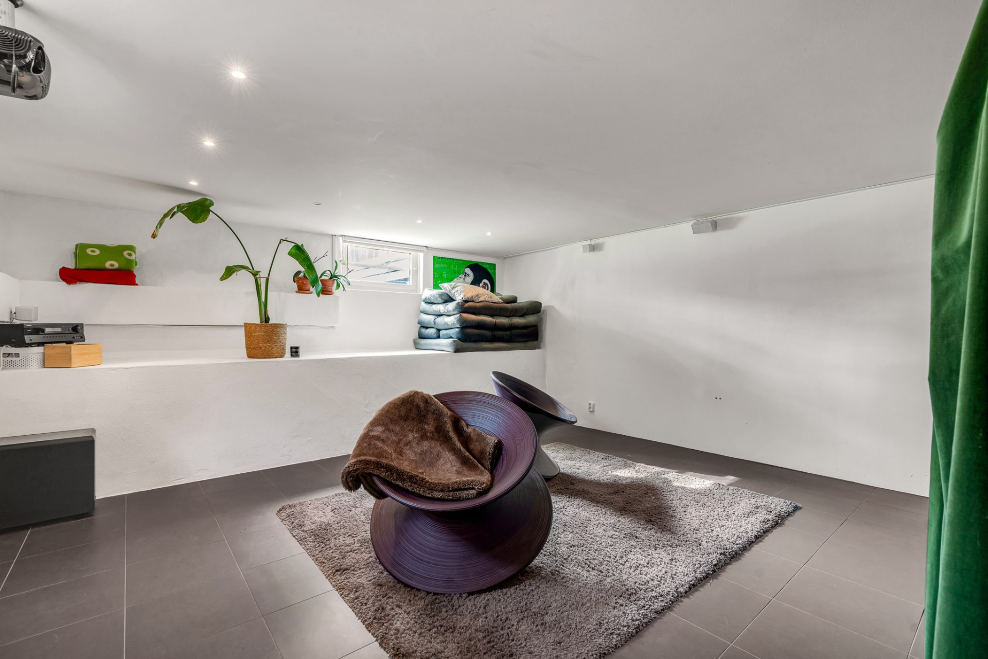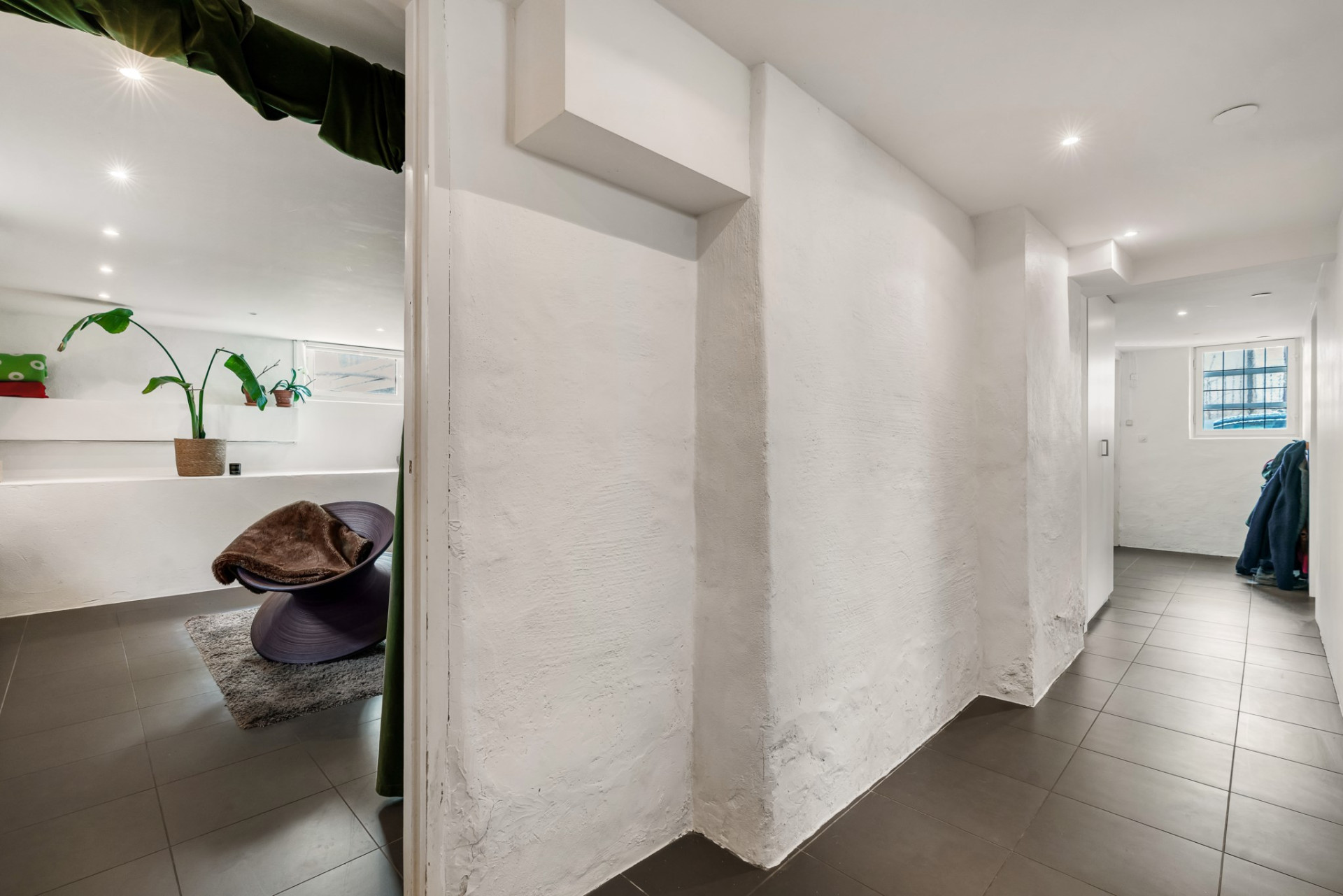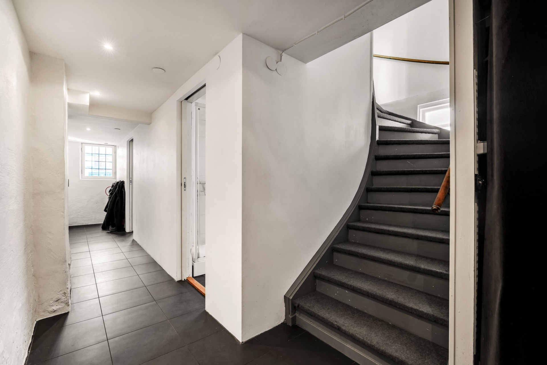 En trappa ner från entréplan kommer vi till källarplanet där vi vilar fötterna på praktiskt klinkergolv med vattenburen golvvärme och sobert vita väggar. Direkt till vänster väntar stort förrådsutrymme och rakt fram kommer vi till det stor allrummet som är perfekt för såväl tonåringen som de långväga gästen med stora ytor och bra ljusinsläpp från flera fönster. Tillbaka till hallen passerar vi det kombinerade badrummet och tvättstugan med duschkabin och tvättmaskin. Vägg i vägg väntar sovrummet med stora fönster och en rymlig garderob. En praktisk groventré erbjuder inte bara plats för kläder och skor utan blir också en naturlig entré mot trädgården och parkeringsplatsen. Del av det gamla garaget används idag som ett stort och rymligt förråd men kan med enkelhet även bli ytterligare sovrum om behov finns.