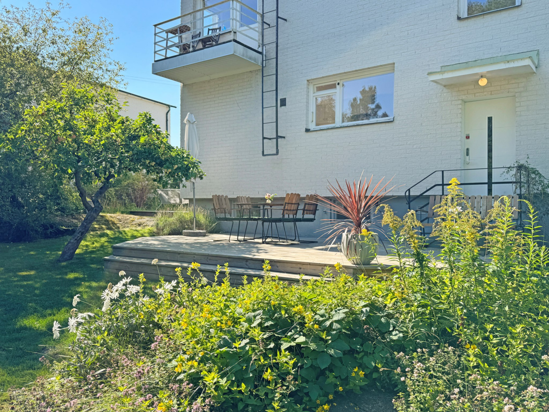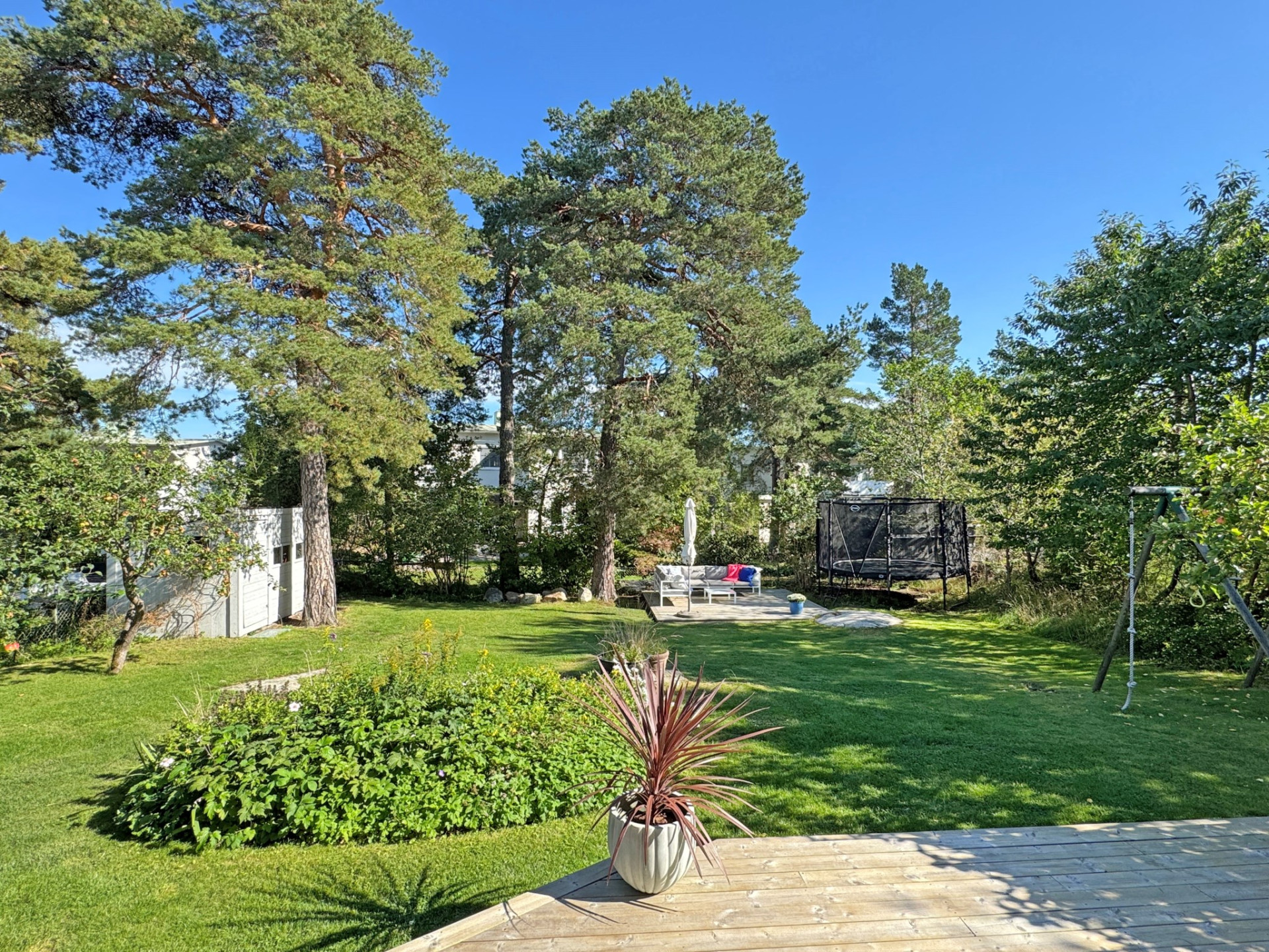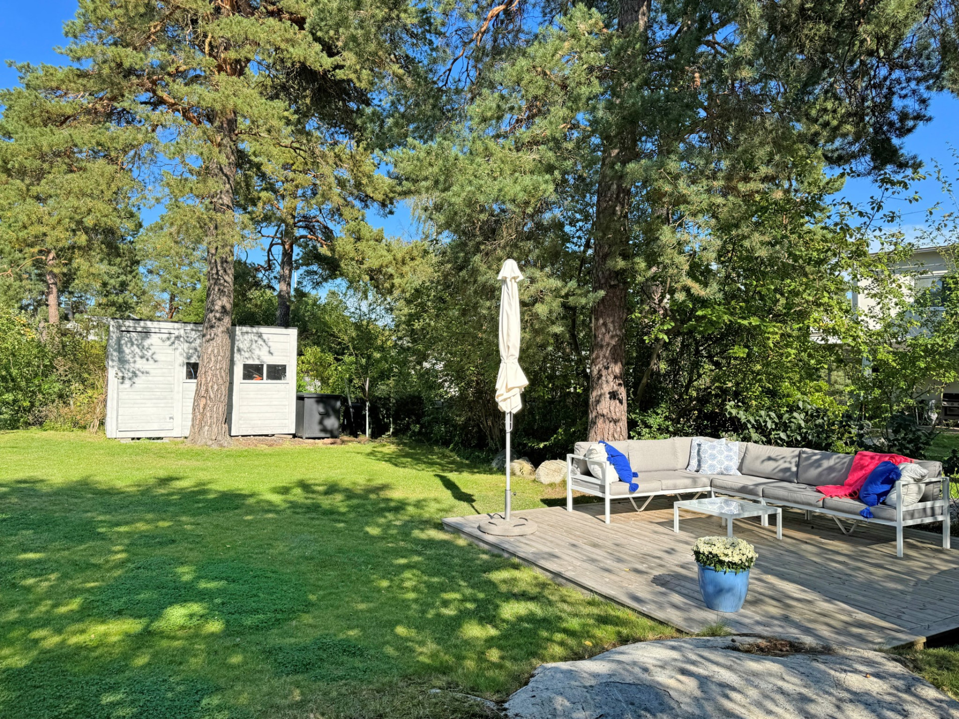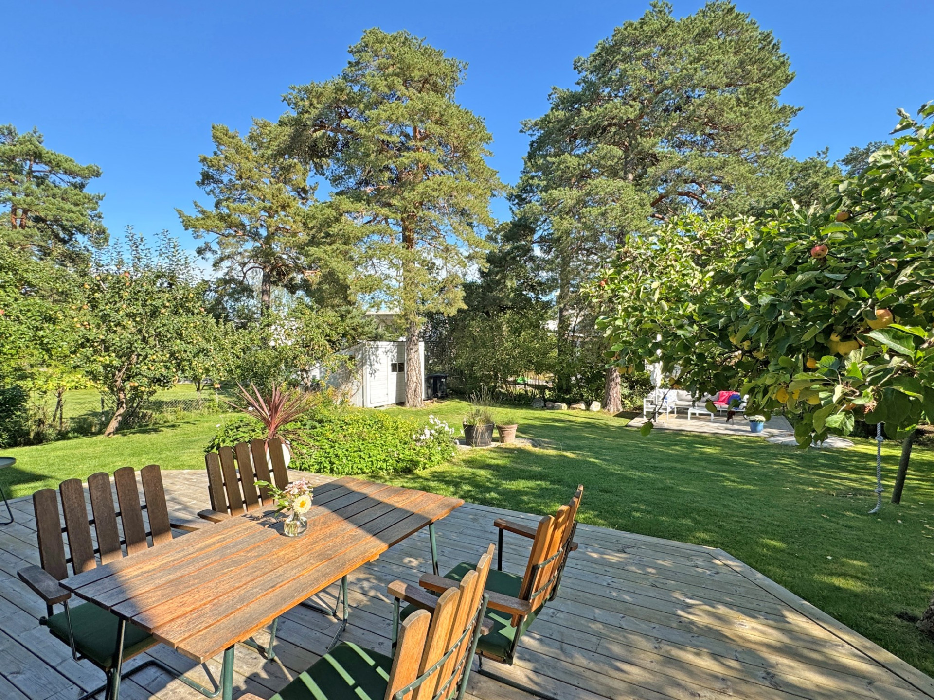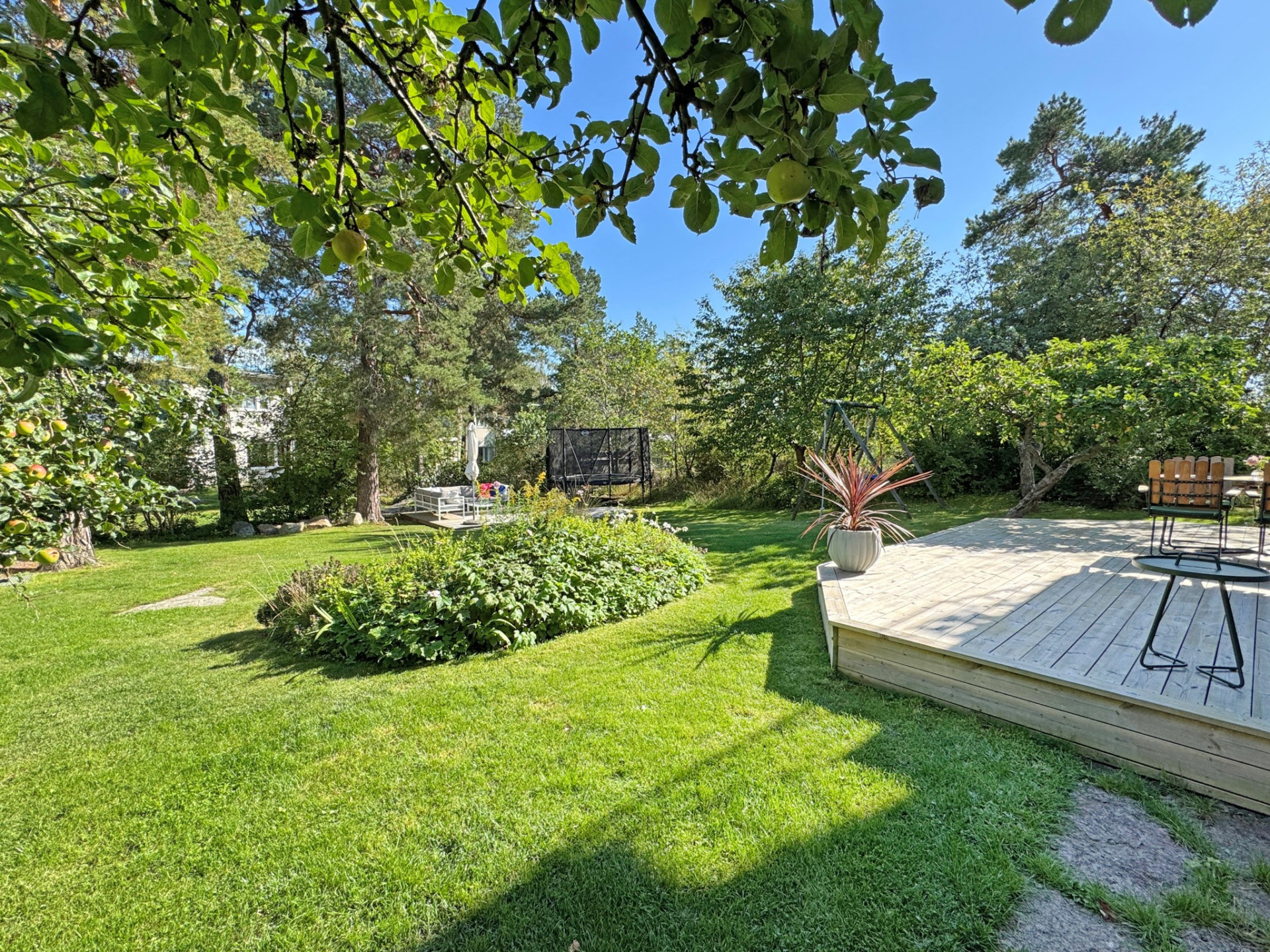 Mycket trivsam trädgård med flera anlagda uteplatser och en arkitektritad och stilriktig förråds- och redskapsbod. I trädgården samsas bl.a. ett flertal äppelträd, ett plommonträd och körsbärsträd. Allt man kan önska!