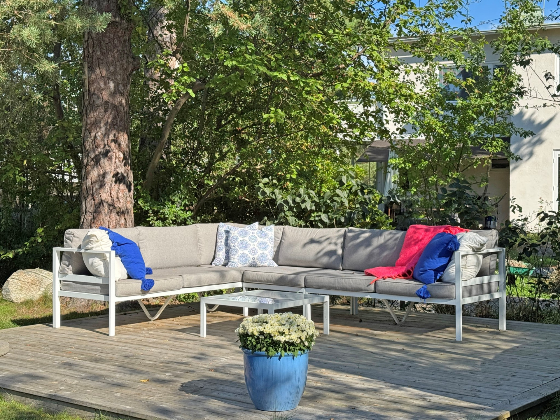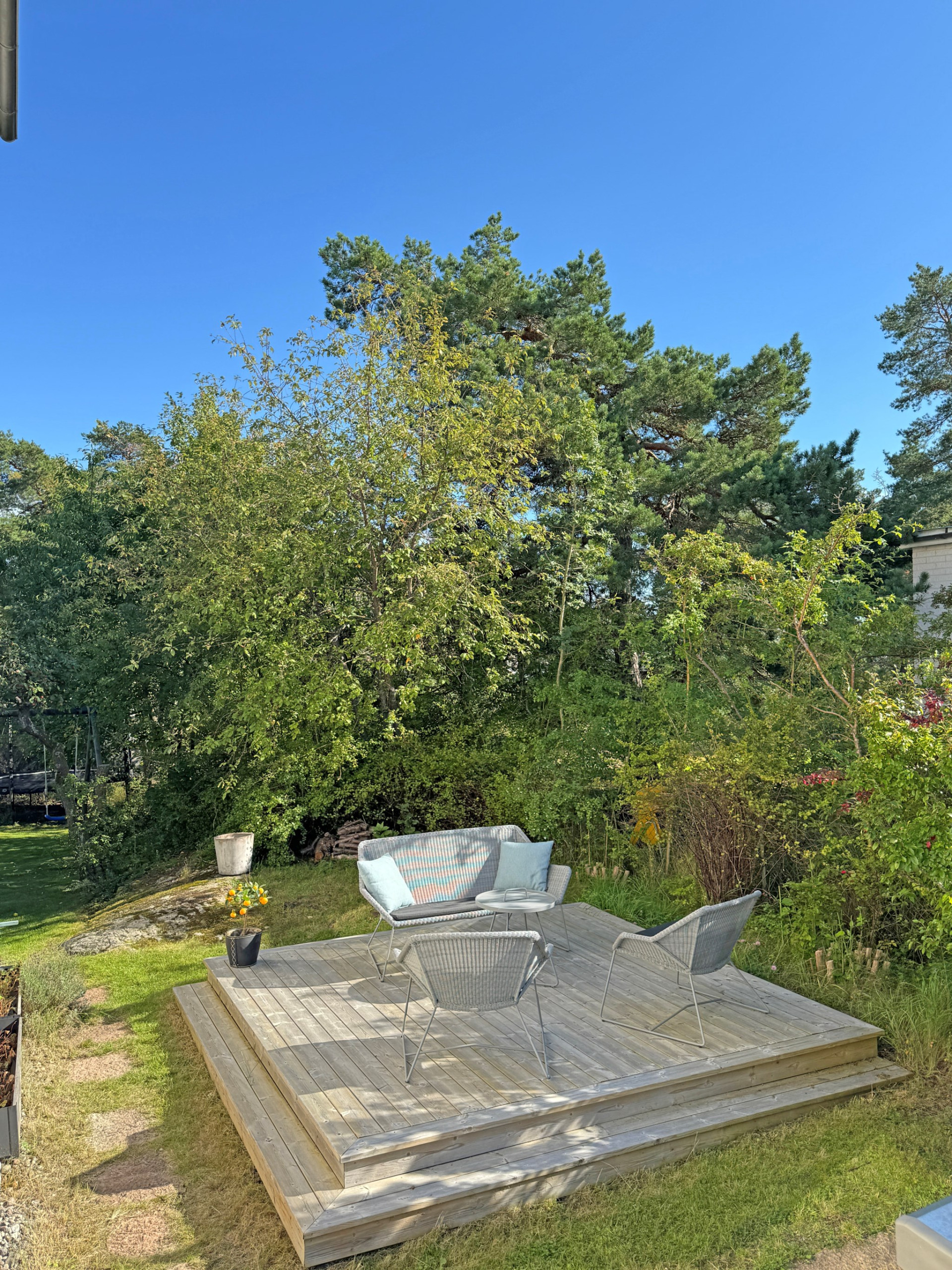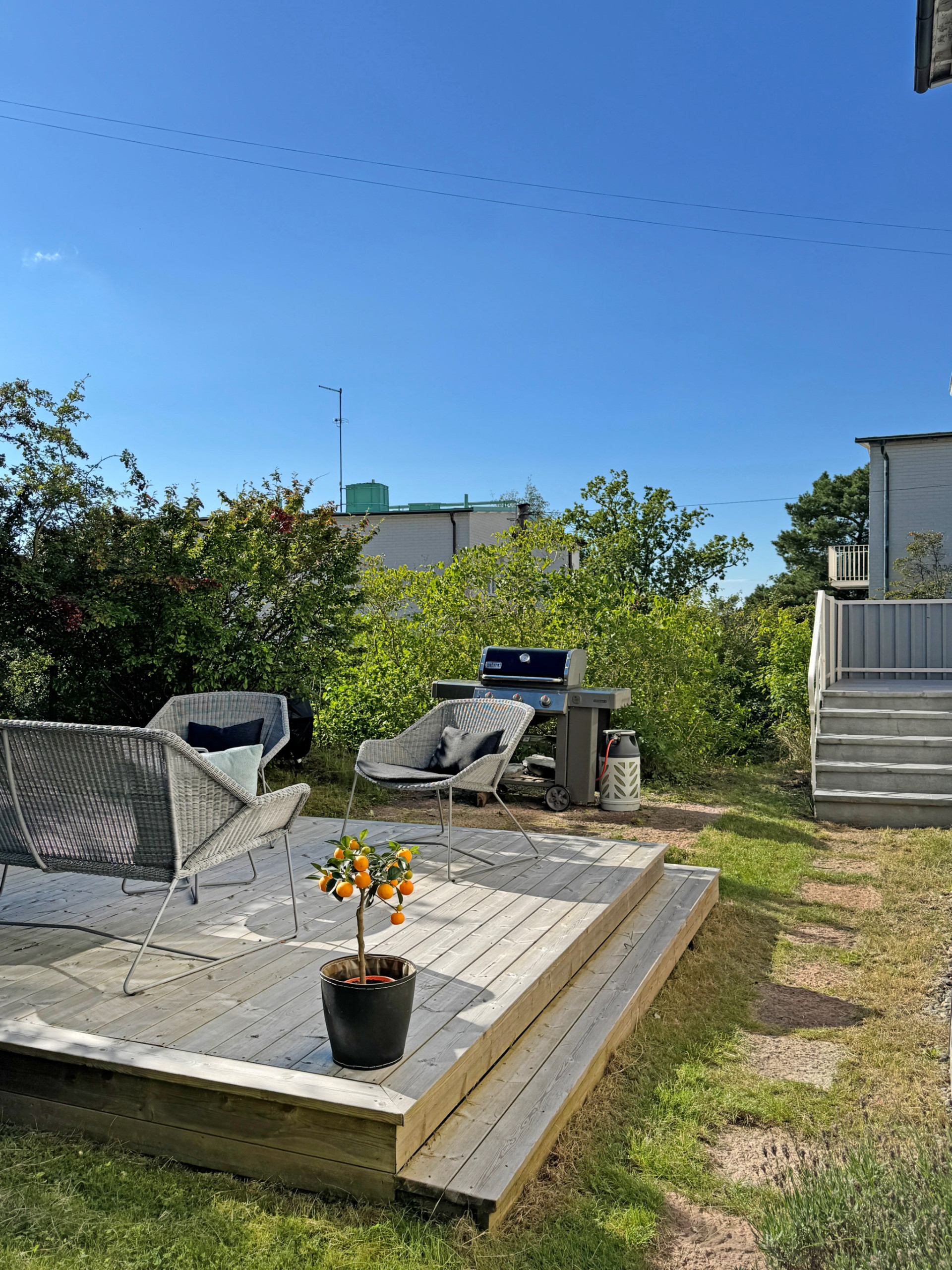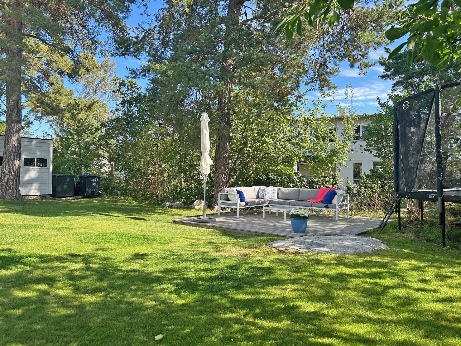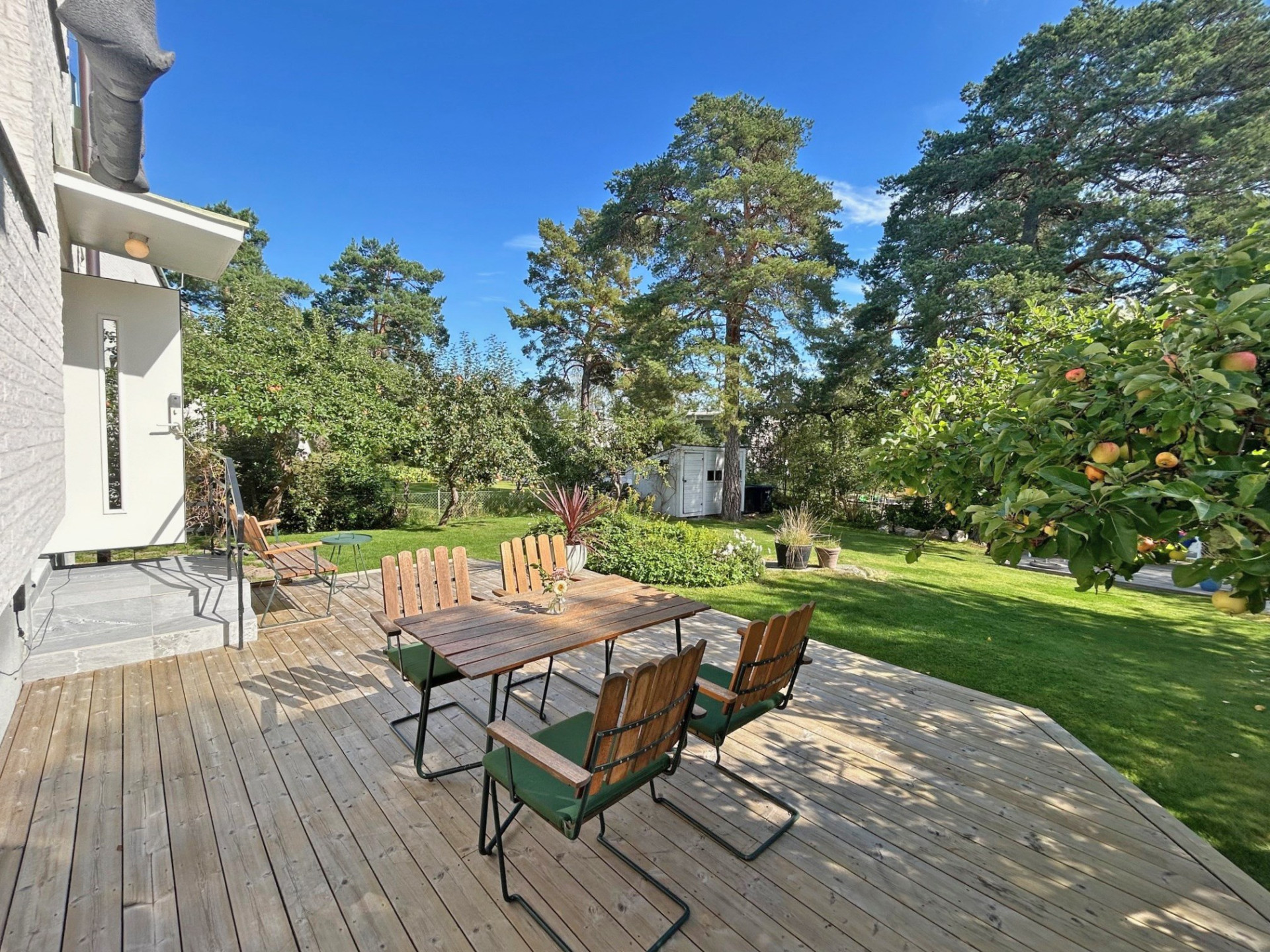 Mycket trivsam trädgård med flera anlagda uteplatser och en arkitektritad och stilriktig förråds- och redskapsbod. I trädgården samsas bl.a. ett flertal äppelträd, ett plommonträd och körsbärsträd. Allt man kan önska!