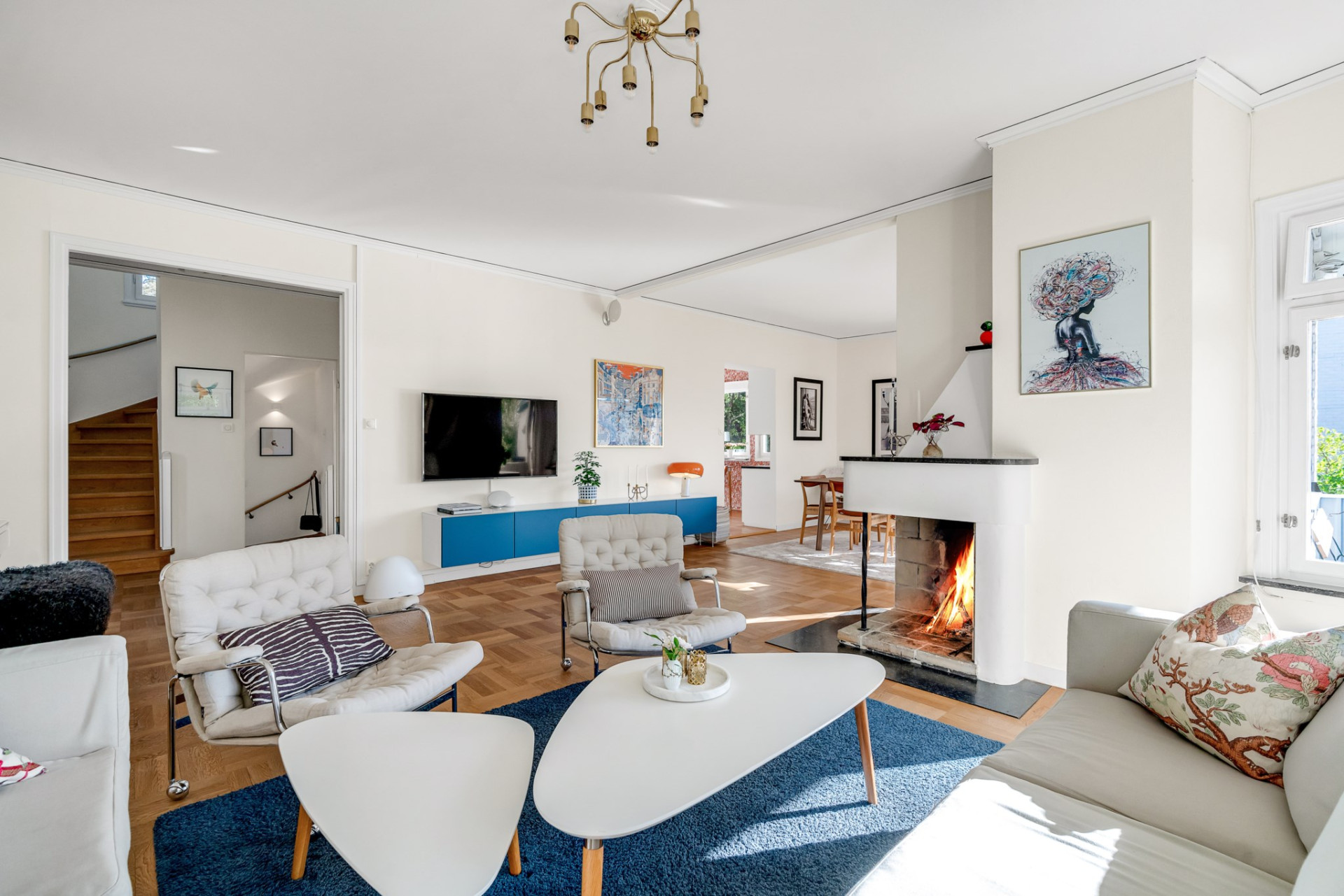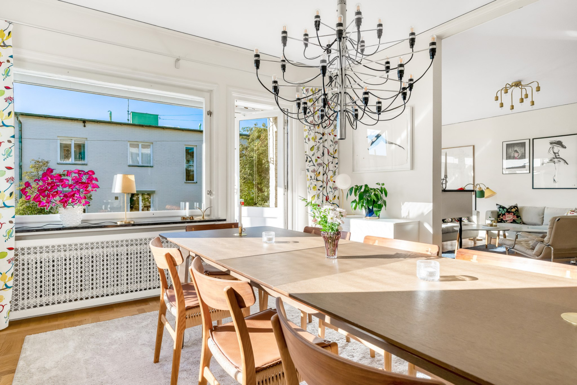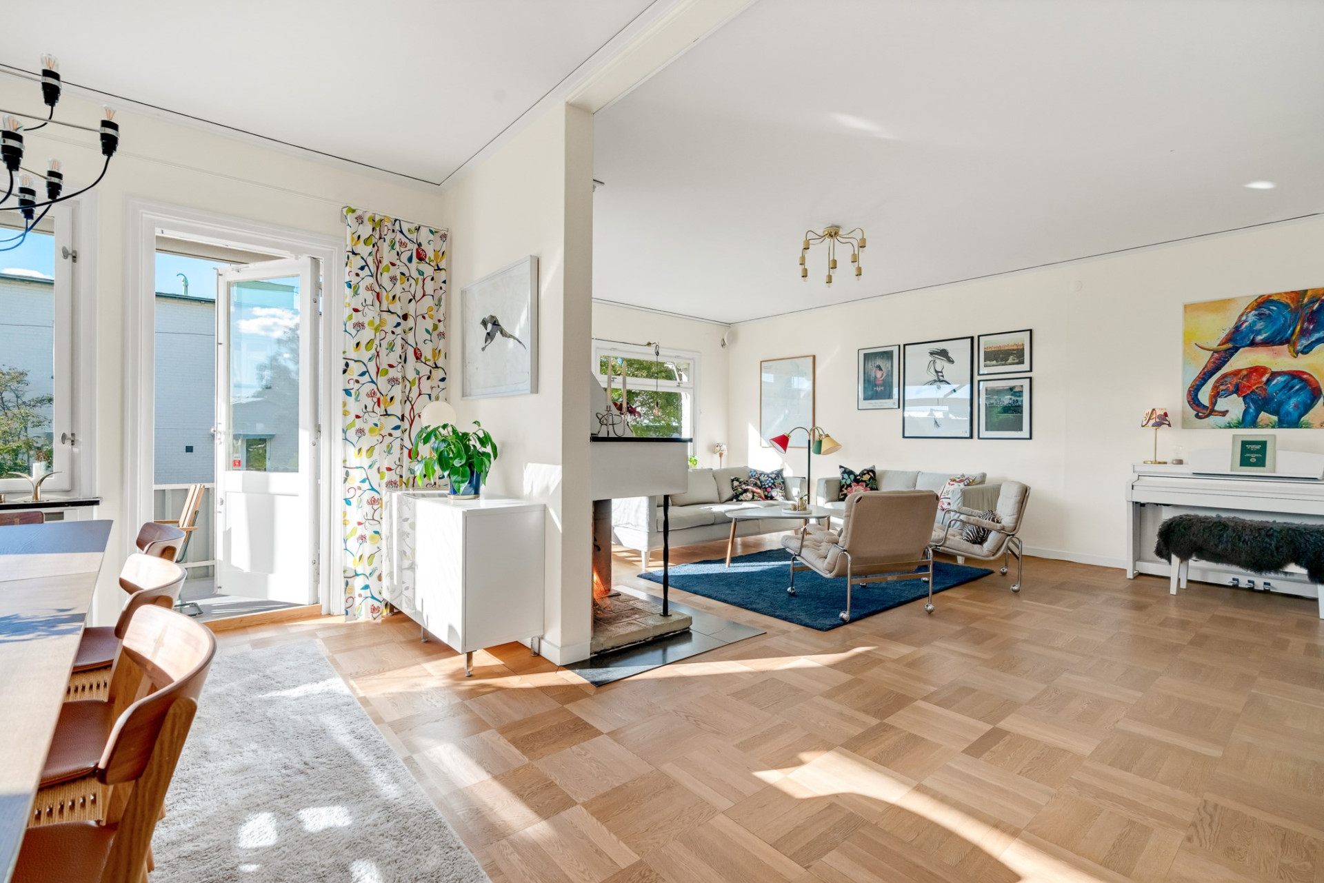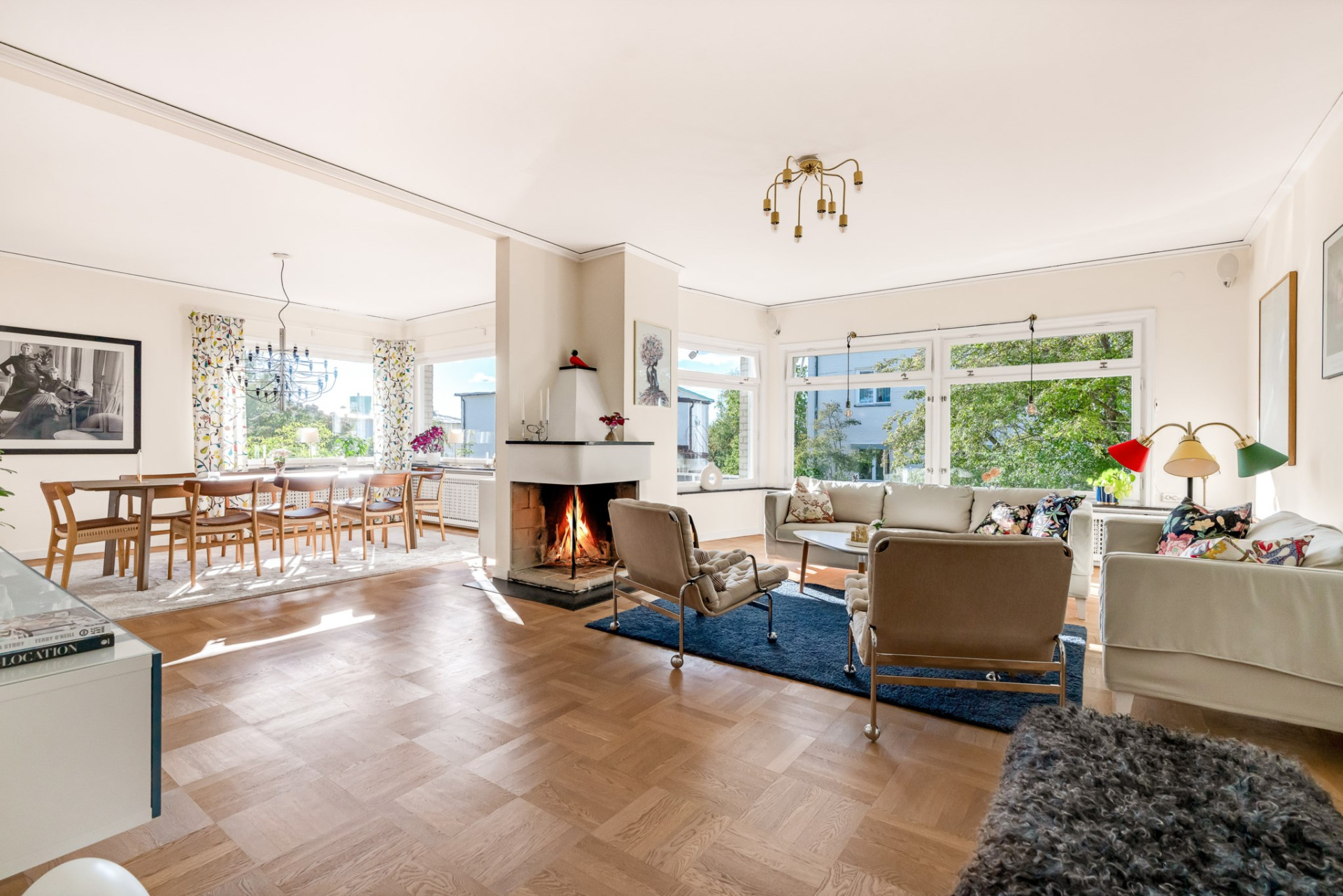Den inre entréhallen öppnar med pardörrar upp mot ett stort vardagsrum med öppen spis och matsal. Dessa rum, som ligger med helt öppen planlösning, har genom sina stora fönsterväggar och vackra parkettgolv en underbar karaktär. Matsalen har även utgång till en stor balkong i västerläge - vilken även har direktaccess till tomten.
