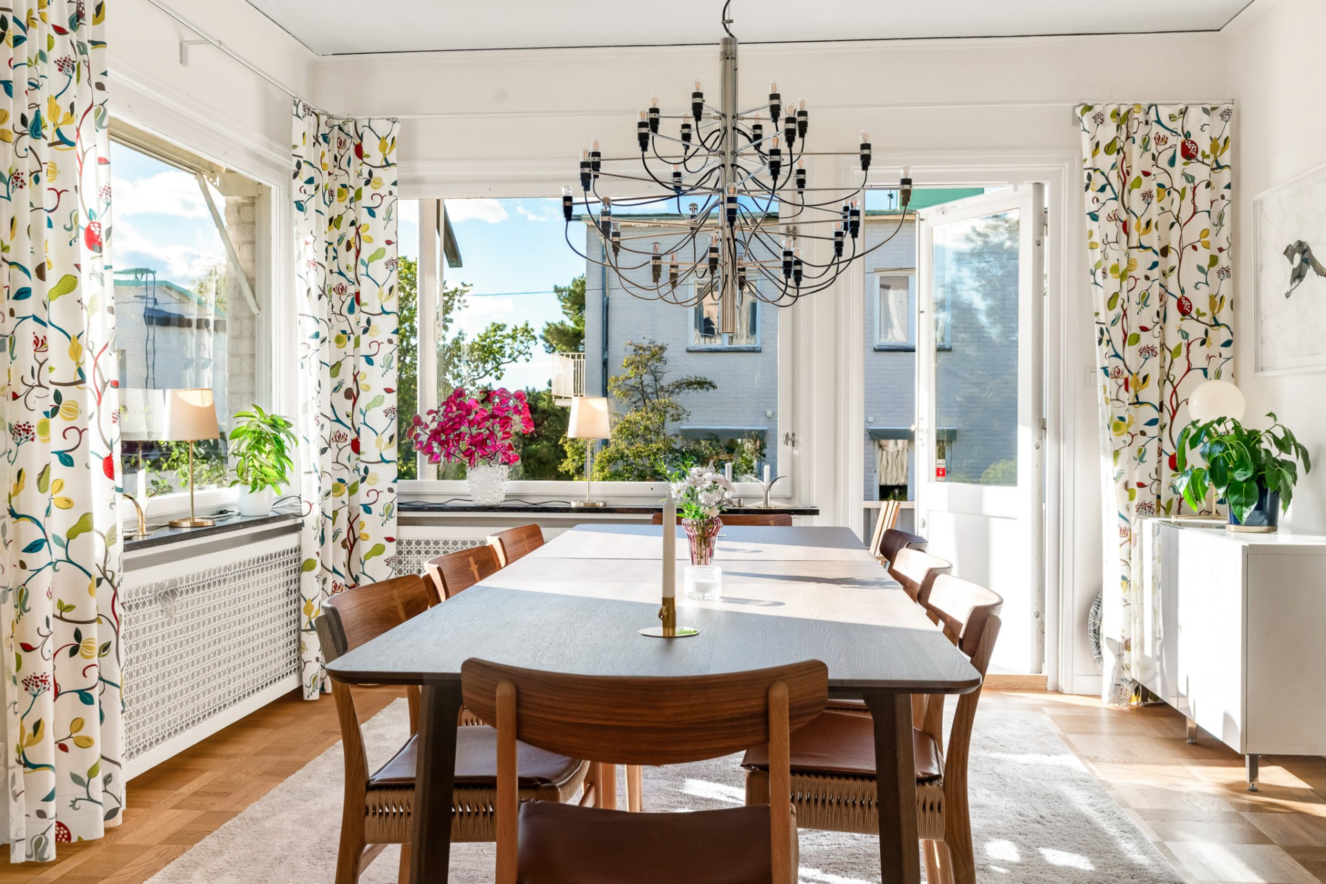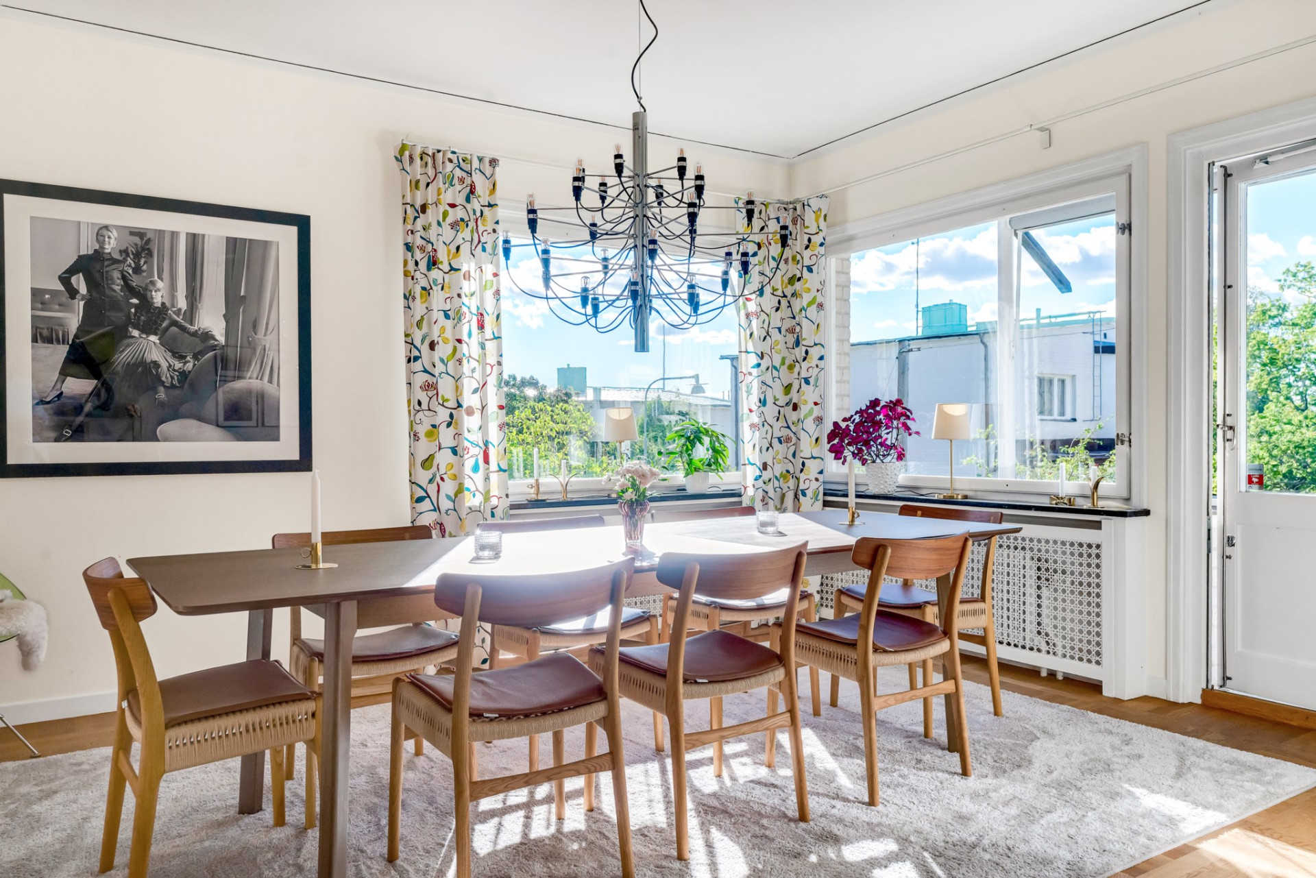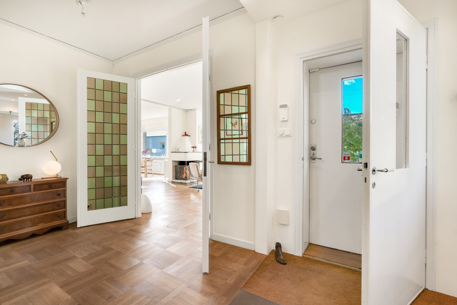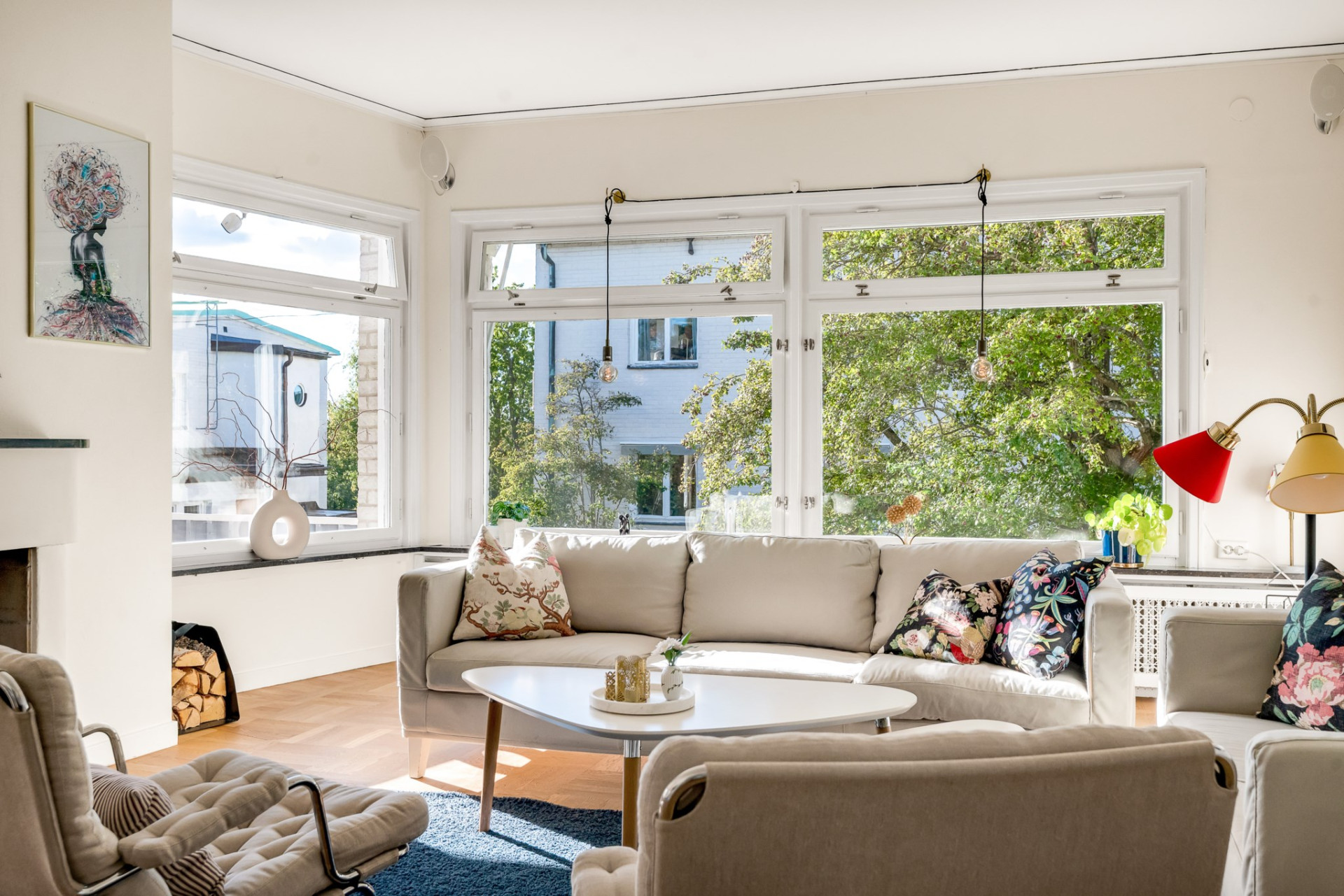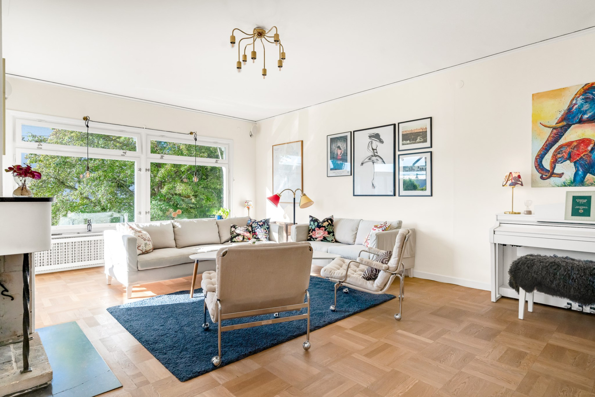 Den inre entréhallen öppnar med pardörrar upp mot ett stort vardagsrum med öppen spis och matsal. Dessa rum, som ligger med helt öppen planlösning, har genom sina stora fönsterväggar och vackra parkettgolv en underbar karaktär. Matsalen har även utgång till en stor balkong i västerläge - vilken även har direktaccess till tomten.