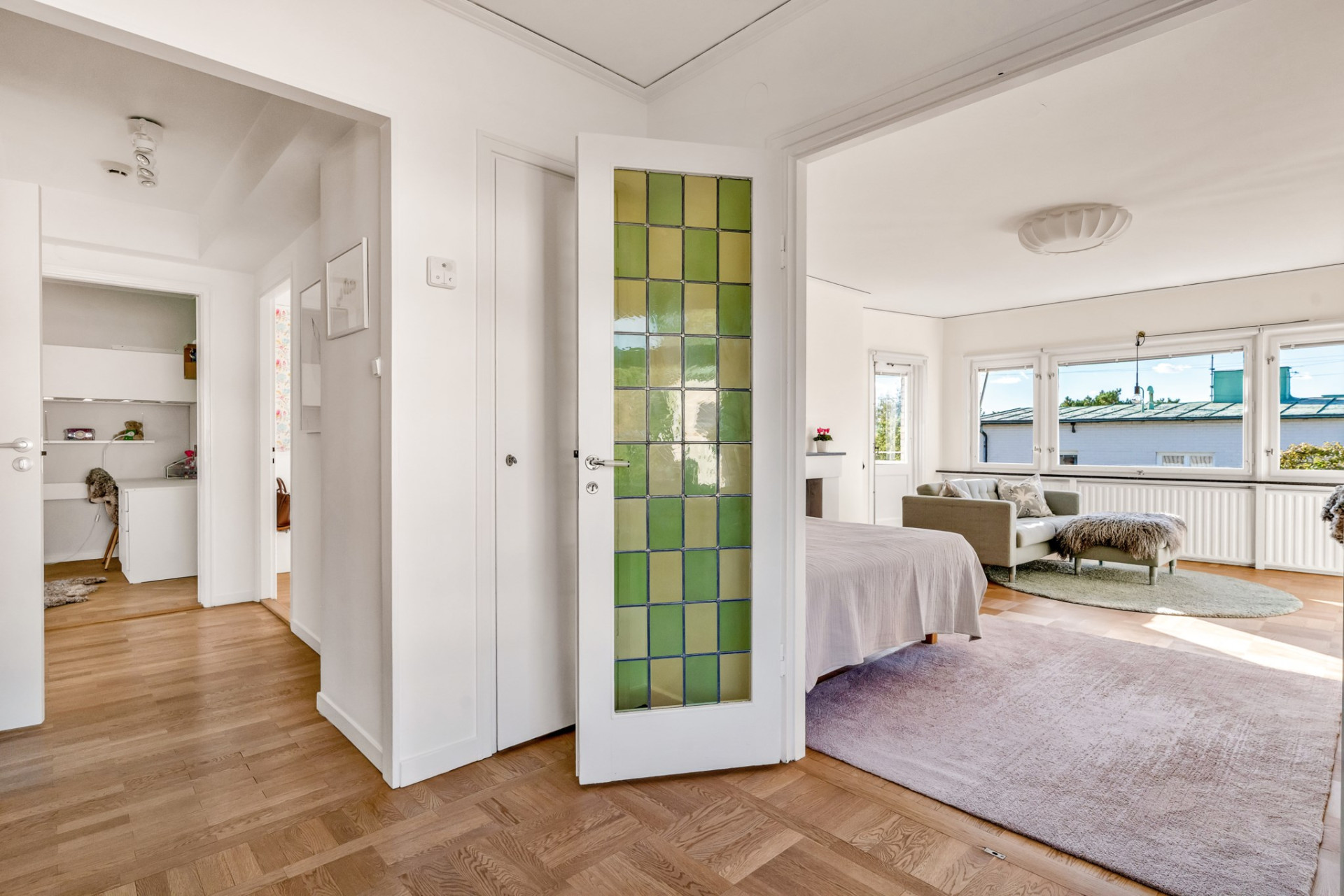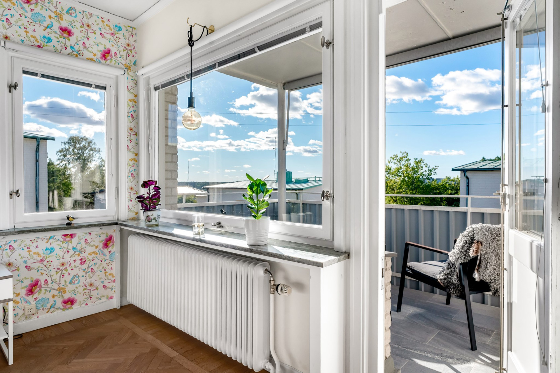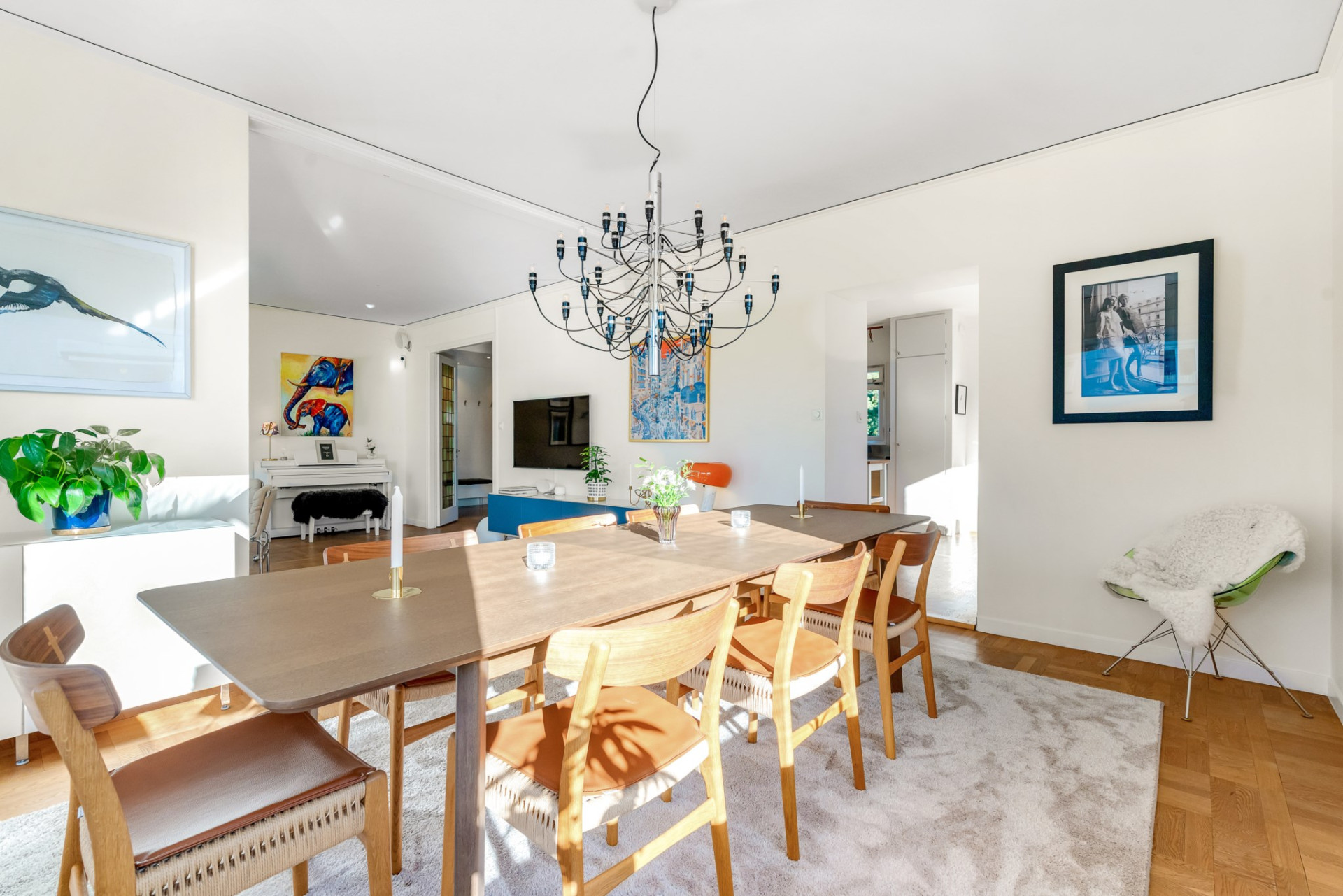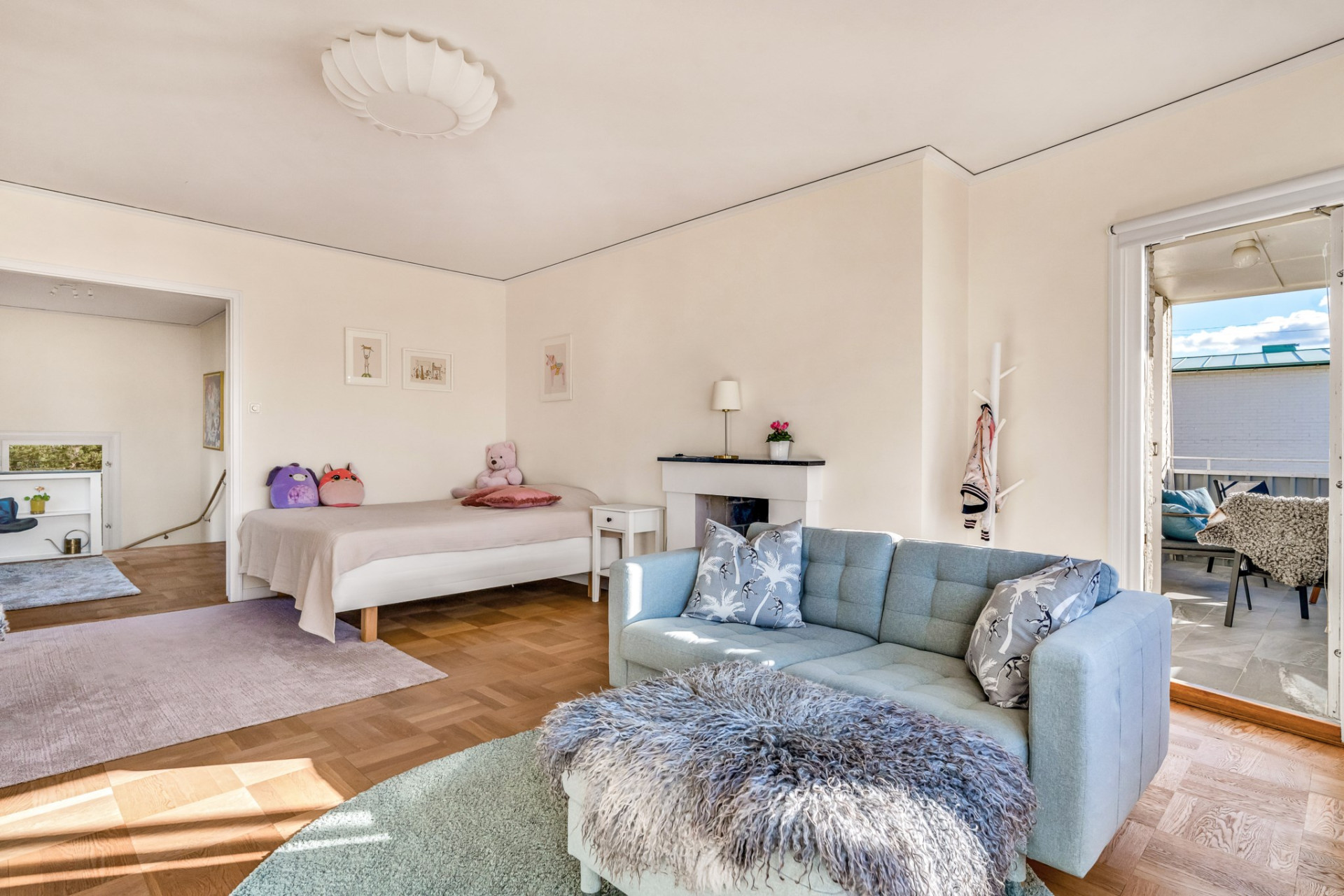 Den inre entréhallen öppnar med pardörrar upp mot ett stort vardagsrum med öppen spis och matsal. Dessa rum, som ligger med helt öppen planlösning, har genom sina stora fönsterväggar och vackra parkettgolv en underbar karaktär. Matsalen har även utgång till en stor balkong i västerläge - vilken även har direktaccess till tomten.
