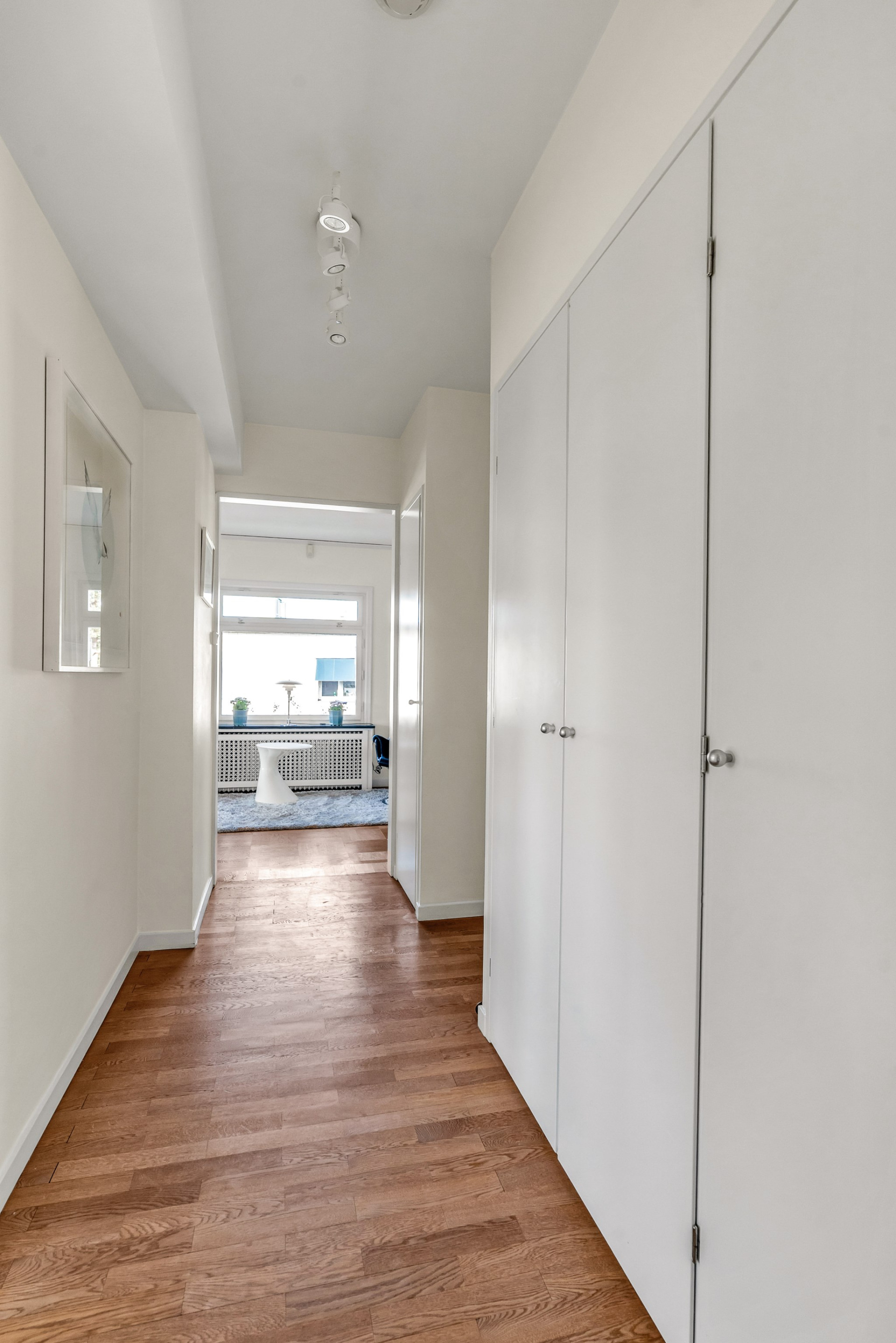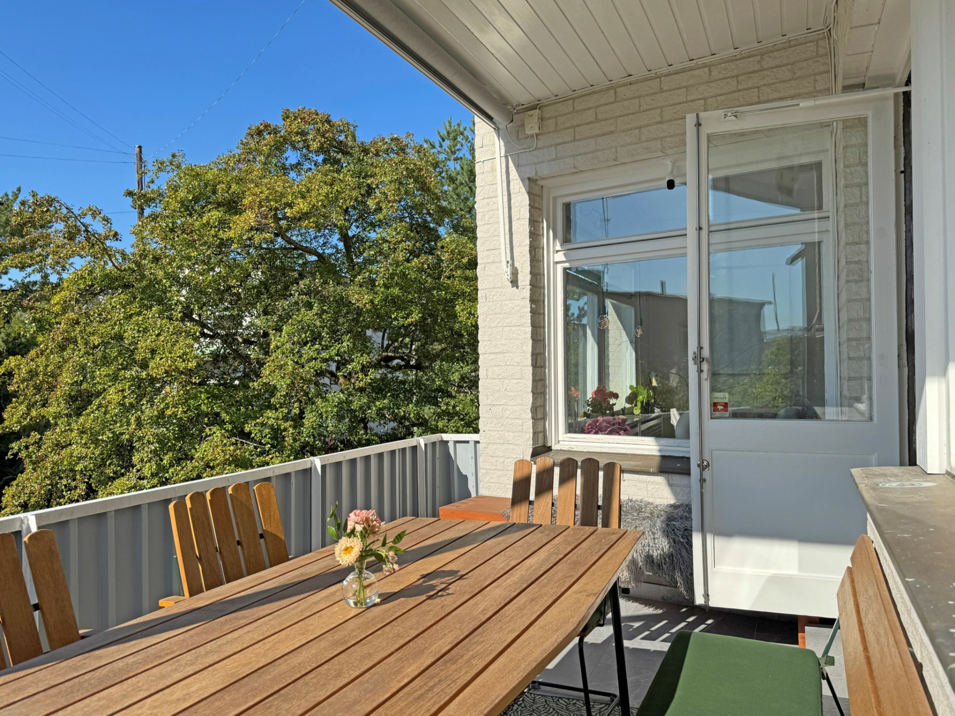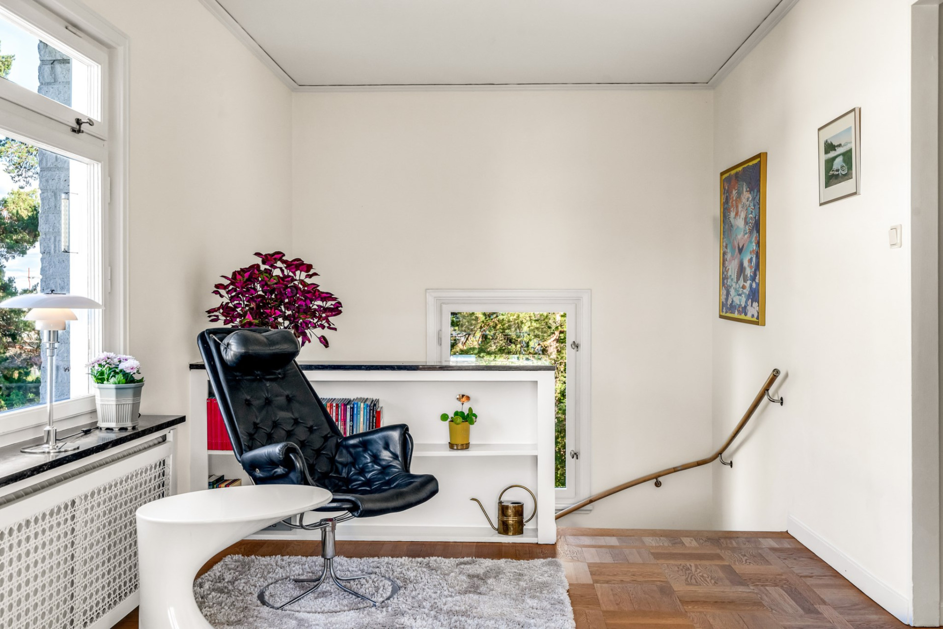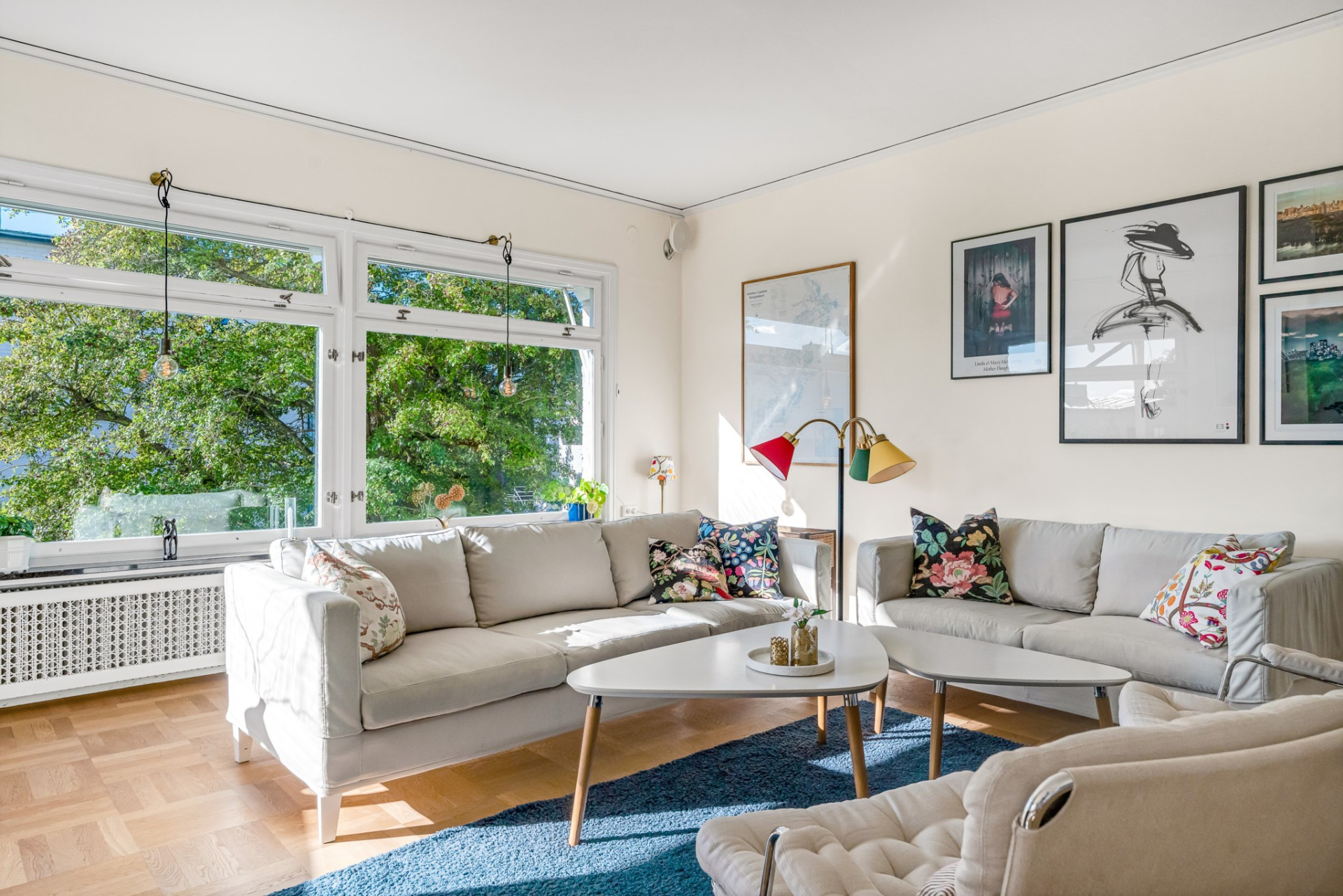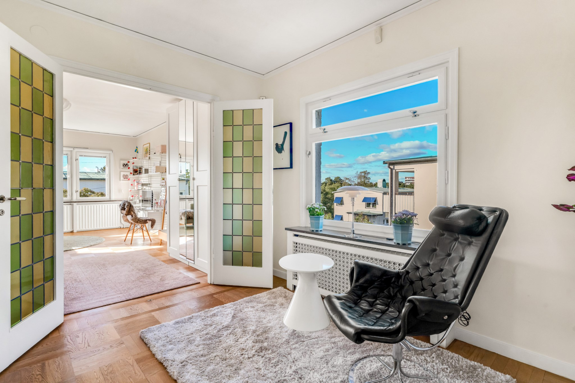 Den inre entréhallen öppnar med pardörrar upp mot ett stort vardagsrum med öppen spis och matsal. Dessa rum, som ligger med helt öppen planlösning, har genom sina stora fönsterväggar och vackra parkettgolv en underbar karaktär. Matsalen har även utgång till en stor balkong i västerläge - vilken även har direktaccess till tomten.