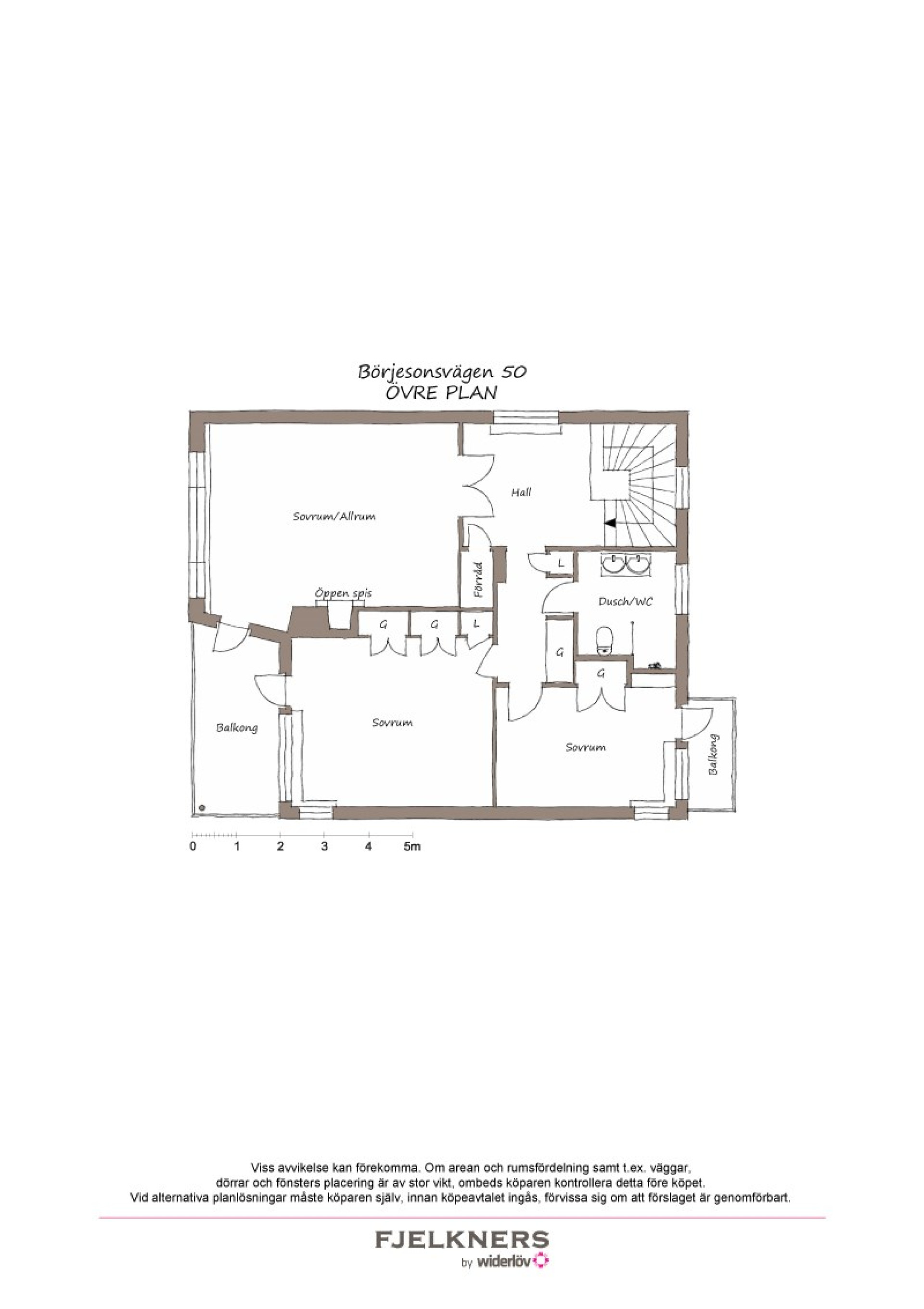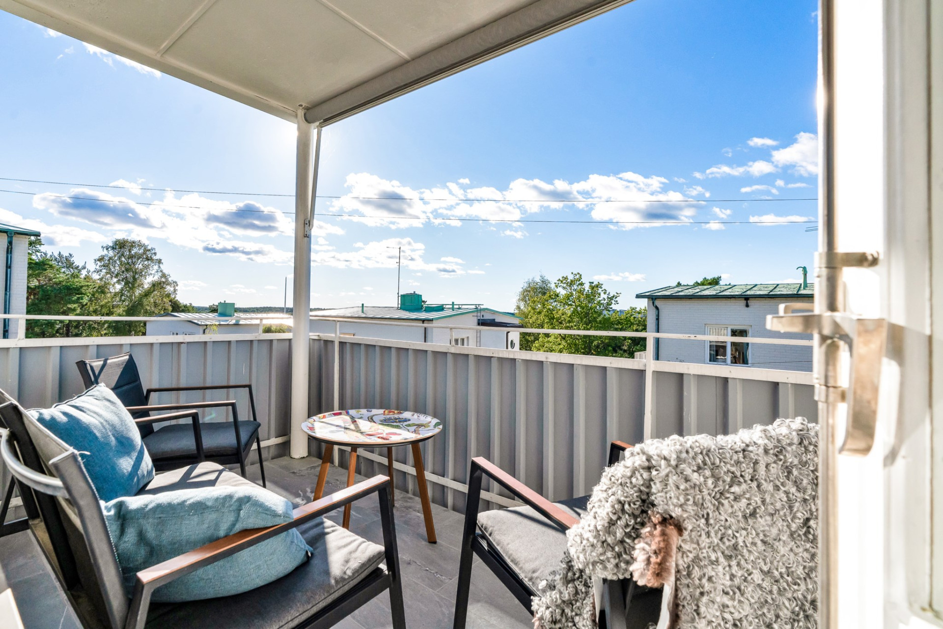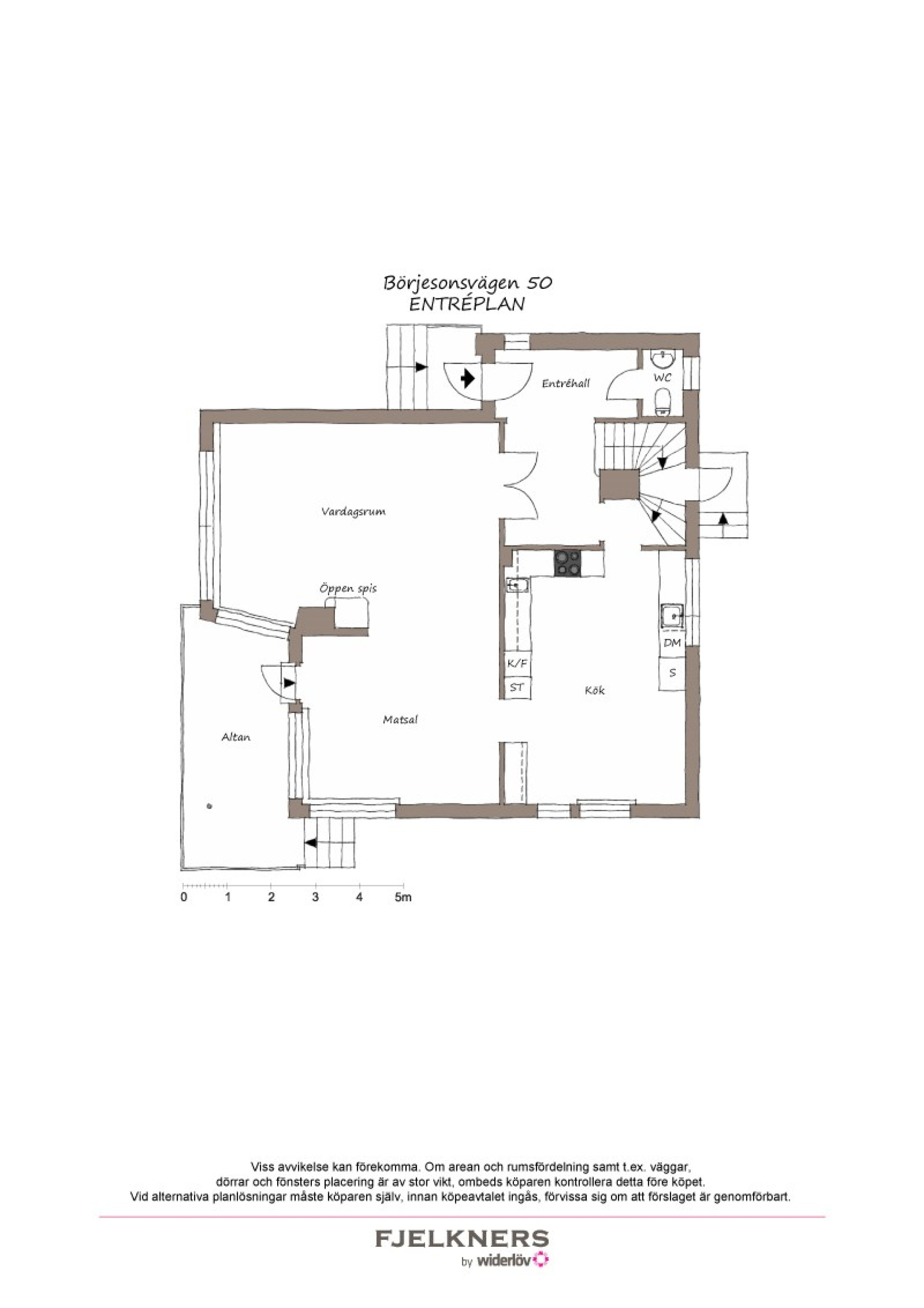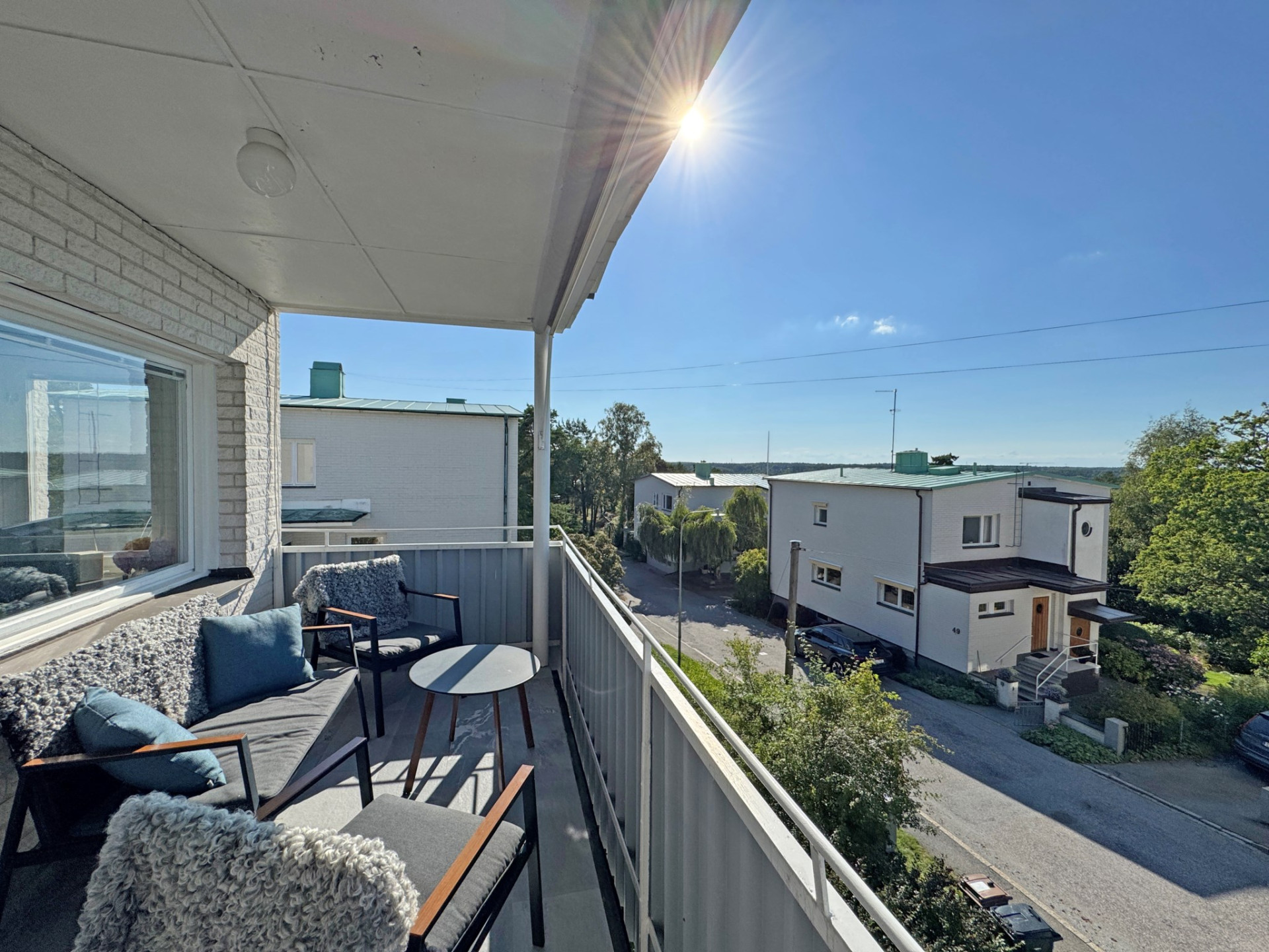 Den inre entréhallen öppnar med pardörrar upp mot ett stort vardagsrum med öppen spis och matsal. Dessa rum, som ligger med helt öppen planlösning, har genom sina stora fönsterväggar och vackra parkettgolv en underbar karaktär. Matsalen har även utgång till en stor balkong i västerläge - vilken även har direktaccess till tomten.