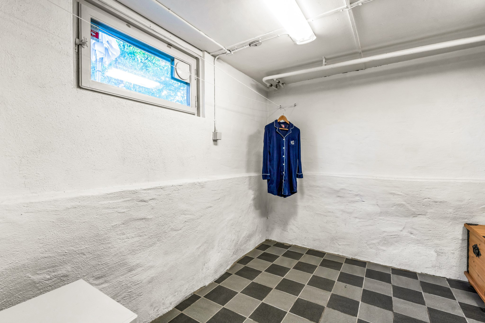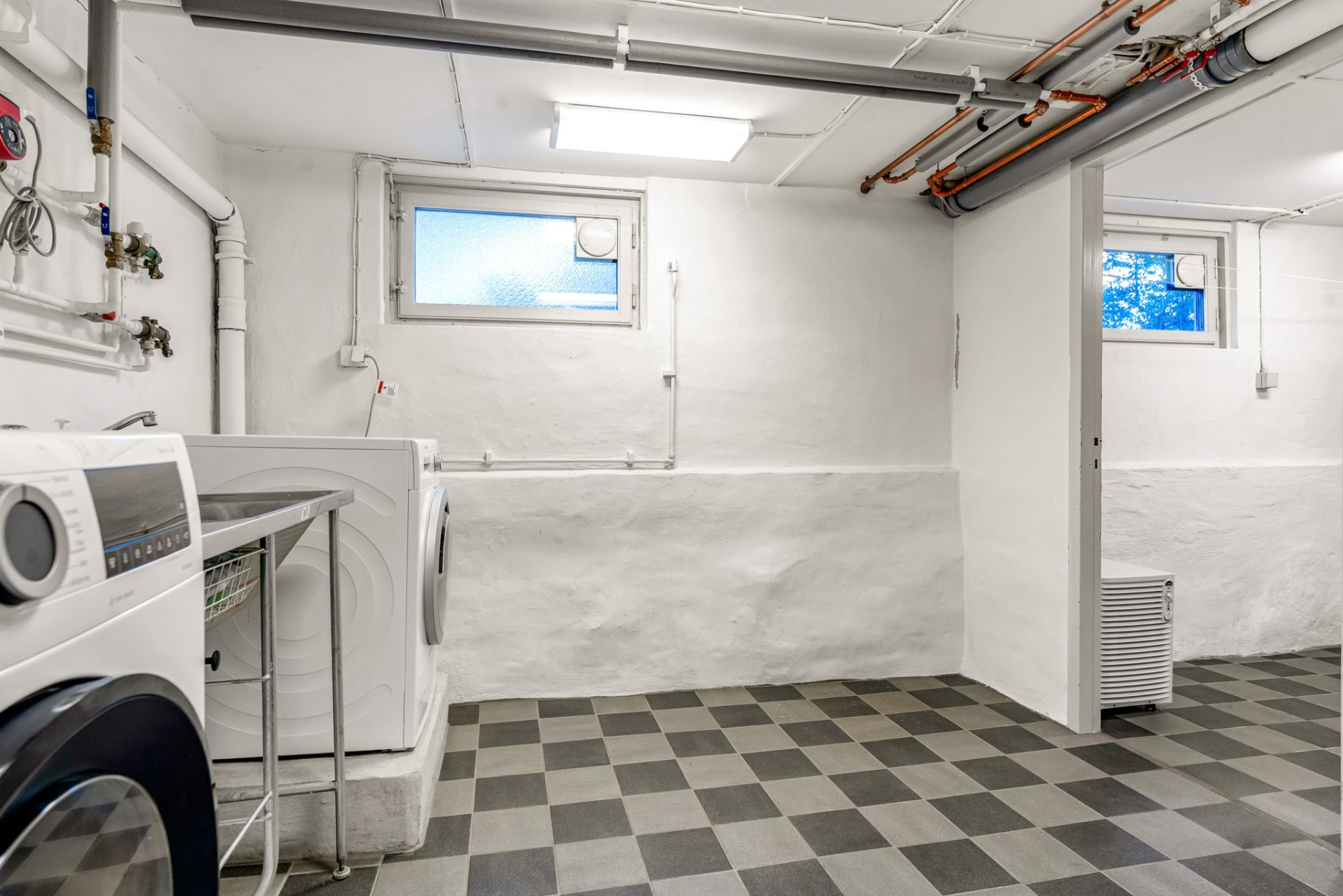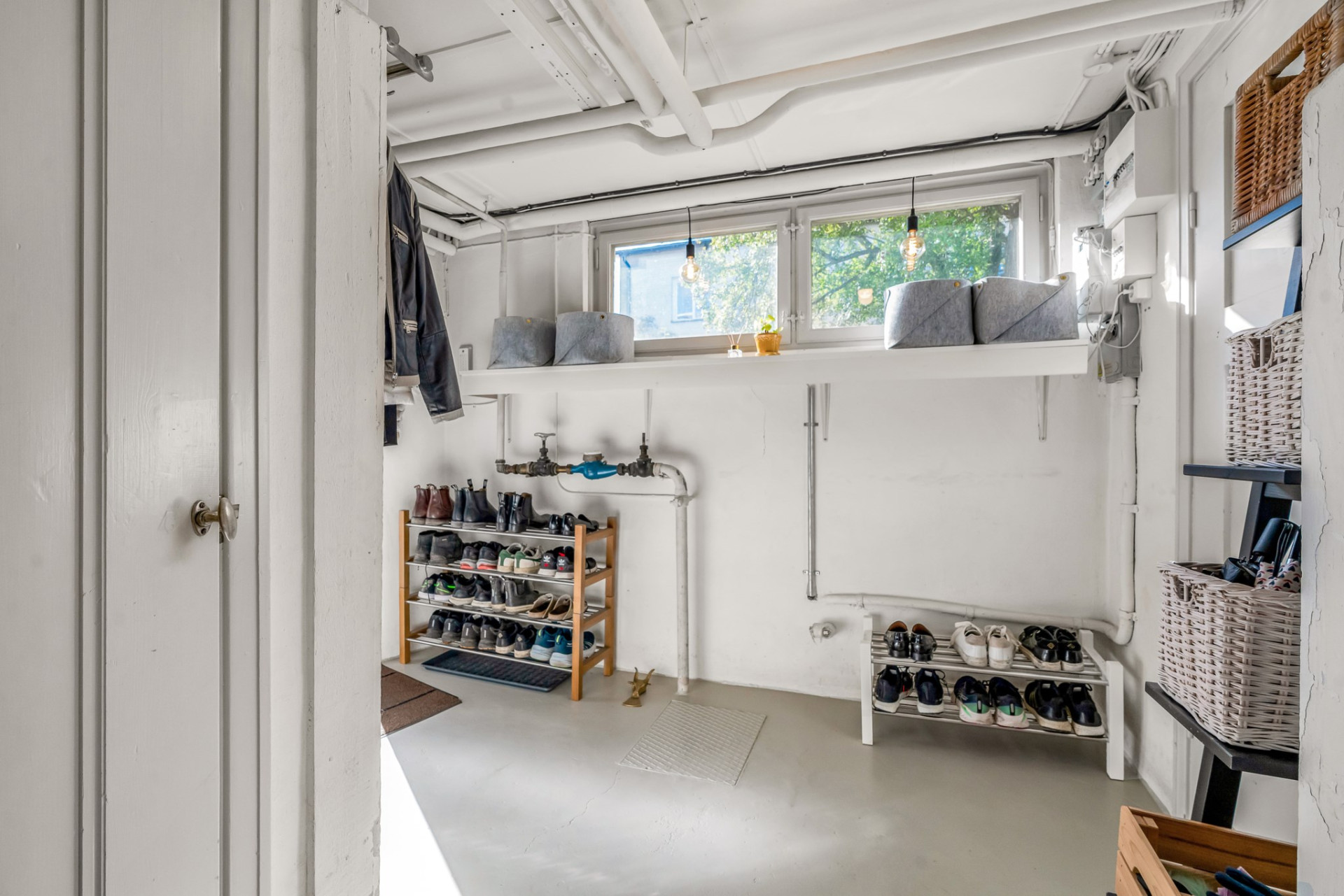 Källarplan, som delvis ligger i "souterräng", är ej inrett utan i ett välhållet originalskick med vitmålade väggar och gråmålade betonggolv. Här finns tvättstuga med intilliggande torkrum, matkällare, fyra förråd, en groventré samt ett garage med vatten och avlopp. Ett av förråden är ursprungligen ett wc-rum. Wc-stolen är borttagen men avloppet är intakt. Källarplanet är rymligt och ett flertal av väggarna är icke bärande. Man kan tänka sig många nyttjandealternativ av detta utrymme.