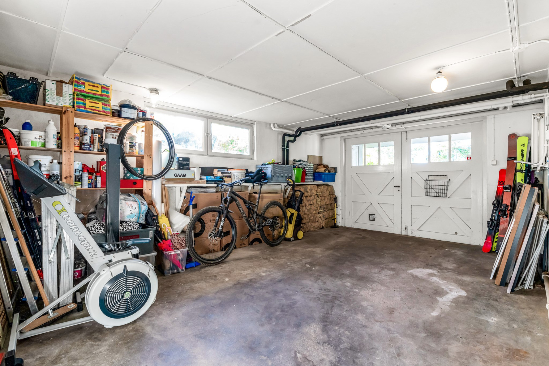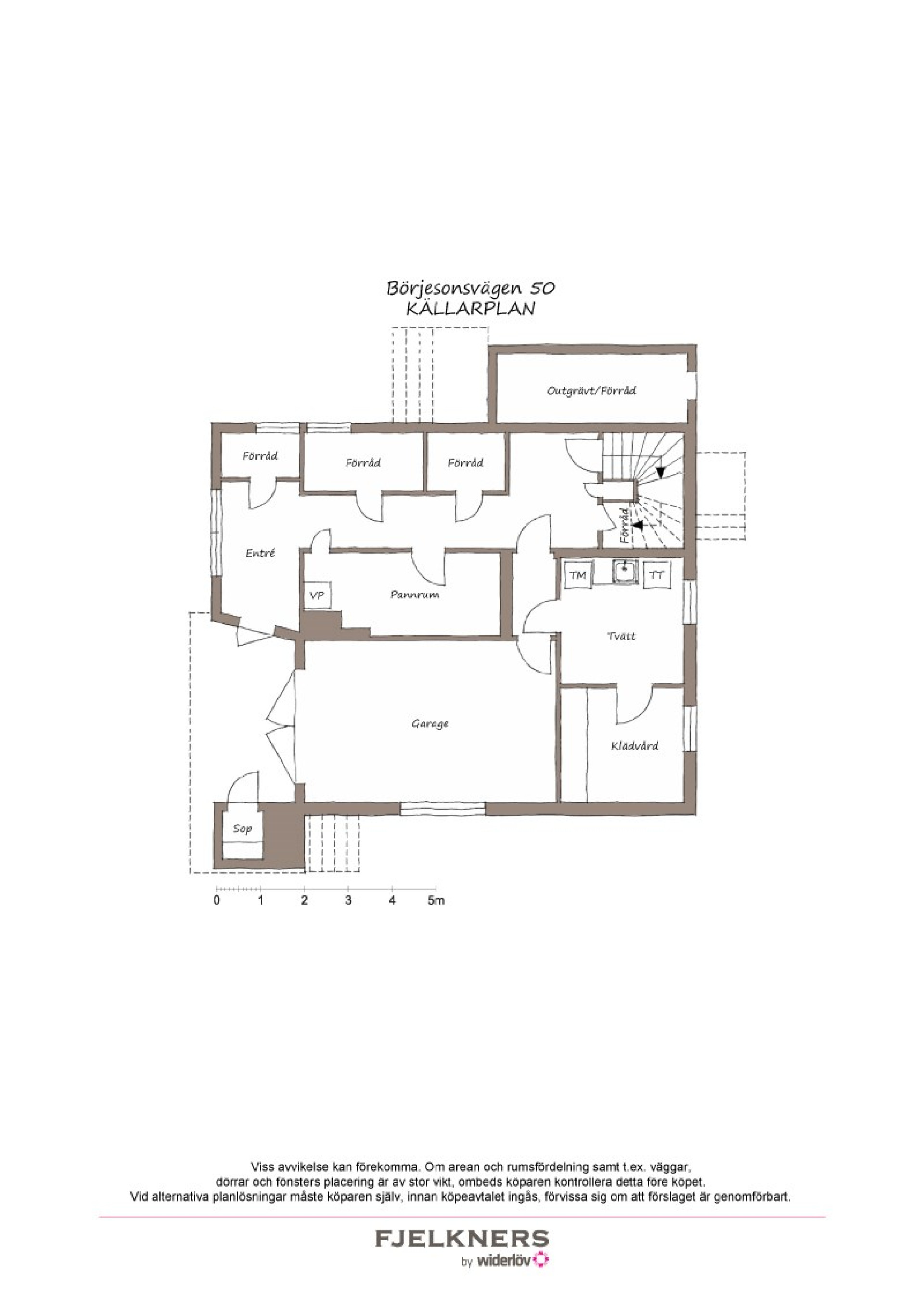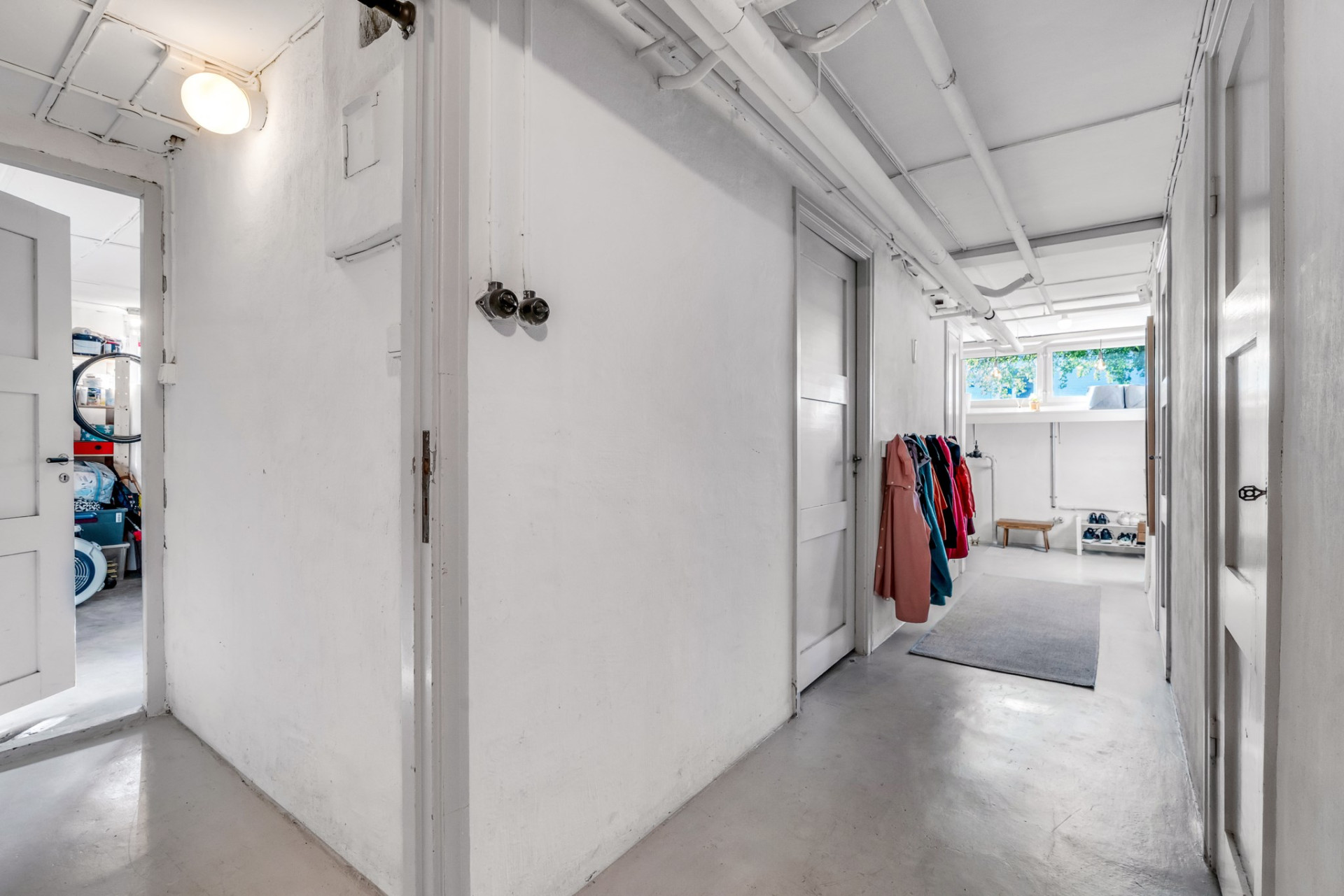 Källarplan, som delvis ligger i "souterräng", är ej inrett utan i ett välhållet originalskick med vitmålade väggar och gråmålade betonggolv. Här finns tvättstuga med intilliggande torkrum, matkällare, fyra förråd, en groventré samt ett garage med vatten och avlopp. Ett av förråden är ursprungligen ett wc-rum. Wc-stolen är borttagen men avloppet är intakt. Källarplanet är rymligt och ett flertal av väggarna är icke bärande. Man kan tänka sig många nyttjandealternativ av detta utrymme.