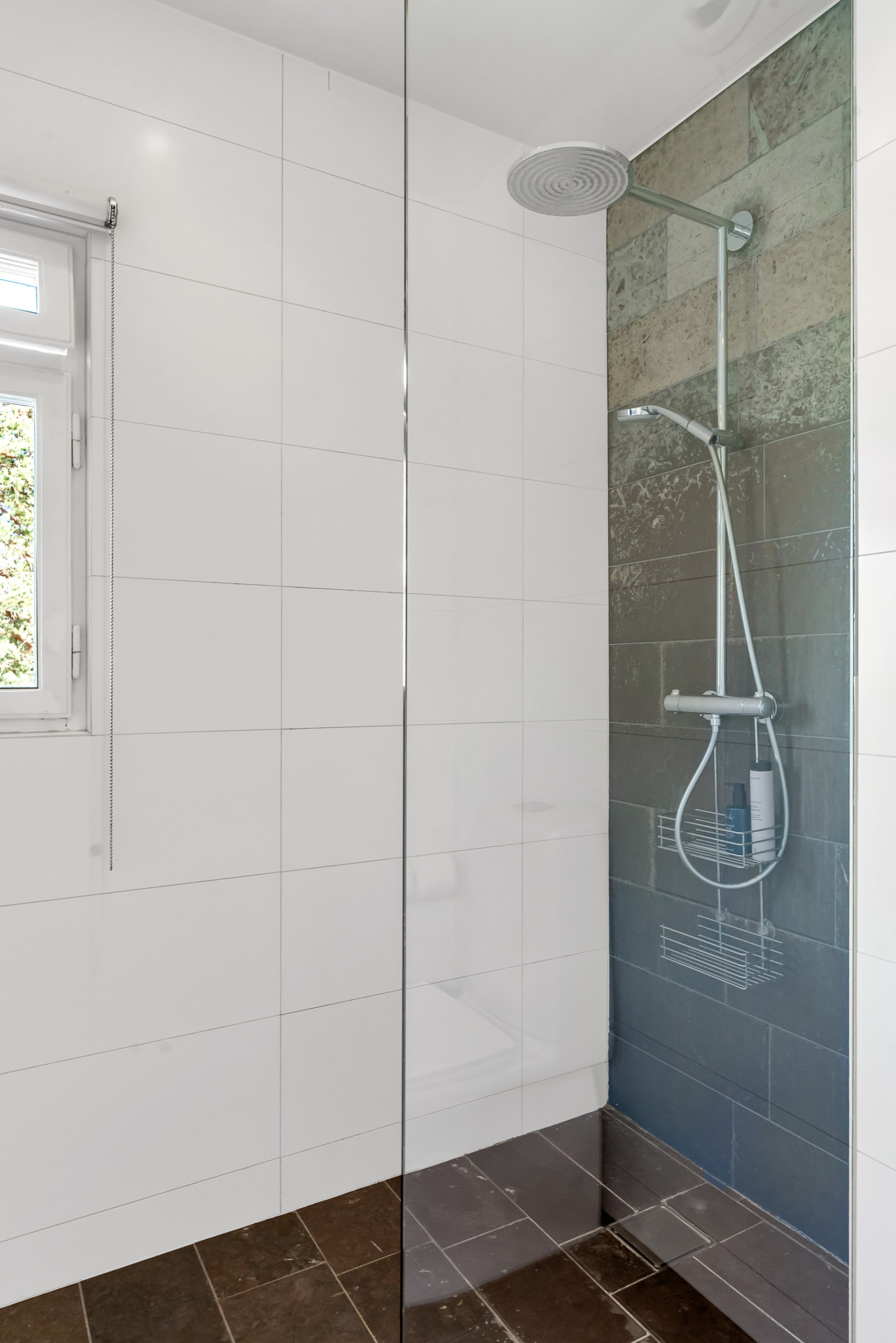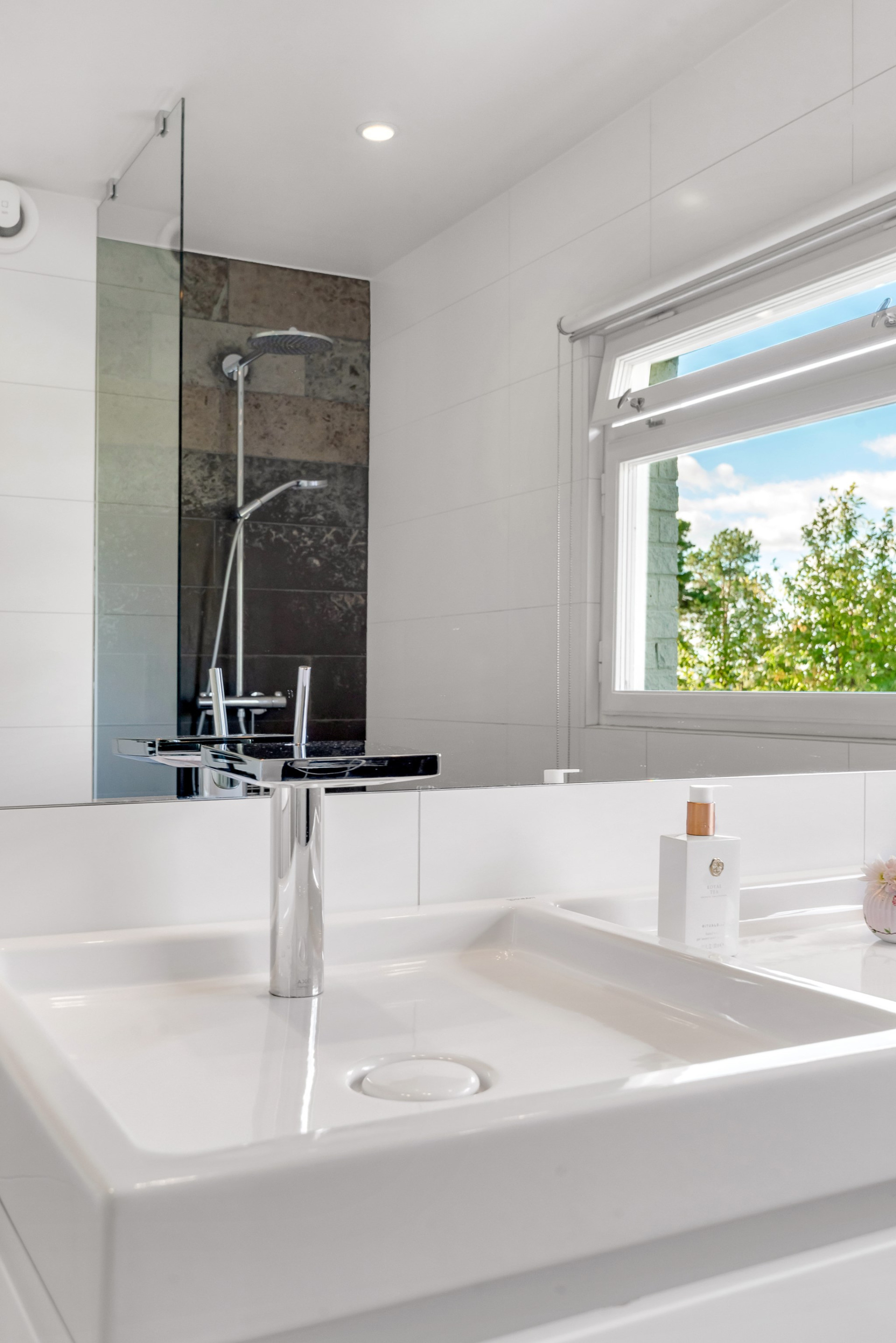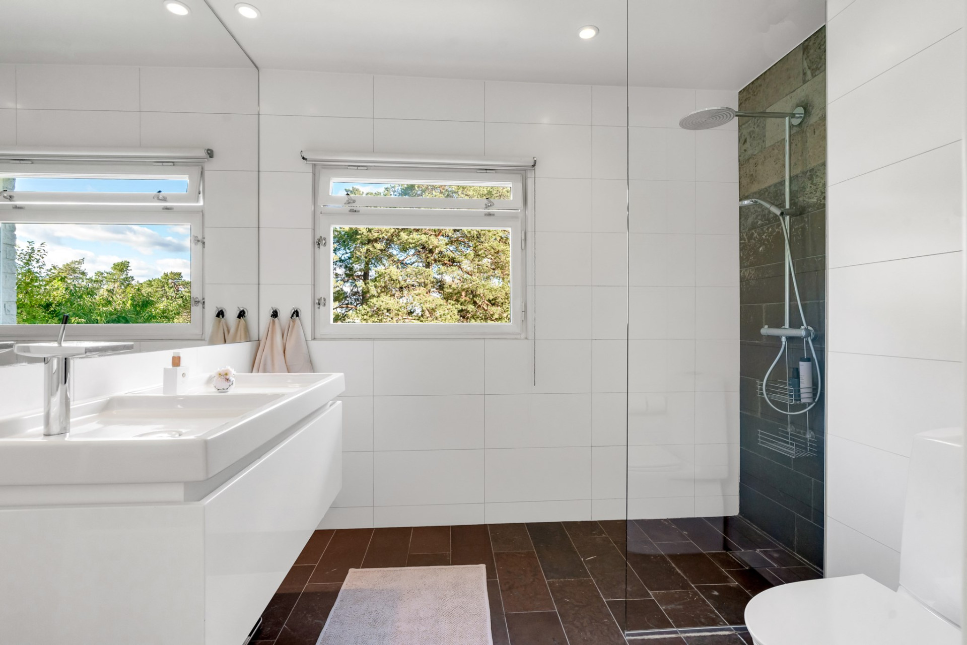Det renoverade badrummet på övre plan har en mycket sober karaktär med golv av samma Borghamnskalksten som gästtoaletten samt tillika kakel från Villeroy & Boch. Här finns dusch med glasvägg, wc, handfat med utdragskommod samt golvvärme.