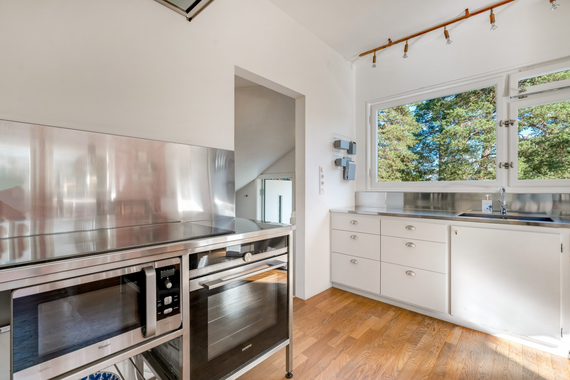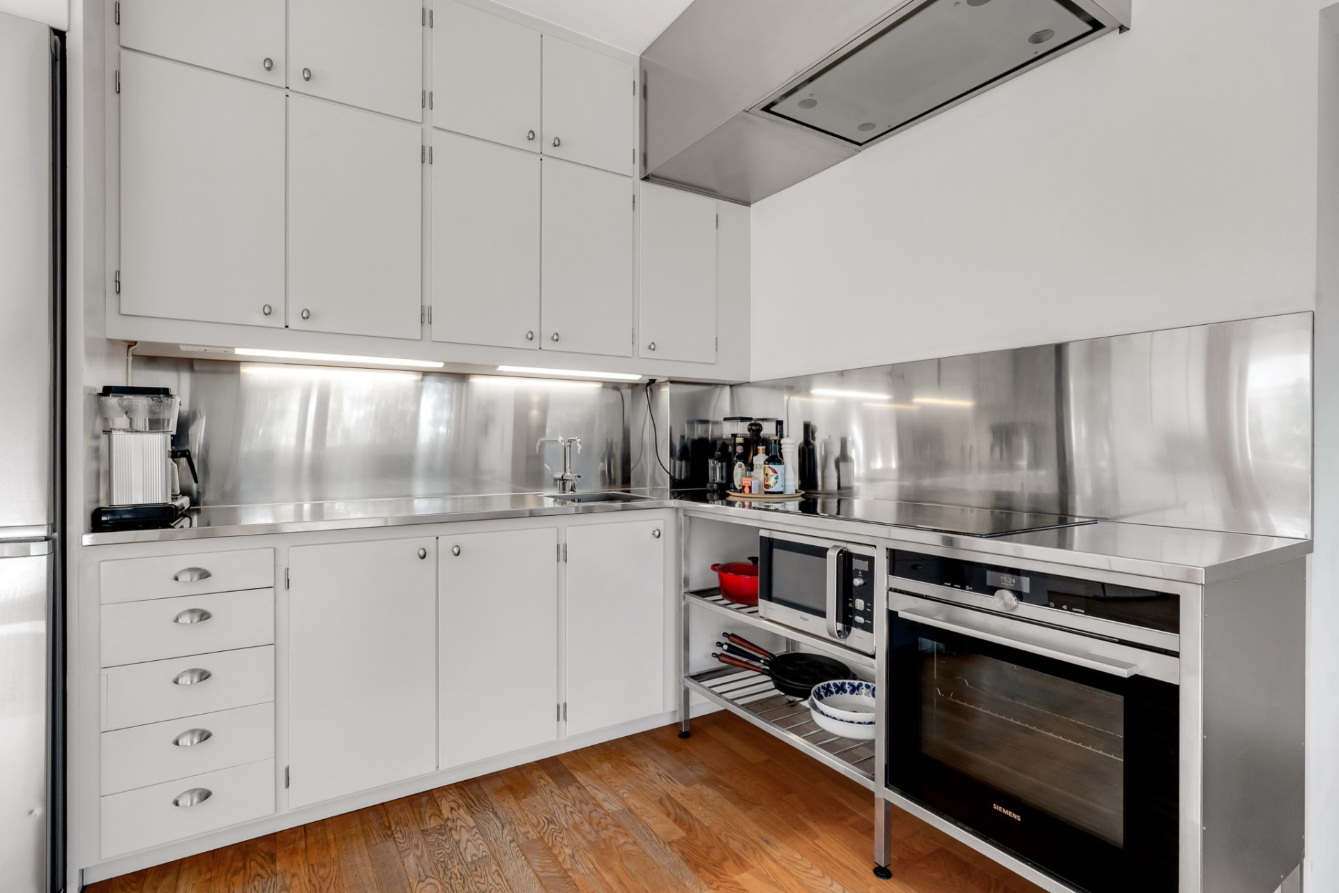 Även köket är mycket rymligt och har plats för stort matbord. Här kombineras de rustade originalskåpen perfekt med moderna bänkskivor i rostfritt stål och en modern maskinpark. På golvet ligger exklusivt stavparkett med vattenburen golvvärme. Från köket kommer man även direkt ut till trädgården.