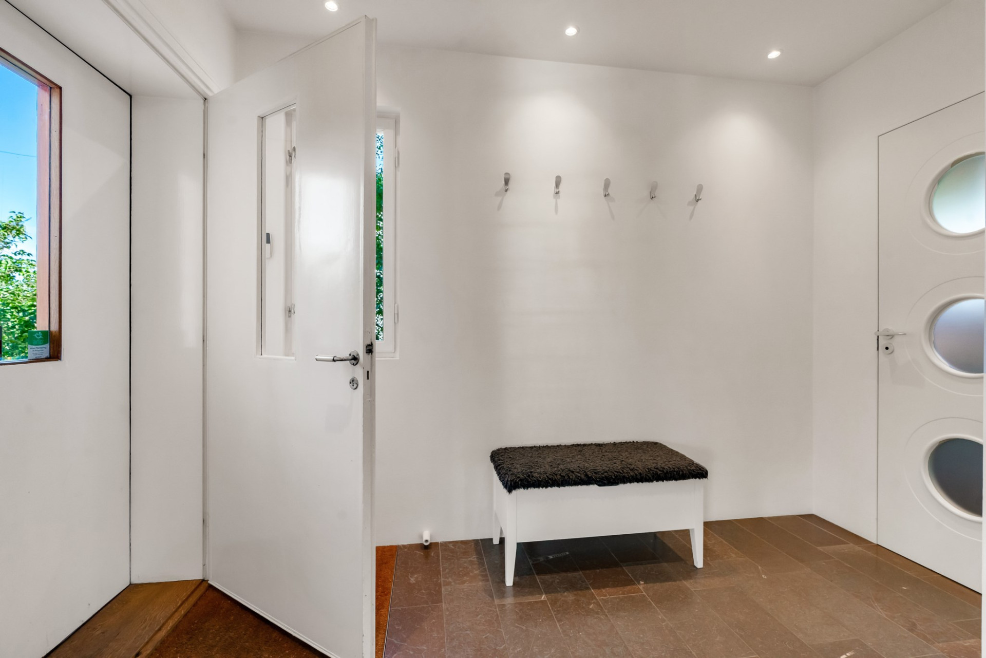 Välkomnande entréhall med golvvärme och golv av gråbrun Borghamnskalksten. Även den intilliggande gästtoaletten har samma golvbeläggning med golvvärme.