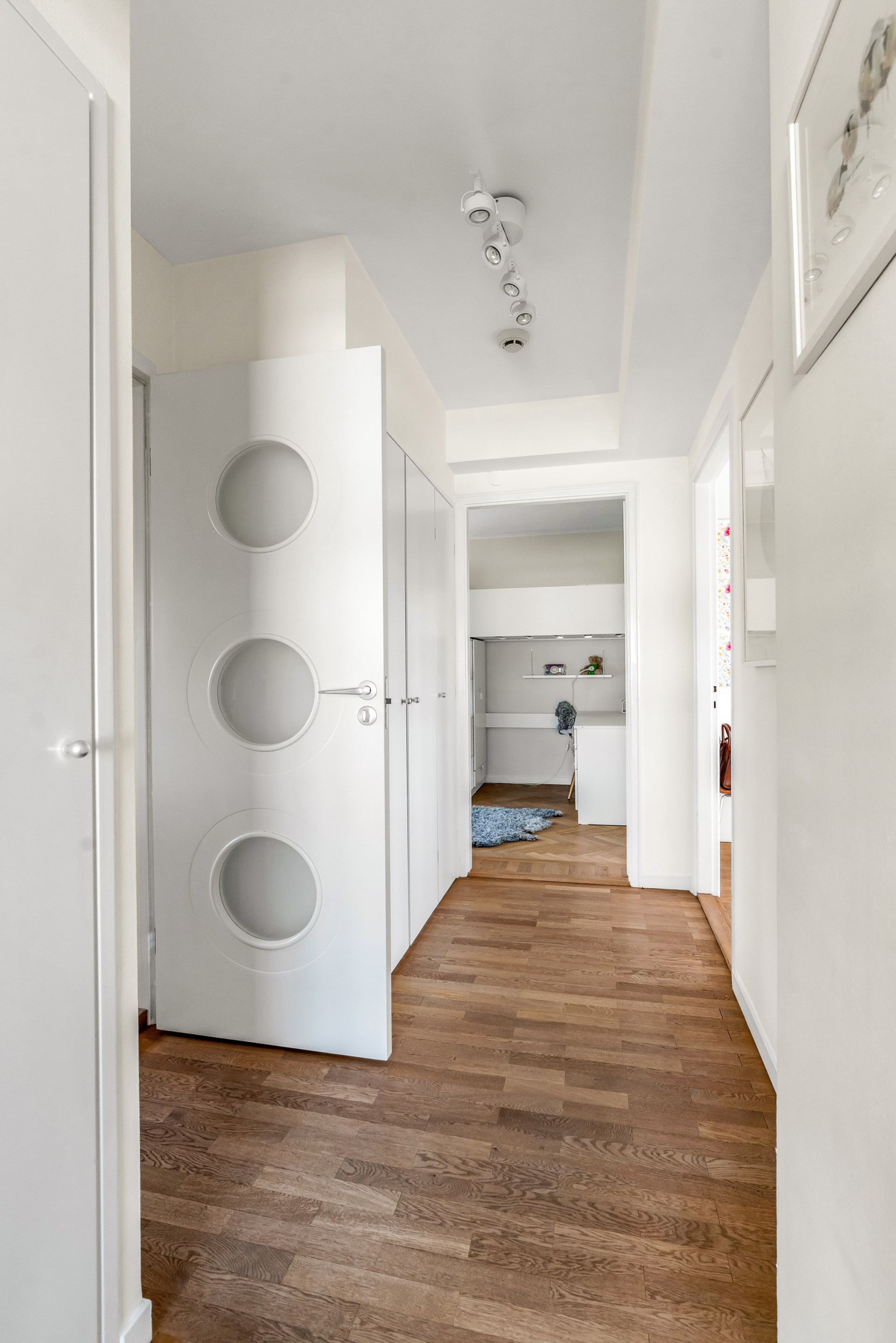 På hela övre plan, som även har gott om inbyggda garderober, ligger ett vackert golv i ekparkett.