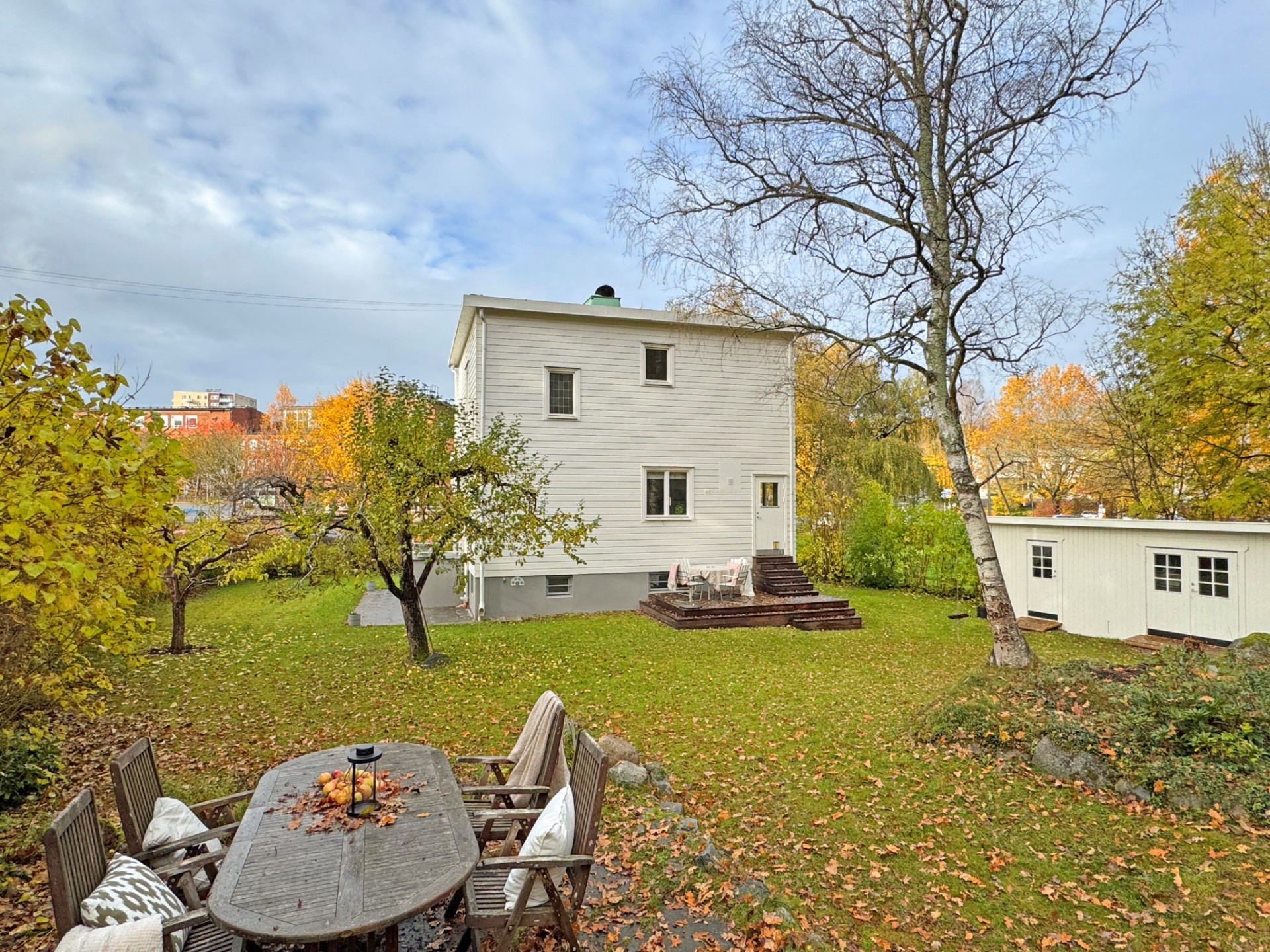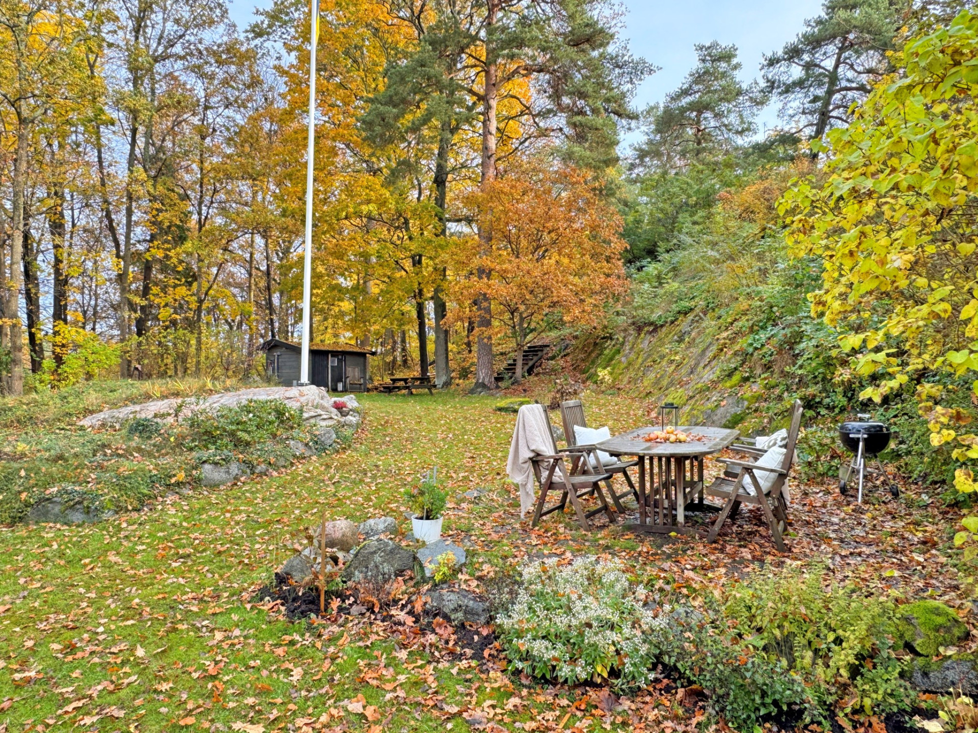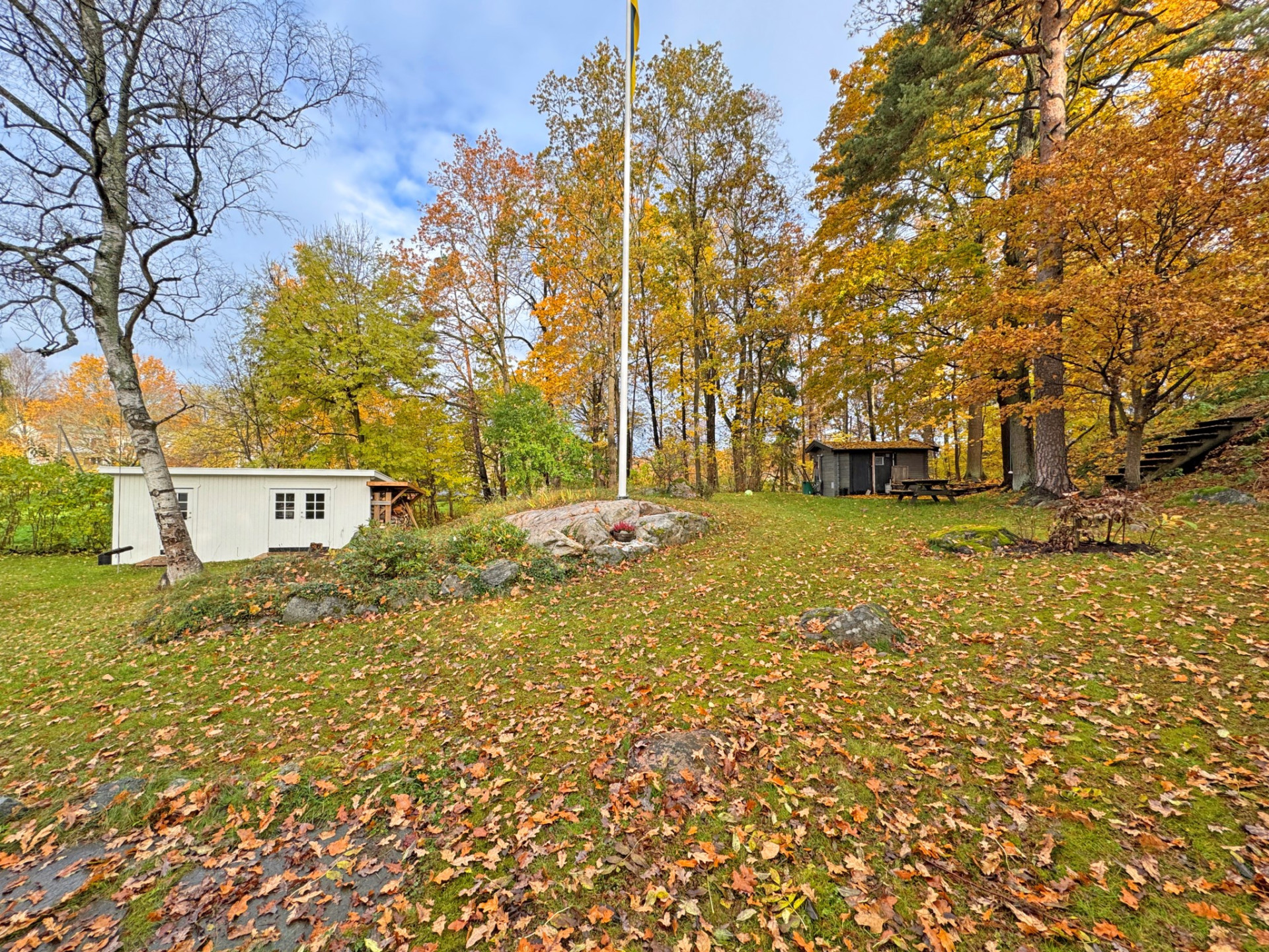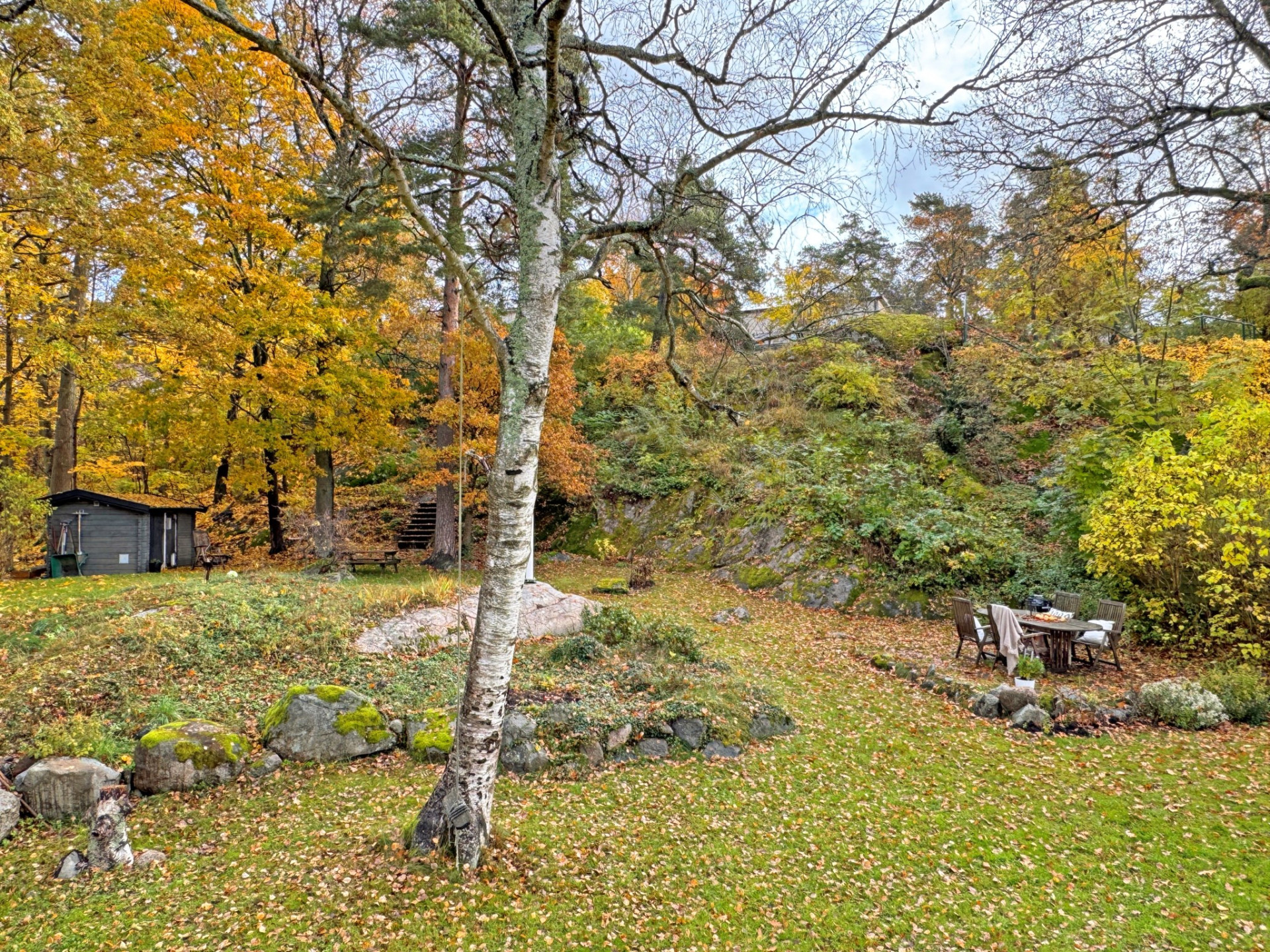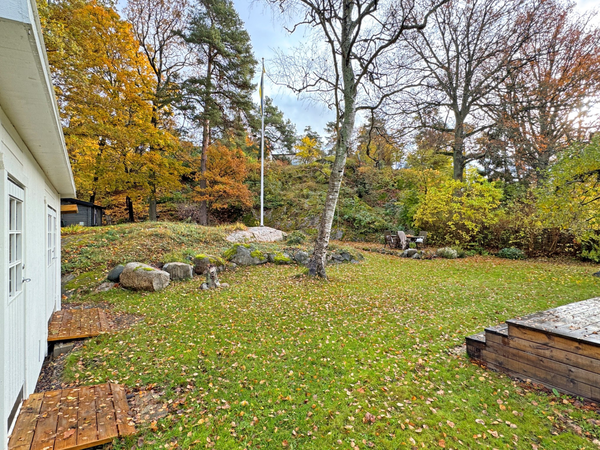 Den stora trädgården är en grön oas med både uppvuxna äppel- och plommonträd, frodig syren, doftande jasmin, praktfull rhododendron, pioner och en mångfald av fleråriga blomsorter. Partier med berg i dagen skänker trädgården tydlig karaktär och förstärker den klassiska funkiskänslan. Här finns också ett stort förråd som ger gott om plats för både trädgårdsredskap och fritidsutrustning. En ståtlig flaggstång pryder sin plats och gör trädgården komplett.
