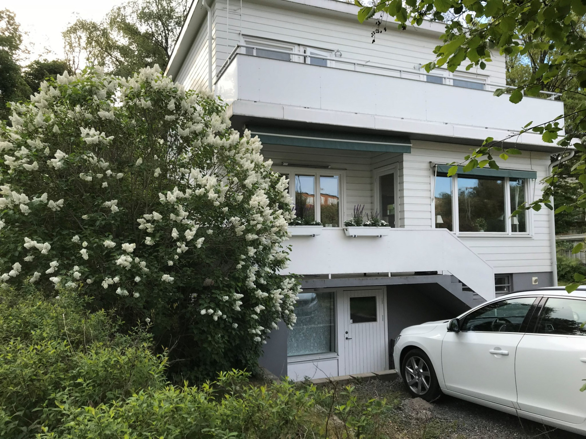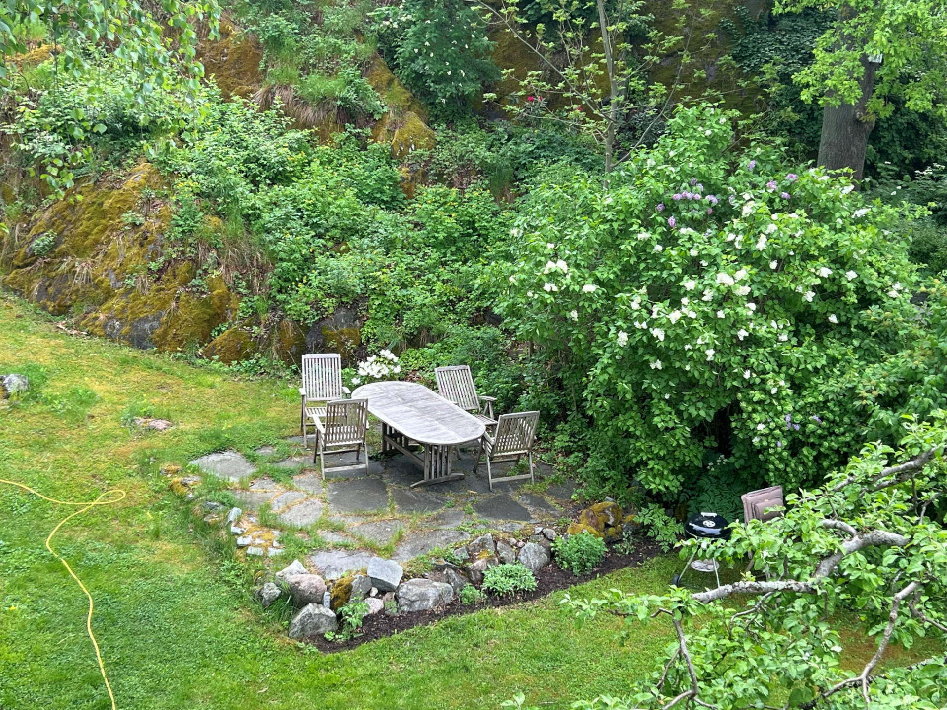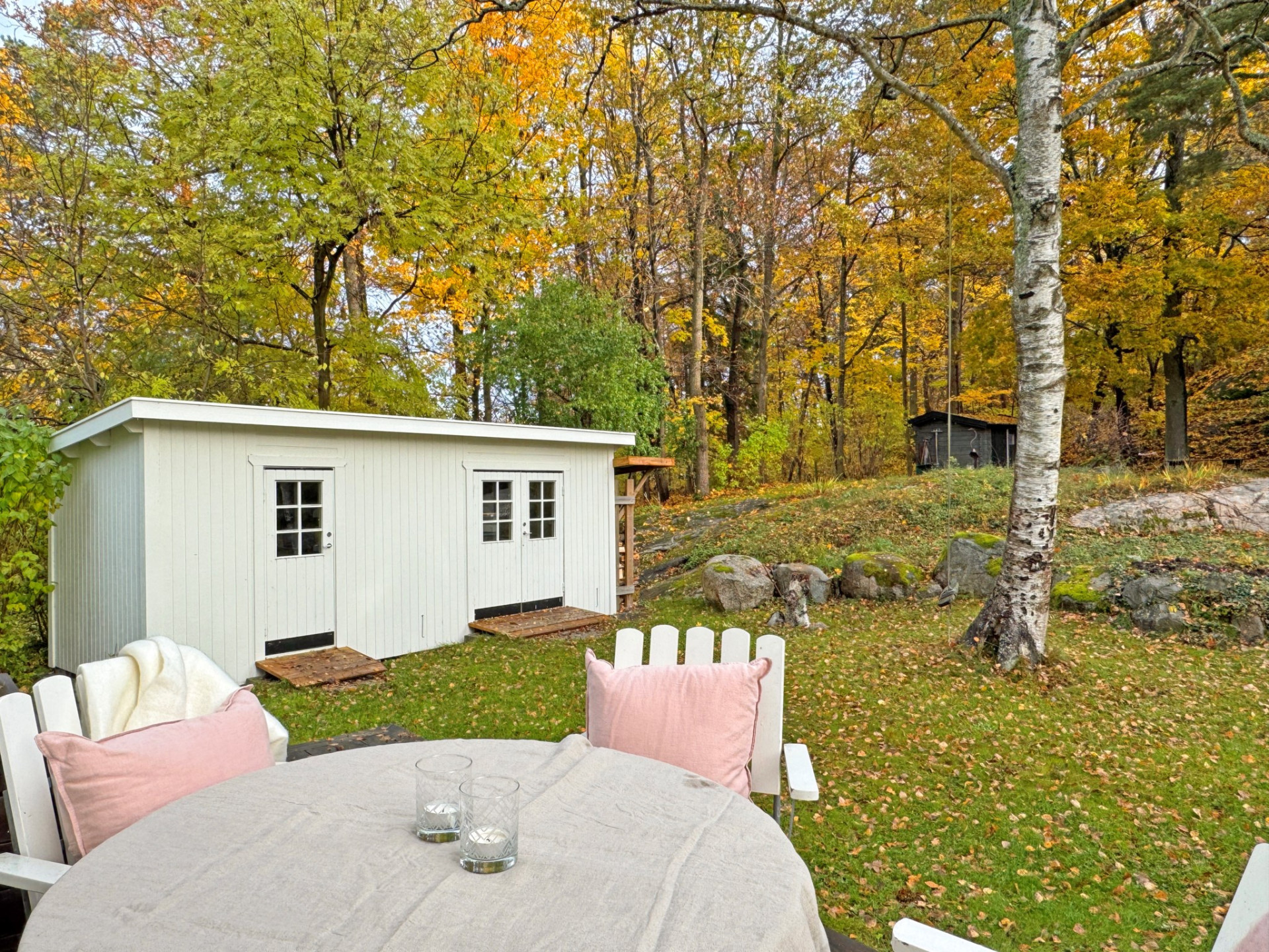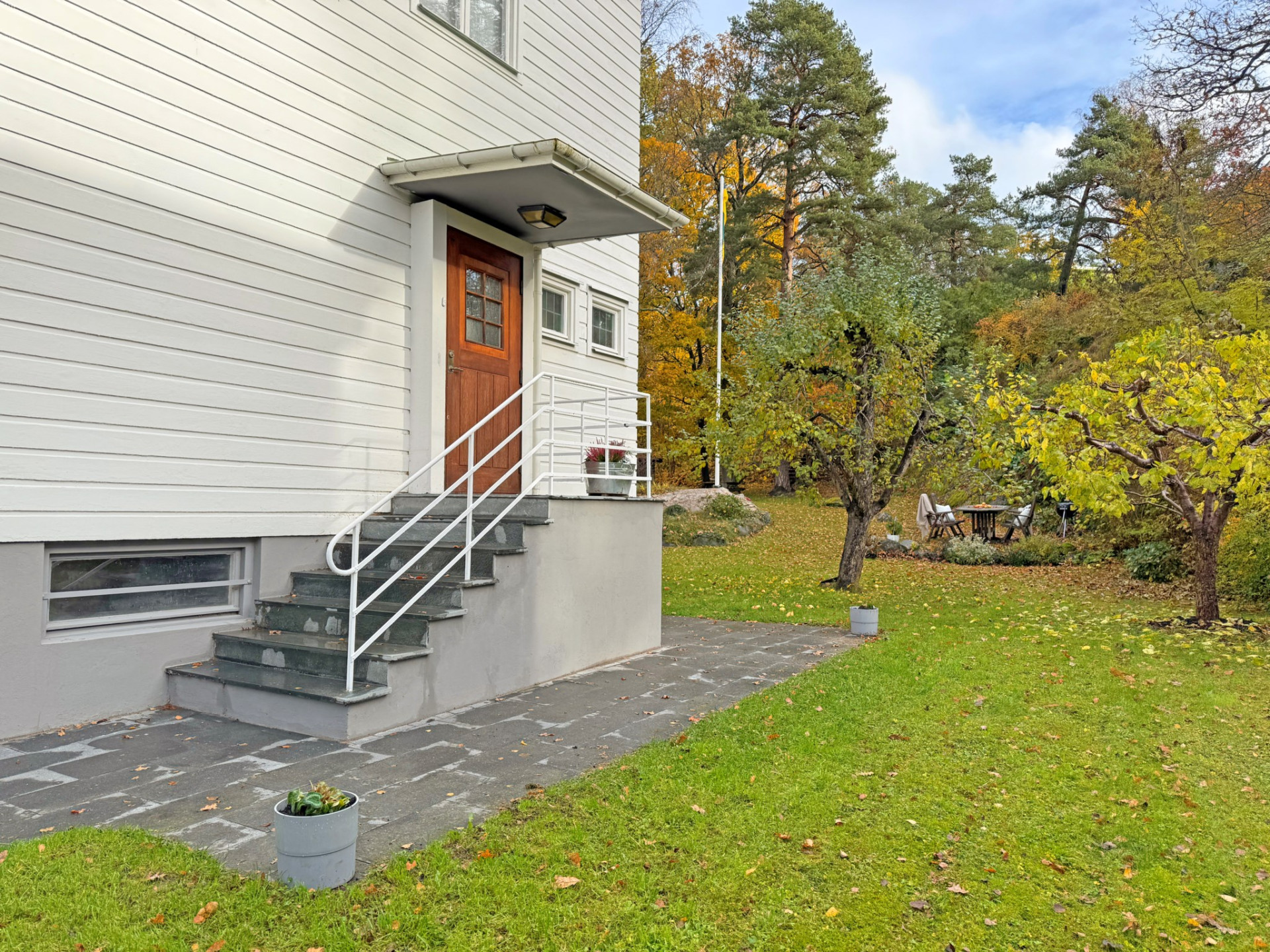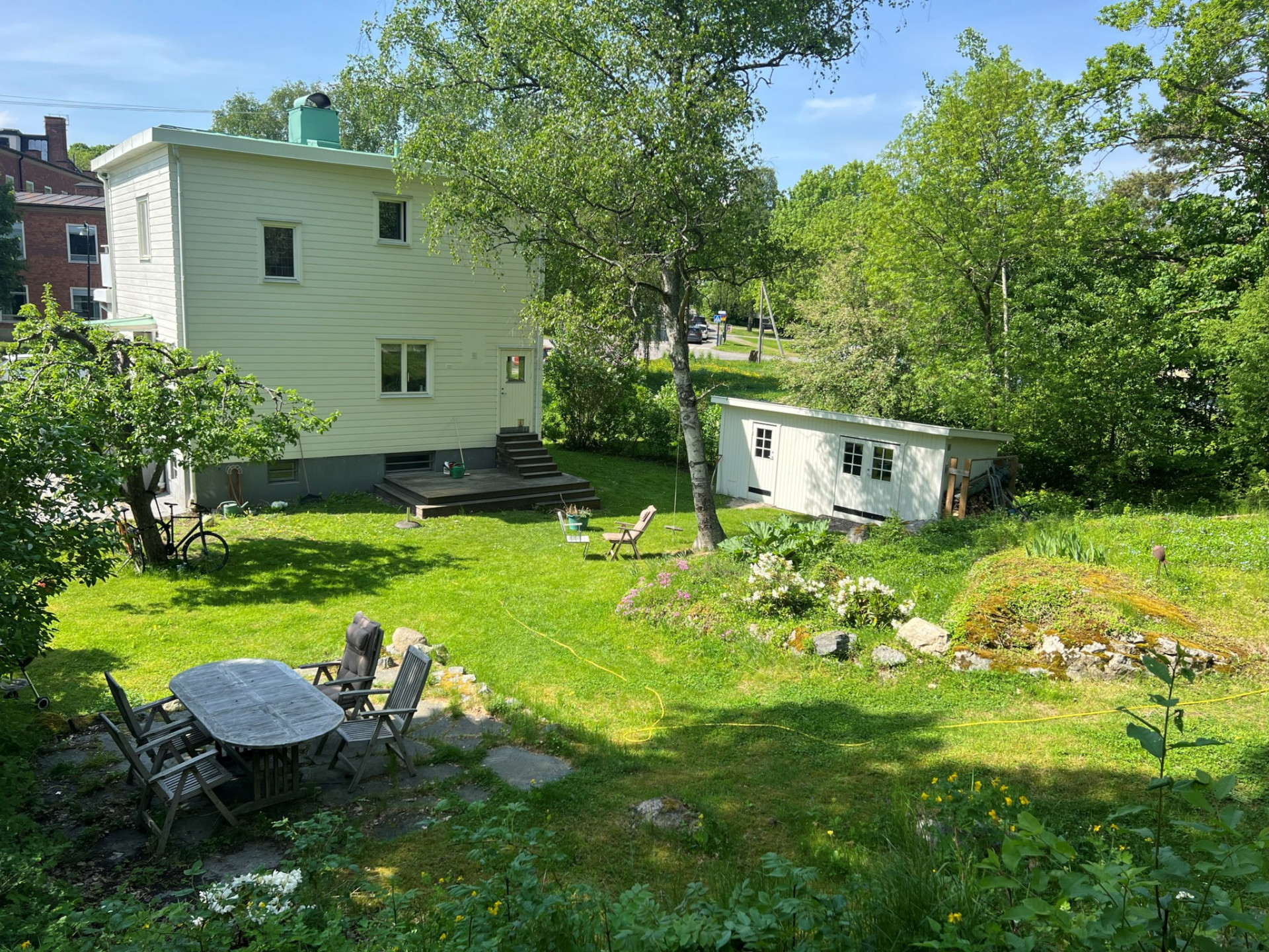 Den stora trädgården är en grön oas med både uppvuxna äppel- och plommonträd, frodig syren, doftande jasmin, praktfull rhododendron, pioner och en mångfald av fleråriga blomsorter. Partier med berg i dagen skänker trädgården tydlig karaktär och förstärker den klassiska funkiskänslan. Här finns också ett stort förråd som ger gott om plats för både trädgårdsredskap och fritidsutrustning. En ståtlig flaggstång pryder sin plats och gör trädgården komplett.