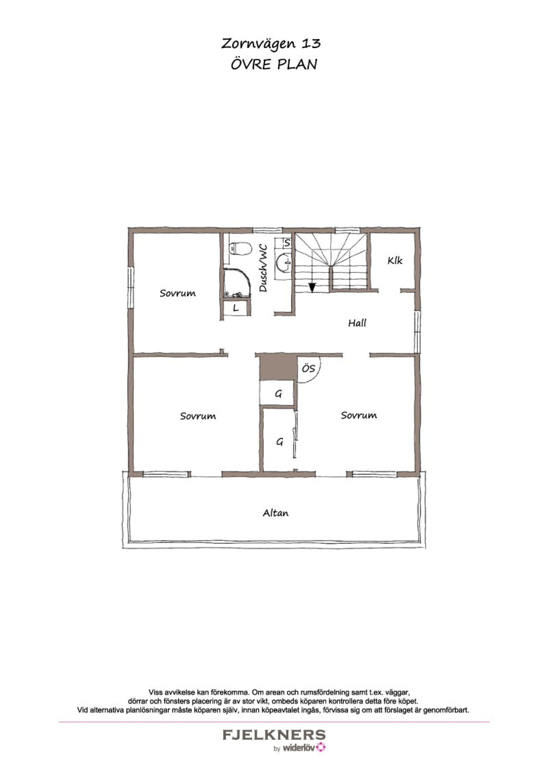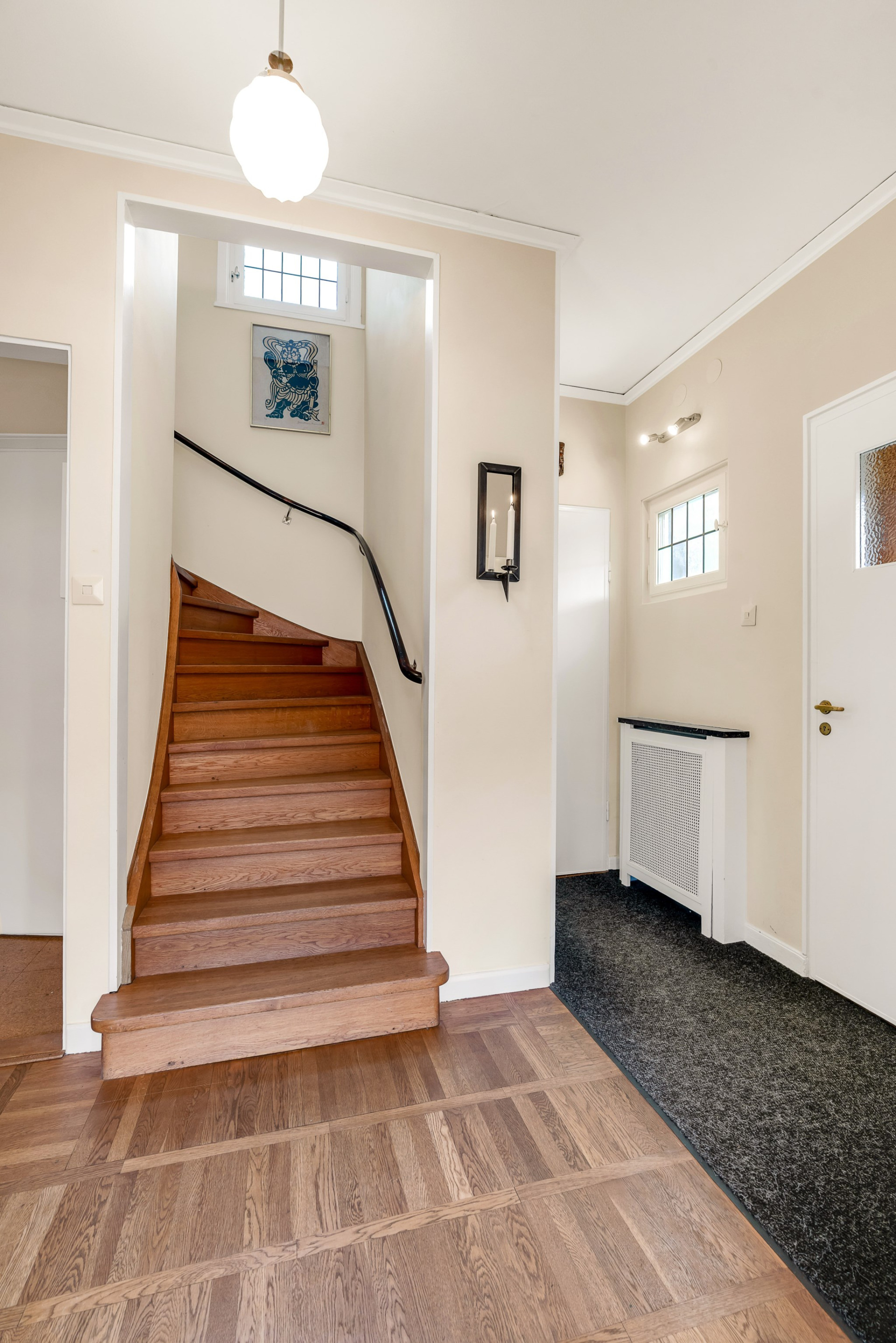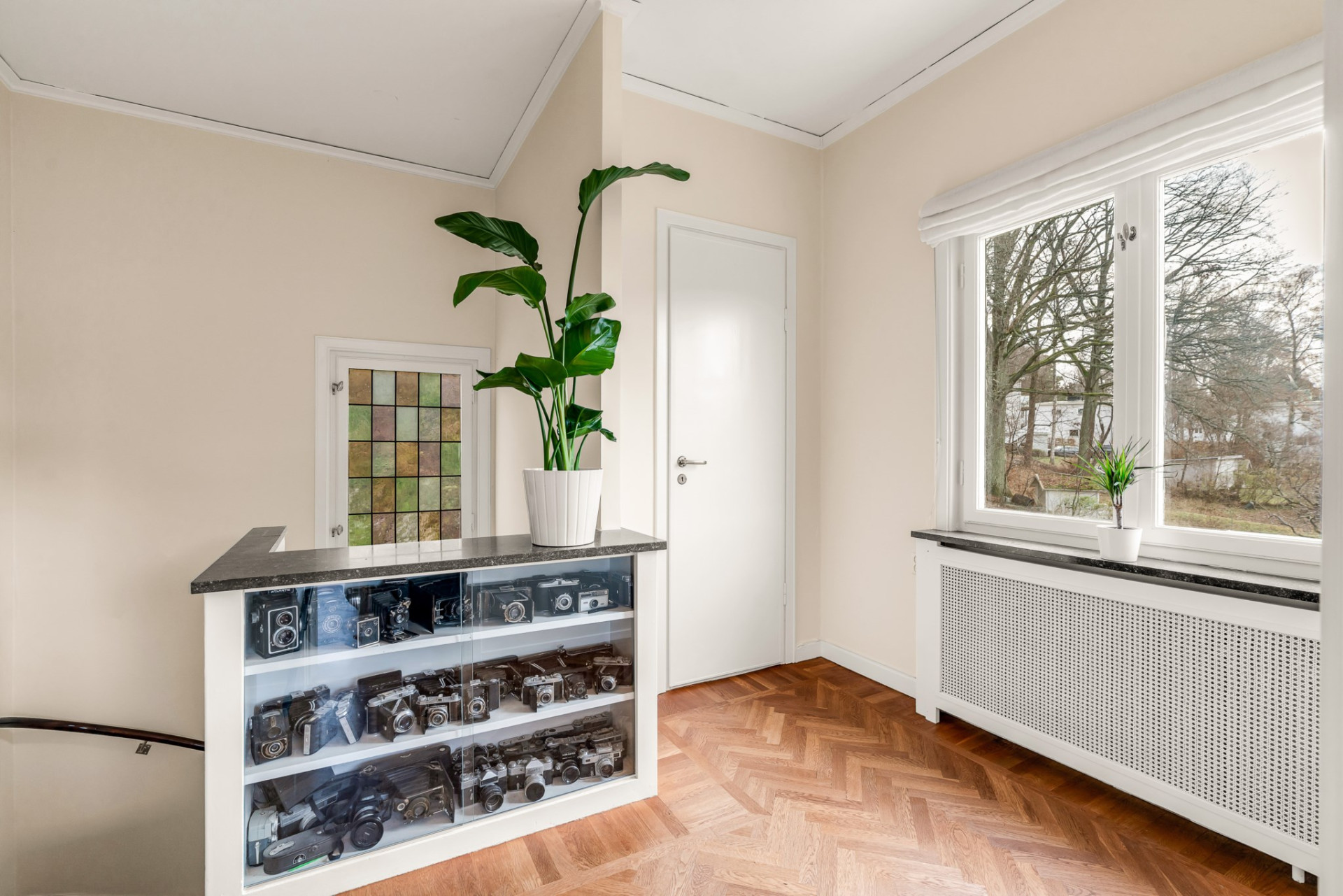 Längs vacker ektrappa tar vi oss till det övre planet där vi möts av en möblerbar hall som skapar en behaglig känsla av rymd och binder samman tre rogivande sovrum. Blyspröjsade fönster och vacker fiskbensparkett blir det lilla extra. Master bedroom är rymligt med en vacker öppen spis, stor garderobsvägg med spegeldörrar och härligt ljus från såväl fönster som balkongdörr. Det rymliga badrummet kompletterar våningsplanet med helkaklade väggar i sobert vitt, dusch och praktisk kommod som rymmer det mesta. Här finns gott om plats för hela familjen.