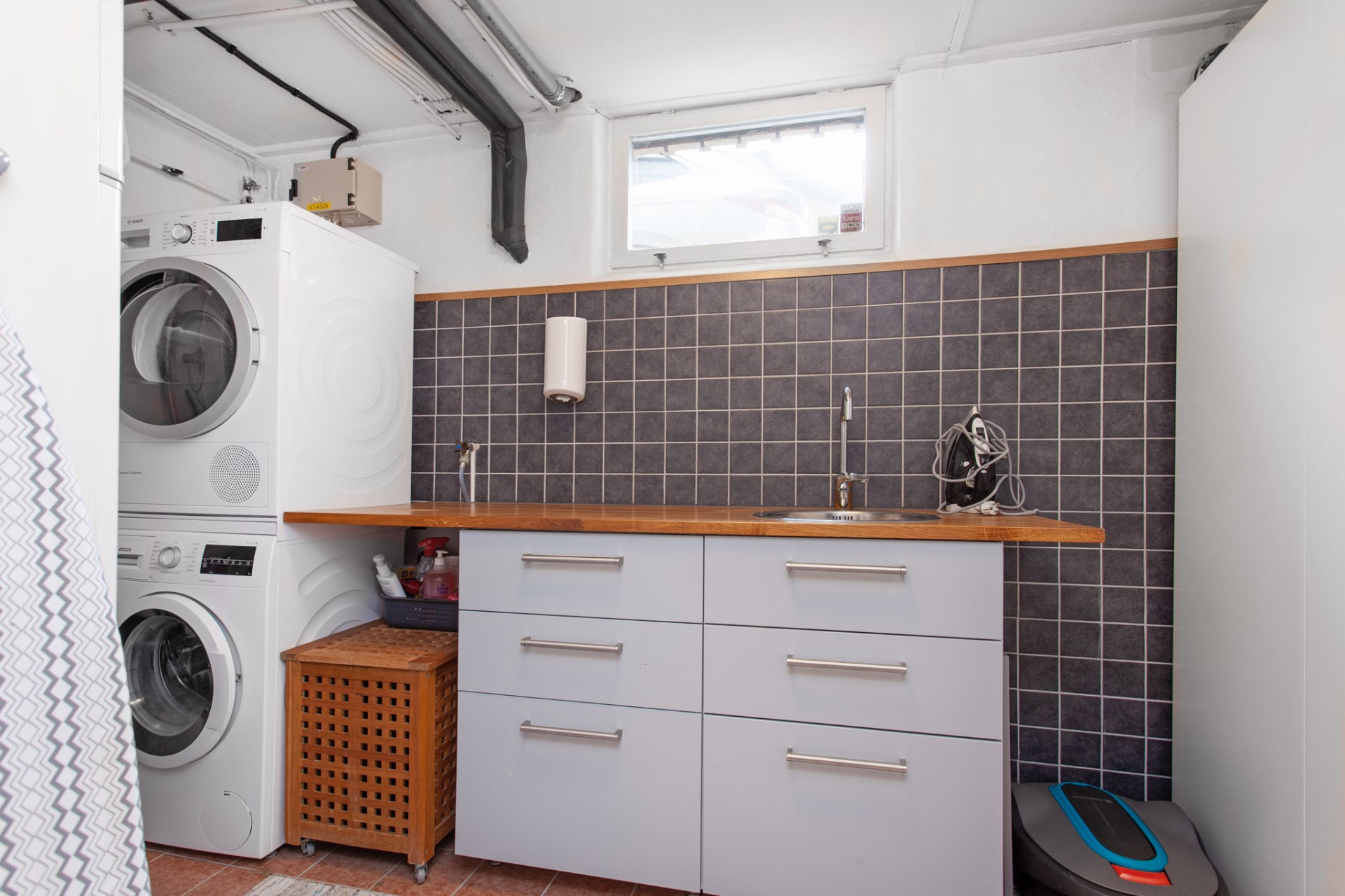 Helkaklad tvättstuga med klinkers och fönster i två väderstreck. Här finns en bra arbetsbänk med ho, tvättmaskin och torktumlare. På väggen bakom arbetsbänken sitter kakel och under bänken finns skåp med lådor för förvaring. Intill finns en garderob för ytterligare förvaring.