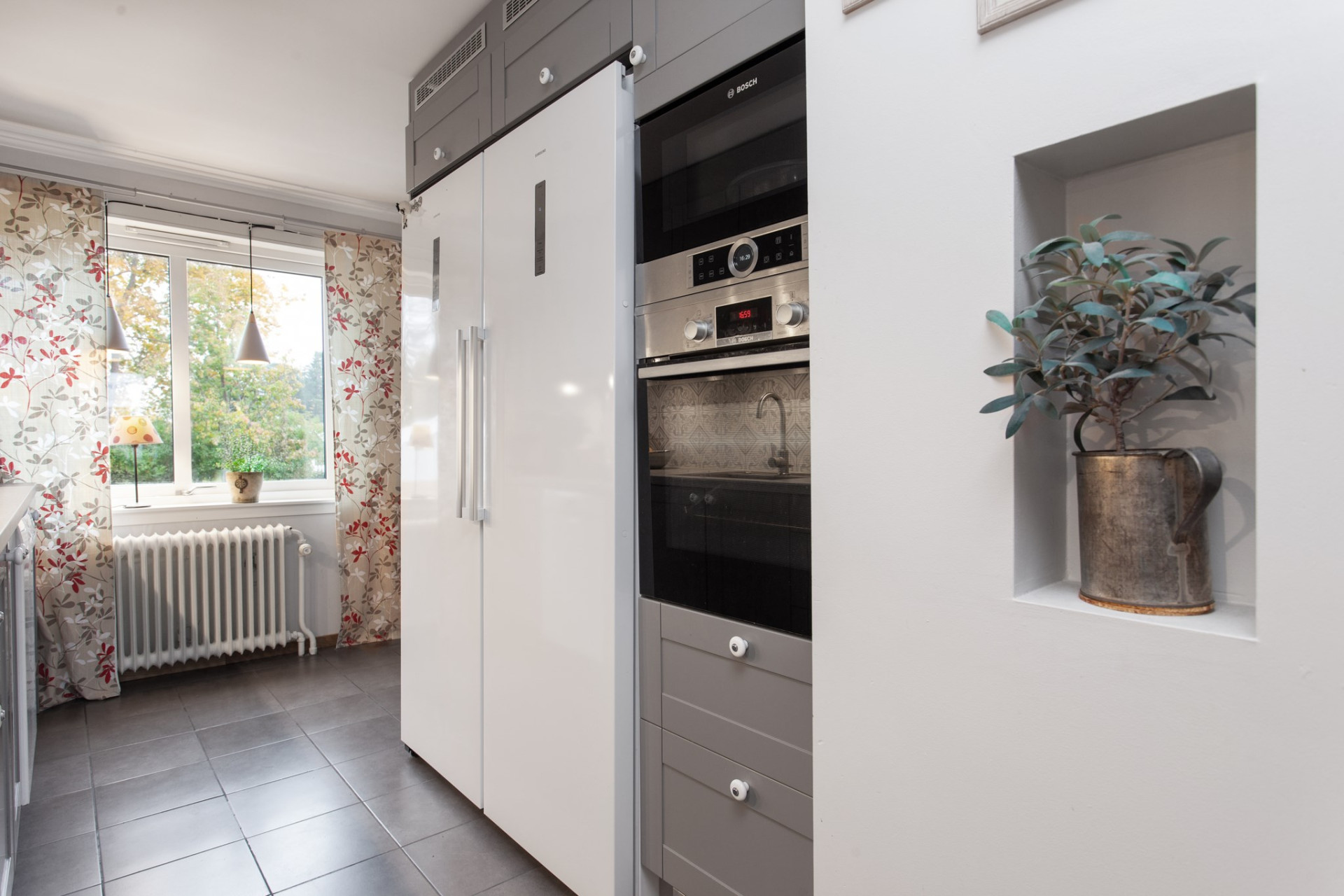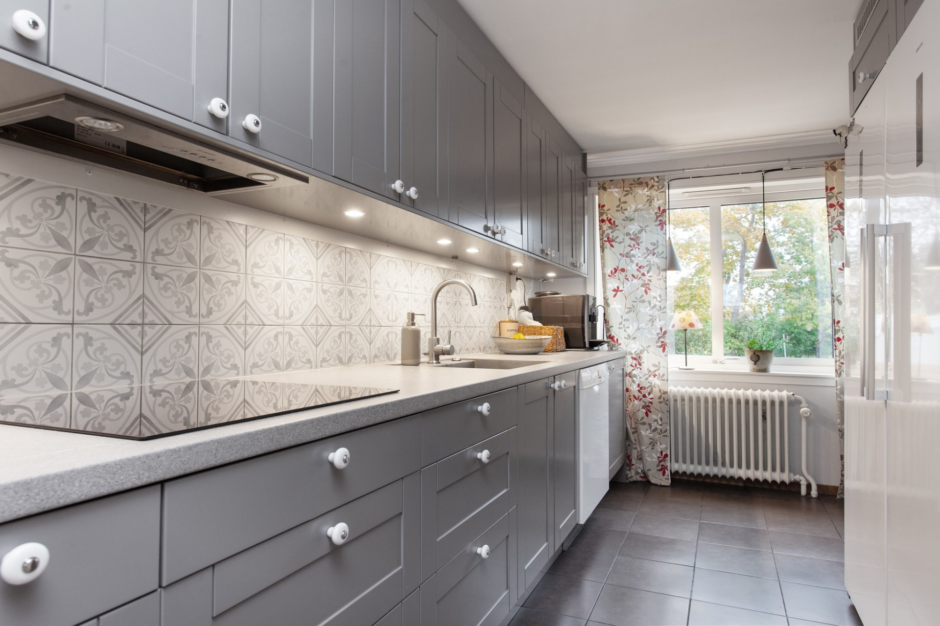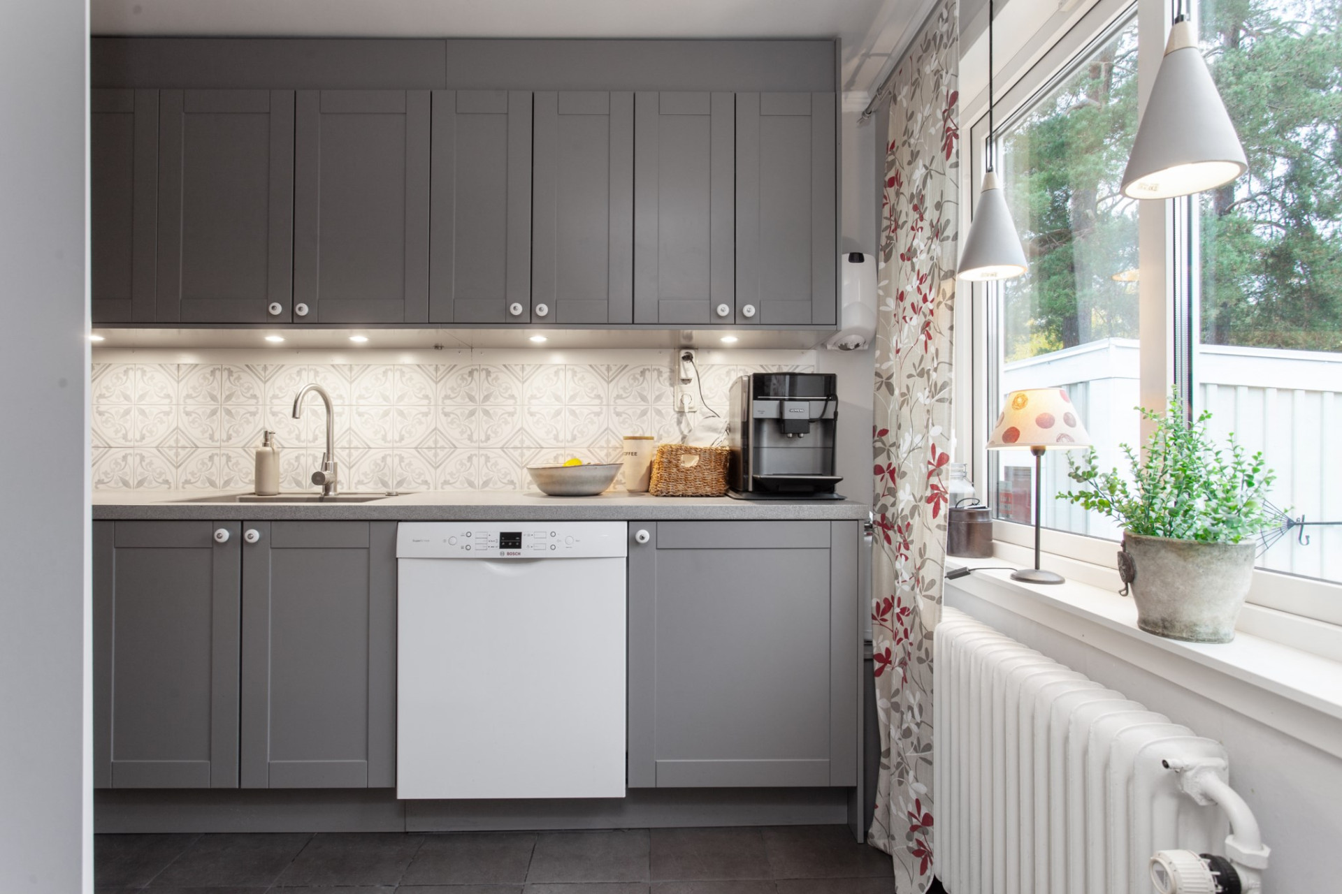 Ljust och trivsamt Epoc-kök från 2020 med lång arbetsbänk och gott om skåp och lådor för förvaring. Luckorna går i grått och mellan skåpen och arbetsbänkarna sitter kakel som liksom bänken lyses upp av infällda spotlights. På golvet ligger klinkers med skön, underliggande golvvärme och vitvarorna består av en kyl och frys, ugn. micro, spis, fläkt och diskmaskin. Ett fönster vetter också trivsamt ut mot trädgården och uteplatsen.