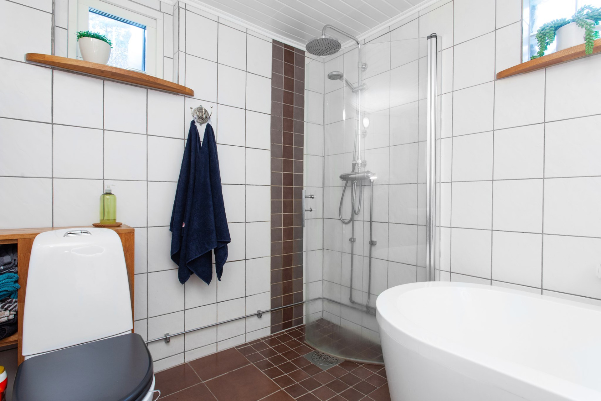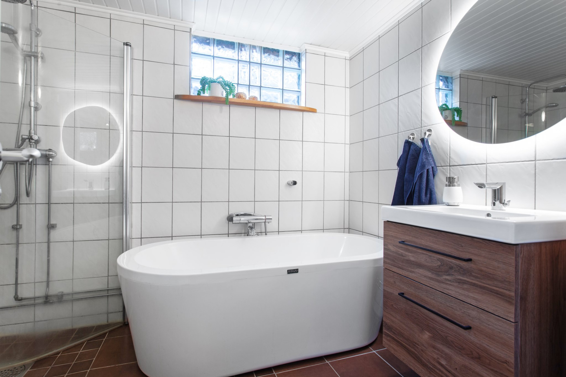 Ett ljust, rymligt och helkaklat badrum med klinkers och golvvärme. Två fönster, varav det ena i betong-glas, ger ett behagligt ljusinsläpp. Här finns både ett ovalt badkar, dusch-hörna, wc, handfat i kommod, rund spegel med belysning bakom och skåp för förvaring.