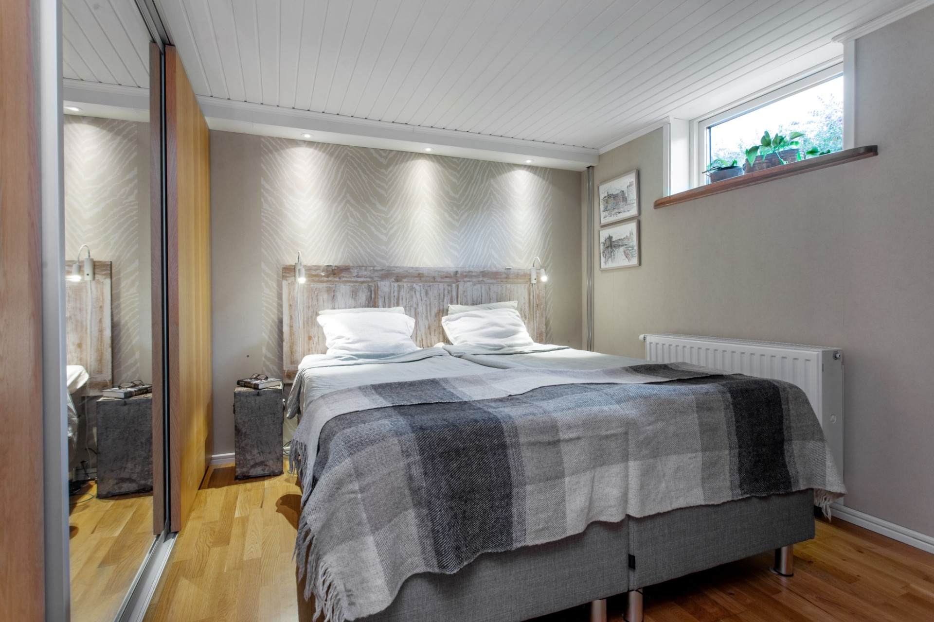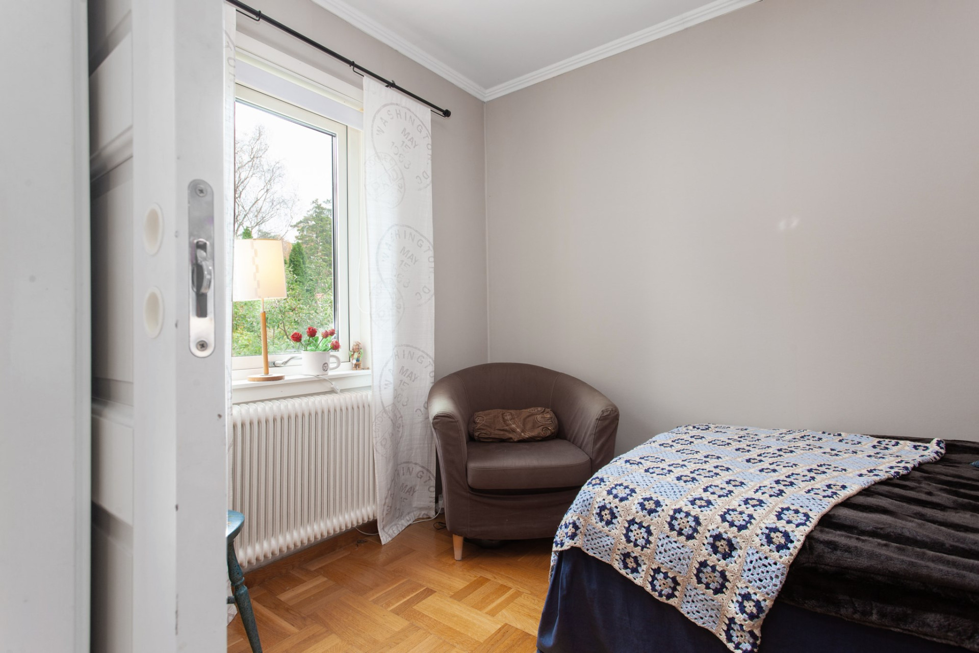 Till vänster om hallen ligger detta rogivande sovrum med fönster ut mot trädgården. På golvet ligger mönstrad ekparkett och väggarna går i en jordnära ton.