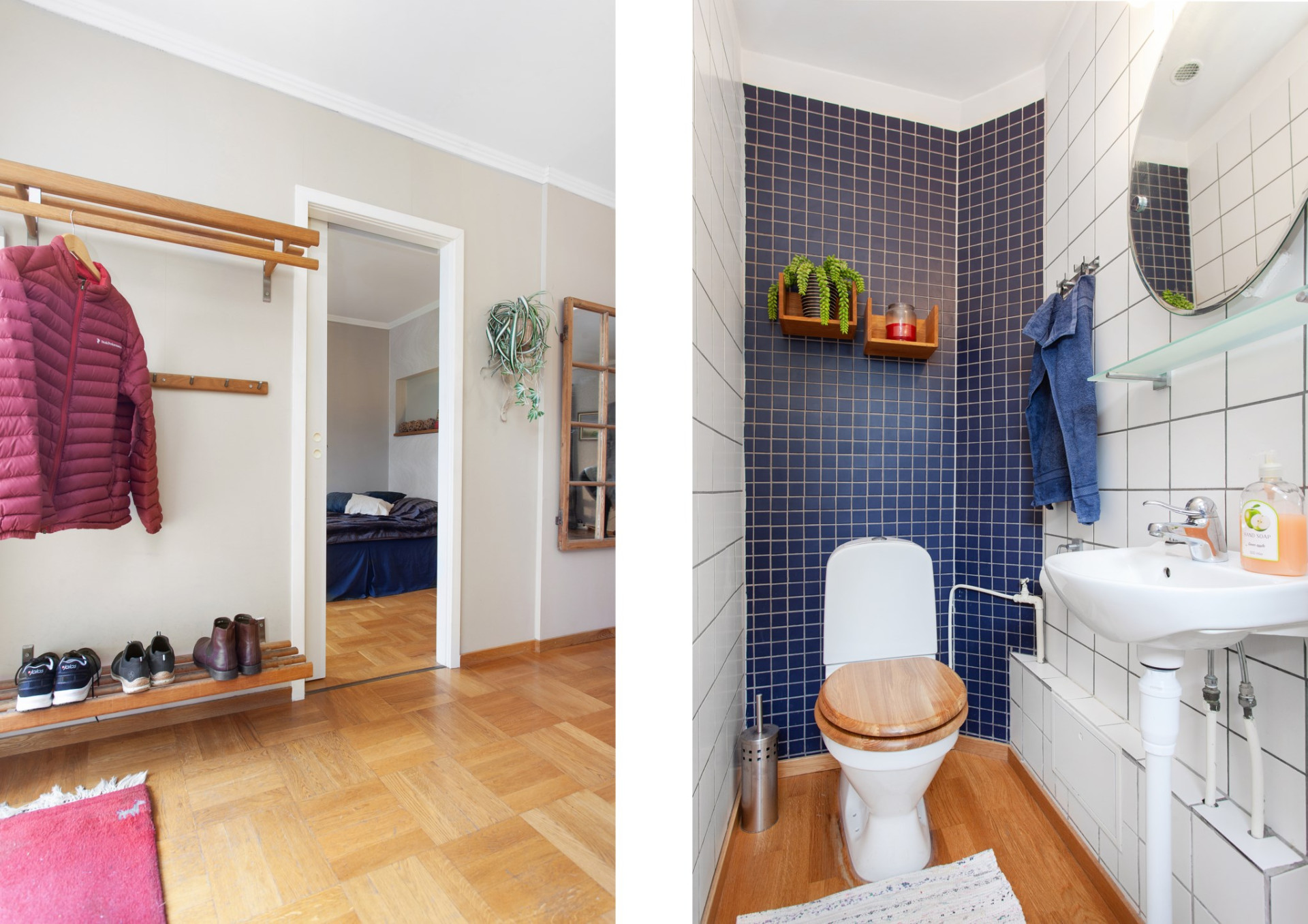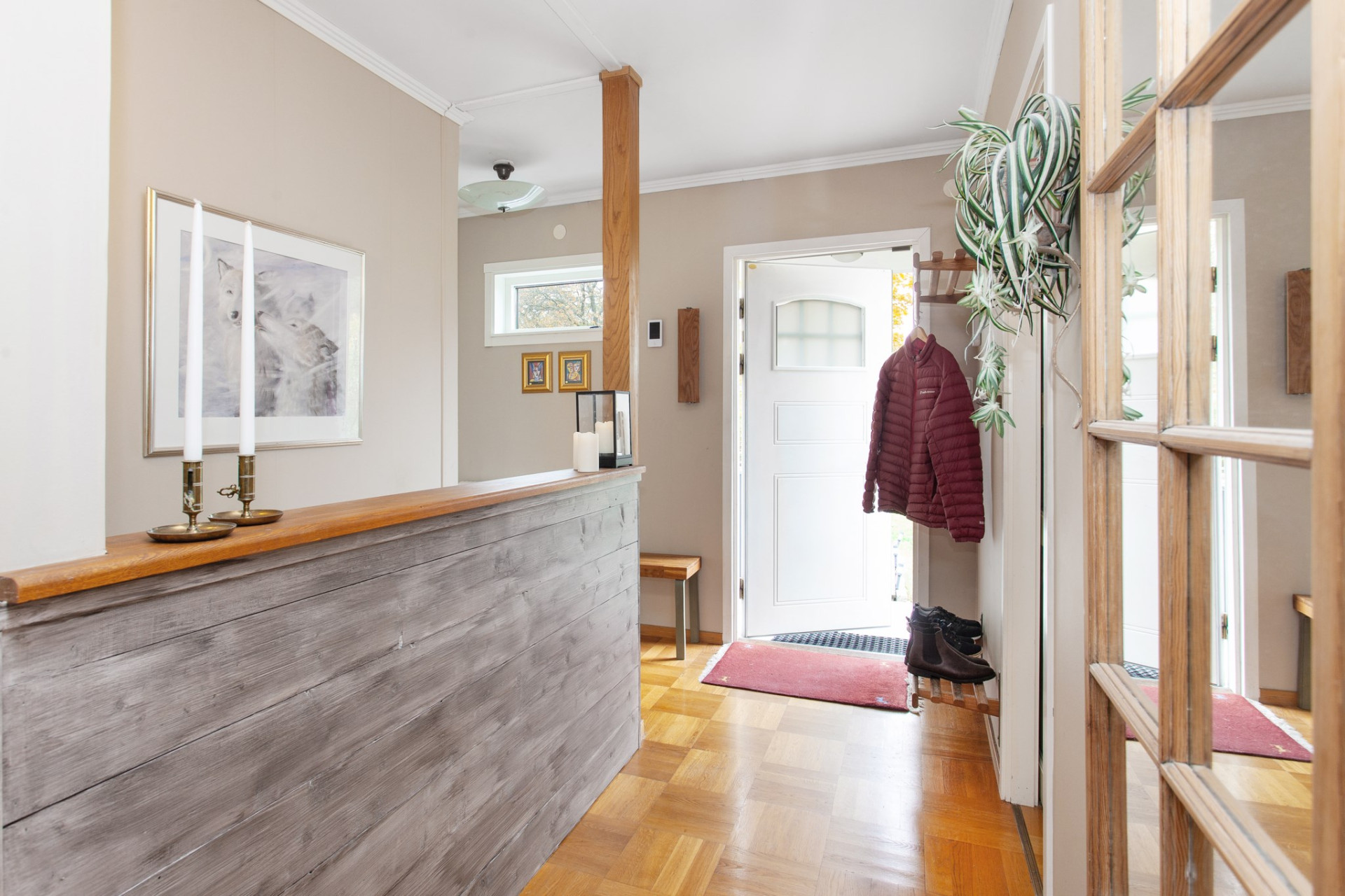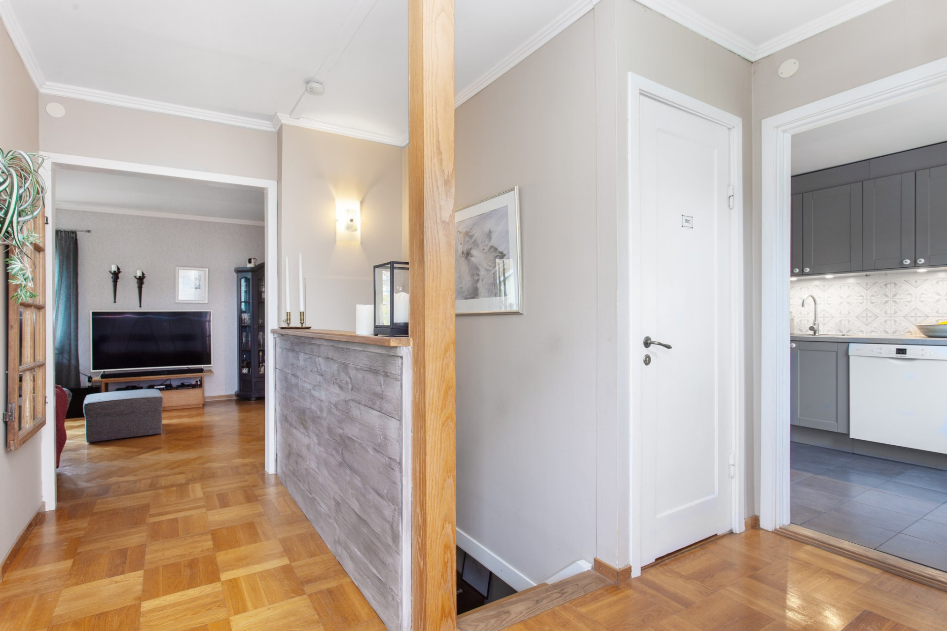 Ljus och välkomnande hall där du möts av vardagsrummets generösa ljusinsläpp. Till vänster finns en naturlig avhängningsdel och väggen mot källartrappan har delvist tagits bort för extra rymd och ljus. På golvet ligger mönstrad och vacker ekparkett, väggarna är ljusa. Hallen ansluter till ett sovrum, WC-rum, vardagsrum och kök.