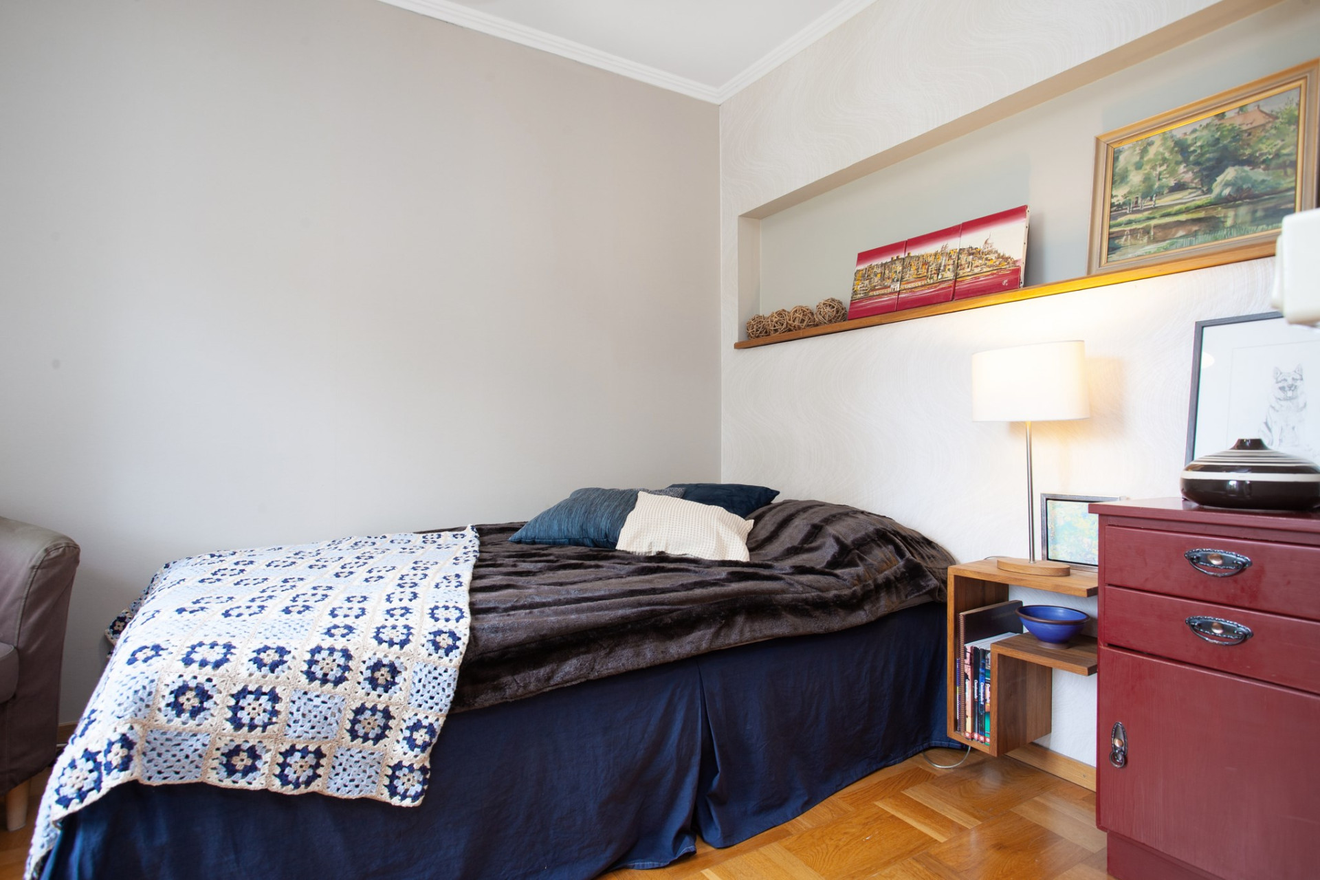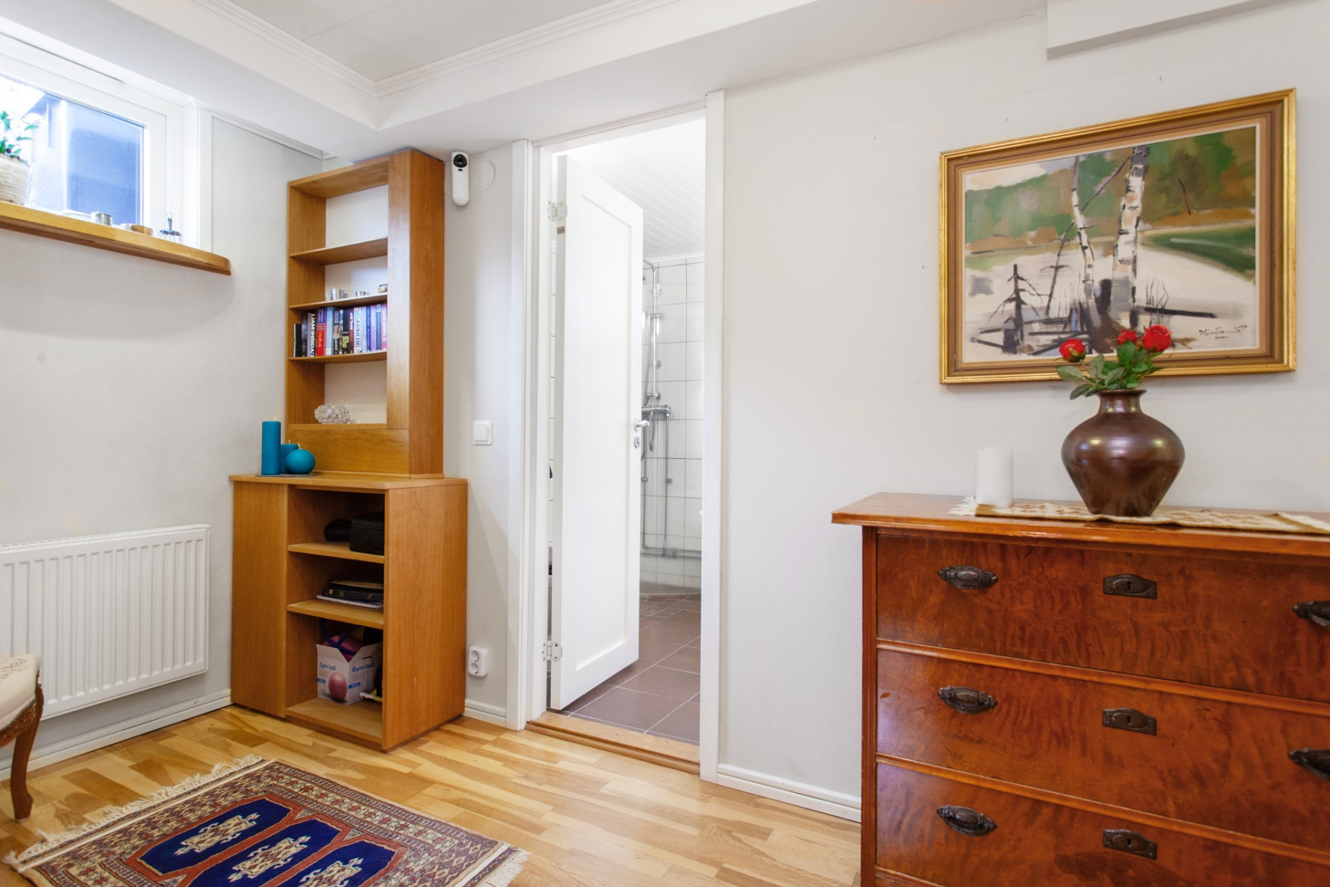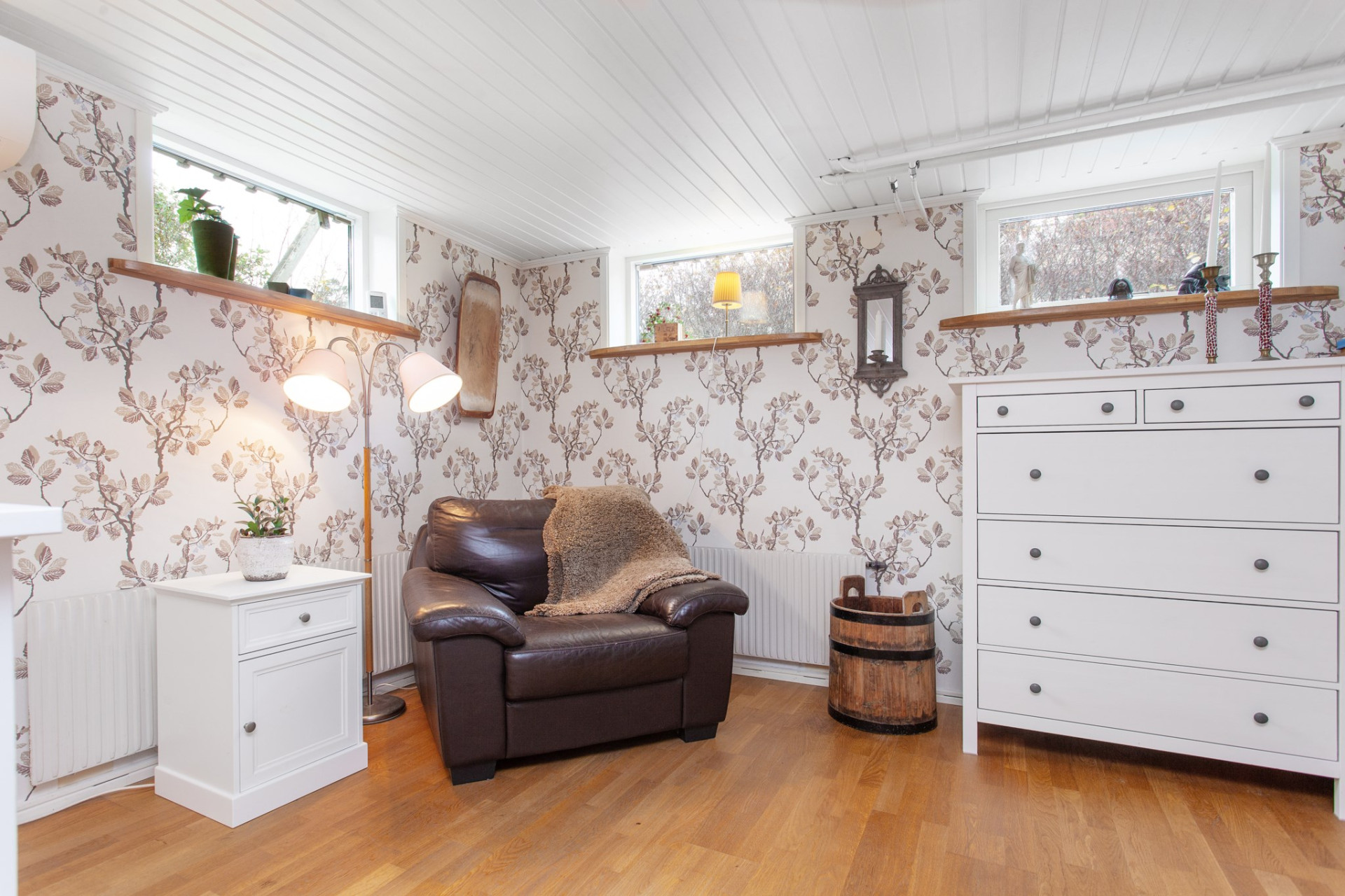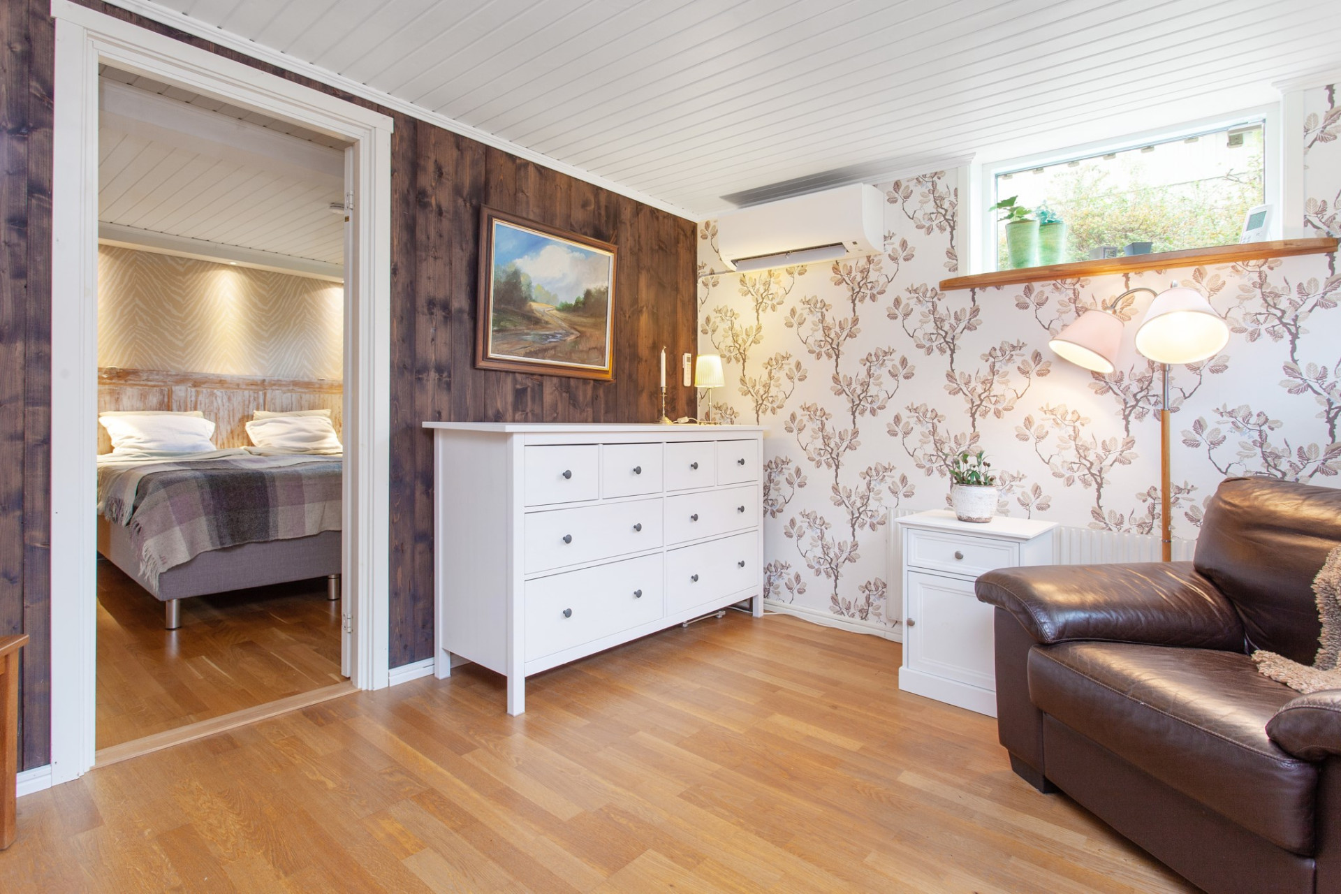 Till vänster om hallen ligger ett ett bra allrum alternativt sovrum med tre fönster i två väderstreck. På golvet ligger parkett, väggarna är mönstrade och i taket sitter vitmålad panel. Rummet ansluter vidare in till ett rogivande sovrum.