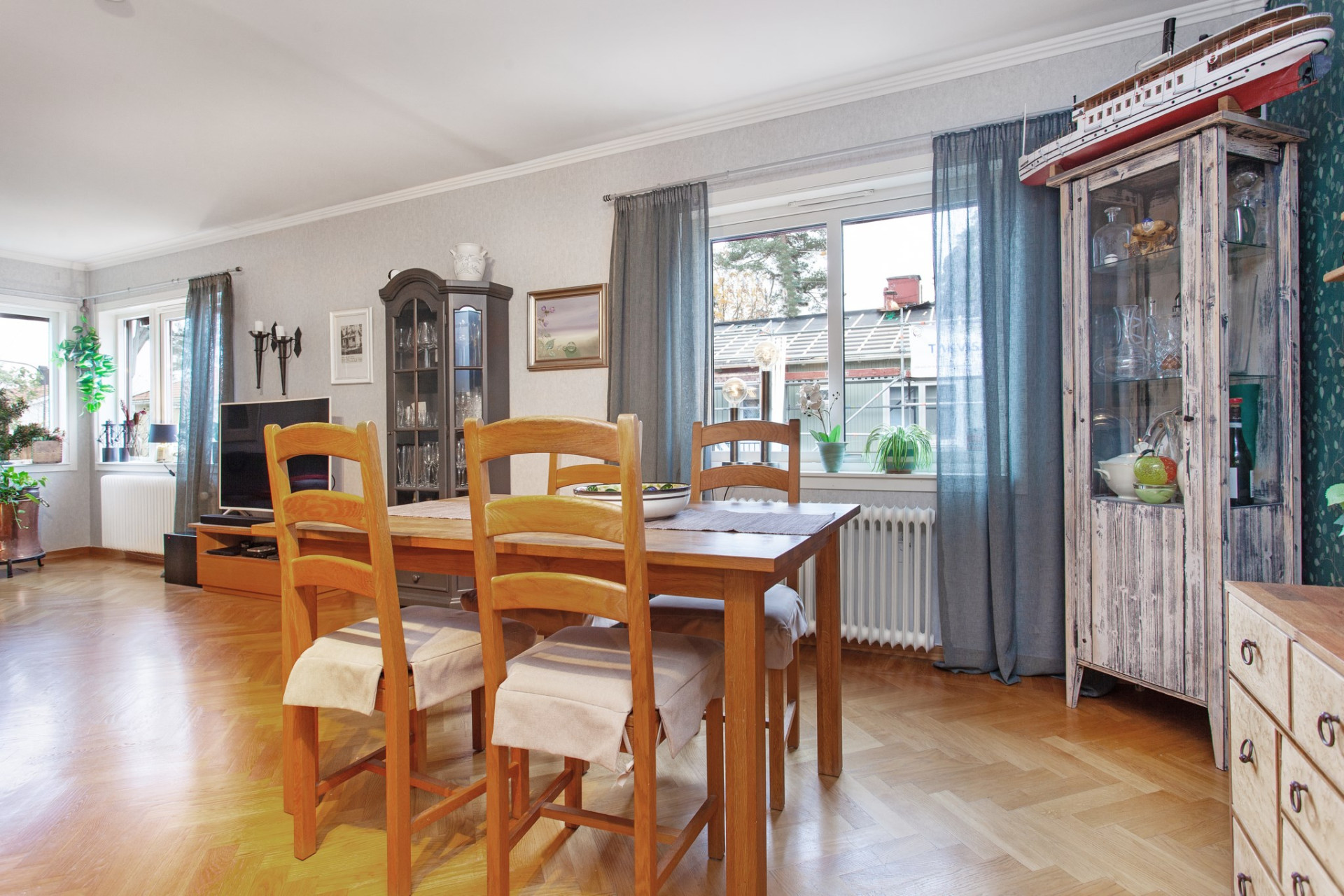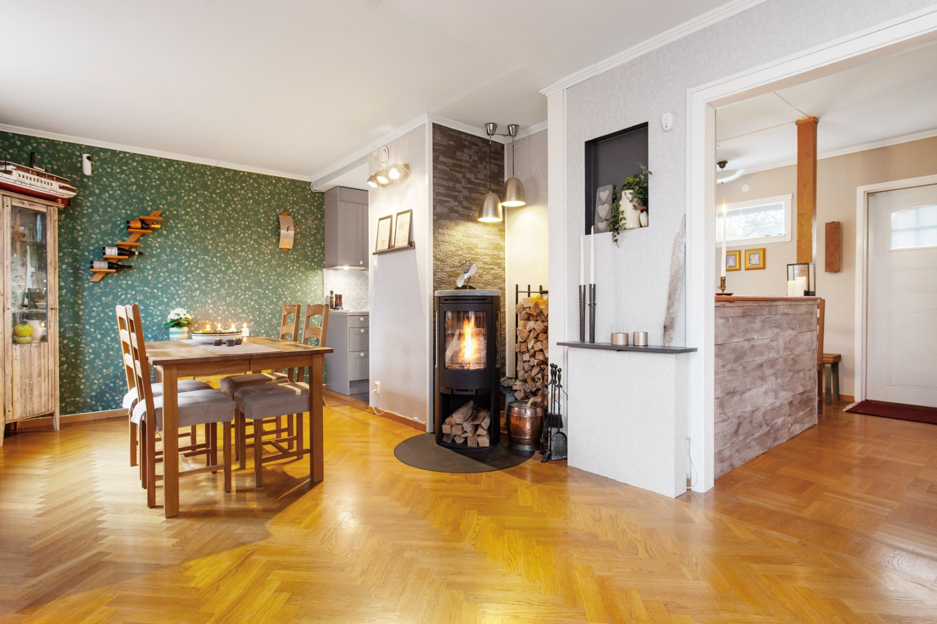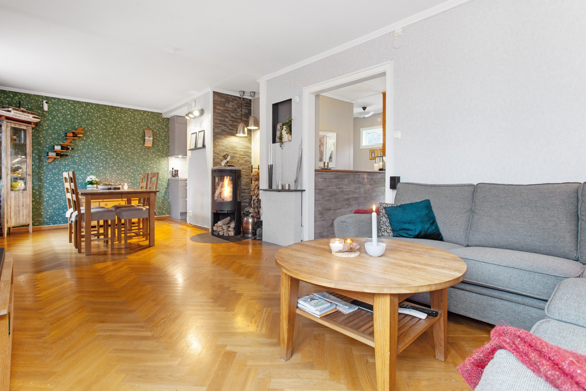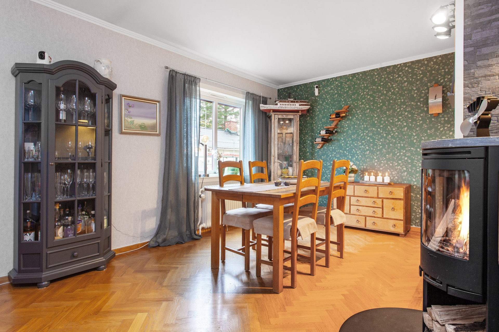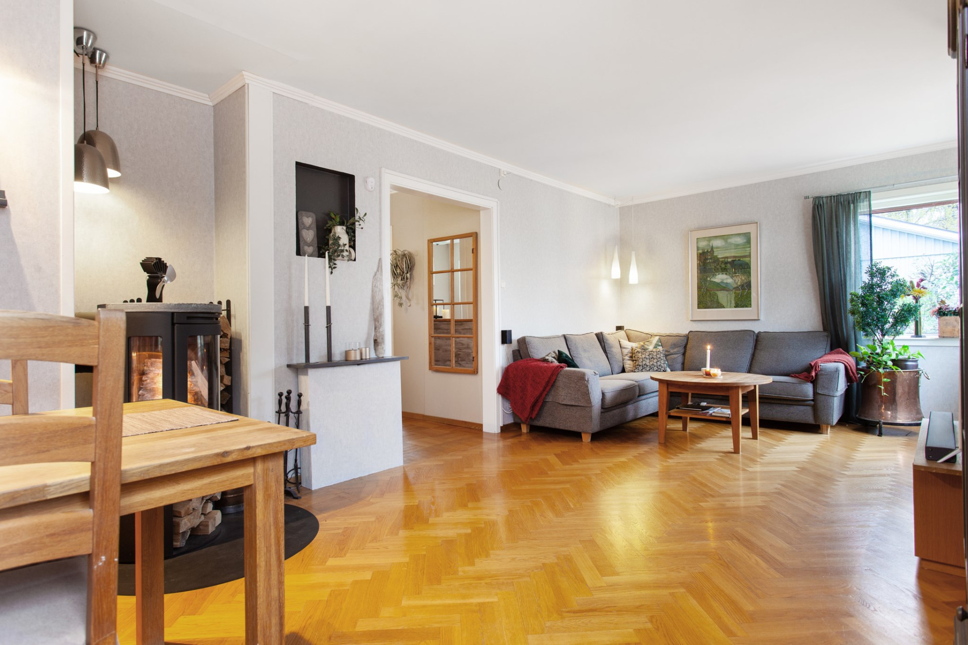 Ett härligt ljust och trivsamt rum med flera fönster ut mot gatan, även i vinkel. På golvet ligger vacker, fiskbensmönstrad ekparkett och väggarna är ljusa. Rummet ligger i öppen planlösning mot matrums-delen, vilket skapar extra rymd och ljus. Centralt placerad mellan rummen finns en stämningsfull och värmande braskamin! Matrumsdelen ligger också trivsamt öppet och praktiskt intill matplatsen.
