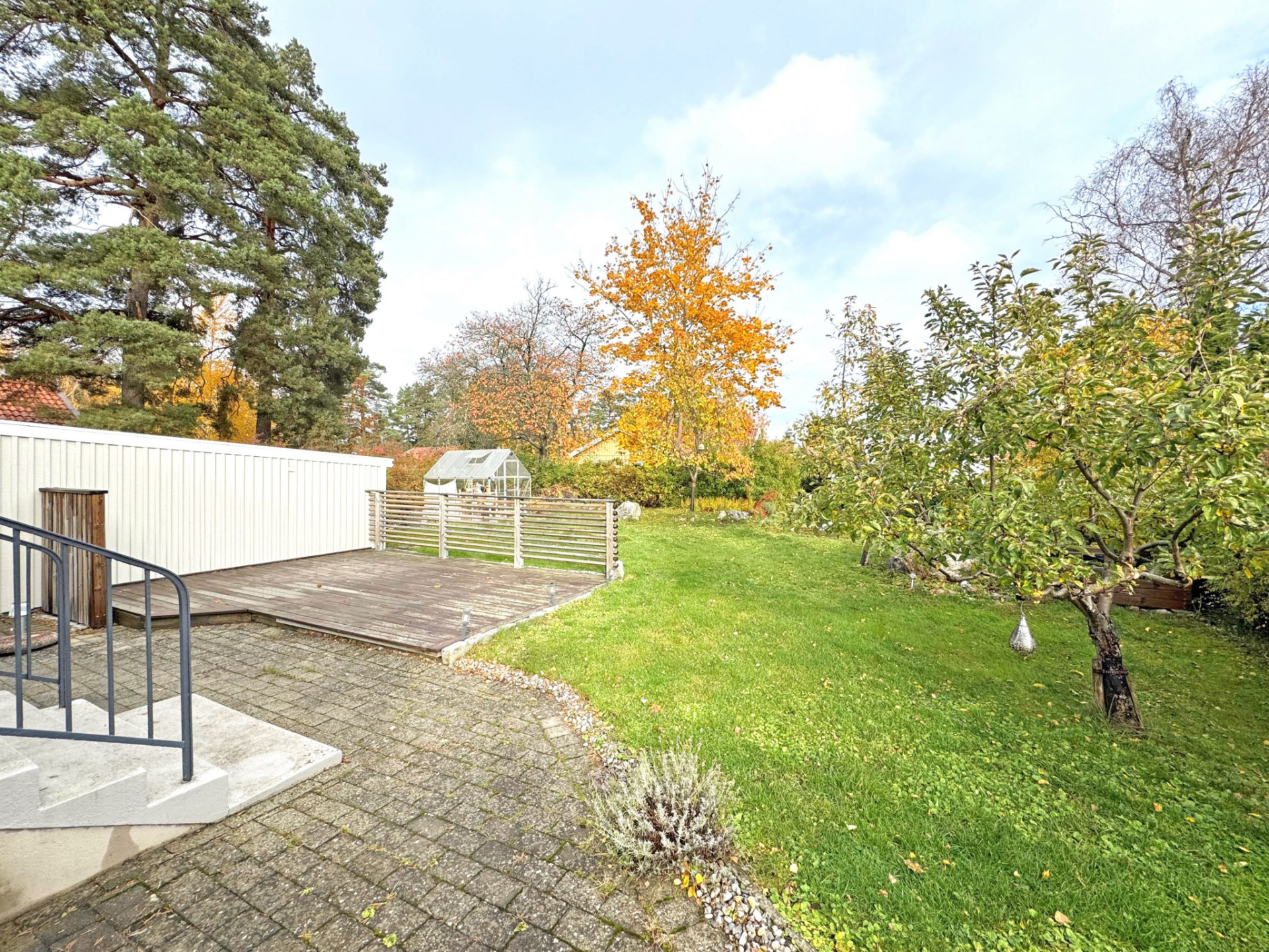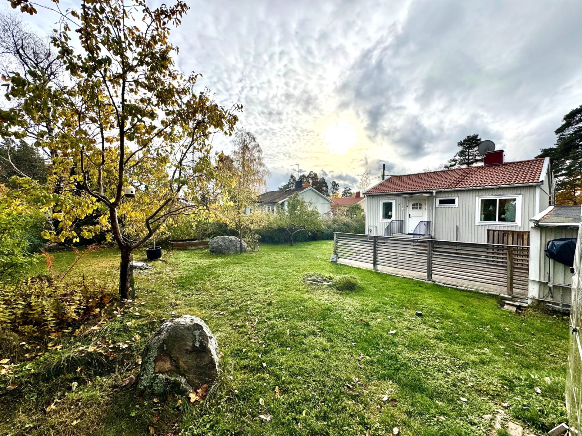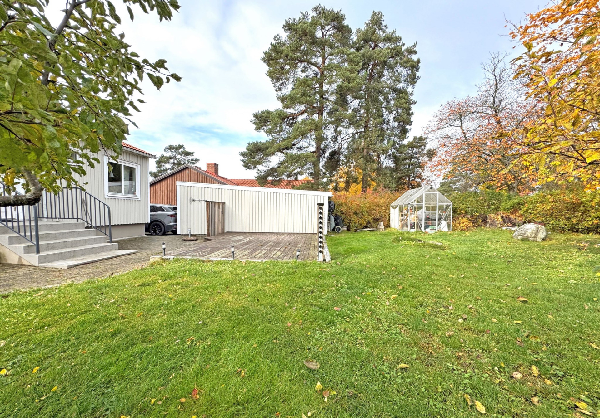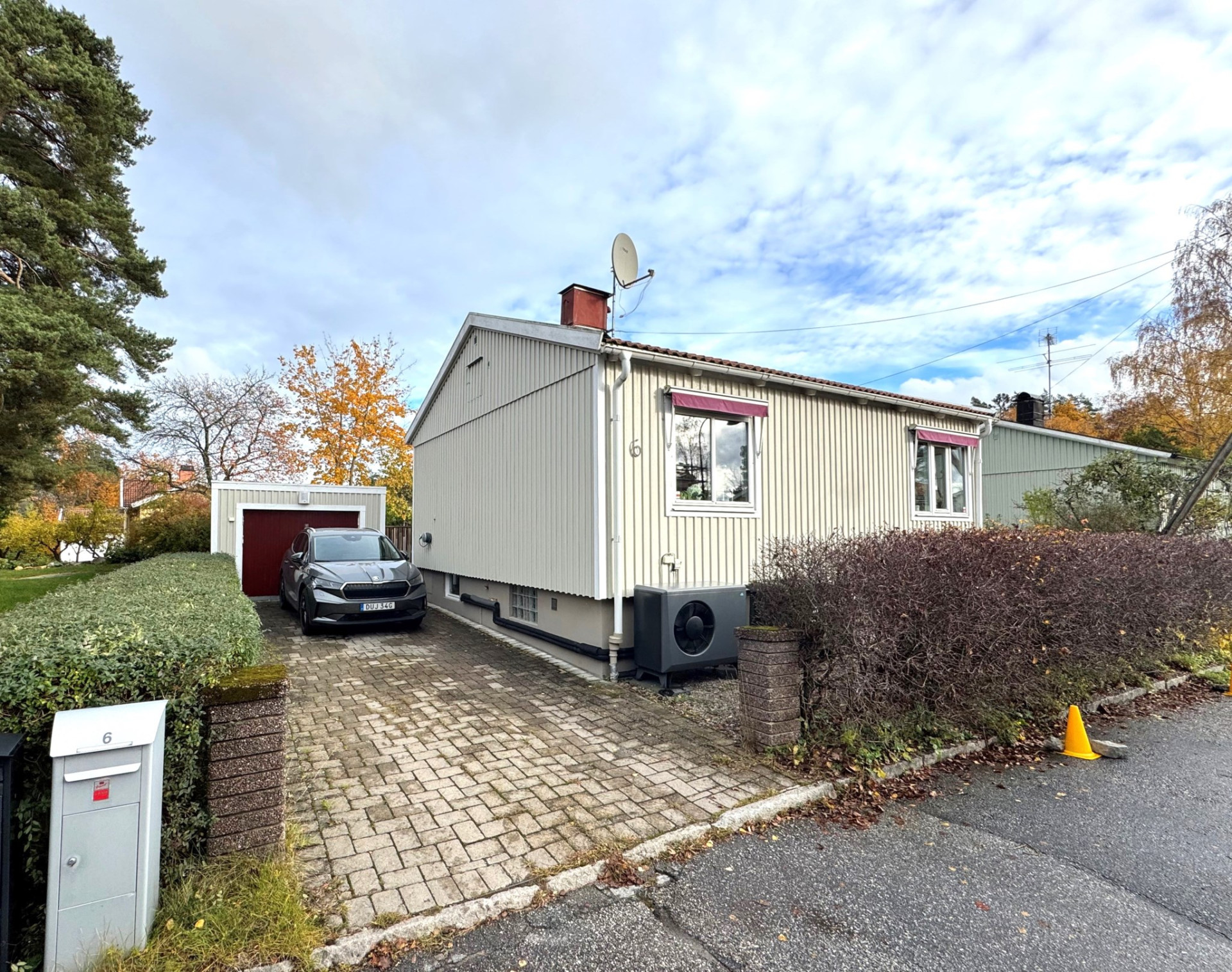 Utanför väntar en lummig och under sommartid, insynsskyddad trädgårdstomt, omsorgsfullt anlagd med grönska och uteplats för härliga grillkvällar och avkoppling i solen. Garage finns bekvämt på tomten och elbils-laddare sitter invid den rymliga och markstensbelagda p-platsen.