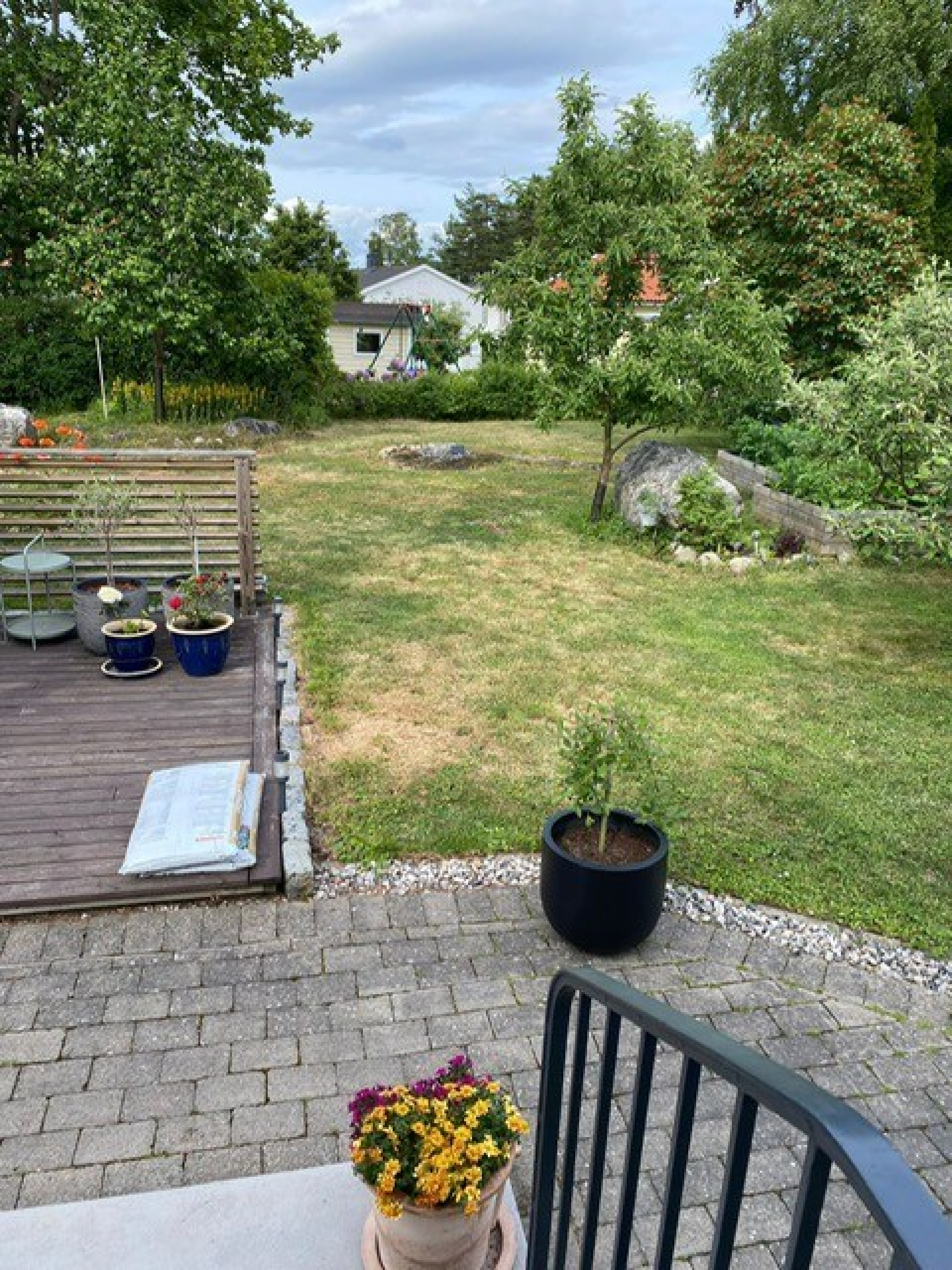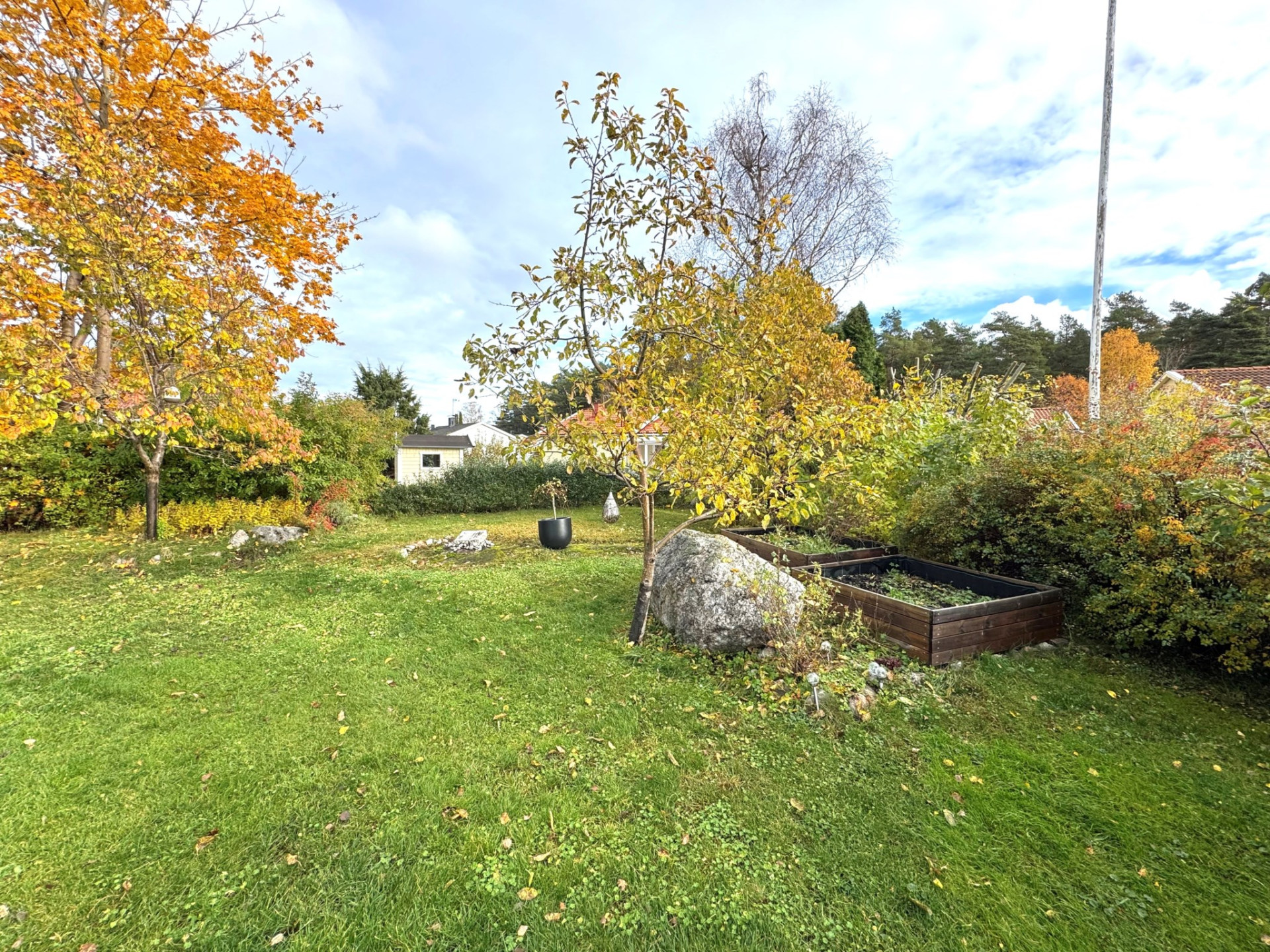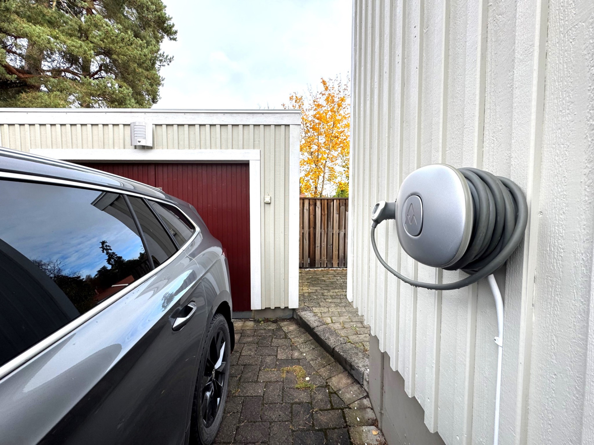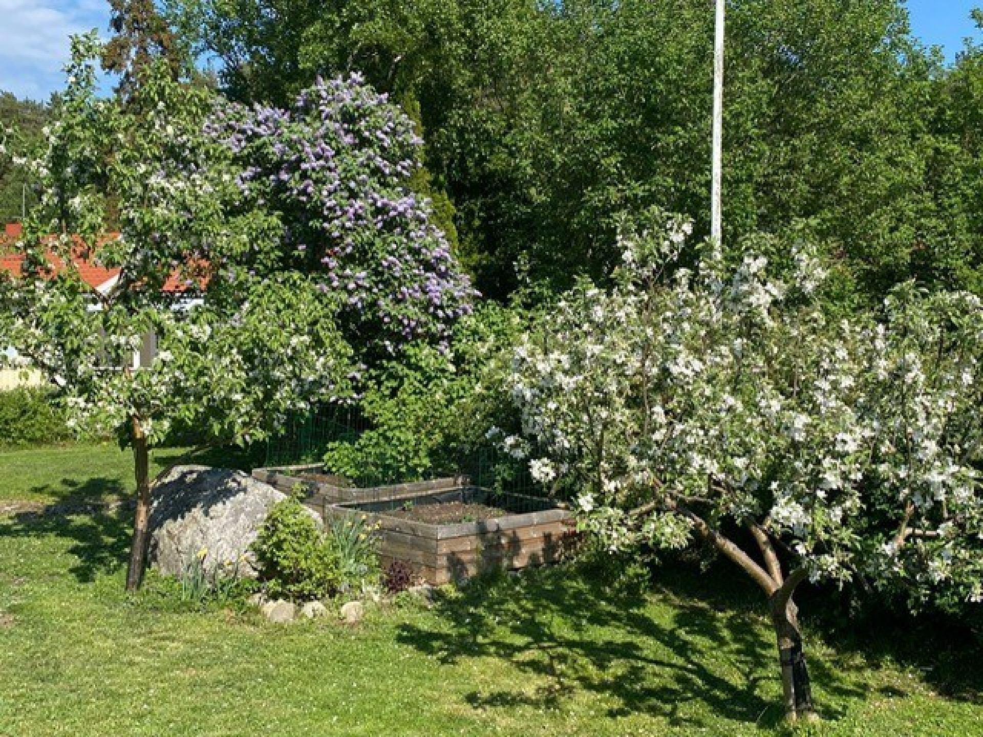 Utanför väntar en lummig och under sommartid, insynsskyddad trädgårdstomt, omsorgsfullt anlagd med grönska och uteplats för härliga grillkvällar och avkoppling i solen. Garage finns bekvämt på tomten och elbils-laddare sitter invid den rymliga och markstensbelagda p-platsen.