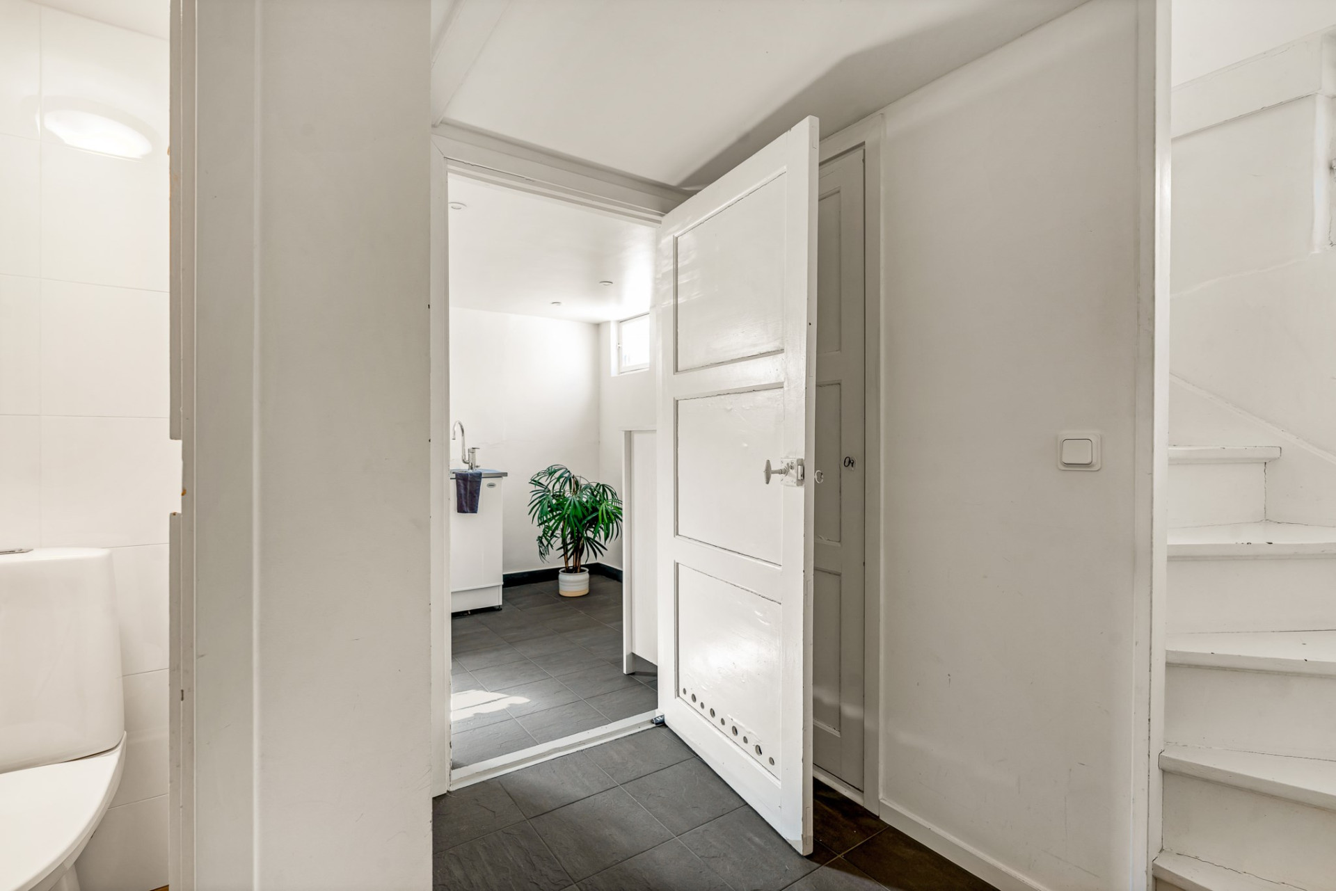 Från badrummet når du vidare in till våningens hall som ansluter till tvättstugan, ett separat WC-rum och bra förråd som kan disponeras efter behov. Från hallen leder även trappan upp till entréplanets sovrum.