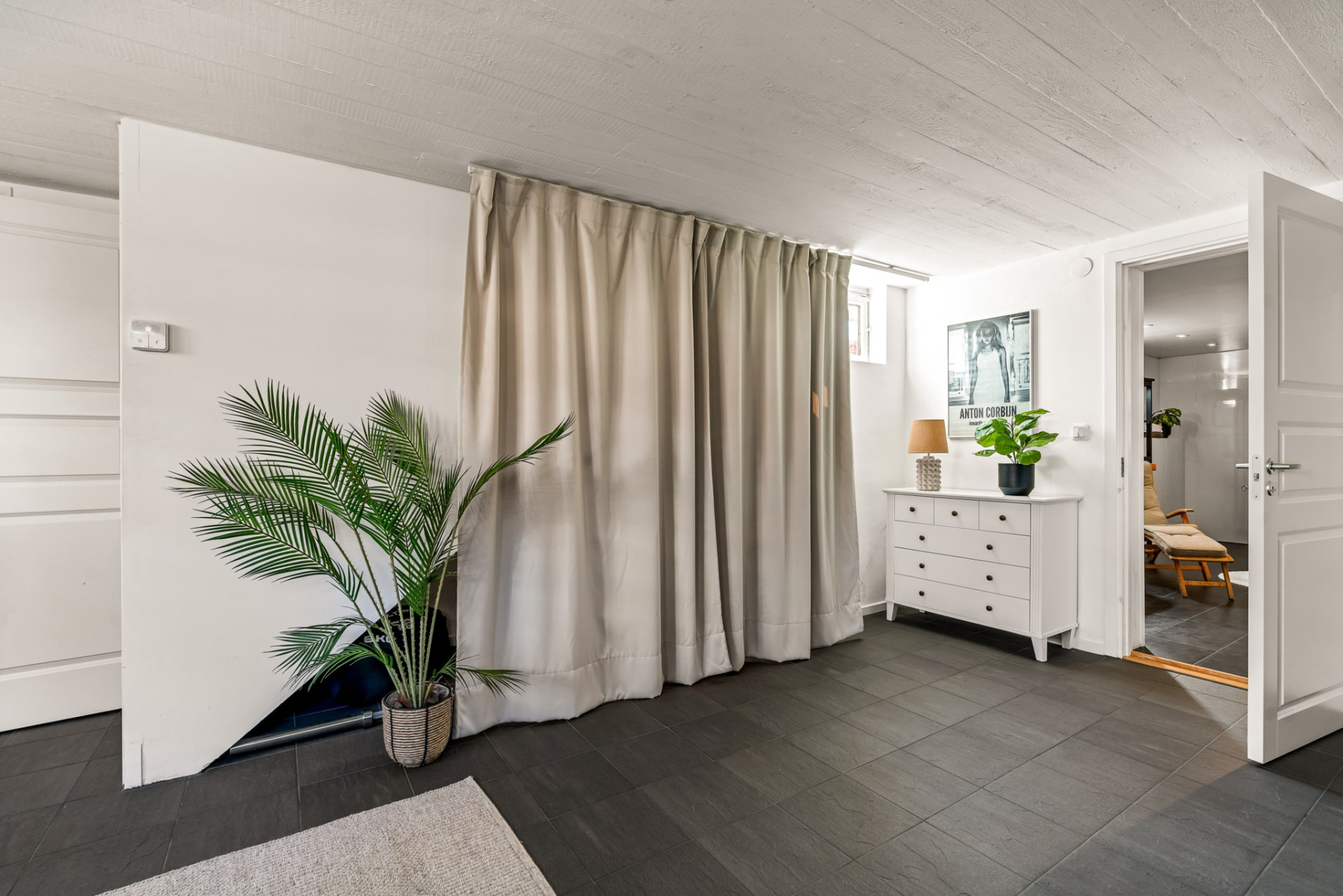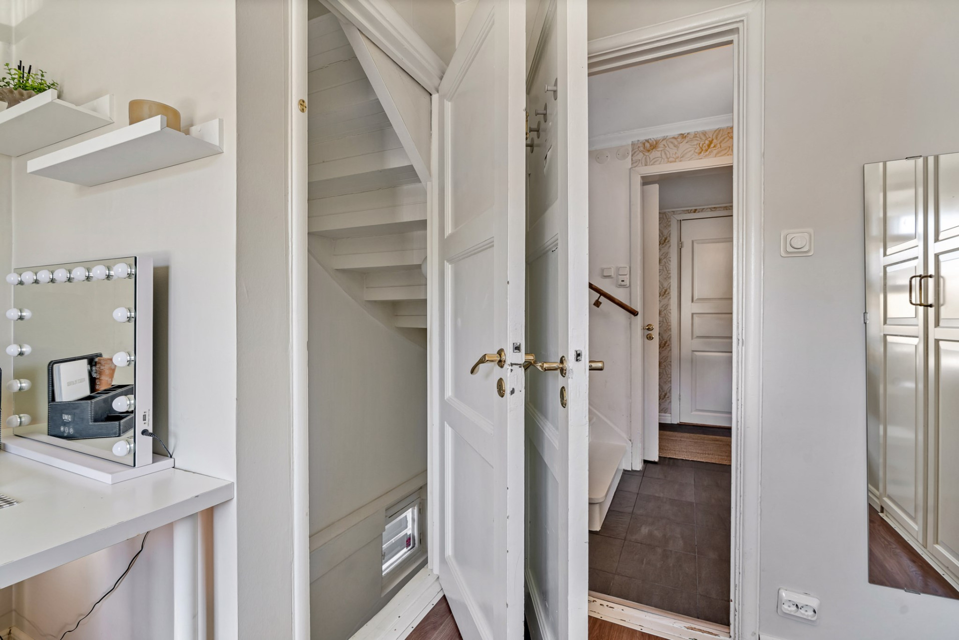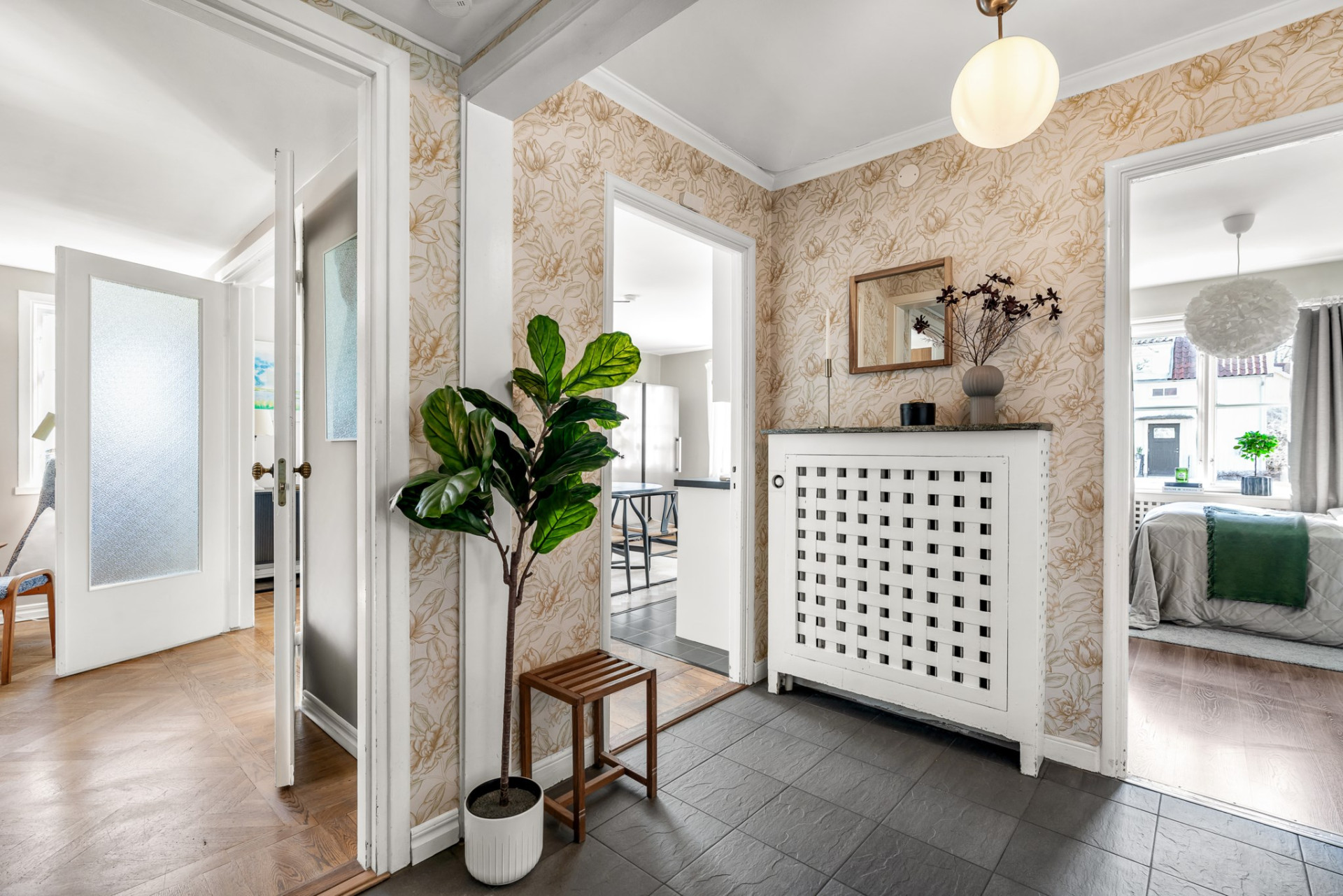 Hallen leder vidare in till våningens sovrum.