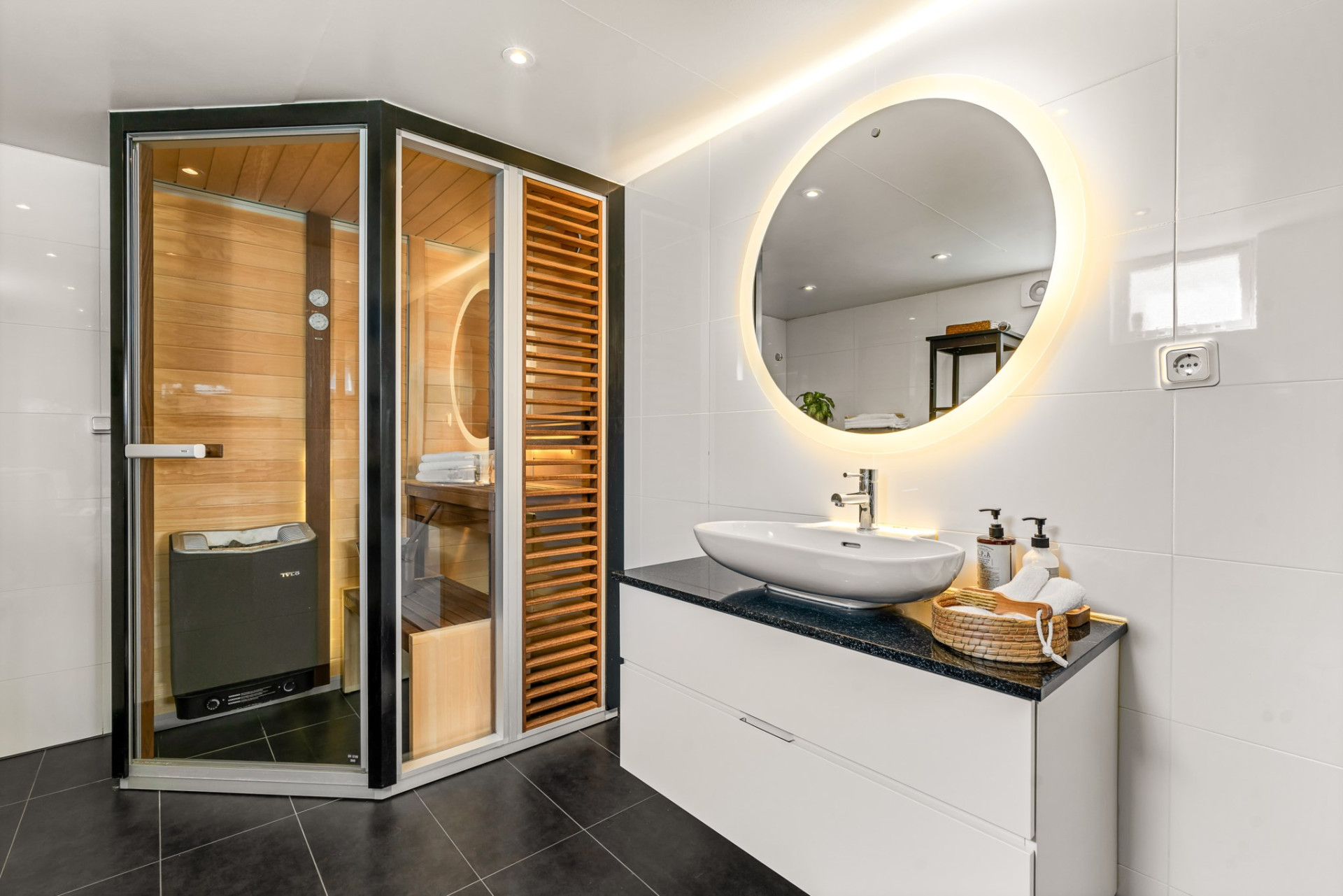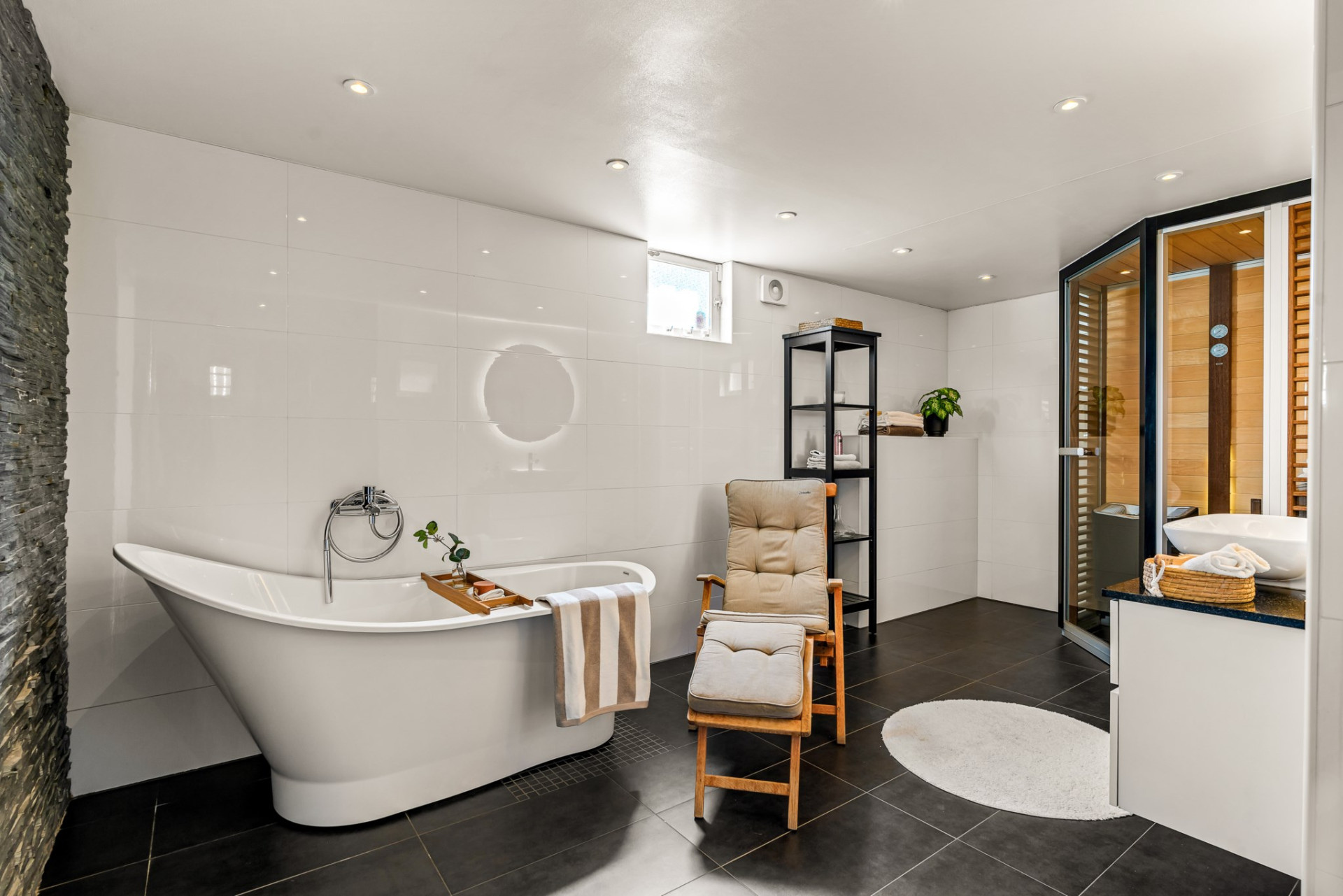 Rymligt och smakfullt helkaklat badrum med klinkergolv, vattenburen golvvärme och stilrena materialval som skapar hög komfort. Här finns ett stort och elegant badkar, handduks-tork samt en tvåmanna-bastu med glasväggar och dörr. Perfekt för avkoppling och spa-känsla hemma!