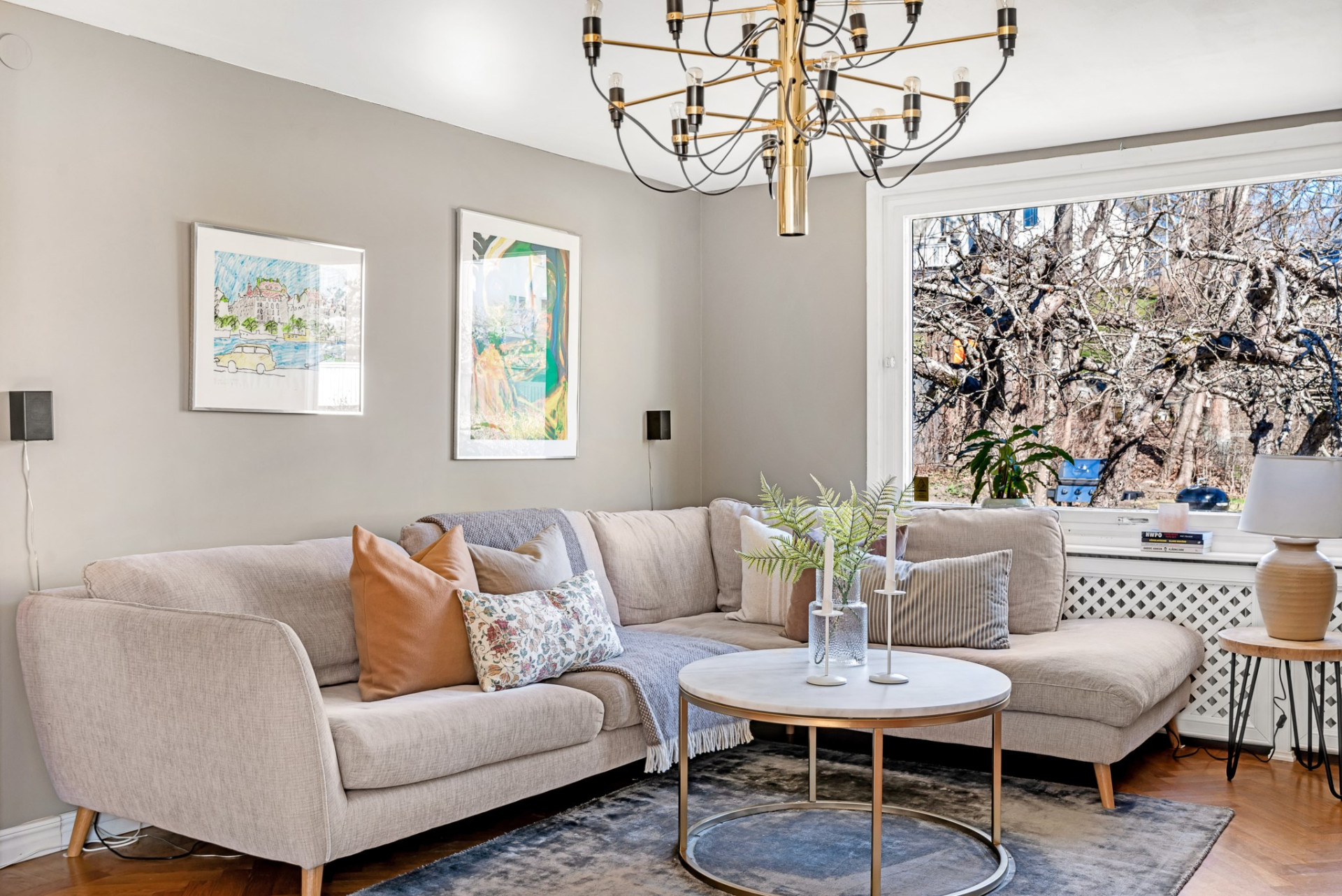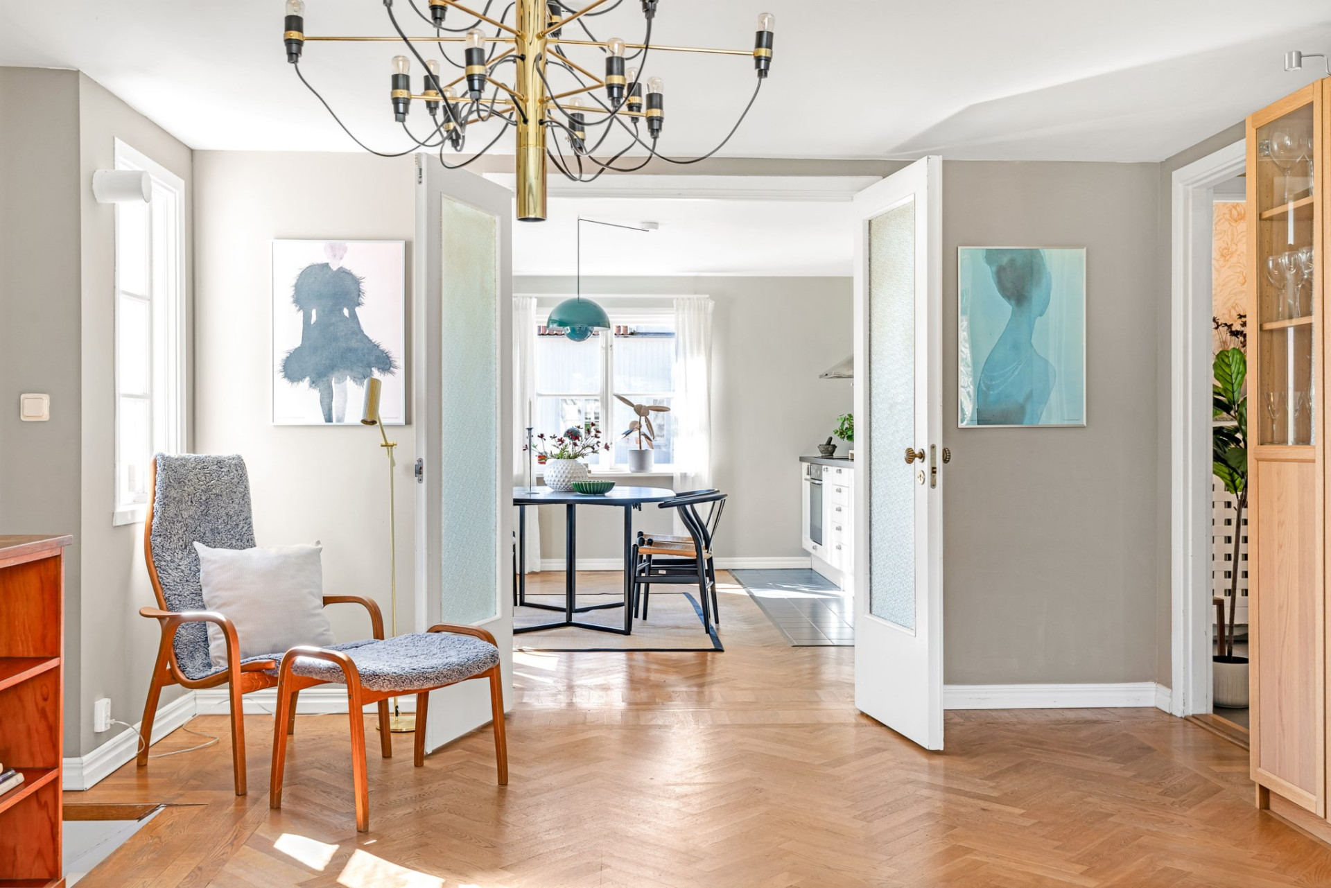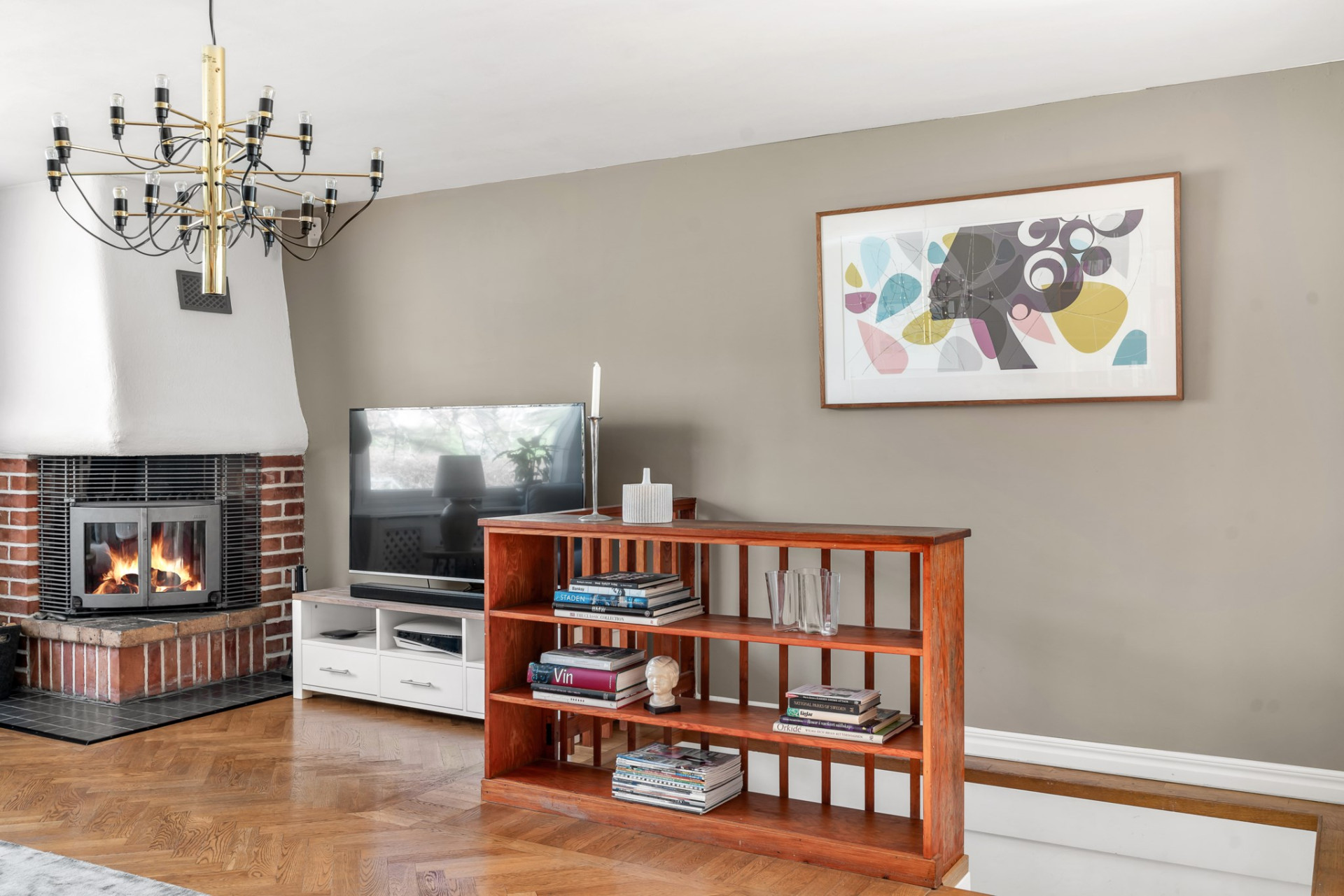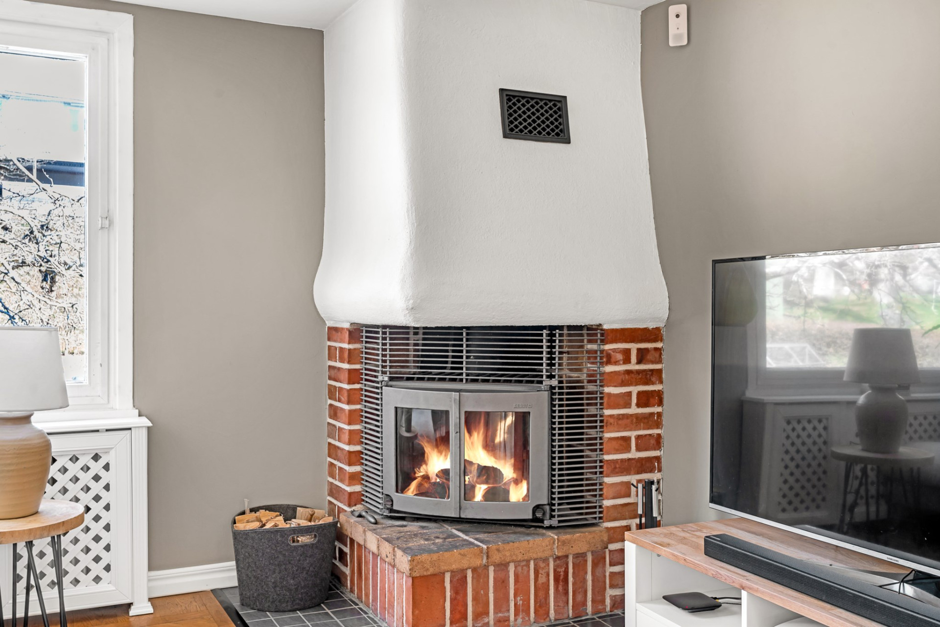 Från hallen kliver du in i ett ljust och tillbyggt vardagsrum med fönster i två väderstreck, vilket ger ett fantastiskt ljusinsläpp. Det riktigt stora fönstret vetter ut mot trädgården och fungerar som en levande tavla som skiftar med årstiderna. I rummet finns en stämningsfull öppen spis med insatskassett som skapar både värme och atmosfär. På golvet ligger vacker fiskbens-parkett och härifrån leder även en trappa ned till källarvåningen. Dubbla dörrar med vackert glas öppnar upp mot det rymliga köket intill och skapar en social och öppen planlösning.