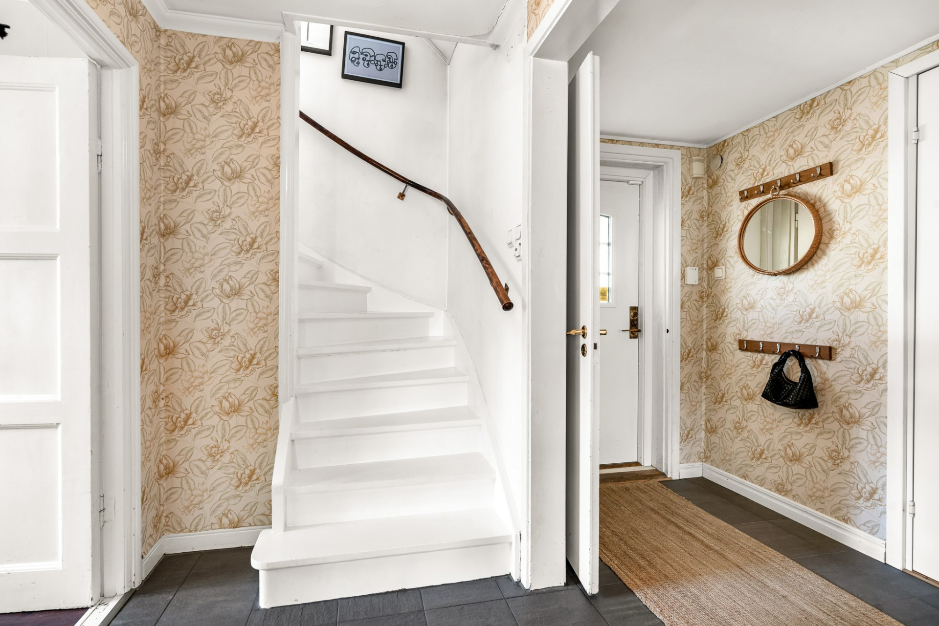 Välkomnande entréhall med klinkergolv och behaglig golvvärme. Härifrån nås samtliga rum på detta plan, såsom badrum, vardagsrum, kök och sovrum. Väggarna pryds av klassiskt ljusa tapeter som ger ett tidlöst och harmoniskt intryck.