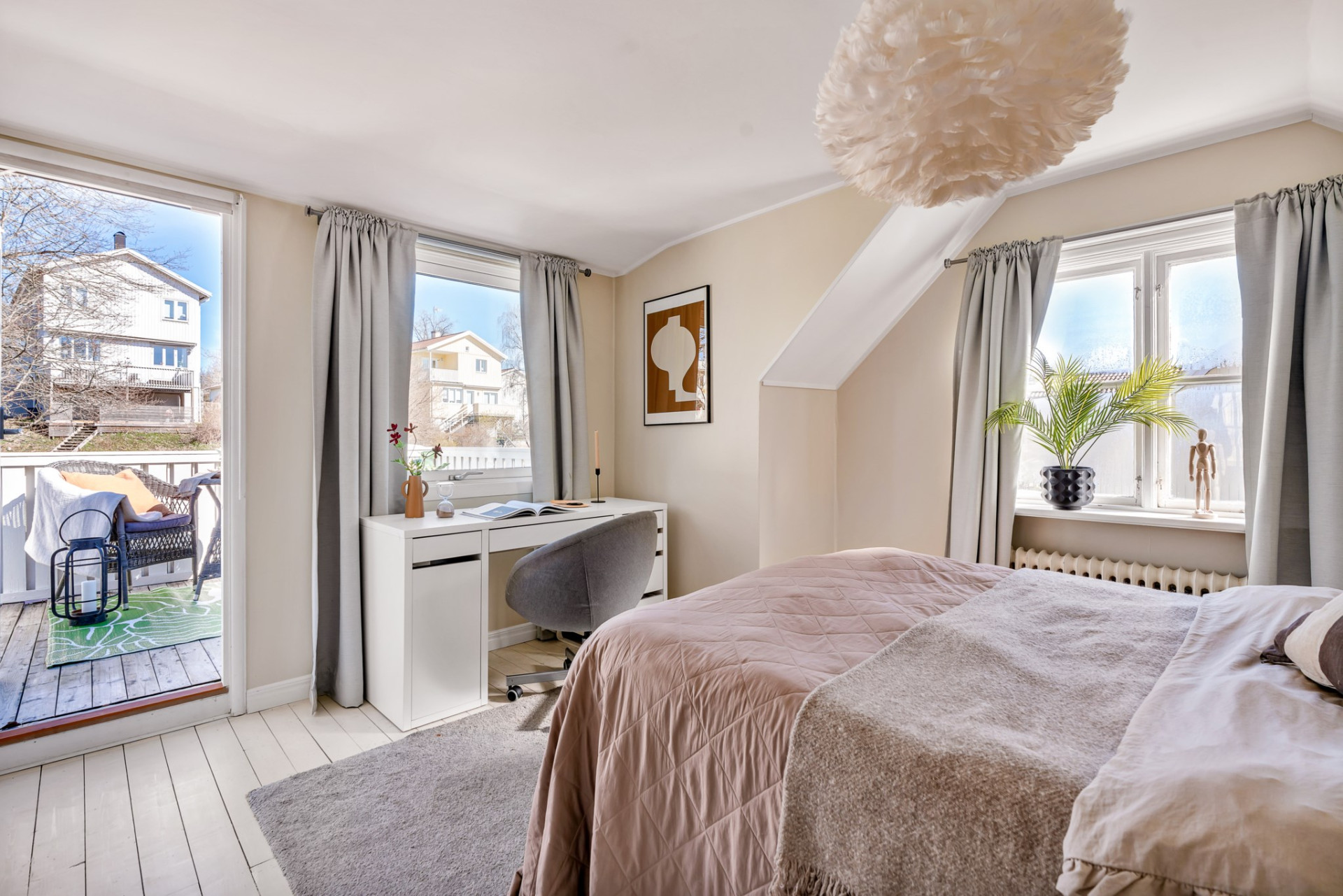 Ljust, harmoniskt och rogivande sovrum med generöst ljusinsläpp från flera fönster i två väderstreck. Härifrån nås en egen altan som bjuder på en fantastisk utsikt över trädgården och vidare ut över grannskapets tomter upp mot Hågavägen.