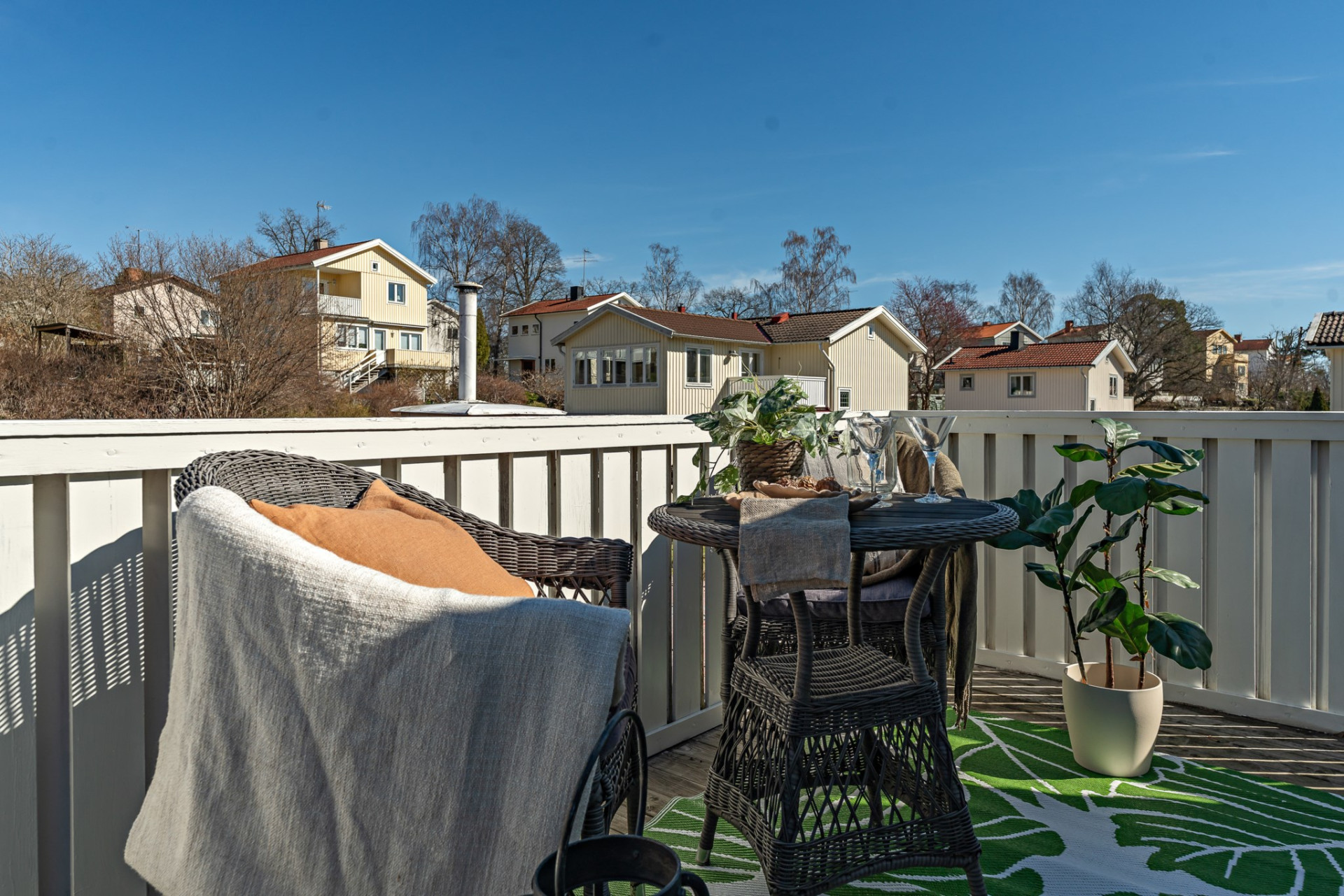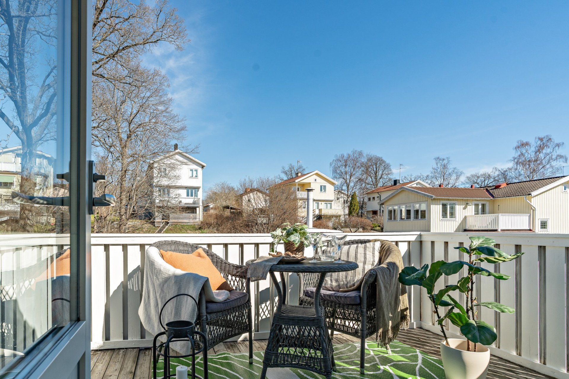 Den plana och lekvänliga trädgårdstomten, som är större än de flesta i området, blir en naturlig förlängning av bostaden under årets varmare månader. Här finns en tilltagen uteplats med utrymme för både lounge-grupp, matbord och grill för både måltider, avkoppling och sociala tillställningar. Tomtens storlek och utformning gör det såklart möjligt att skapa ytterligare uteplatser, odlingar eller lekytor efter önskemål.