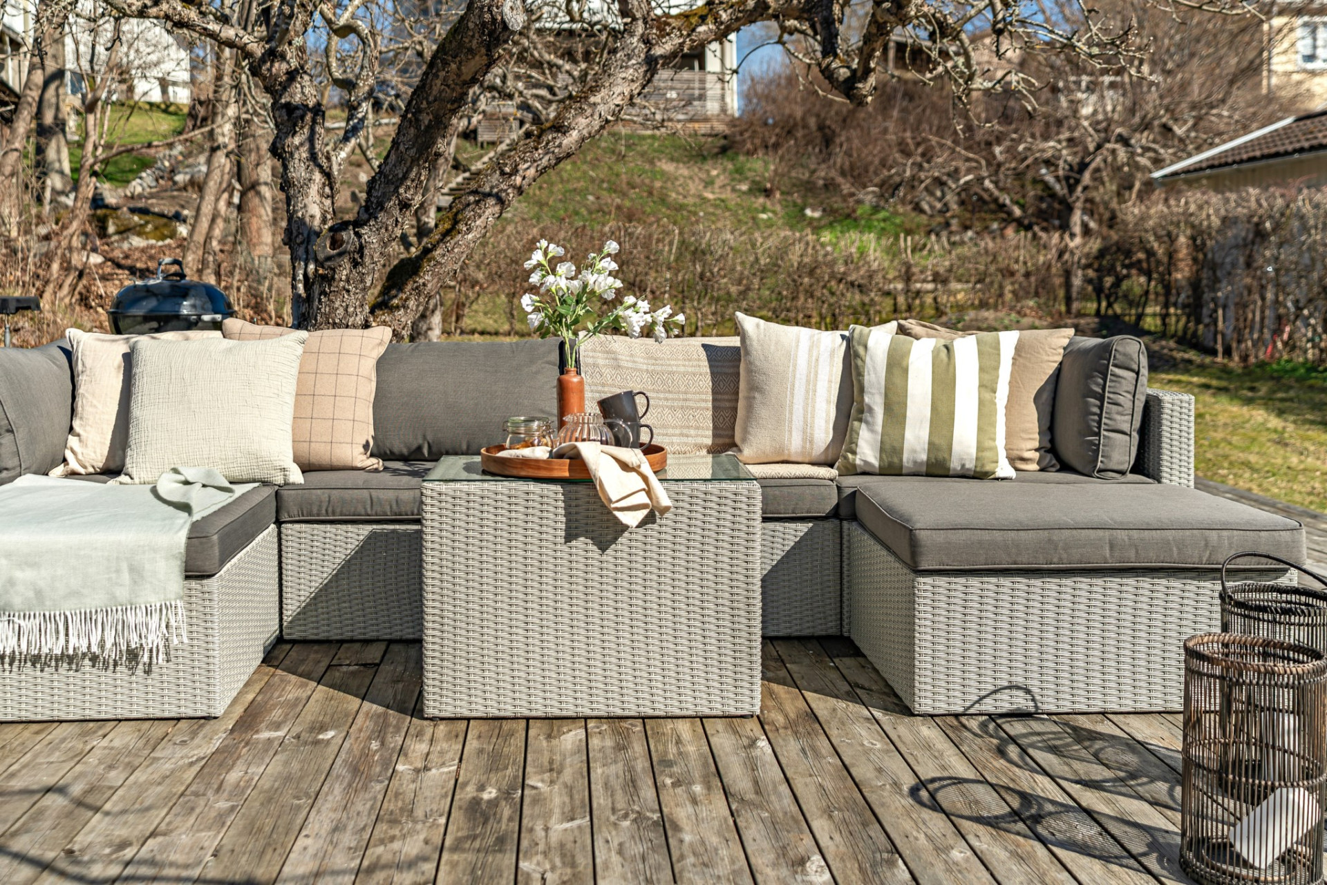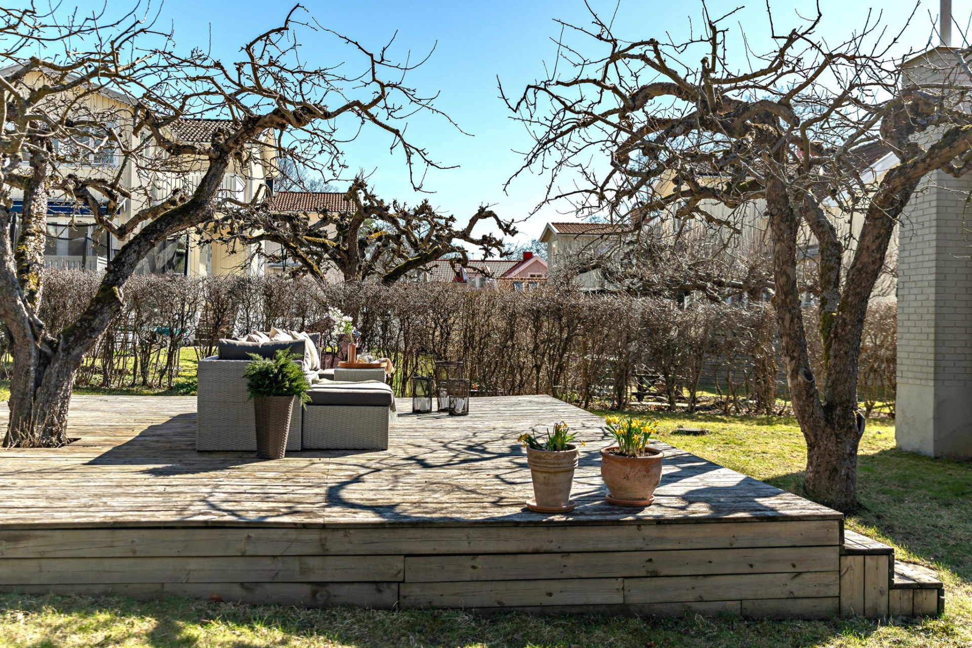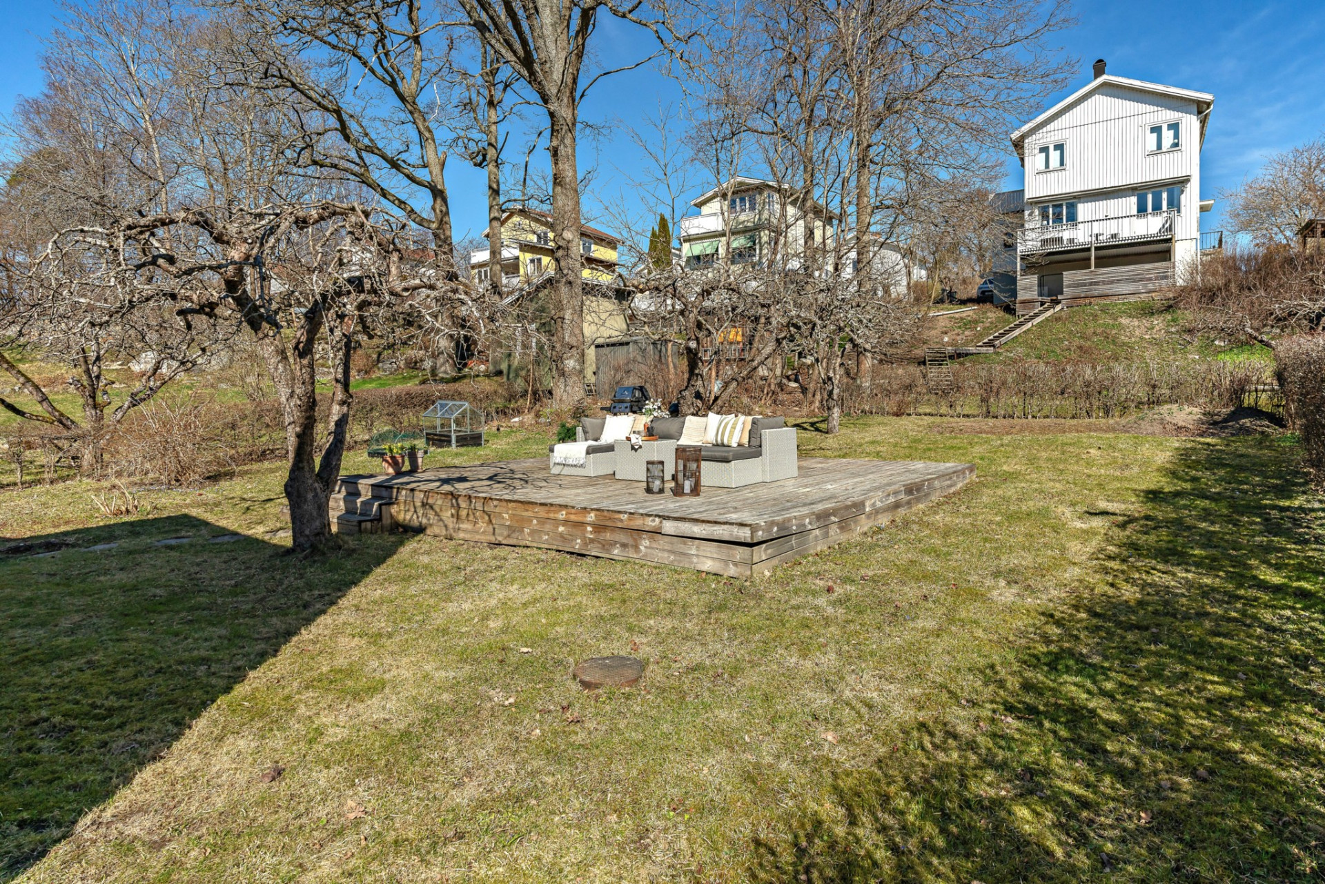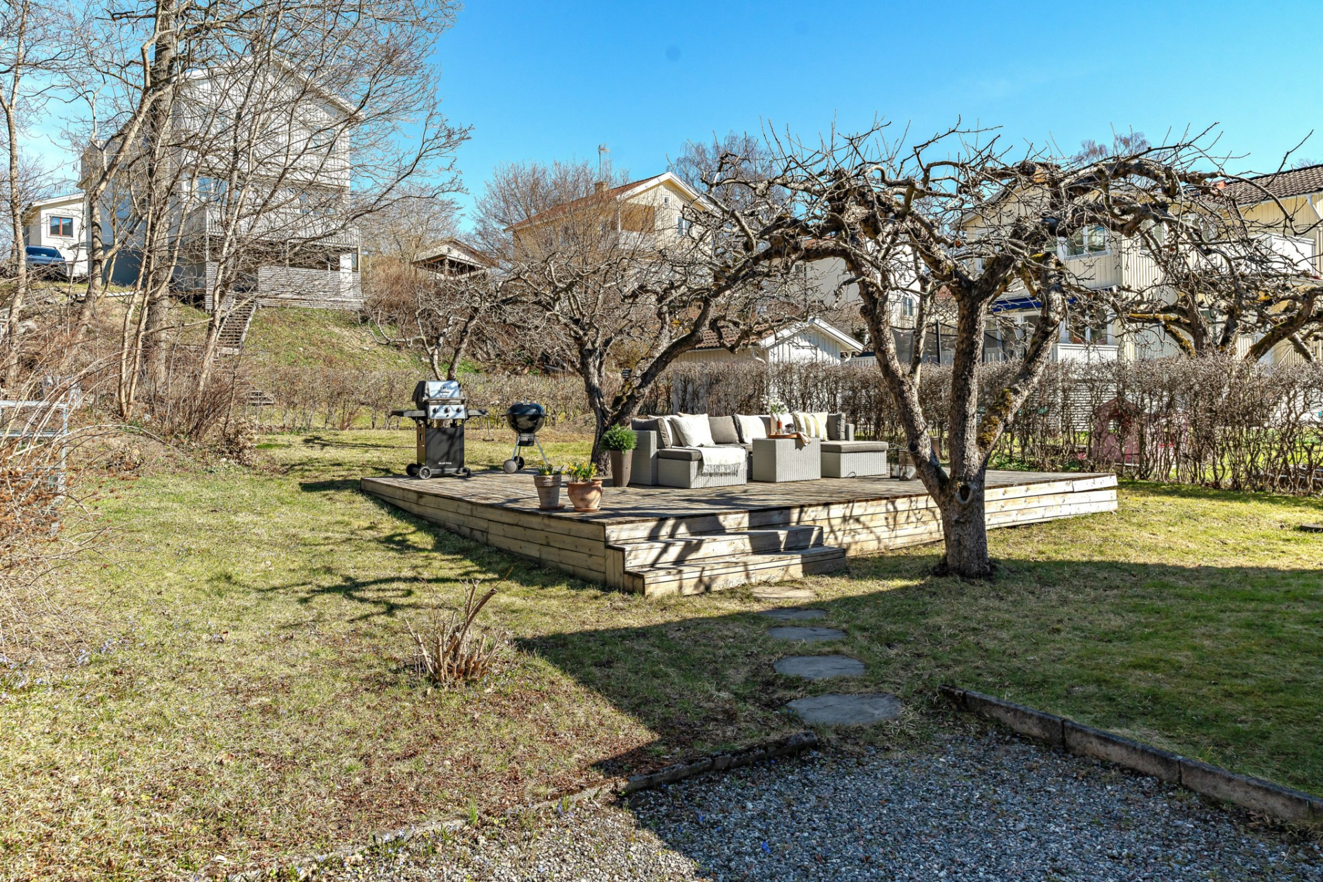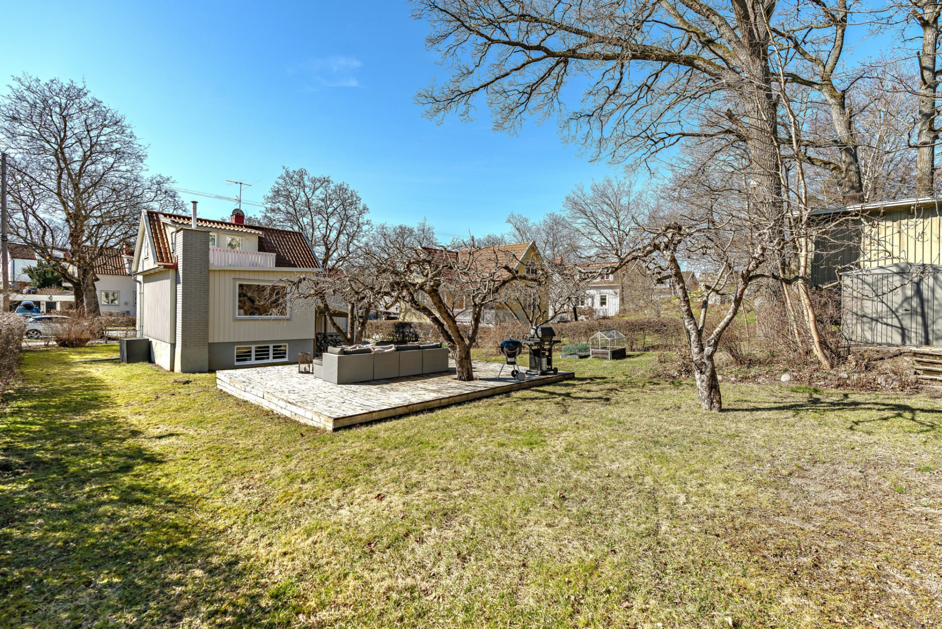 Den stora och plana trädgårdstomten är som gjord för spring, lek och familjeliv. Här finns även en smakfullt anlagd uteplats med plats för lounge-grupp, grill och matbord som blir en naturlig samlingsplats under sommaren. Här samsas grill-doft, skratt, lek och bara fötter i gräset!