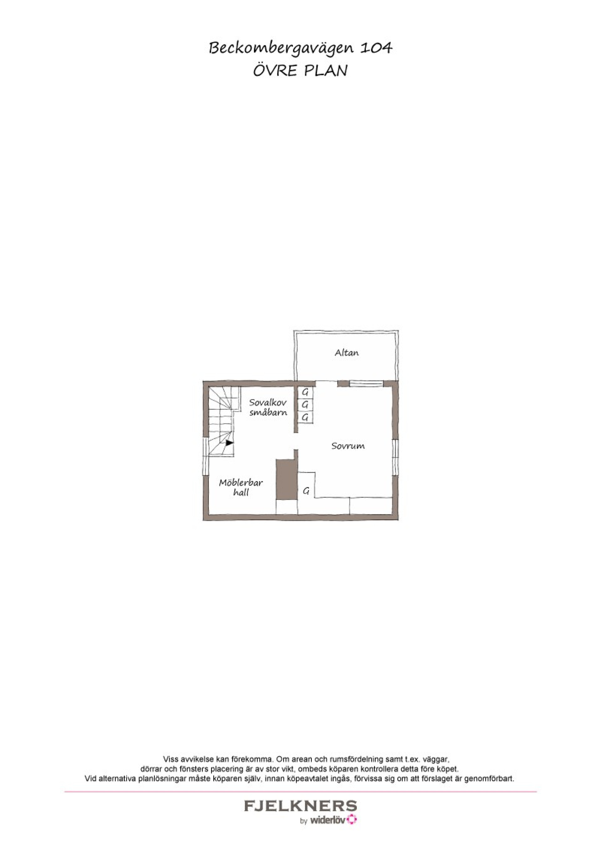 Från entréplanets hall leder en trivsamt svängd och vitmålad trappa upp till det övre planet och en möblerbar hall med smart planerad alkov som gör det perfekt för de yngsta i familjen. Ena delen lämpar sig utmärkt som arbetsplats medan den andra med fördel kan användas för spjälsäng eller mindre barnsäng. Många i området har dessutom valt att bygga ut detta plan in mot tomten, vilket skapat möjlighet till ytterligare rum samt ett badrum med takkupa mot Beckombergavägen. Här finns därmed goda utvecklingsmöjligheter för den som önskar mer yta, men bygglov krävs såklart.